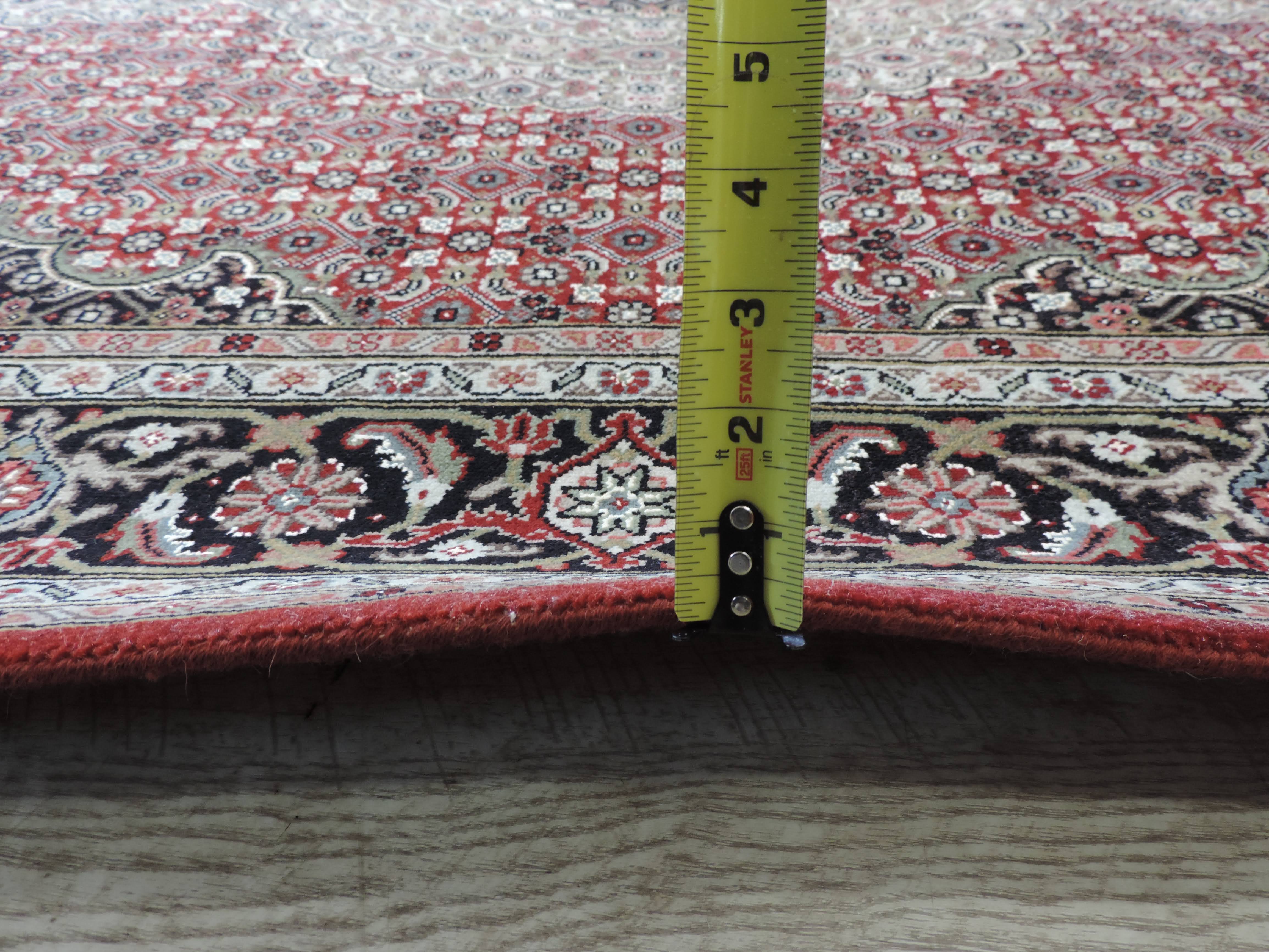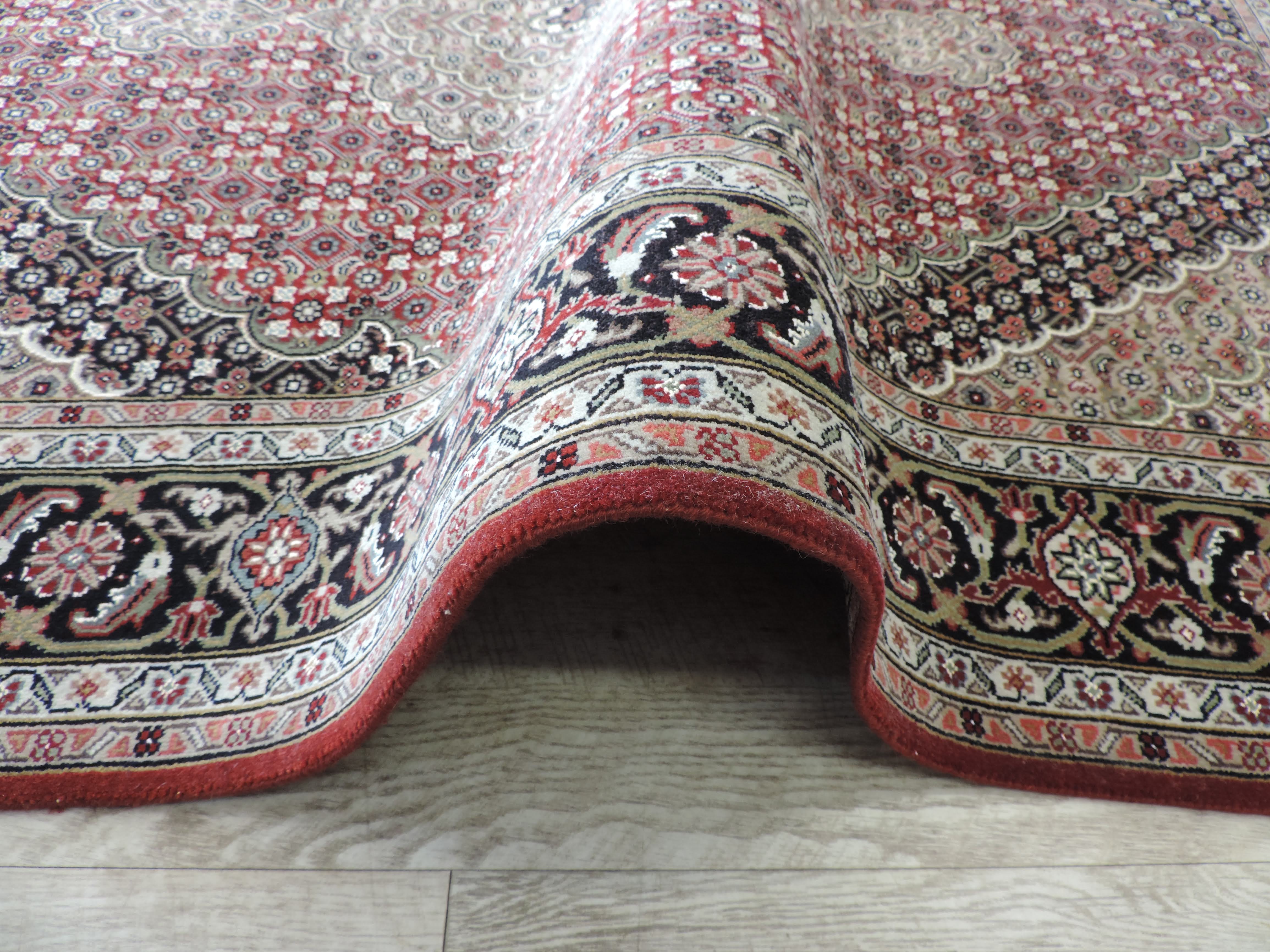 Indulge in the opulence of this Tabriz Mahi rug, hand-knotted with delicate precision from the finest wool in India. This rectangular, burgundy masterpiece, measuring 5.1 by 7.0 ft, showcases a stunning floral design set against a cotton foundation, bringing an elegant fusion of traditional artistry and modern sophistication to any room. Available at a slashed price, seize this exclusive opportunity to add a touch of timeless luxury to your home.