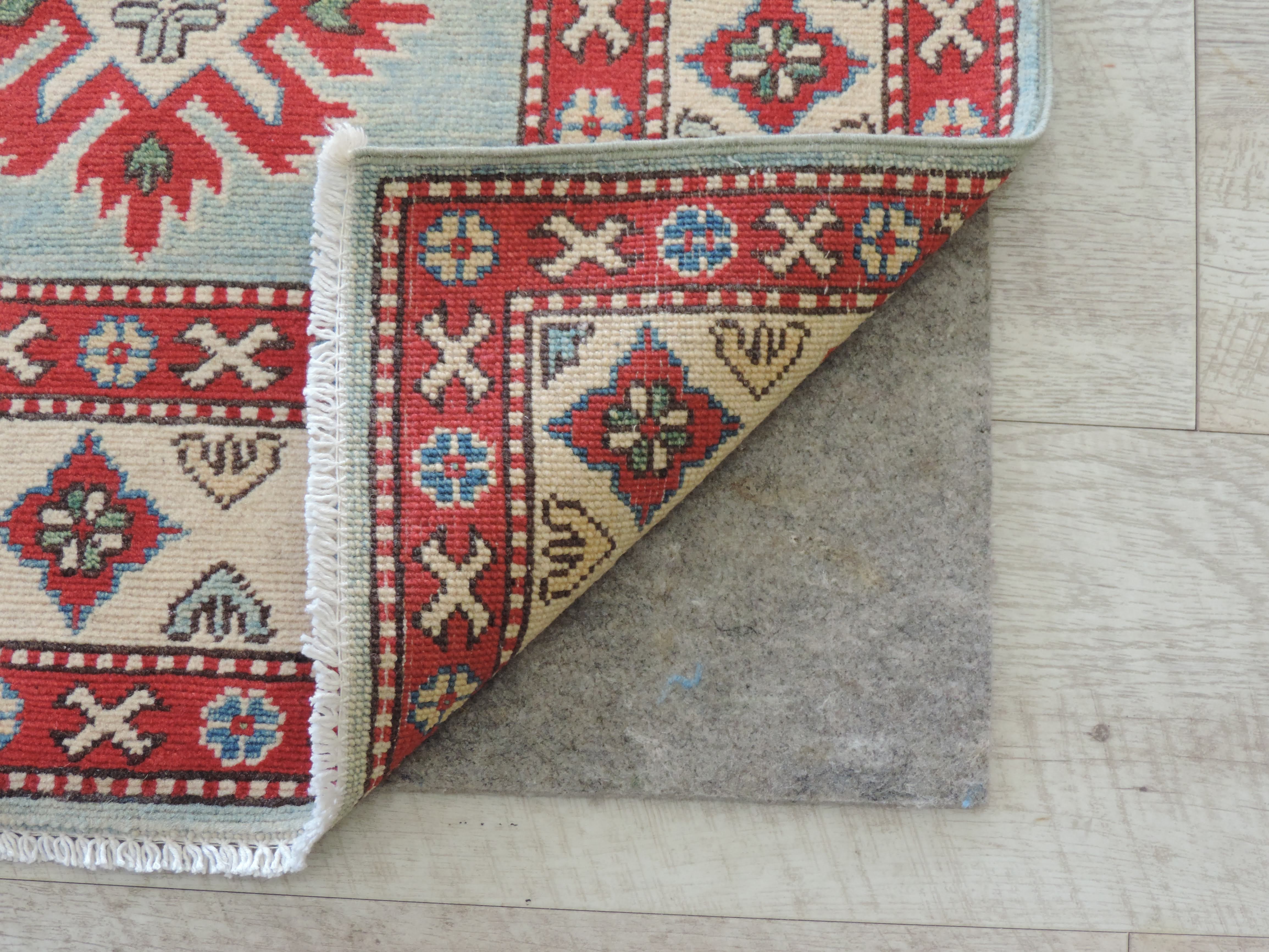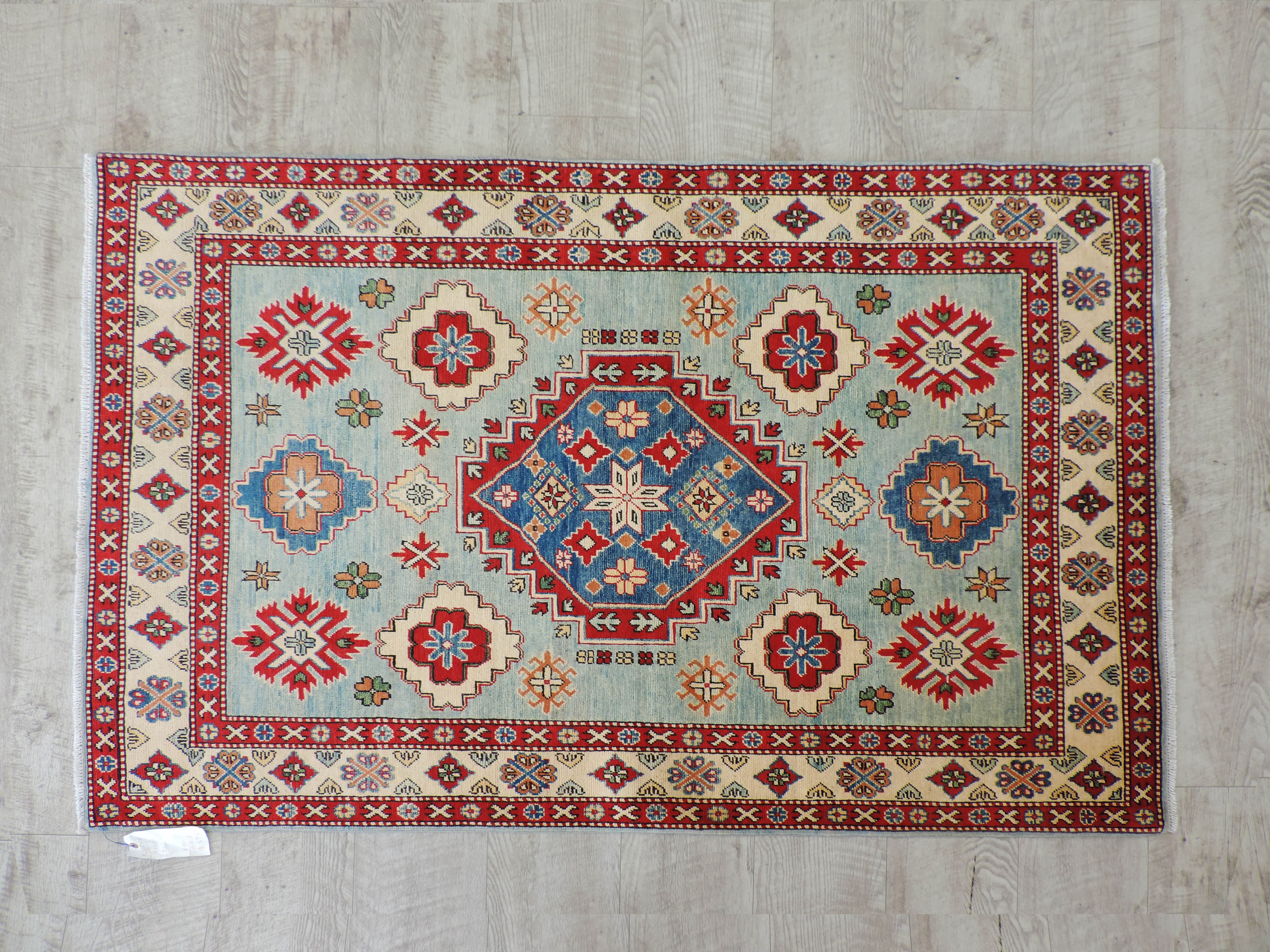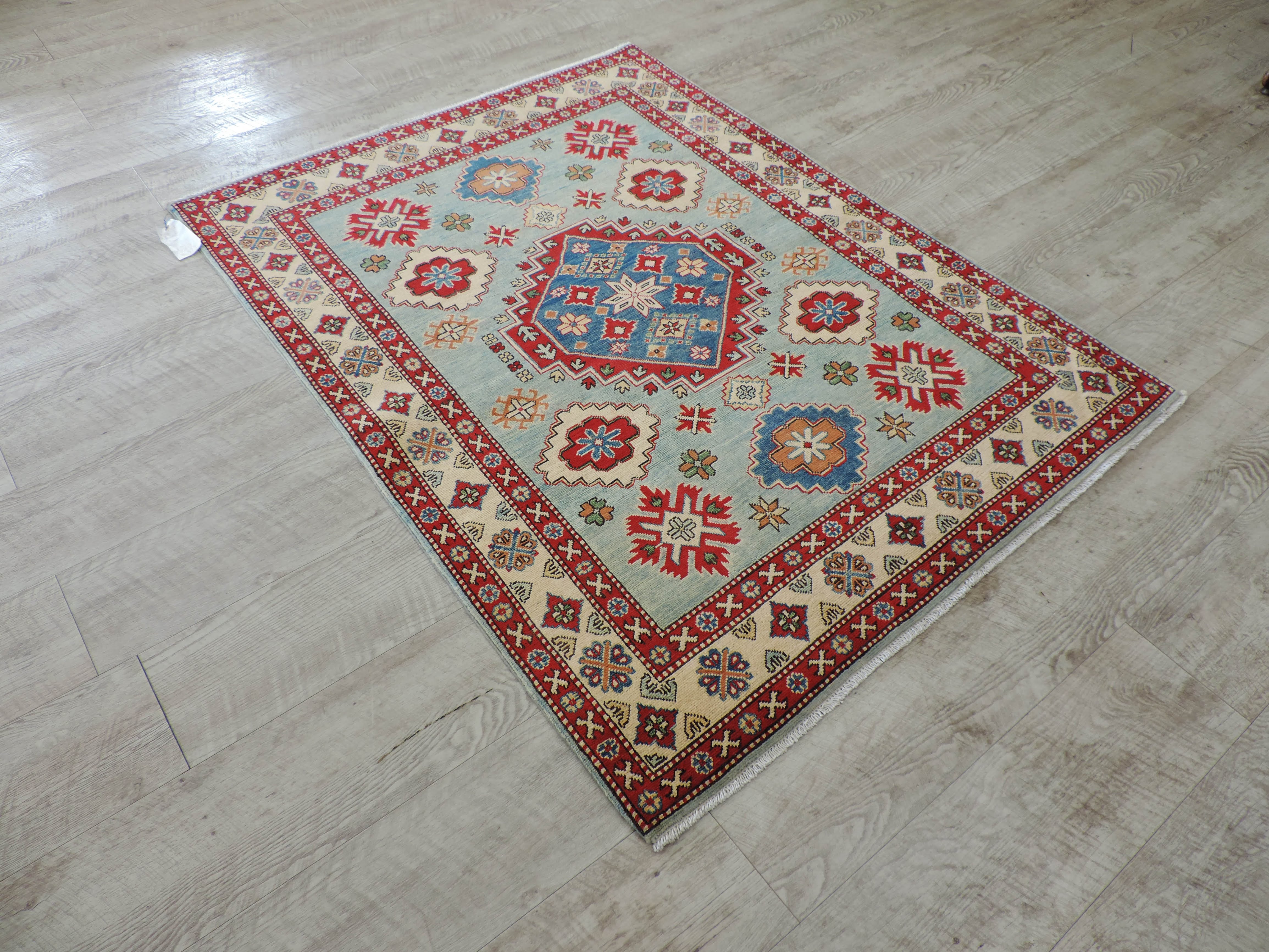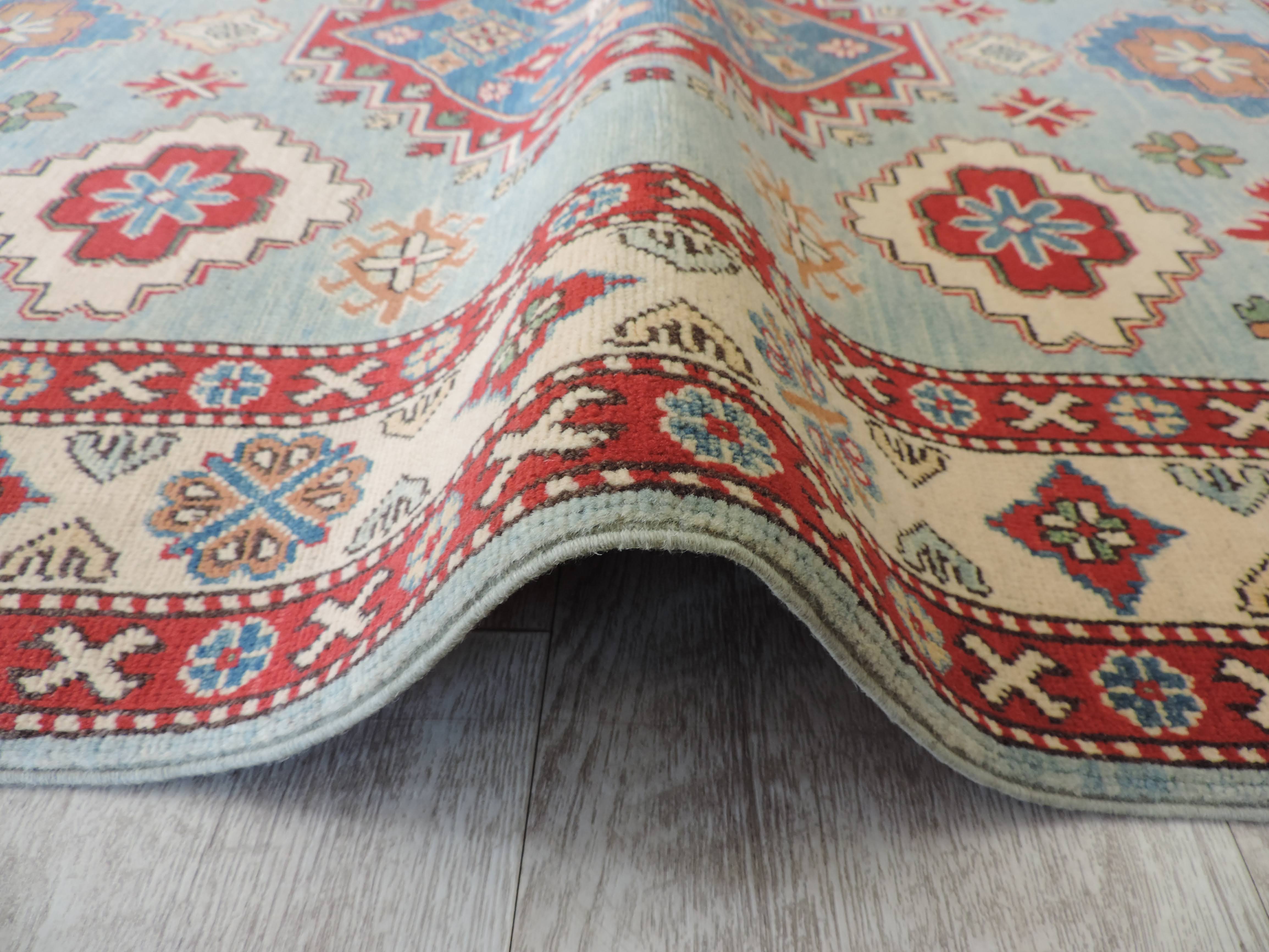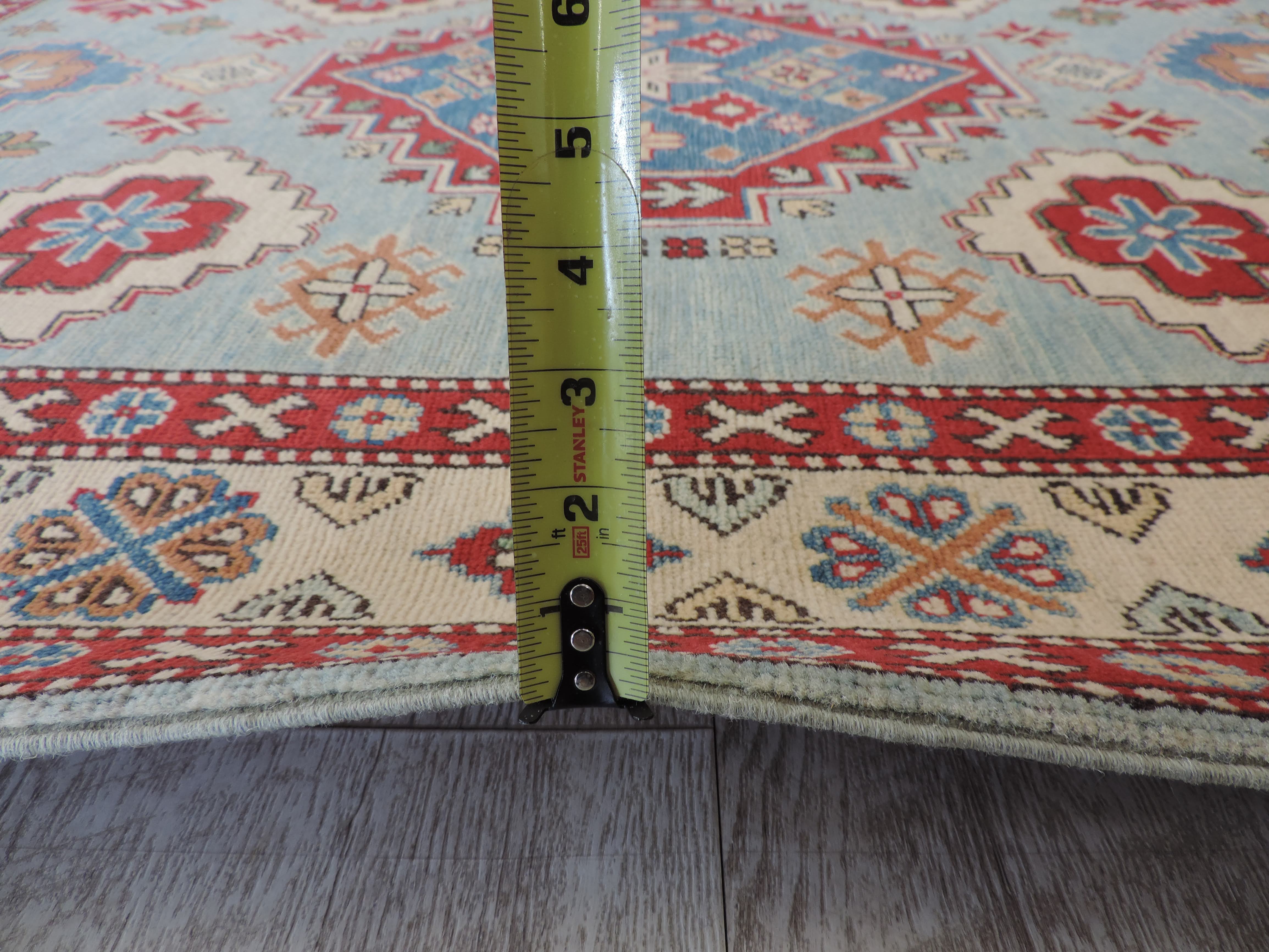 Infuse your living space with an authentic touch of the Orient with this stunning Kazak rug (B-10549). Hand-knotted in Pakistan, the rug flaunts a unique geometric design on a captivating sky blue wool canvas, beautifully complemented by a sturdy cotton foundation. With its detailed weave, vibrant color, and a generous sale price, this rectangular rug is not just a floor covering, but a conversation piece that exudes style and appeals to the discerning buyer.