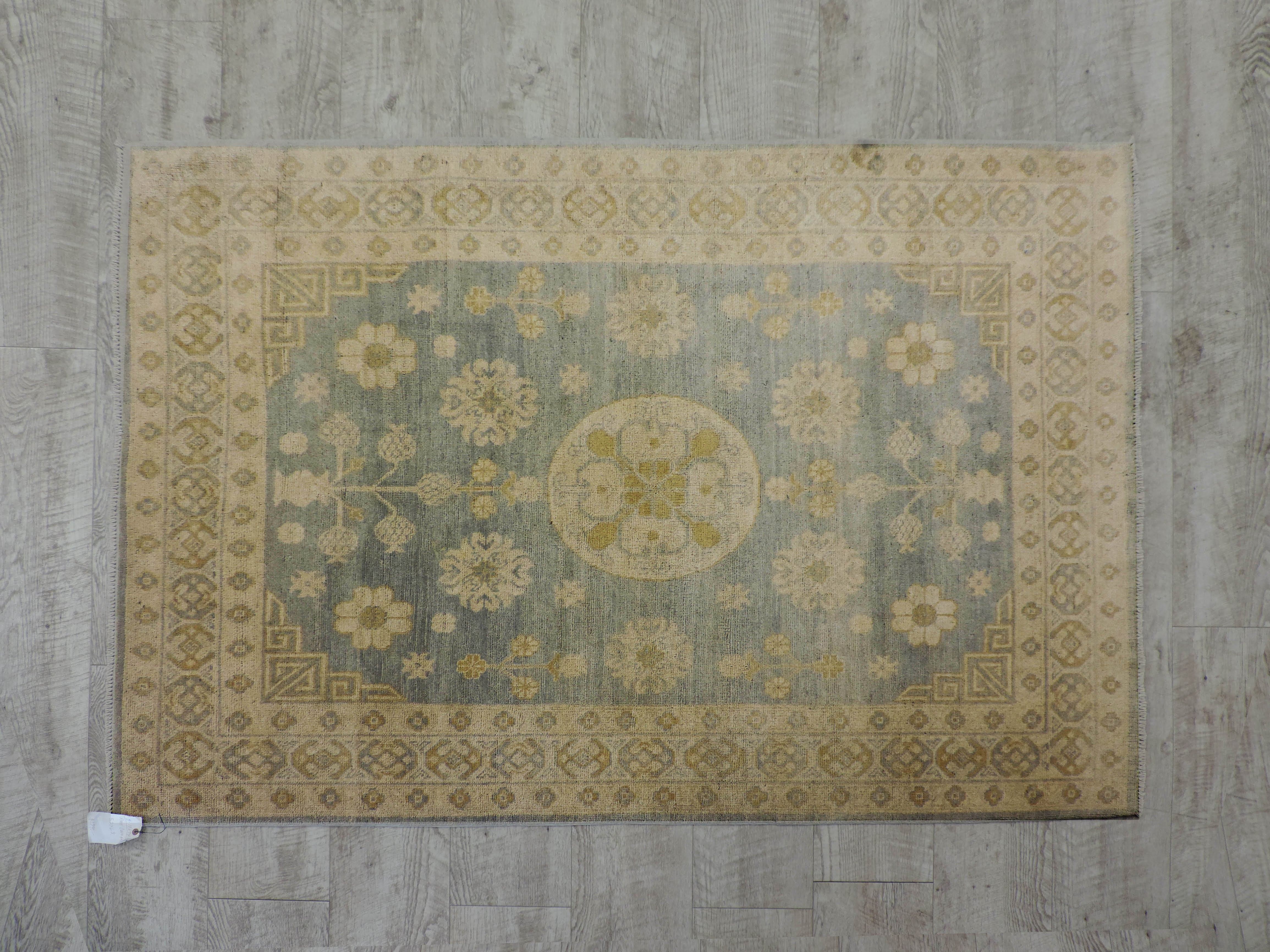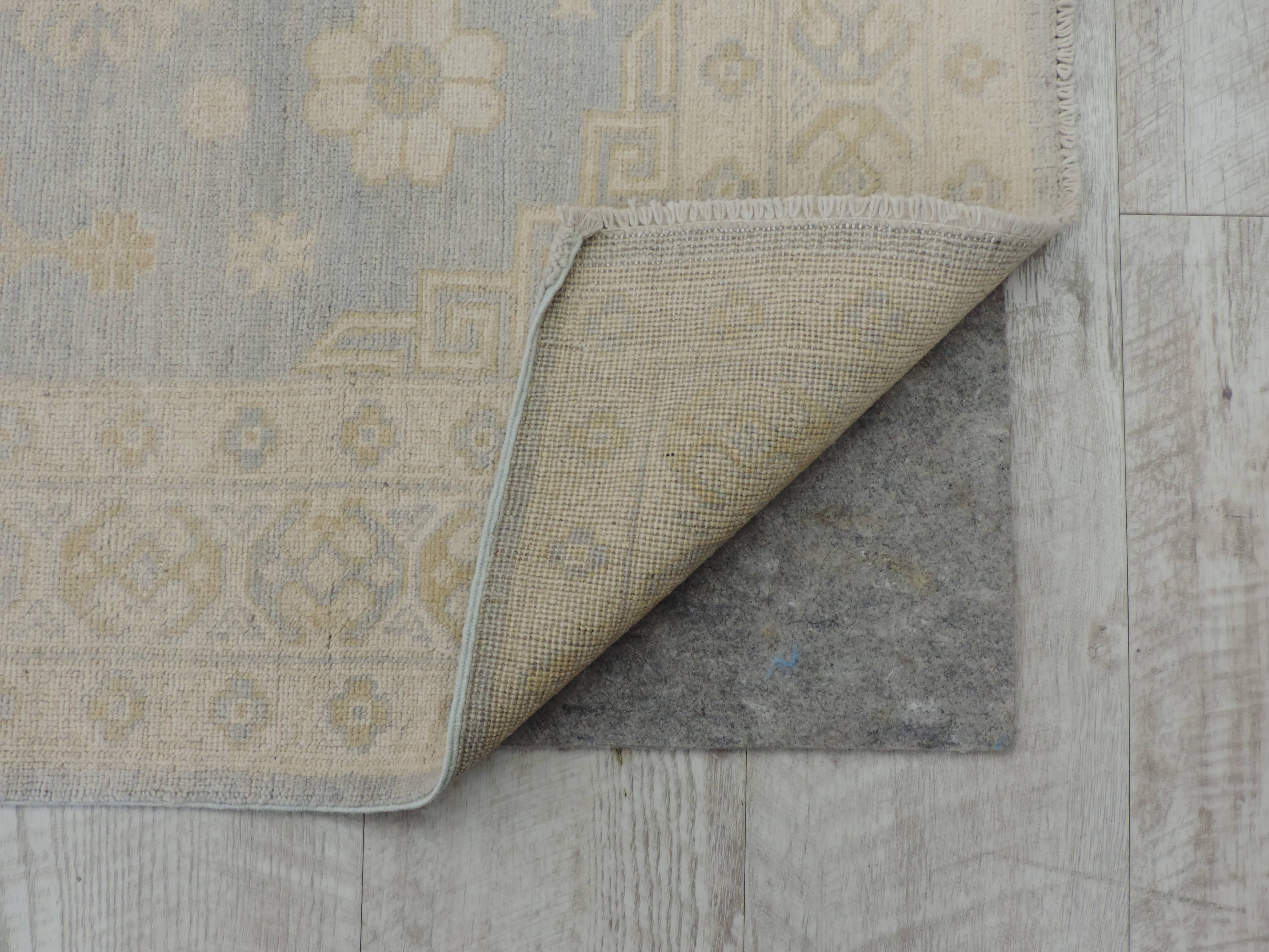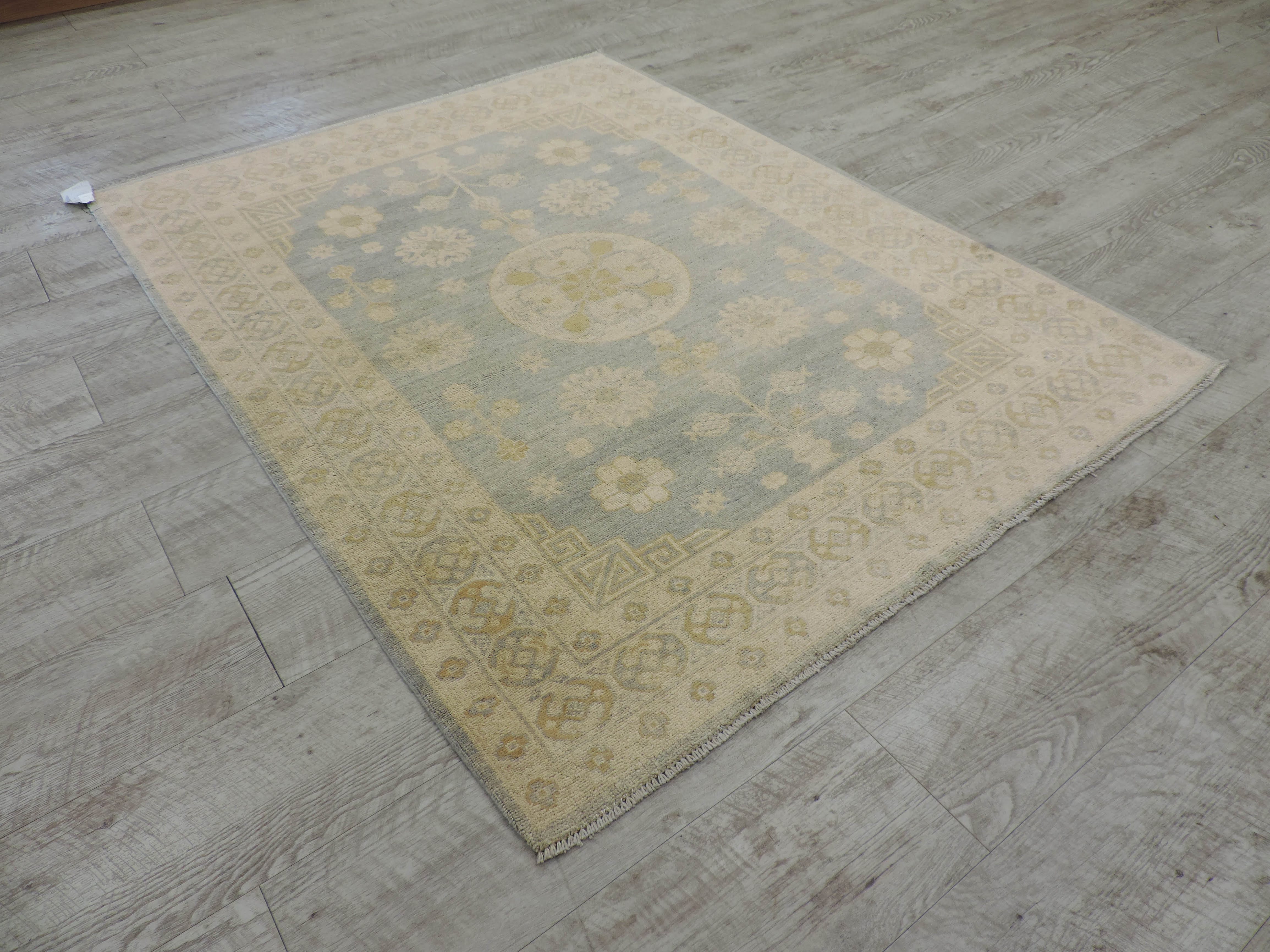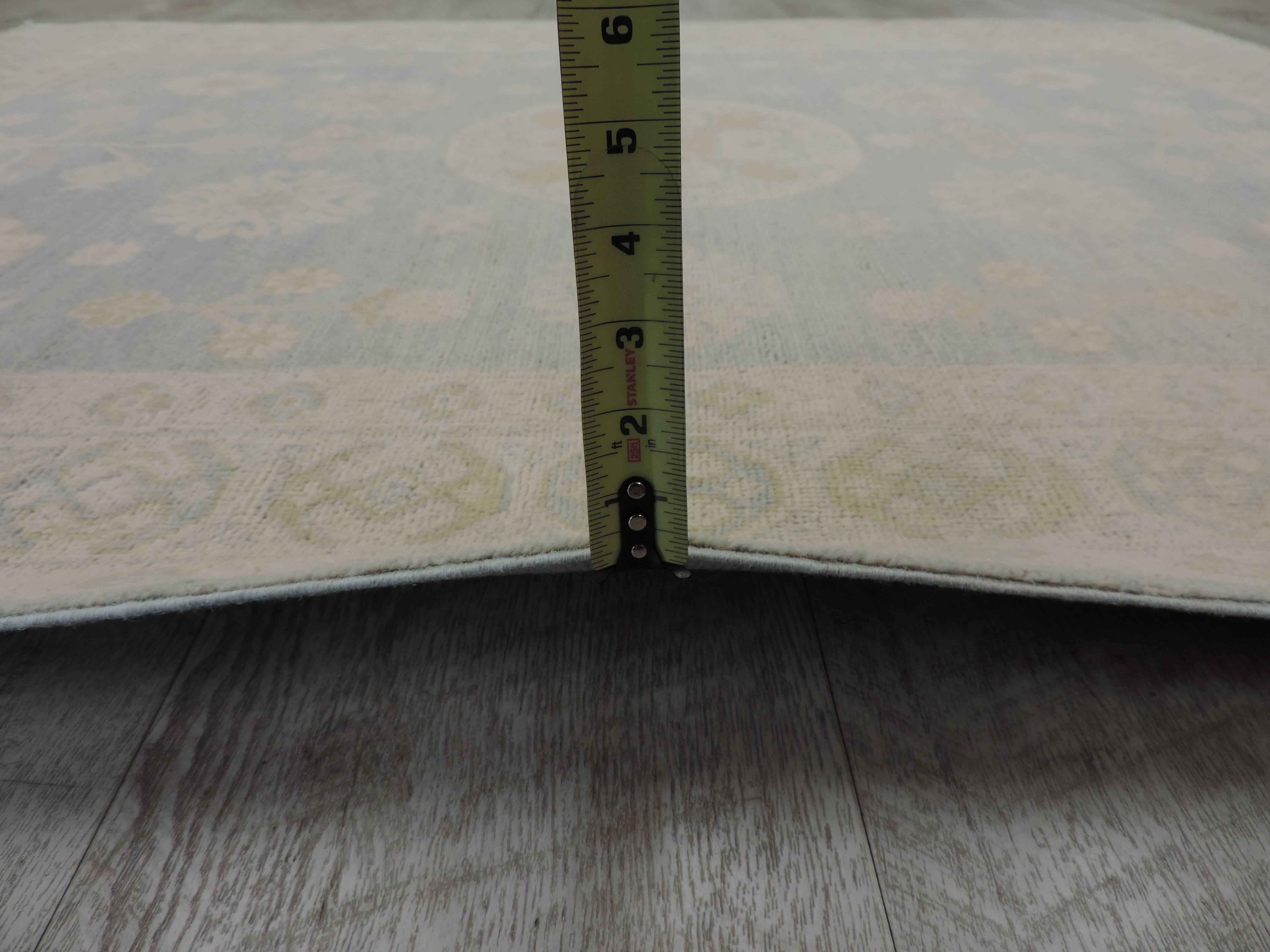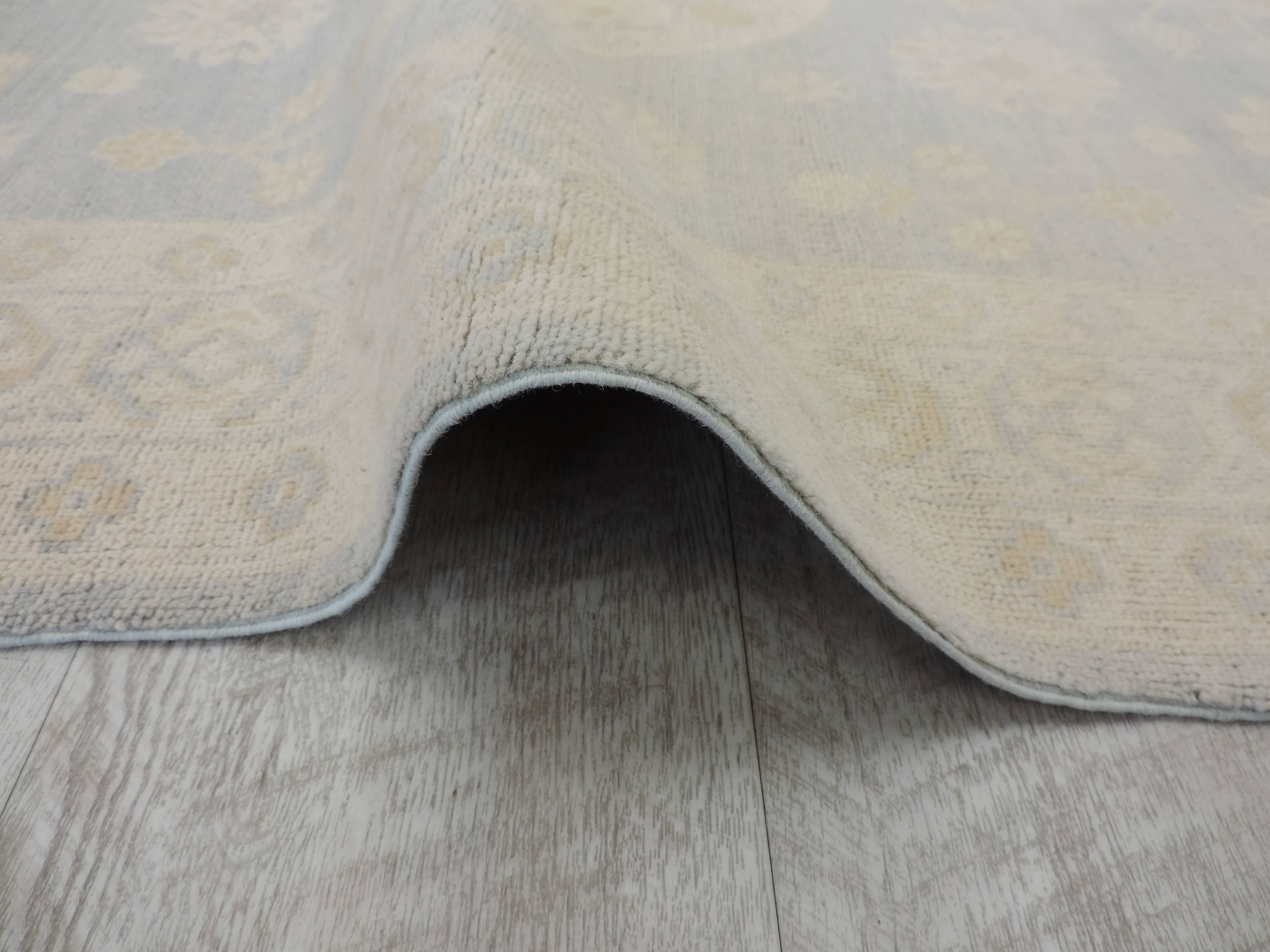 Experience the timeless beauty and exceptional craftsmanship of this new Oushak rug (B-10694). Hand-knotted from plush wool, this rectangular rug features a unique geometric design in a captivating primary blue shade. Originating from Turkey, its distinctive style adds a touch of exotic elegance to any room, all for an unbeatable sale price of $805.