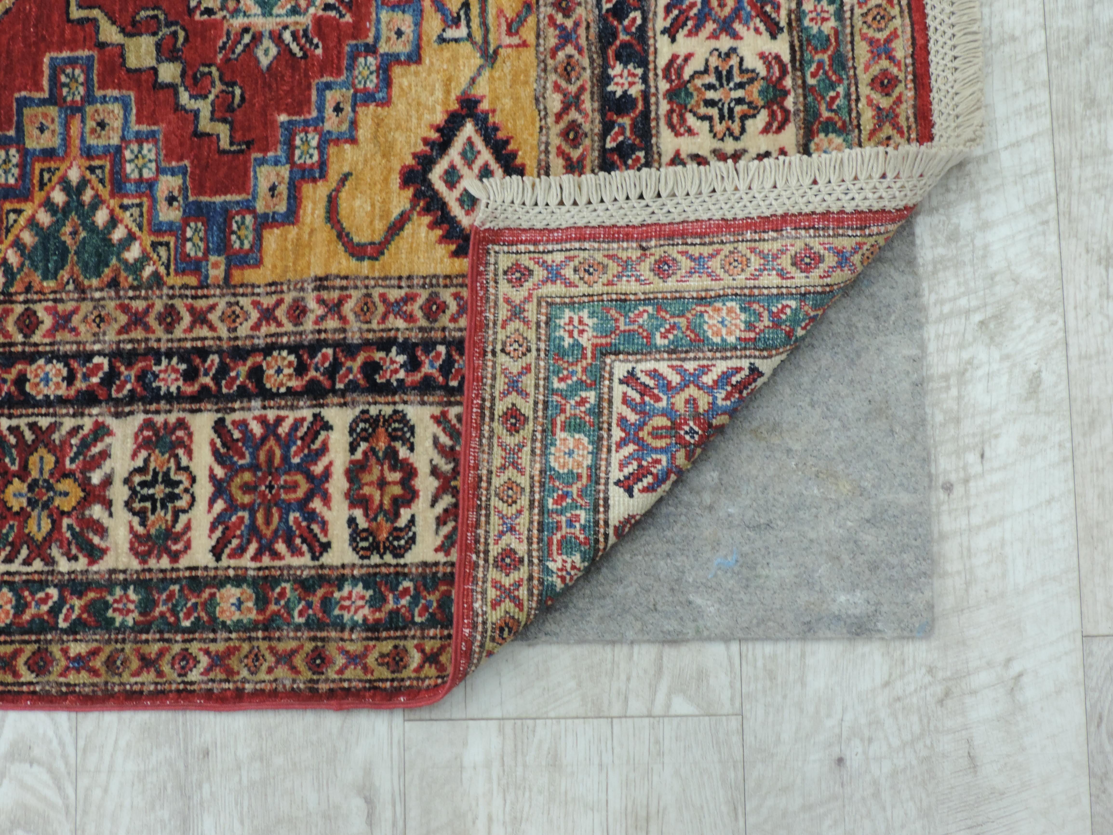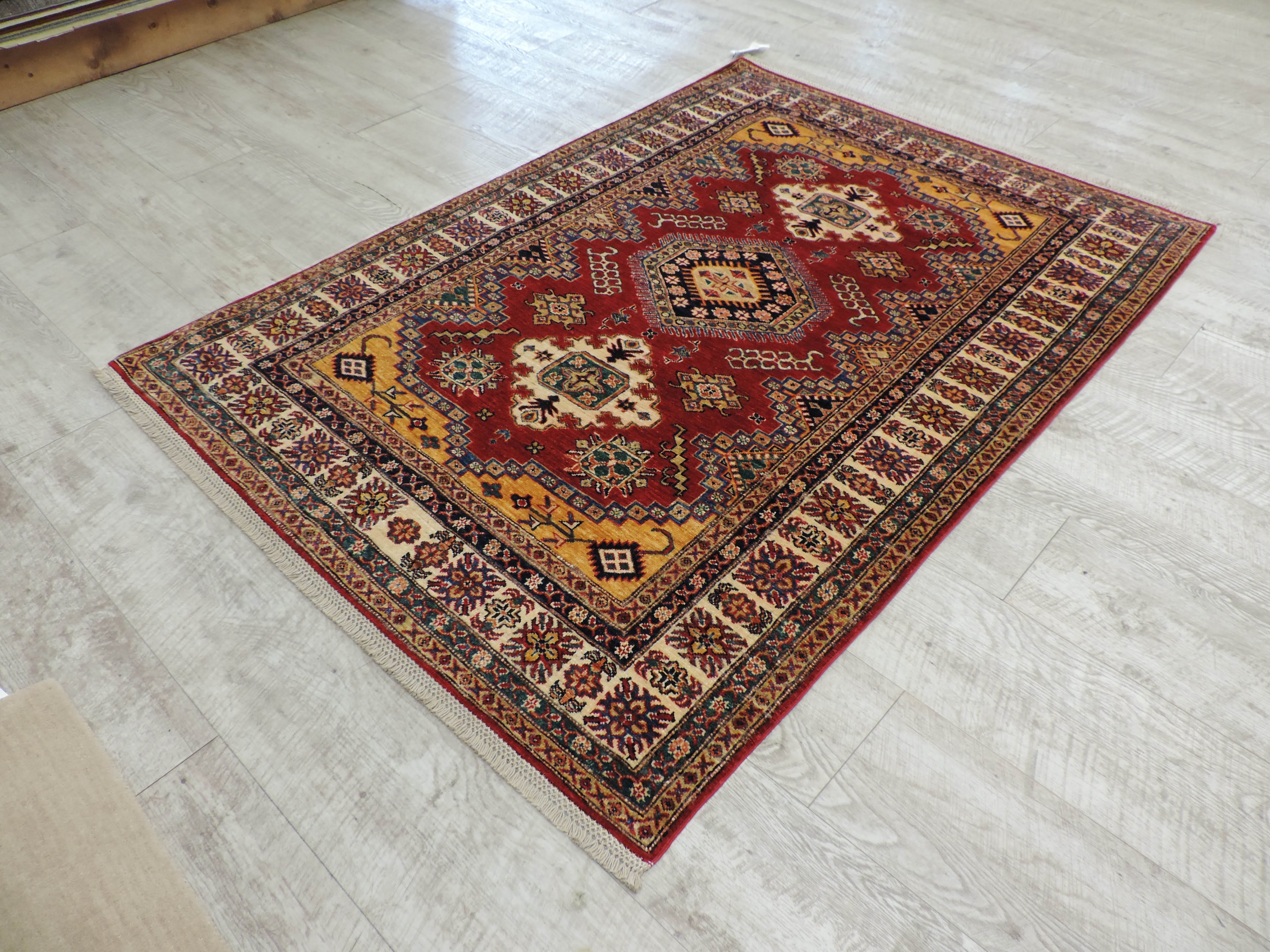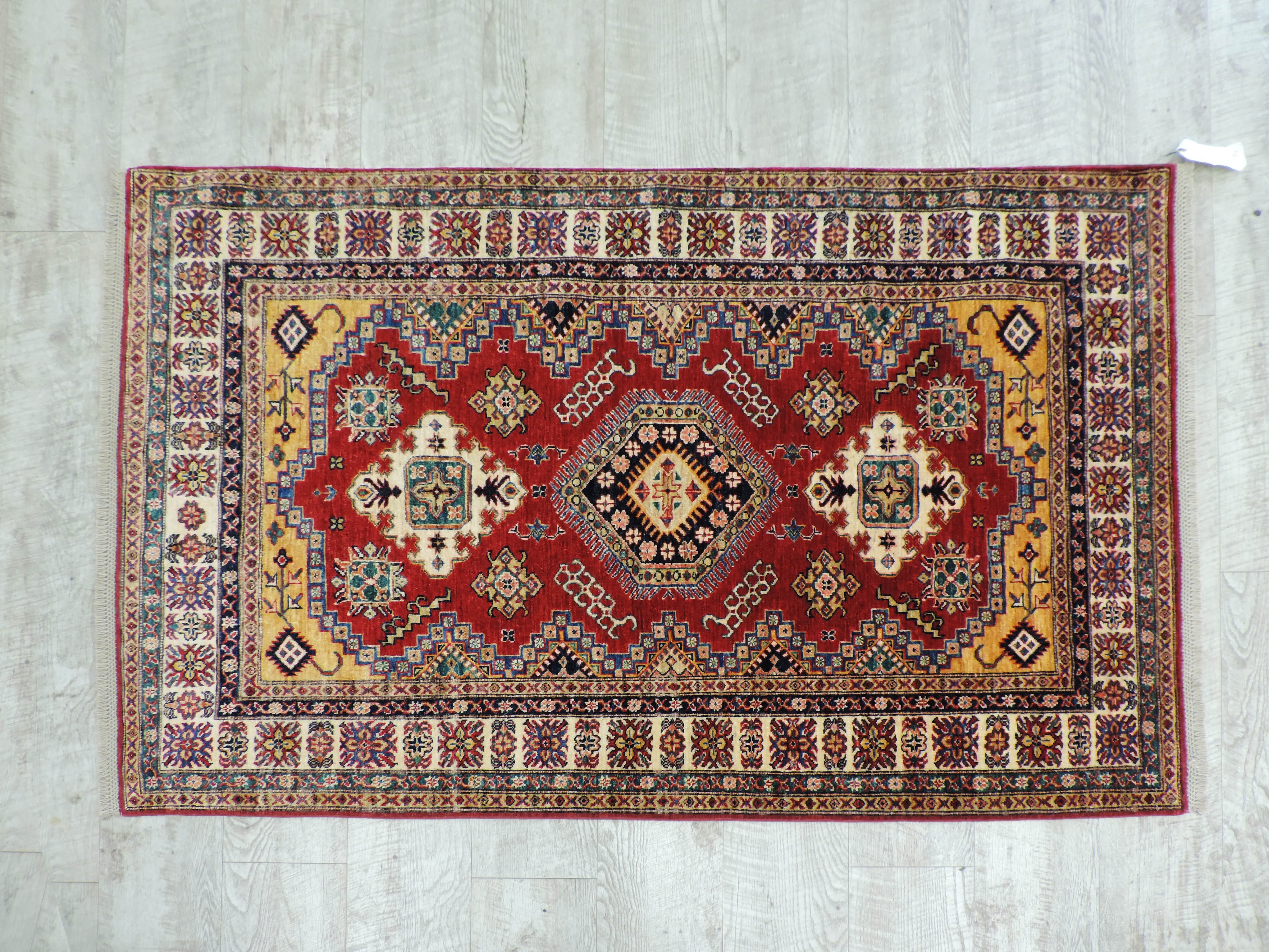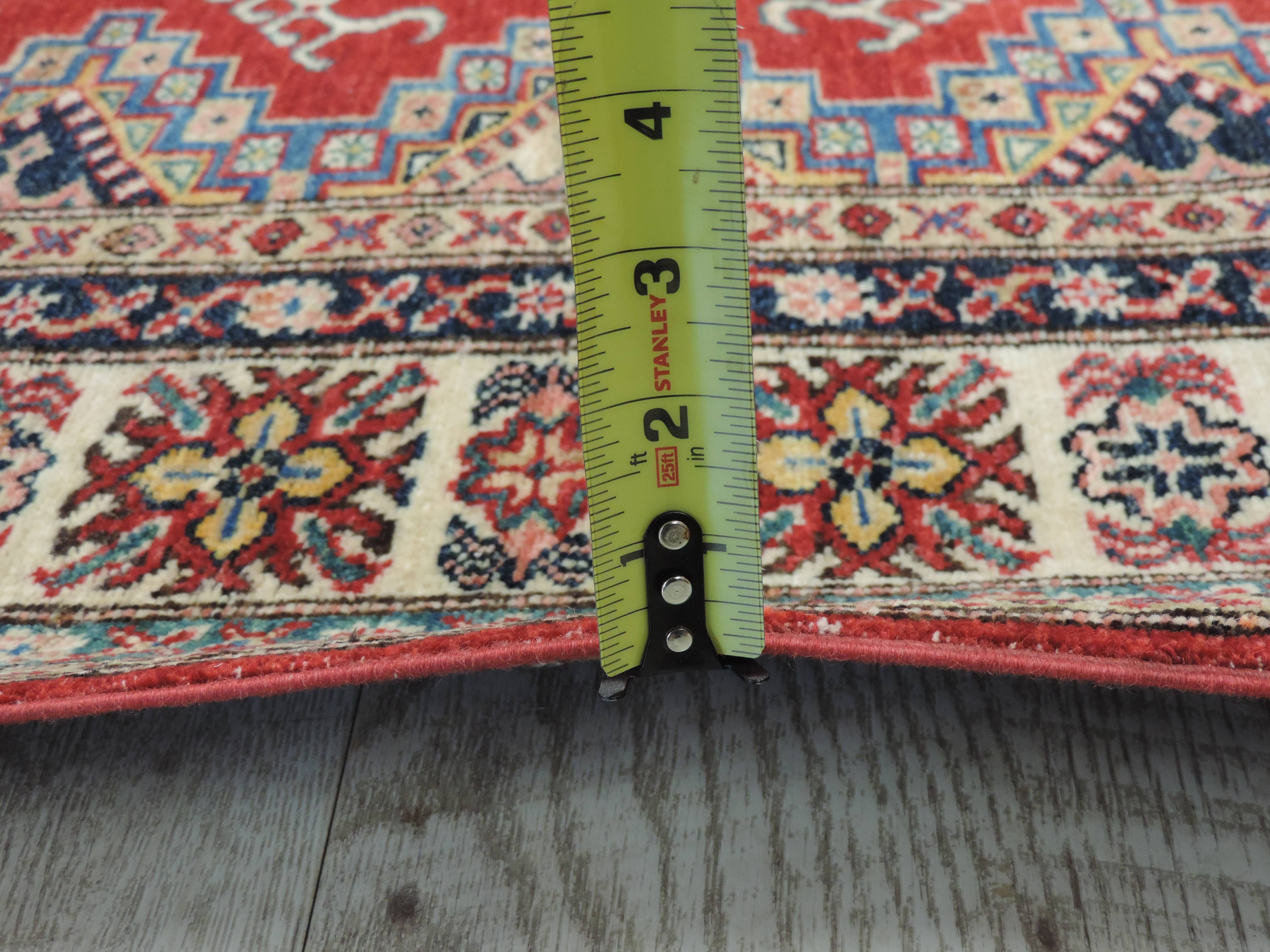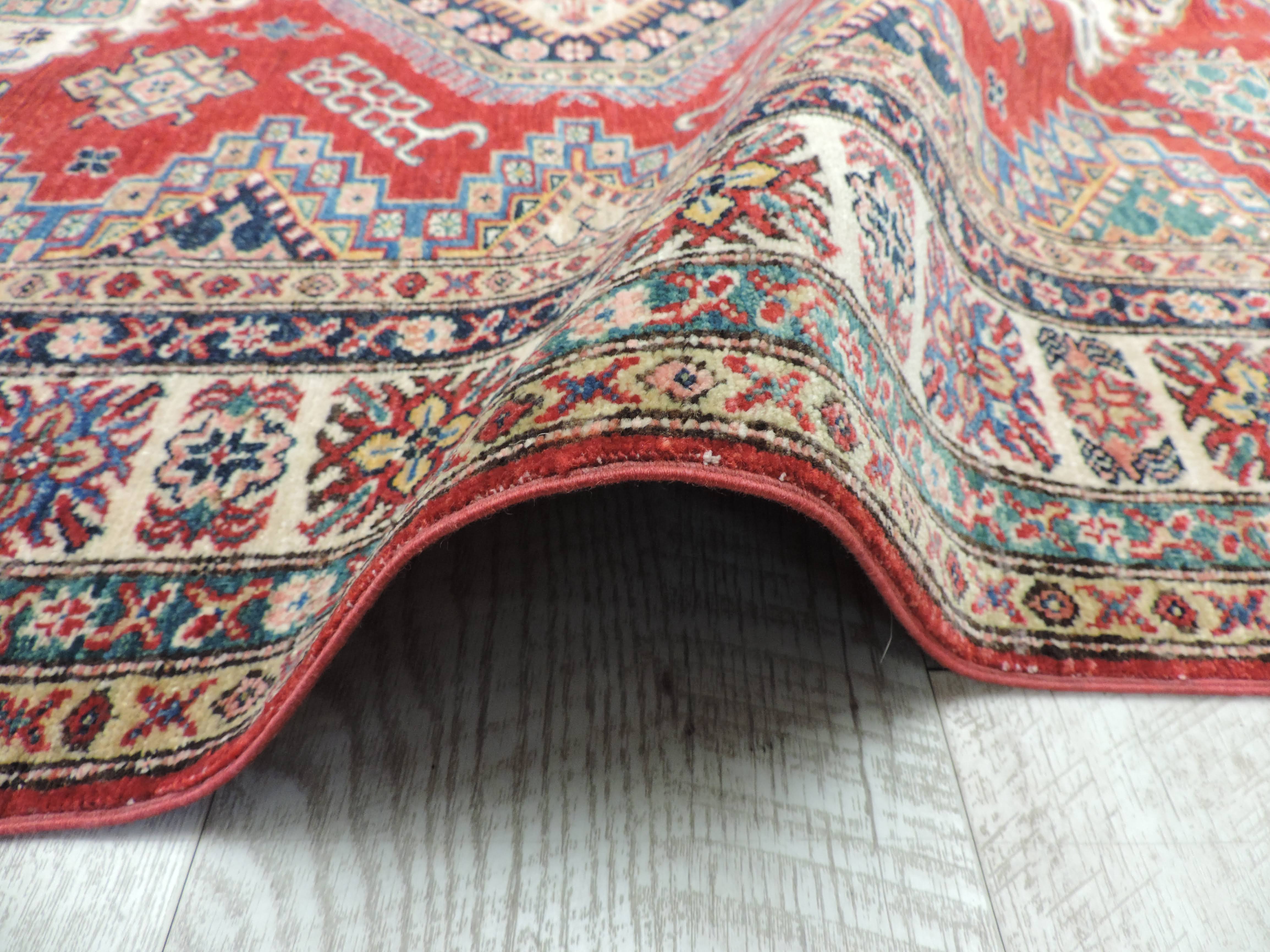 Experience the vibrant allure of this Super Kazak rug (B-10997) hand-knotted in Pakistan from high-quality wool. Its bold red hue and energetic geometric design bring an exotic, yet sophisticated appeal to any space. Now offered at a discounted price of $1200, this rug blends stunning craftsmanship with incredible value, perfect for adding a touch of luxury to your home.