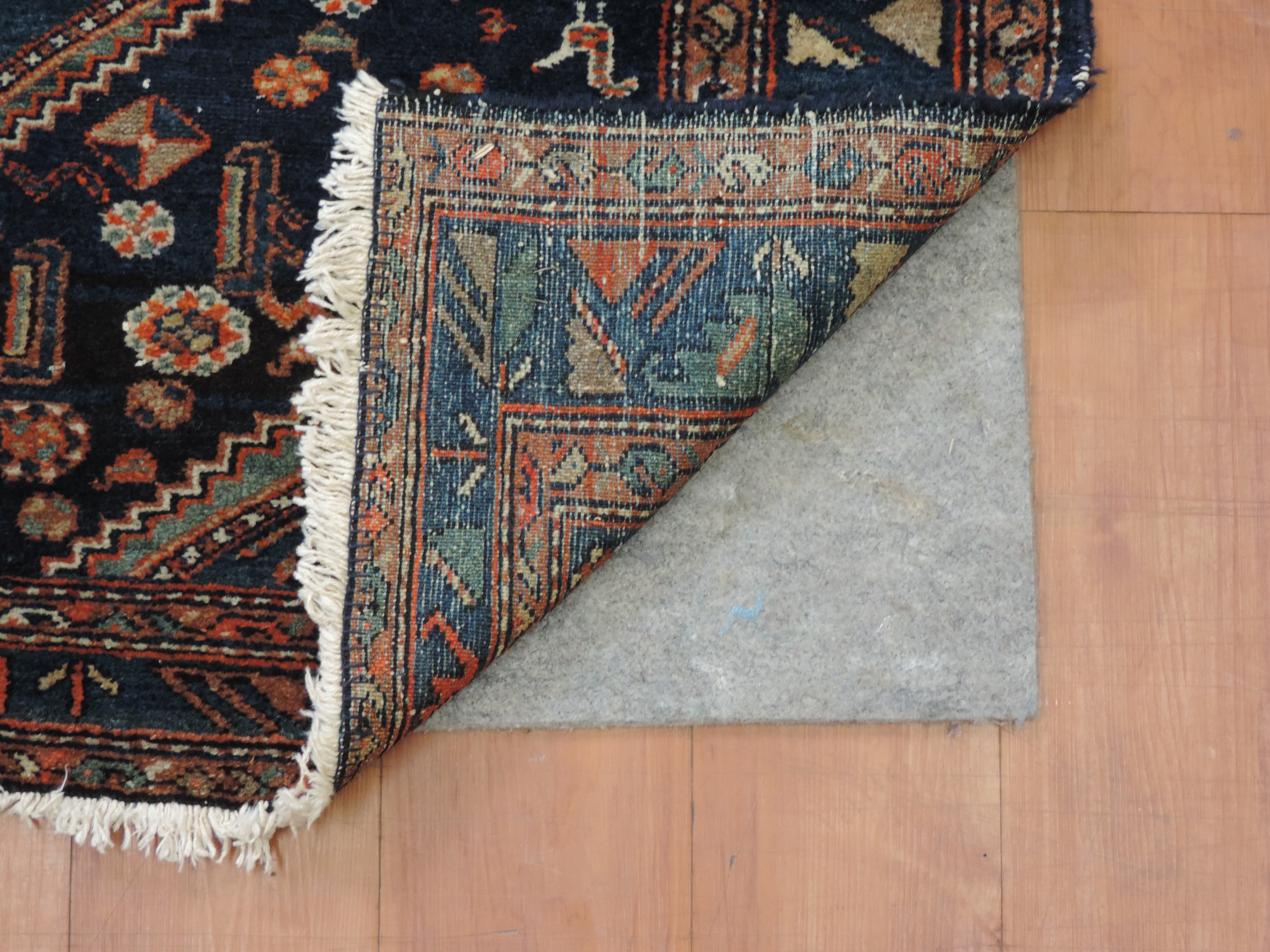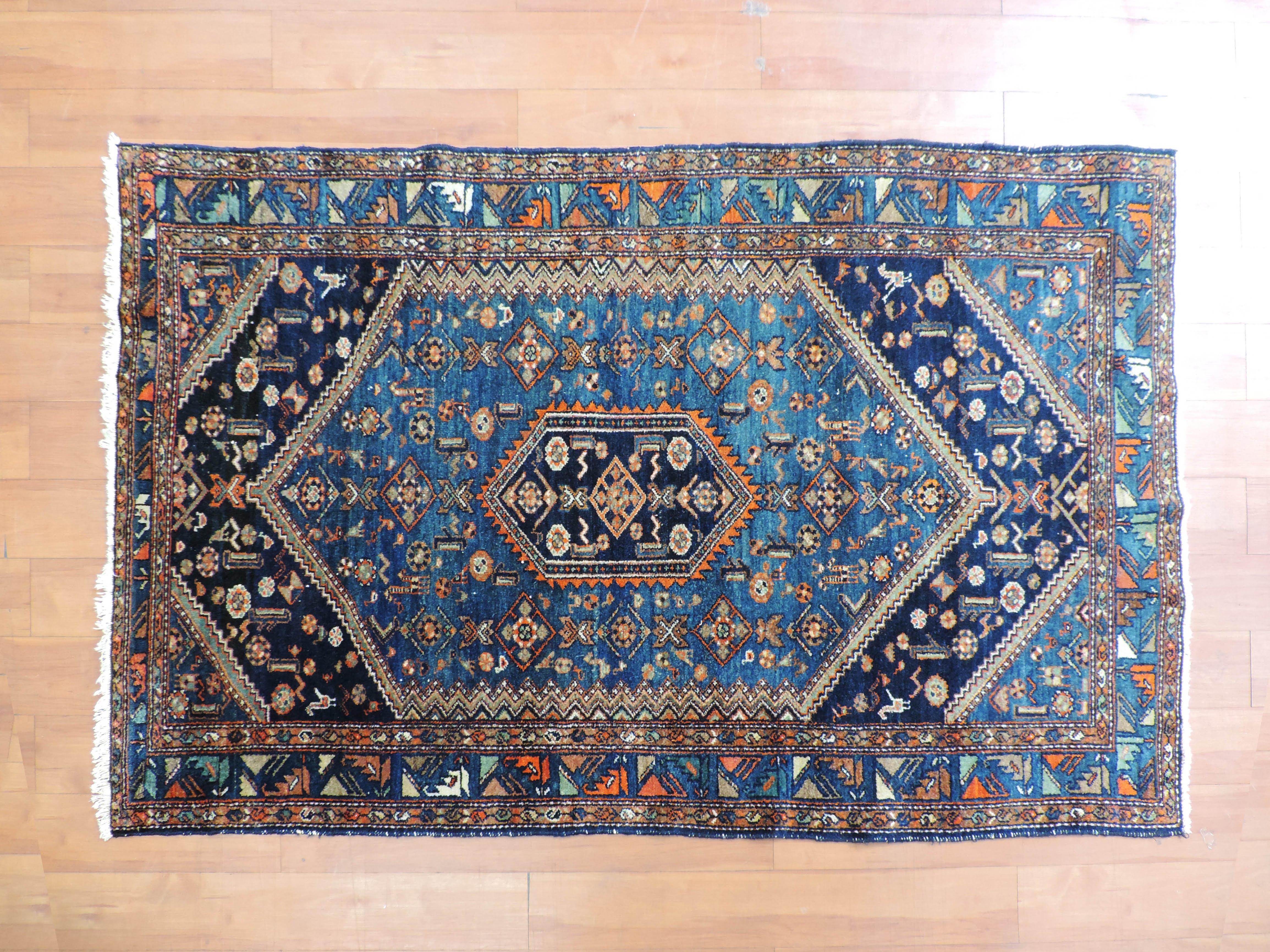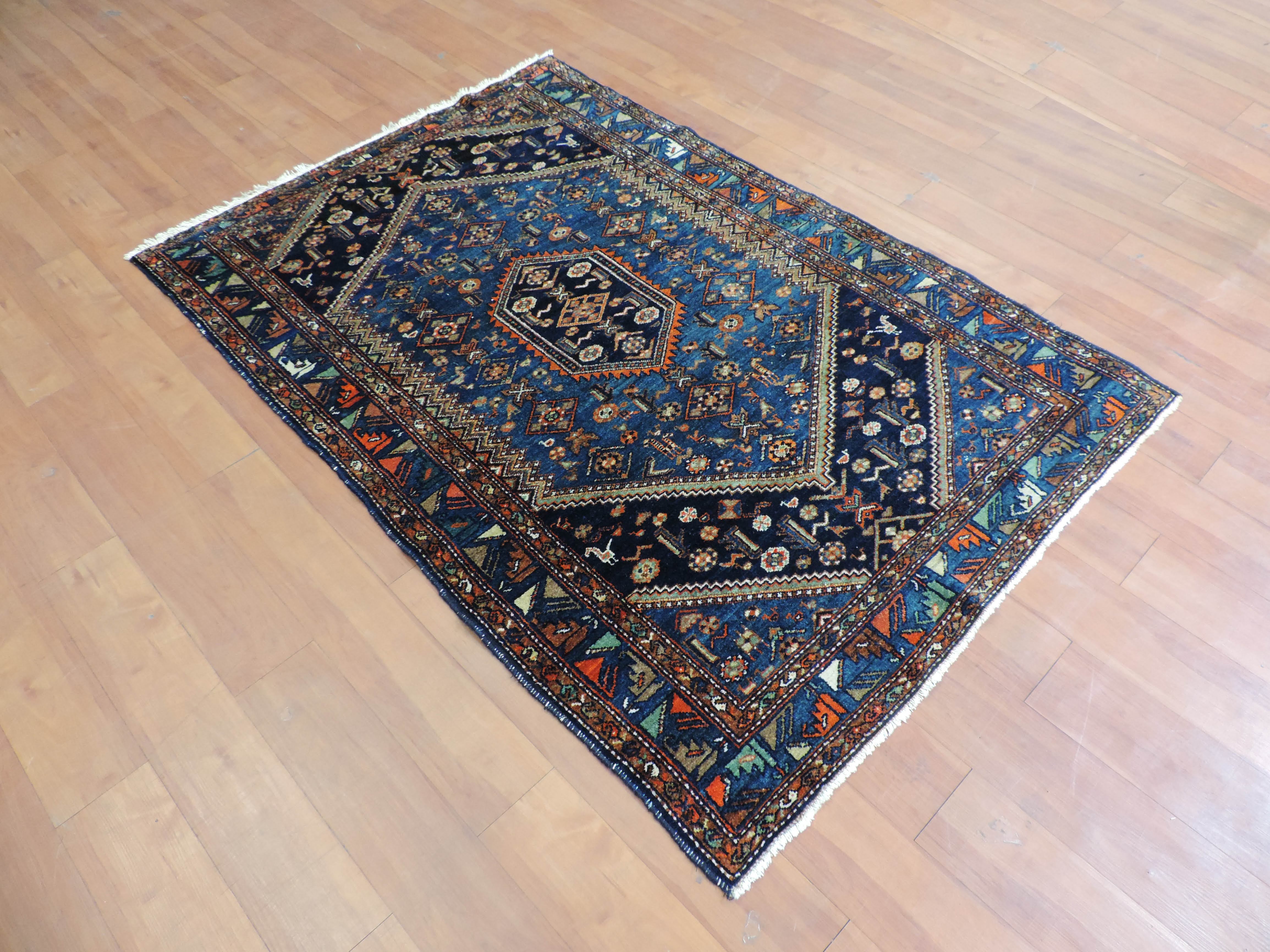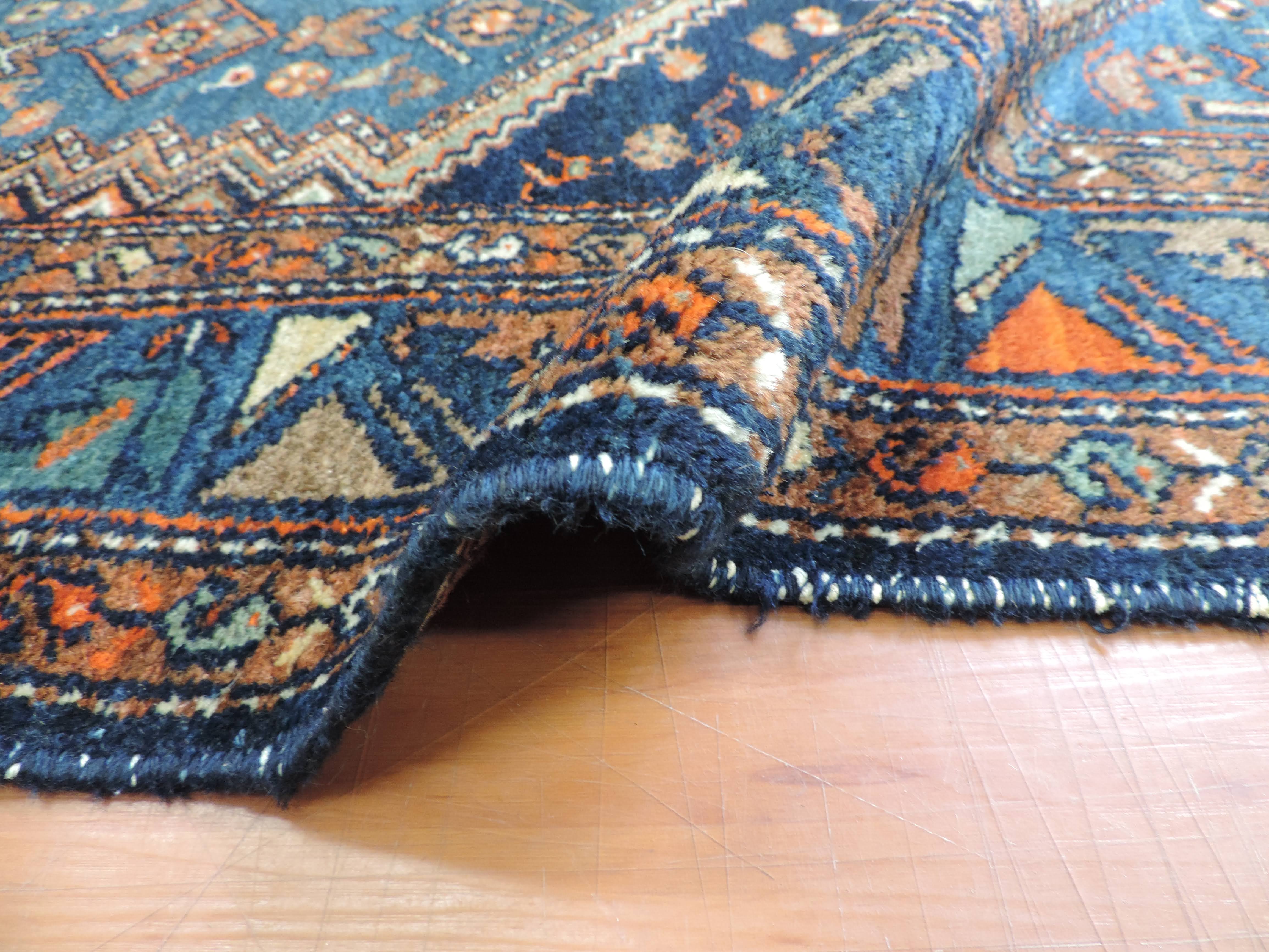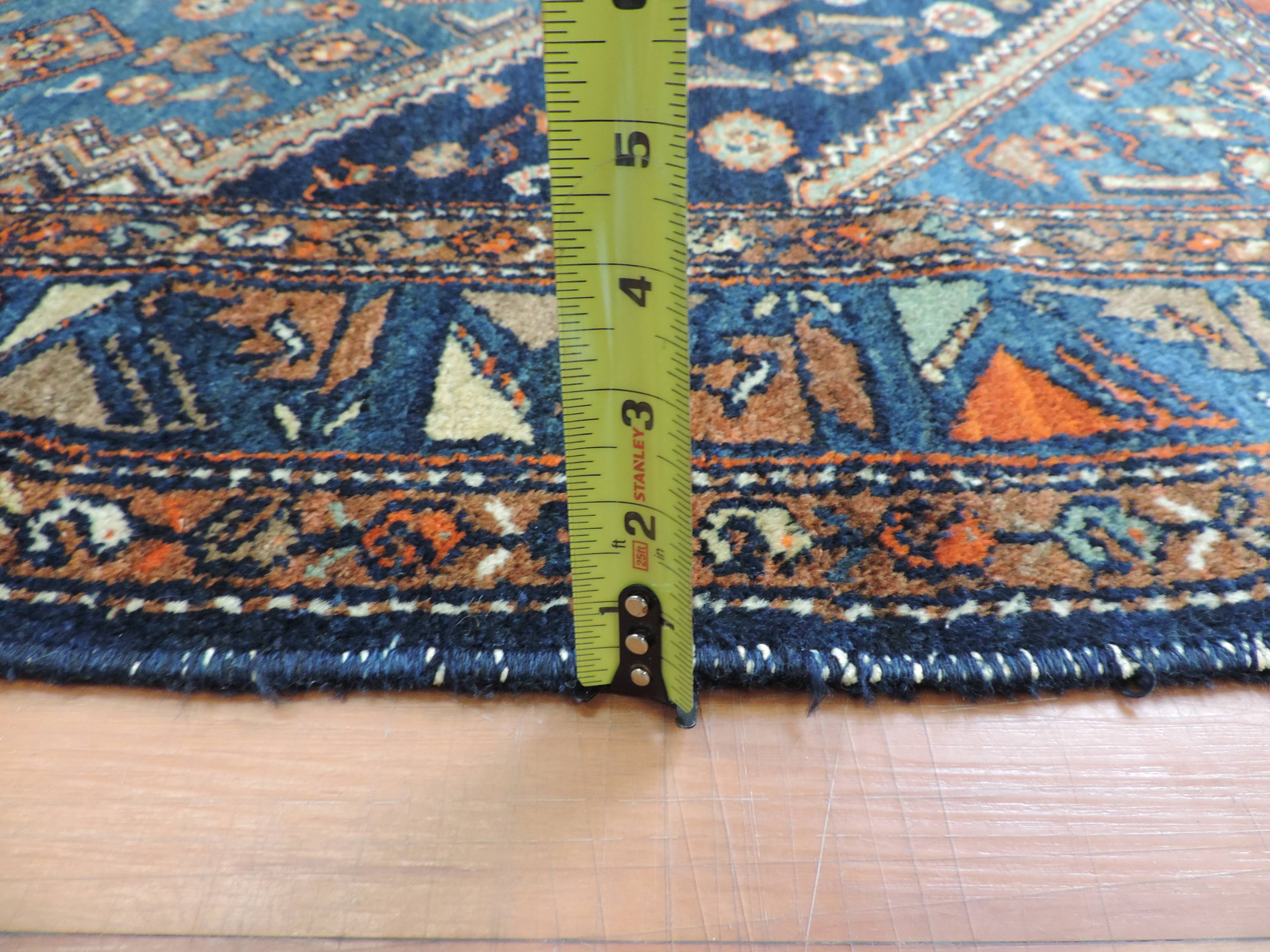 Experience the allure of the East with this stunning antique Hamadan rug. Expertly hand-knotted from wool and set on a cotton foundation, it showcases a striking geometric design in a rich blue primary color. This 1920's artifact, sized 4.5x6.7ft, combines age-old craftsmanship with an enticingly unique style, now available at a discounted price for a genuine slice of oriental elegance in your home.