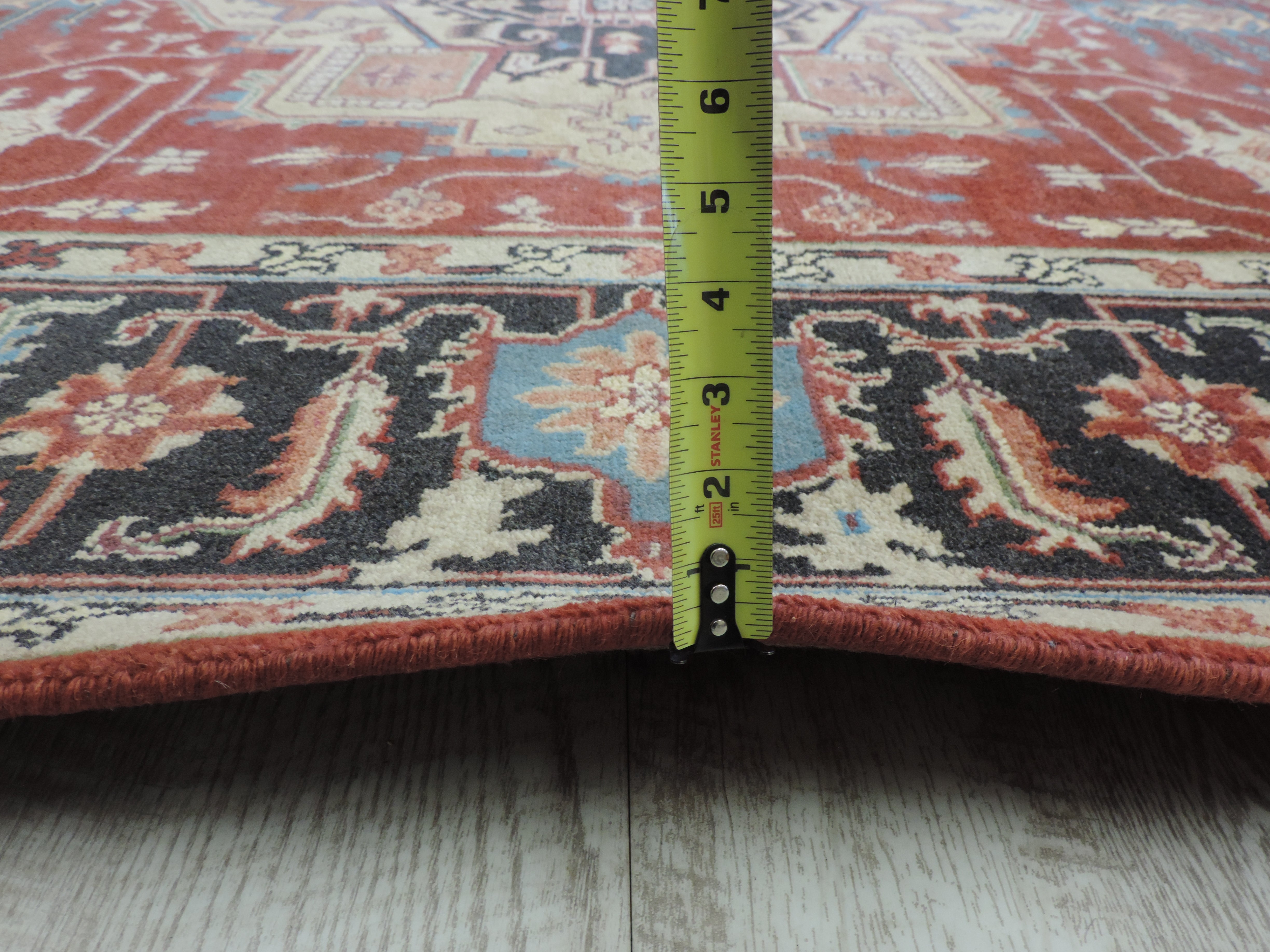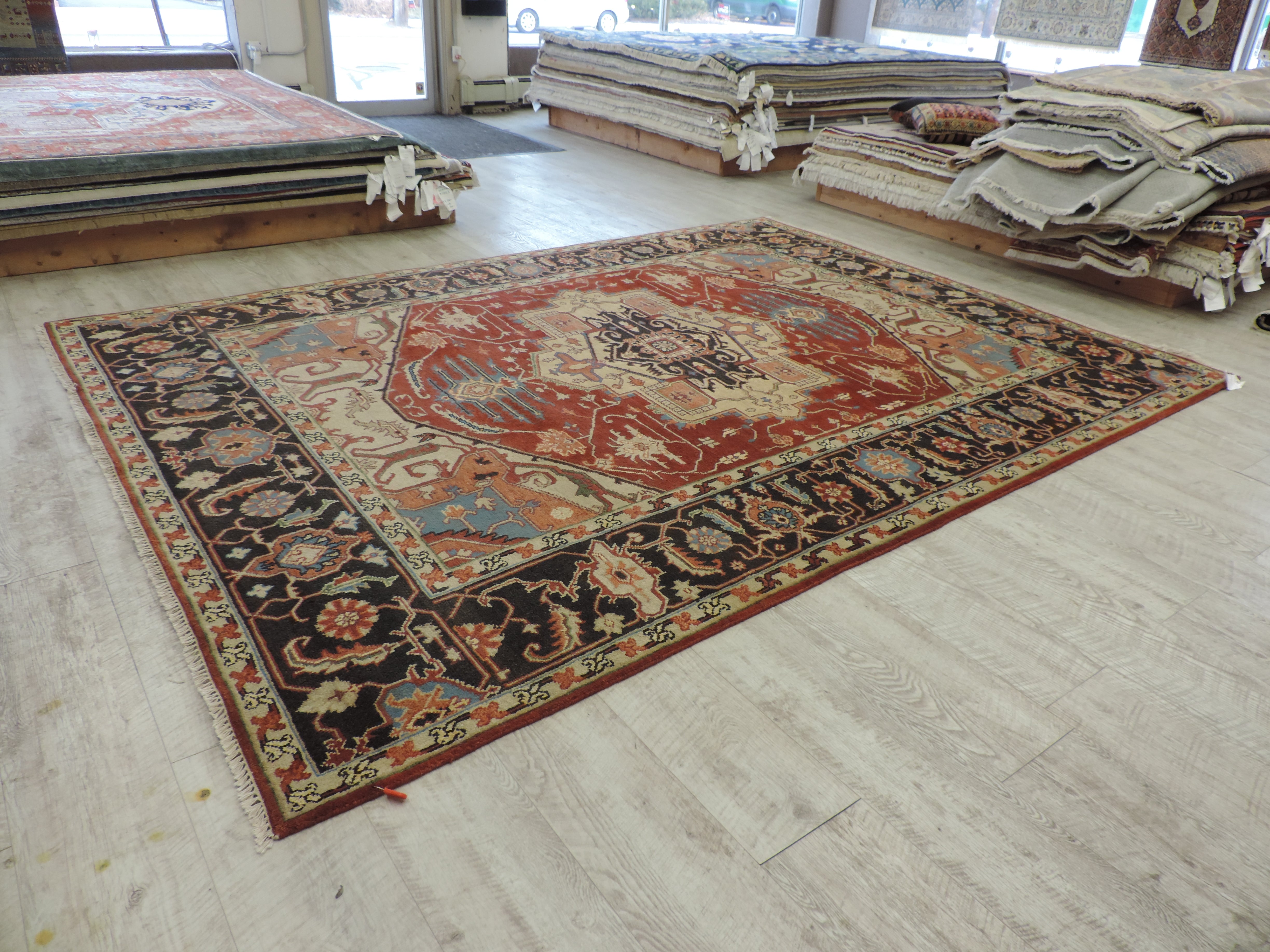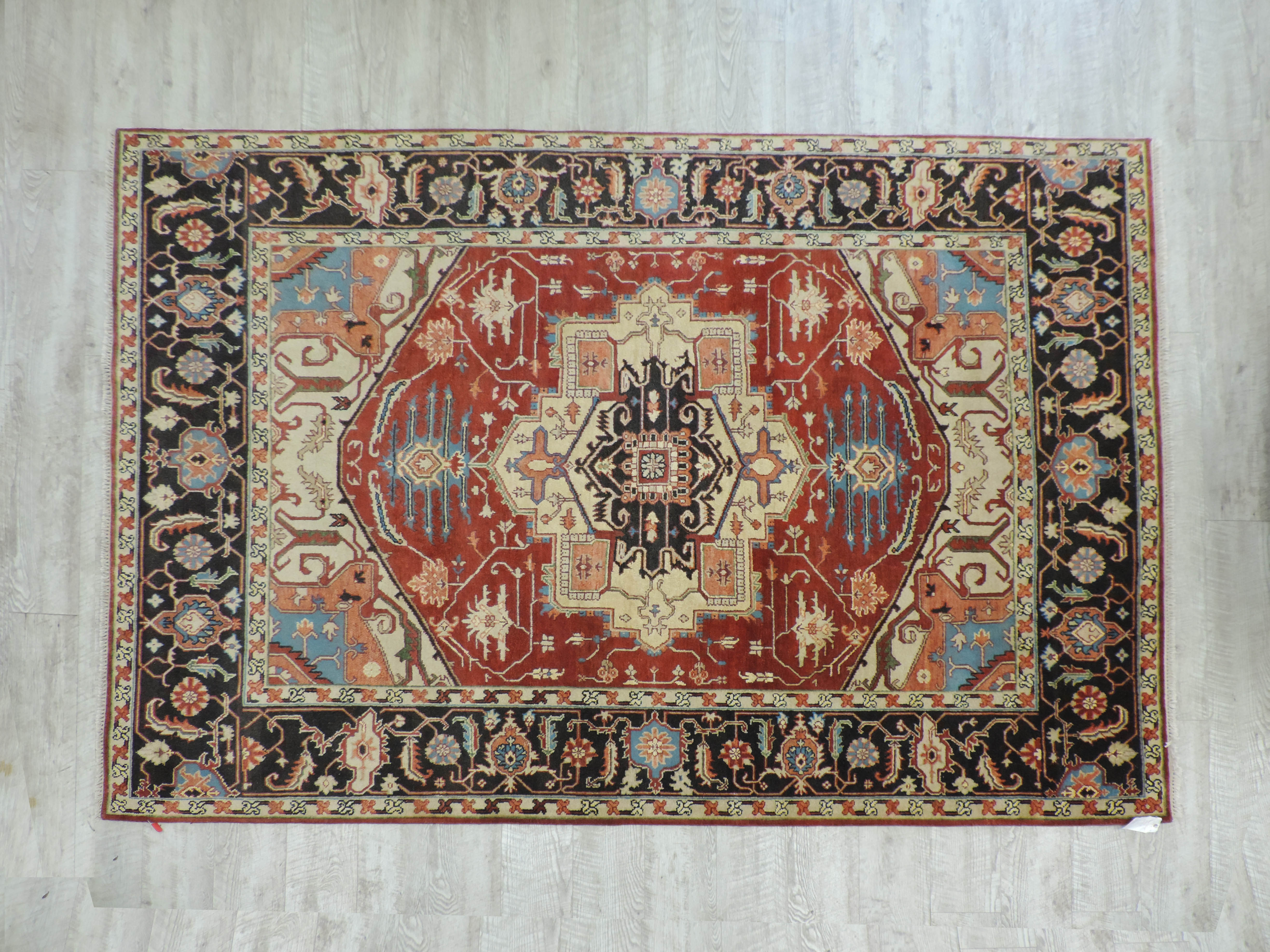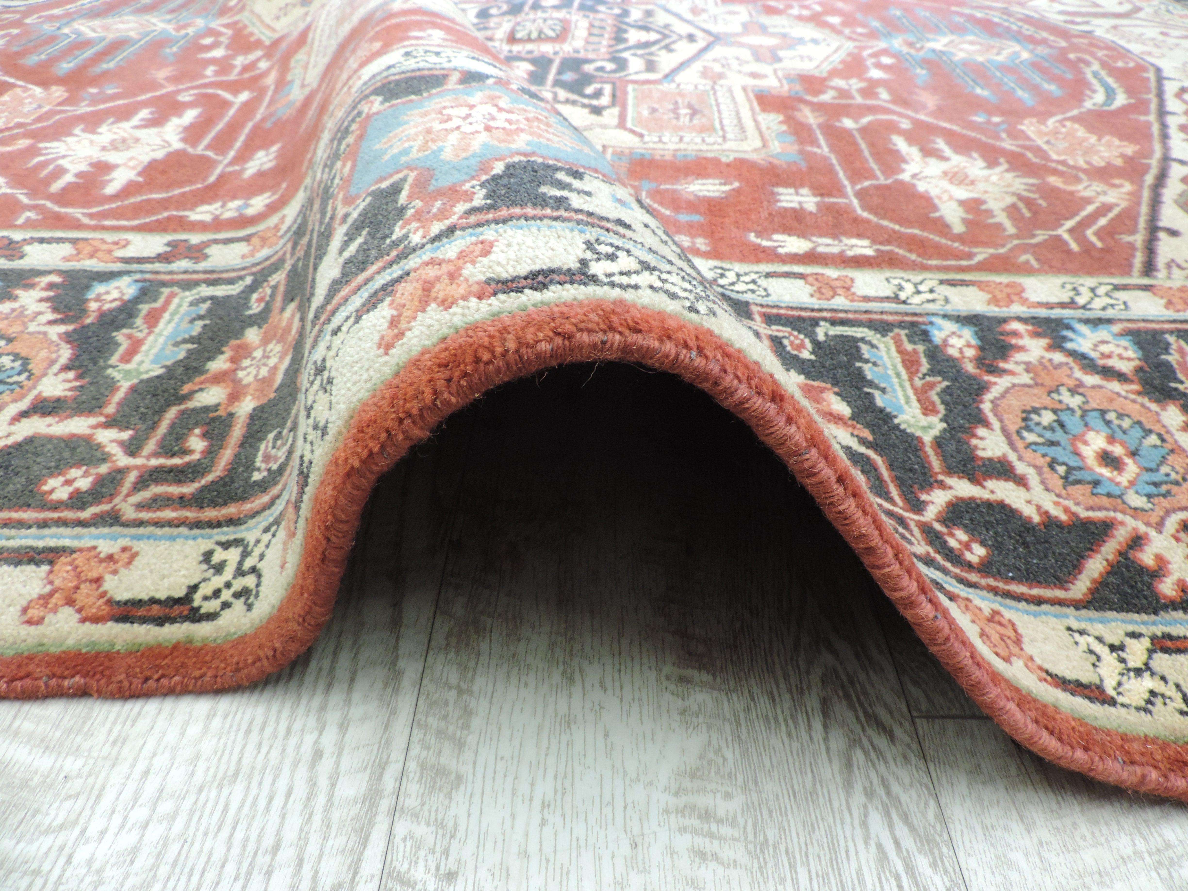 Step into luxury with the K-5564-SH rug, a unique piece that effortlessly marries traditional Indian craftsmanship with contemporary design. This hand-knotted, woolen work of art boasts a sophisticated geometric design, set against a rich, rustic hue that can bring any room to life. Now available at a special discounted price, this rare Serapi rug is a perfect blend of style, quality, and value.