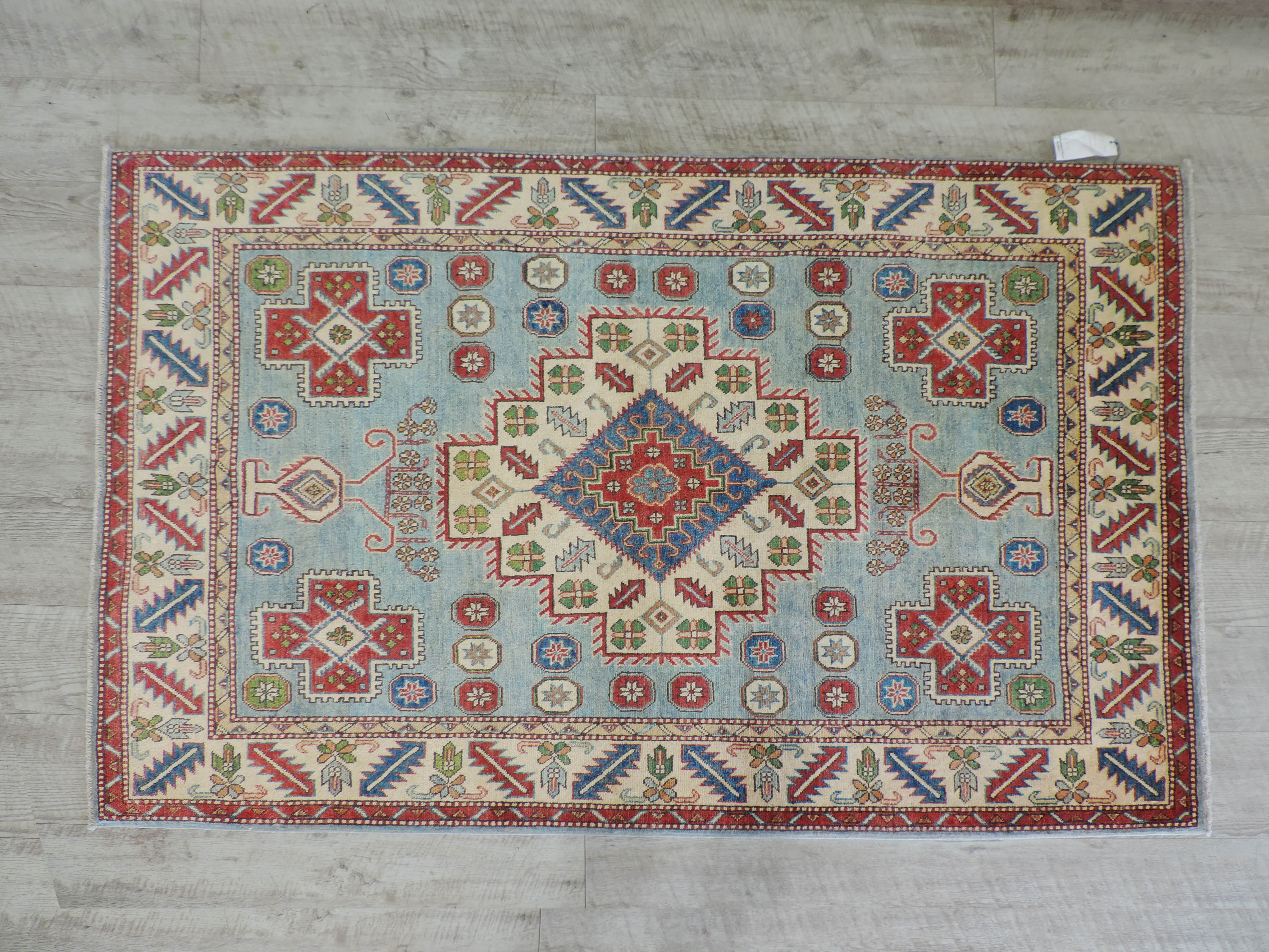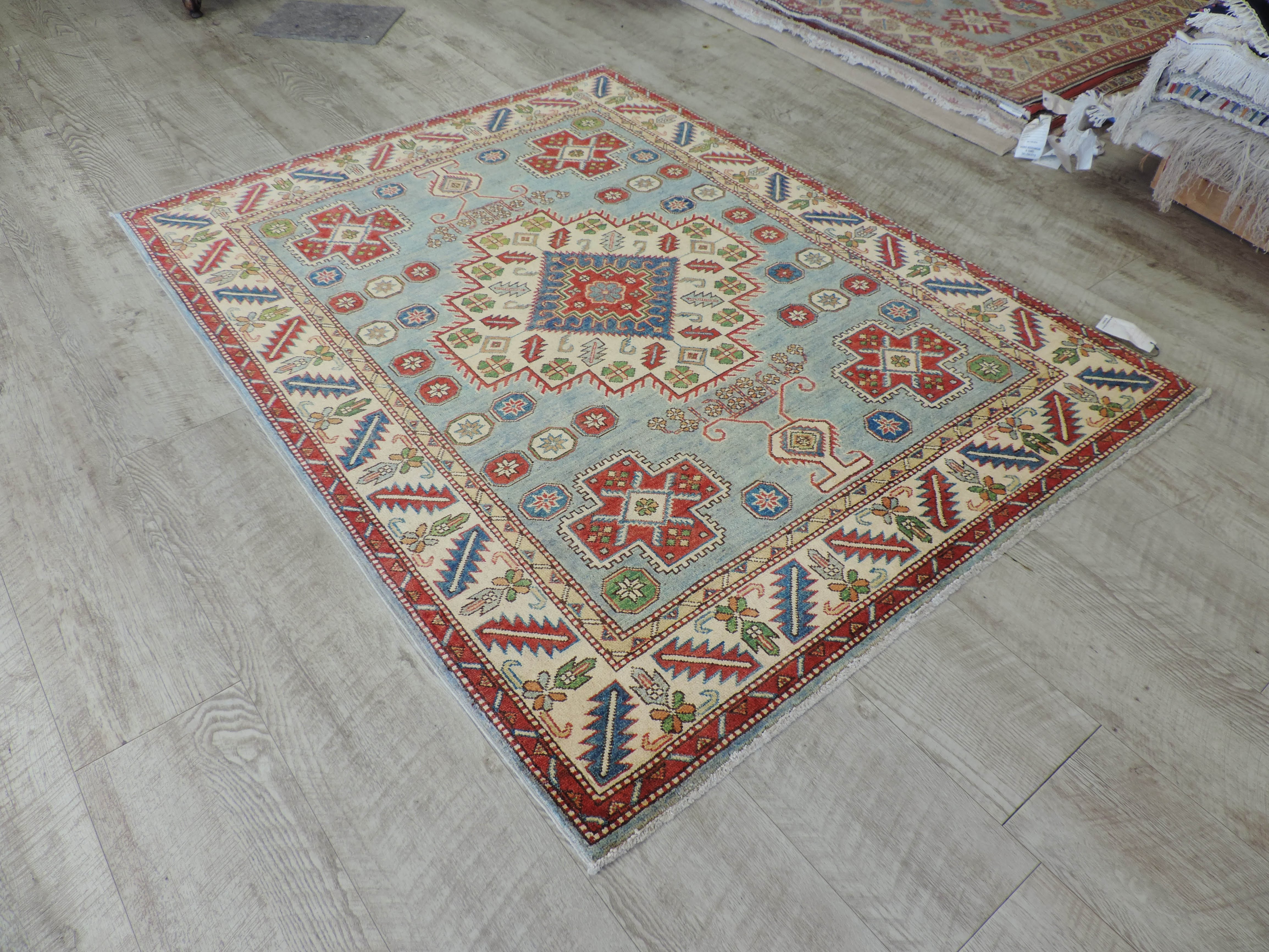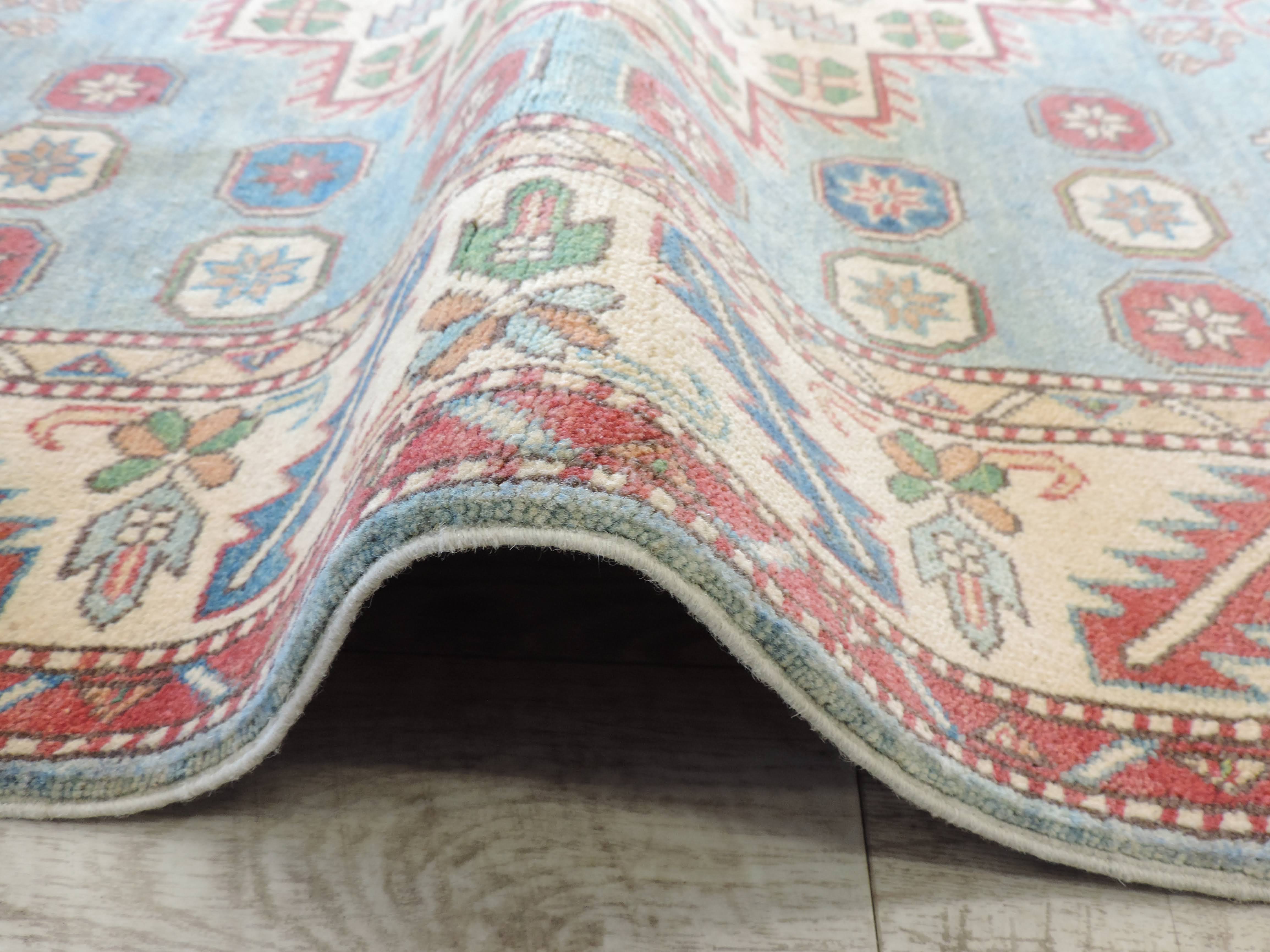 Immerse yourself in the rich craftsmanship of Afghanistan with this stunning KOKO-1005 rug. Hand-knotted from pure wool, this rug features a captivating geometric design set against a vibrant blue background. This unique Kazak style rug, with its rectangular shape and cotton foundation, promises not only durability but also an irresistible aesthetic charm that can give your space an instant uplift. Now available at a discounted price!
