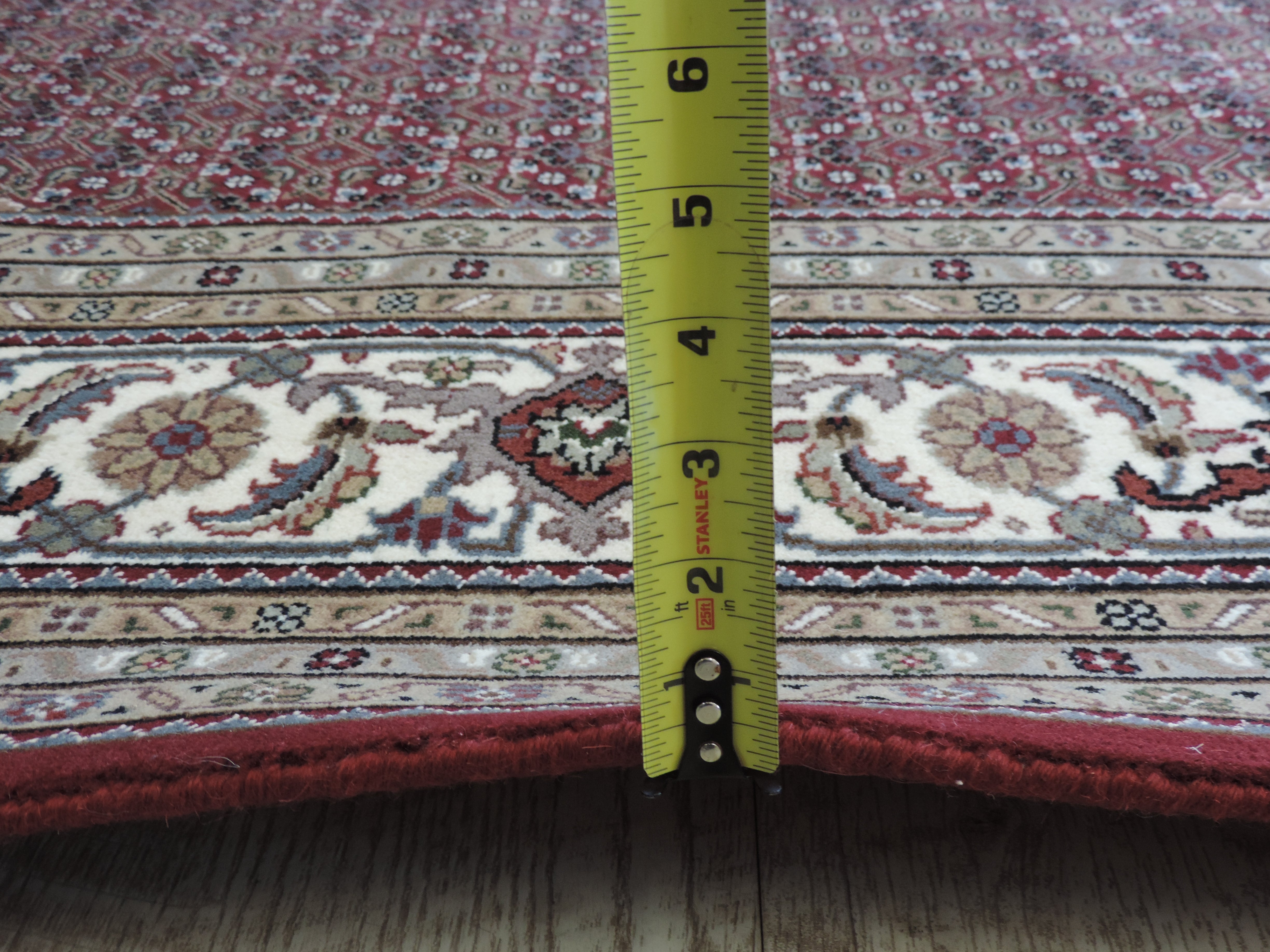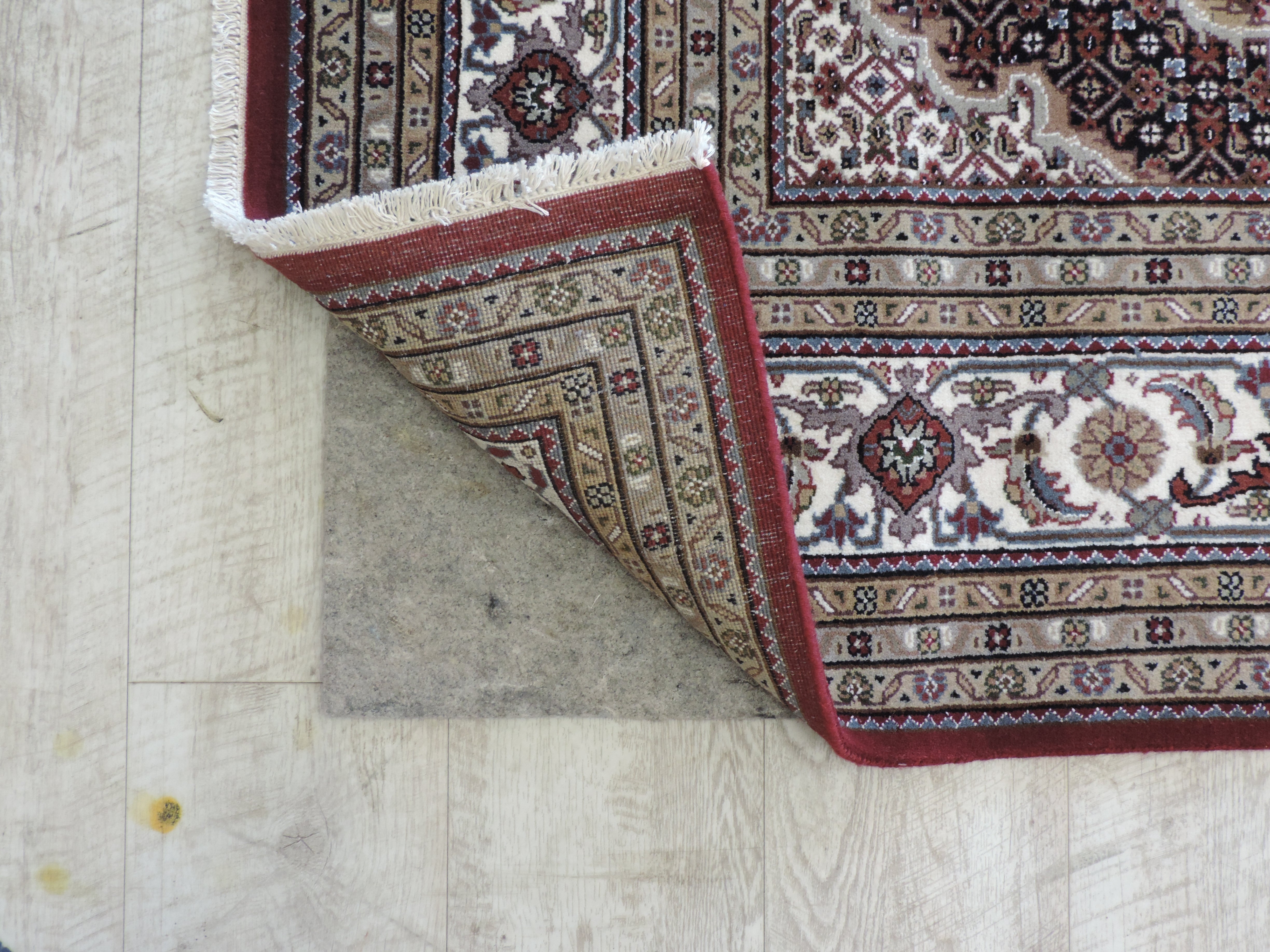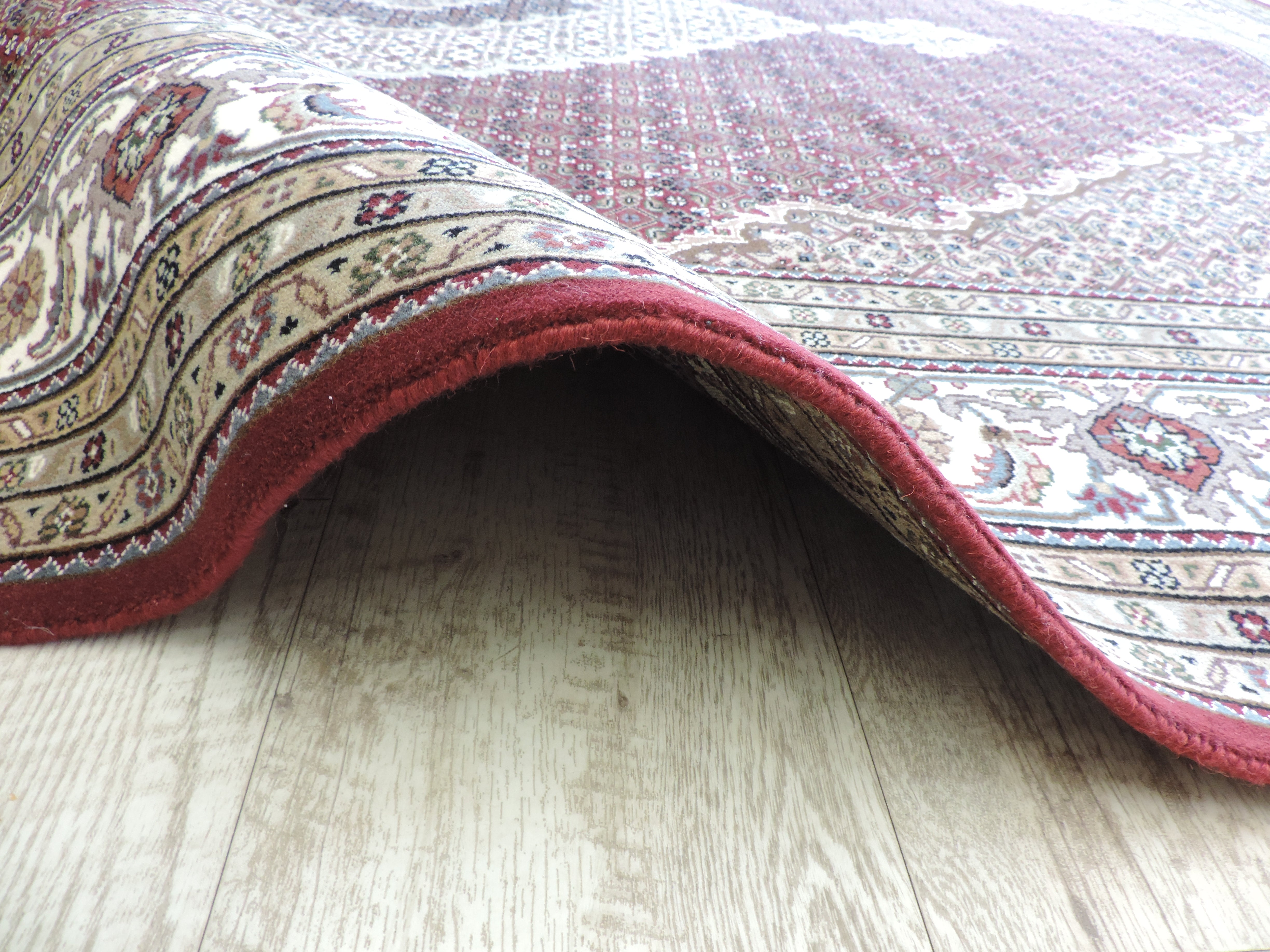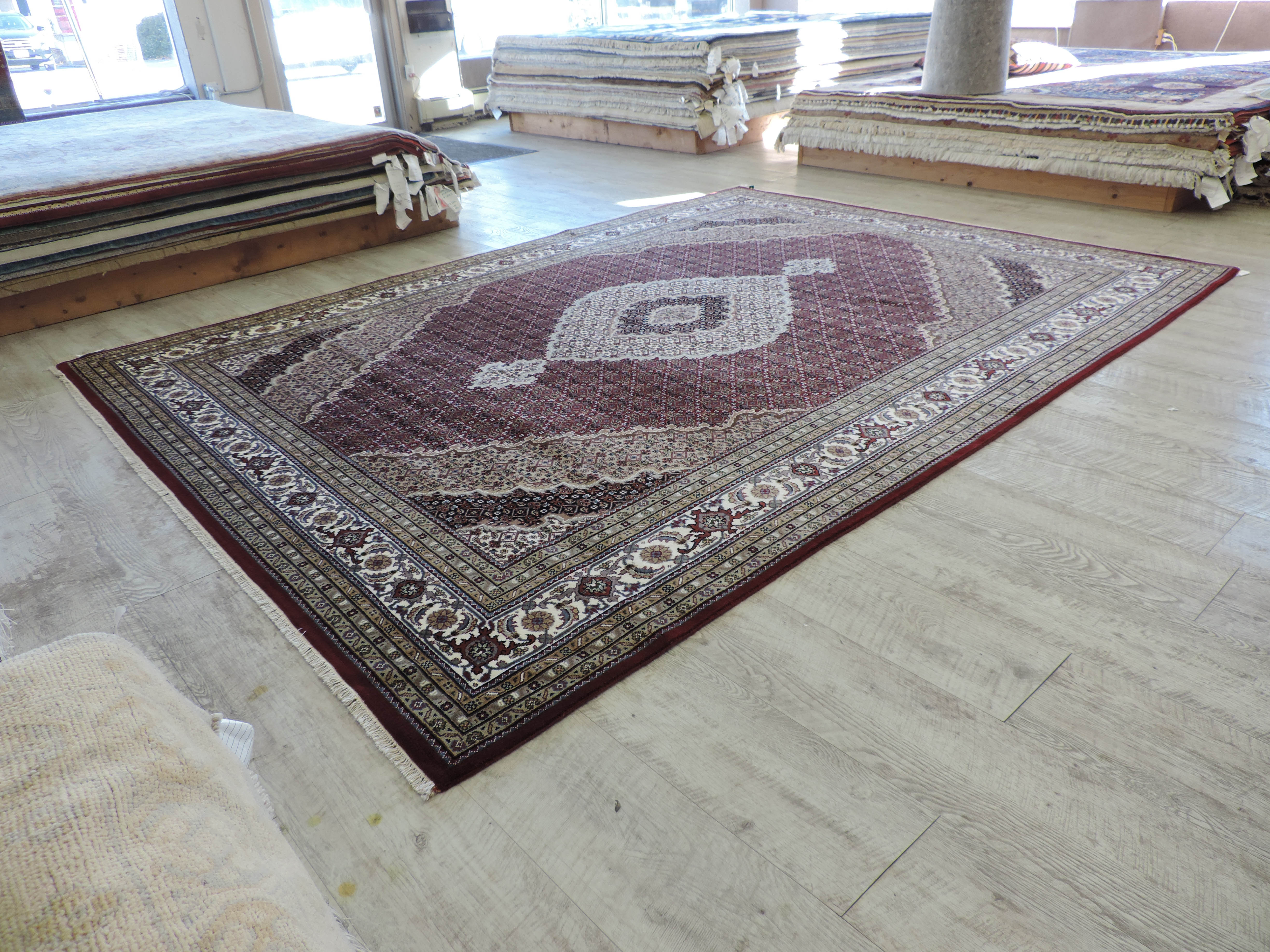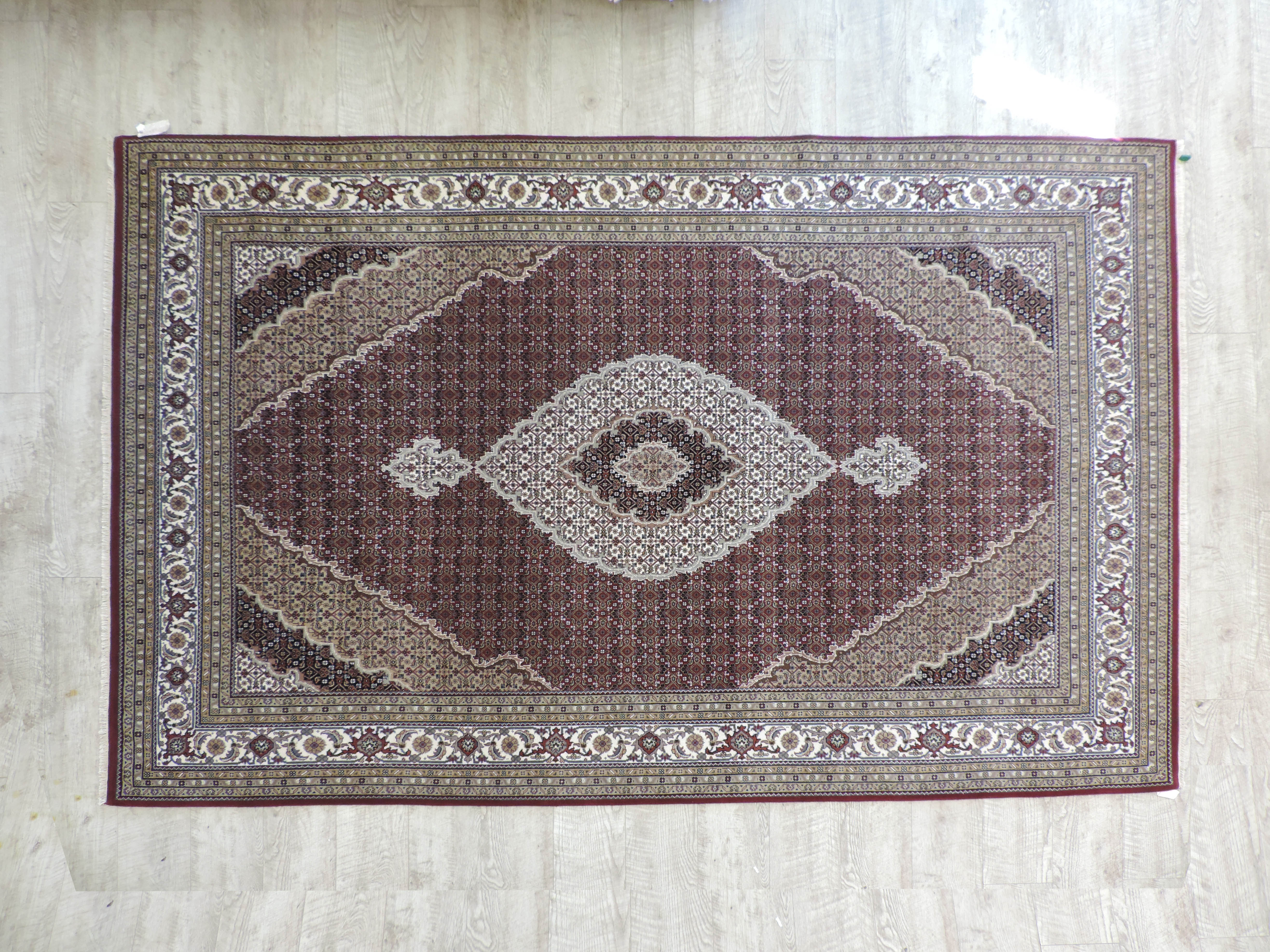 Experience the opulence of the East with the KOKO-1200 Tabriz Mahi rug. Hand-knotted in India from high-quality wool on a sturdy cotton foundation, this rug showcases a mesmerizing geometric design in rich tones of burgundy. Its luxurious texture and intriguing pattern, now available at a fantastic sale price, make this piece a captivating addition to any room.