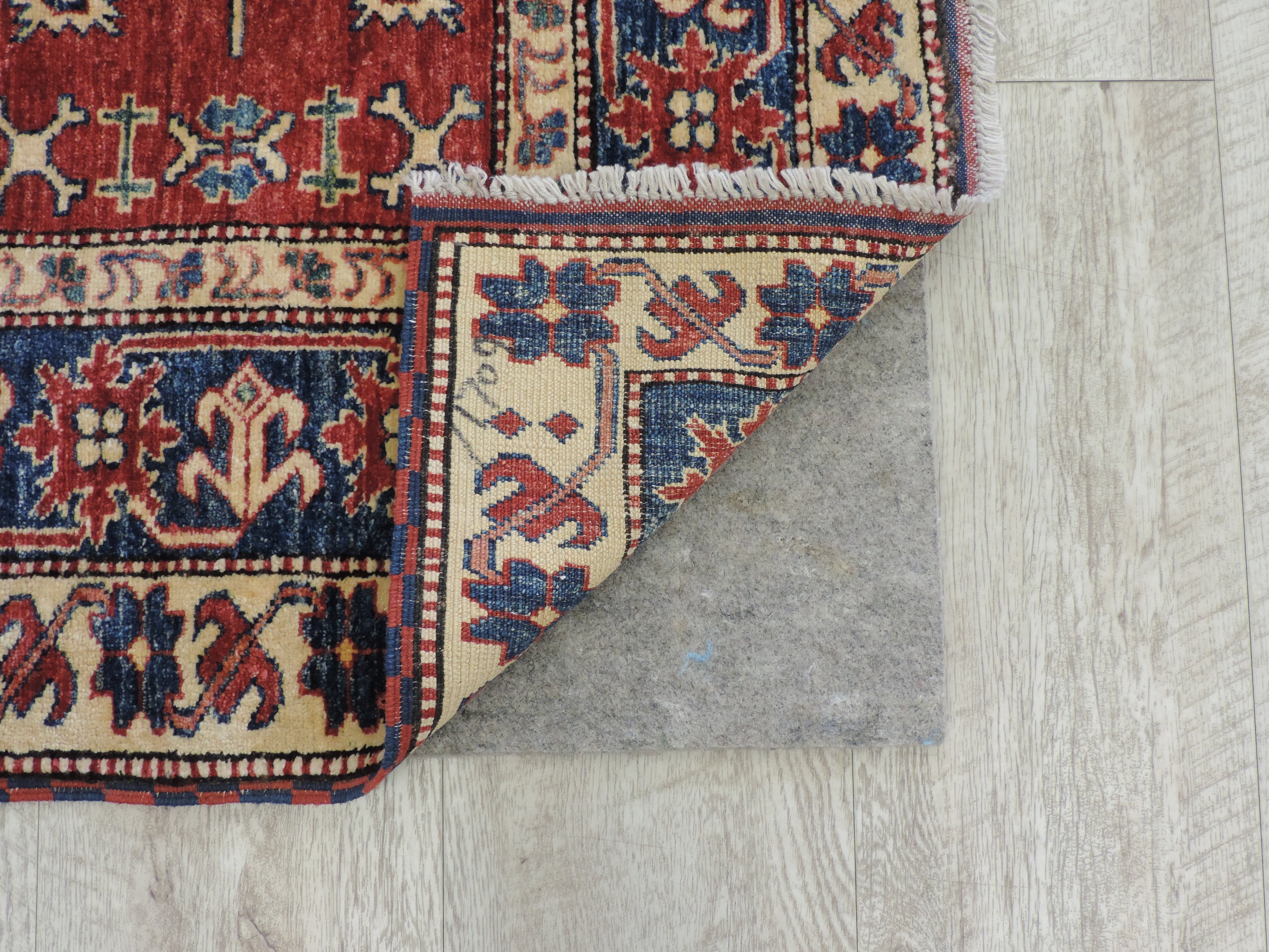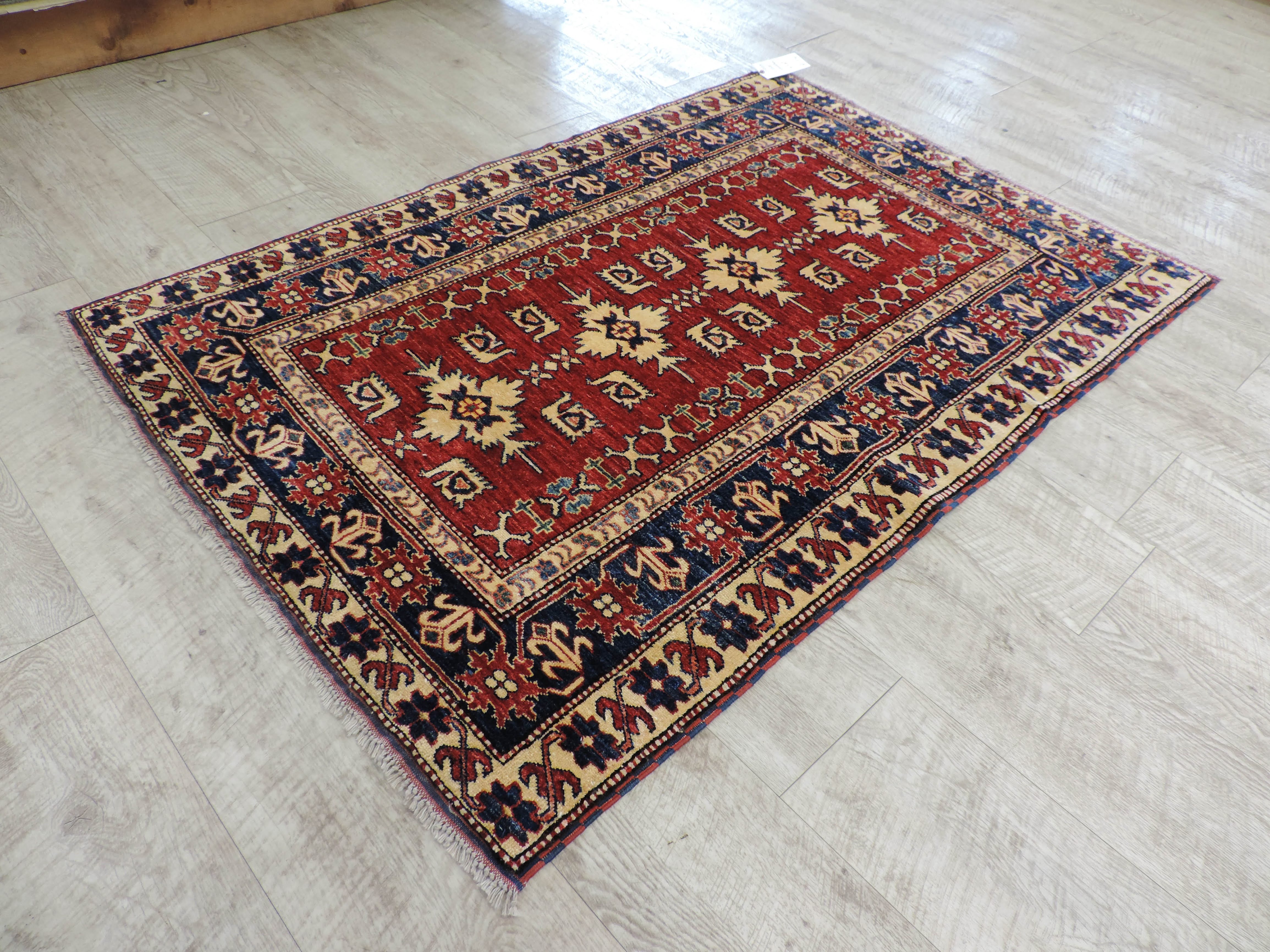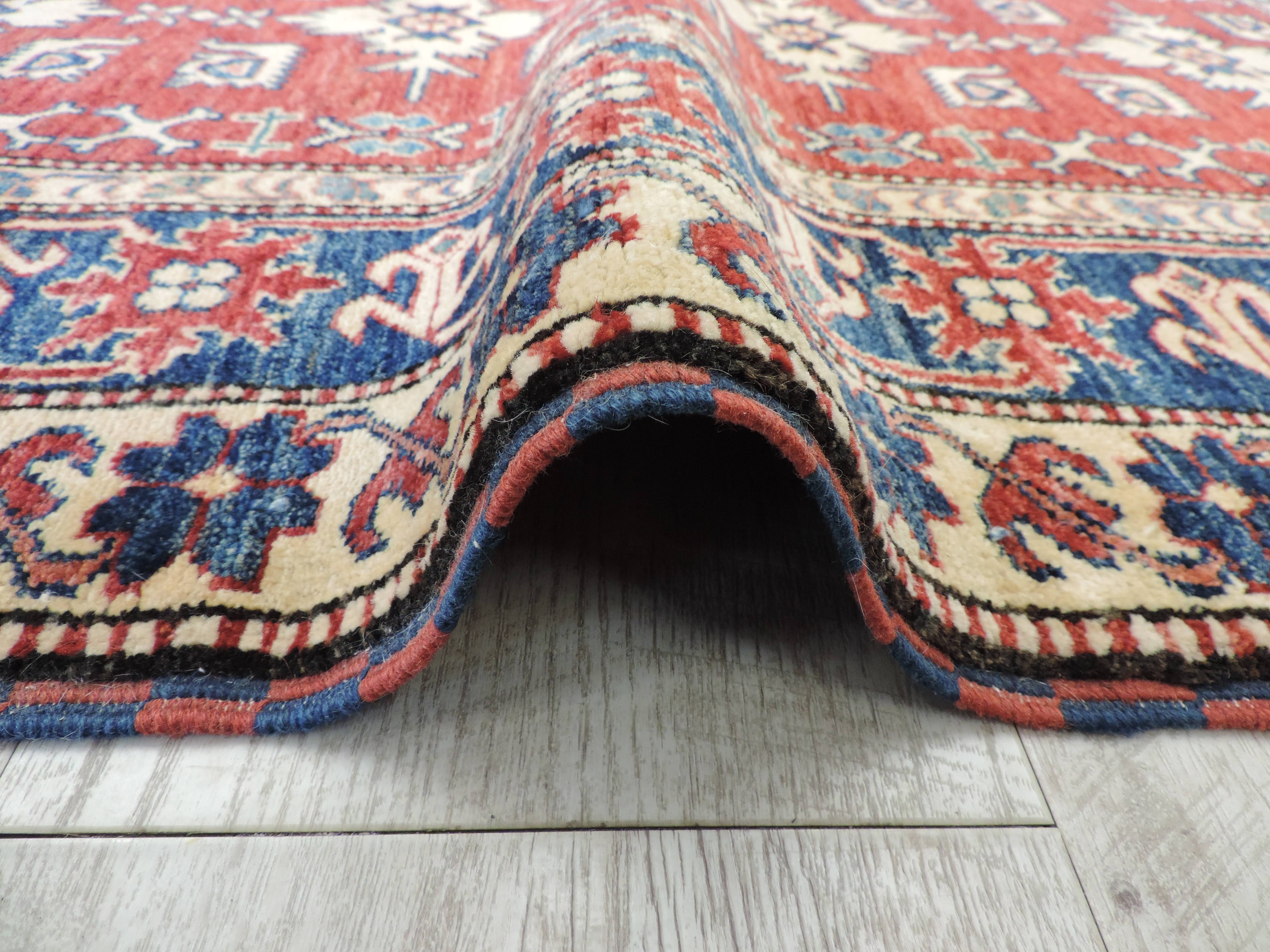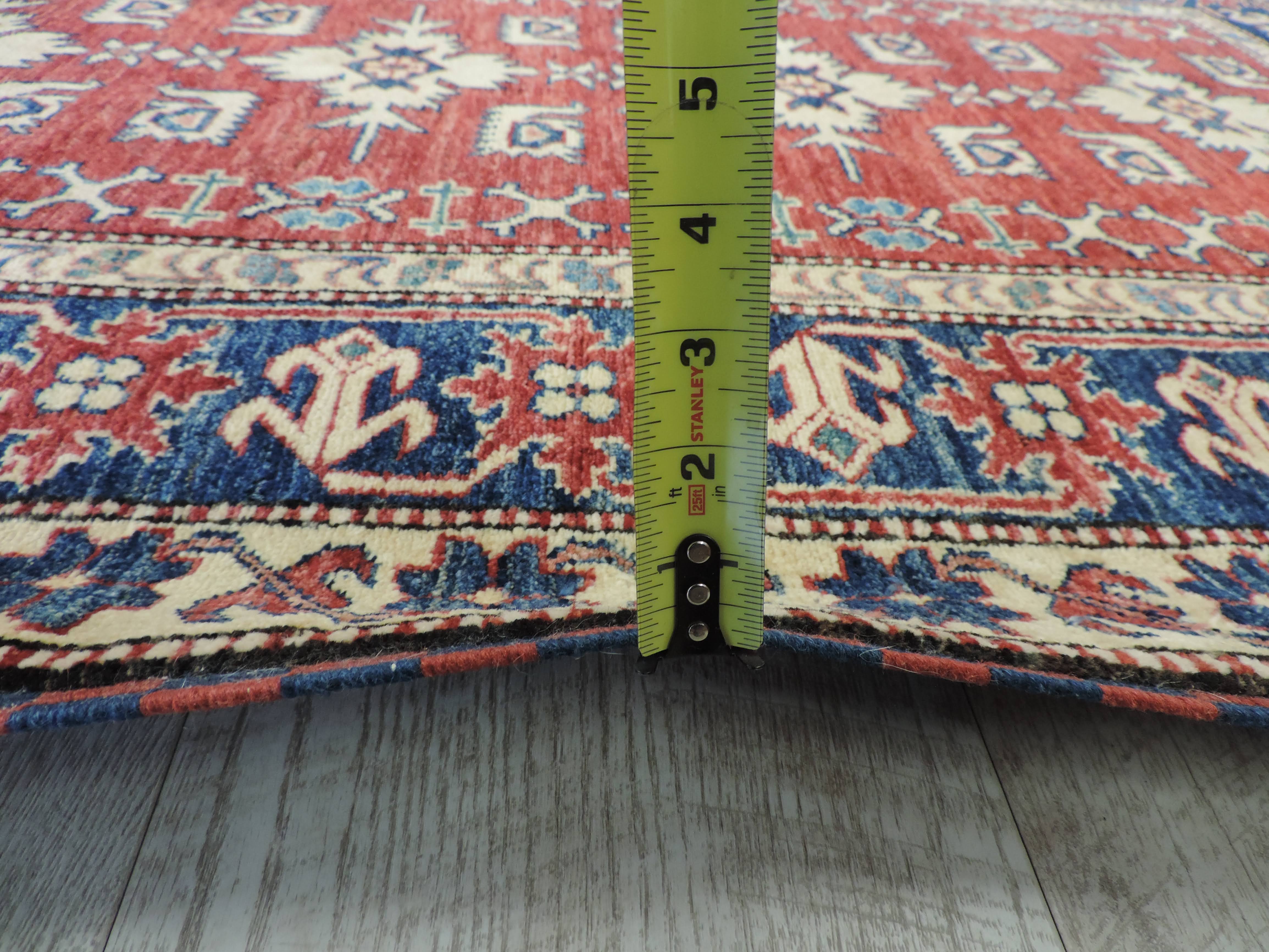 Experience the warmth and charm of the KOKO-2015 rug, a unique blend of traditional Afghanistan artistry and contemporary craftsmanship. Hand-knotted with premium wool on a sturdy cotton foundation, this rug features a bold geometric design in a vibrant shade of red. Currently available at a special sale price, this rectangular Kazak-style rug is a captivating addition that promises to transform any living space instantly.