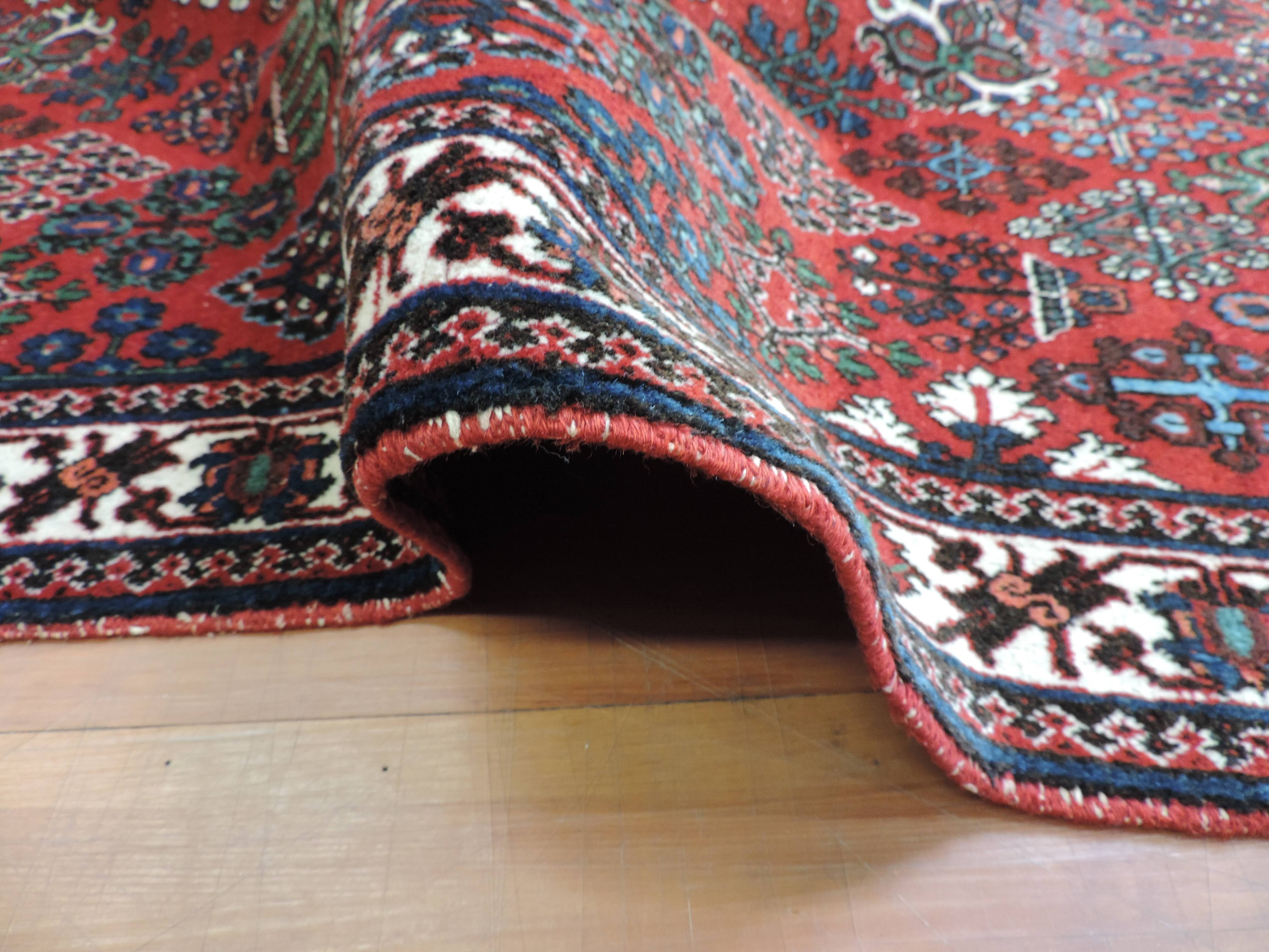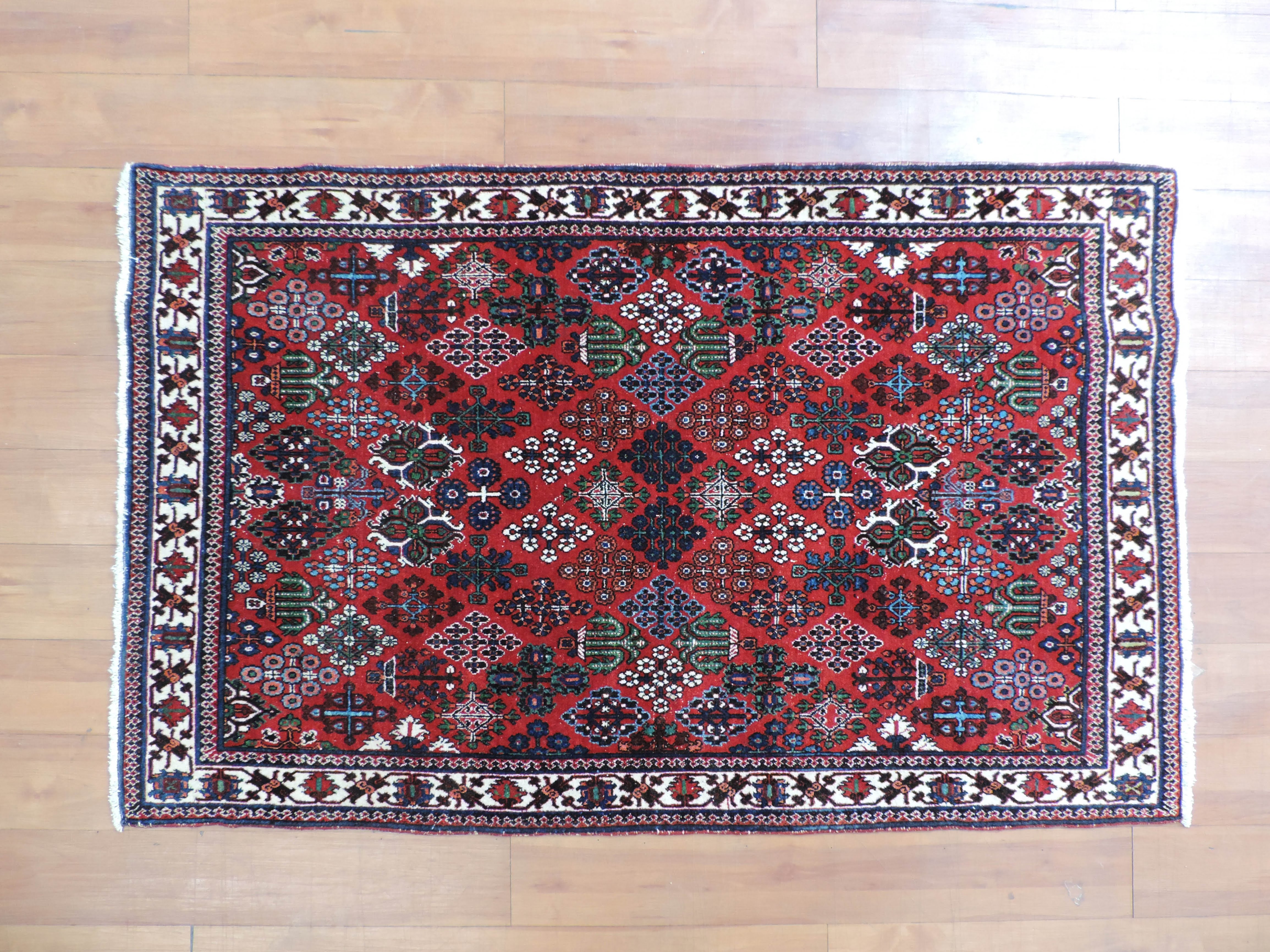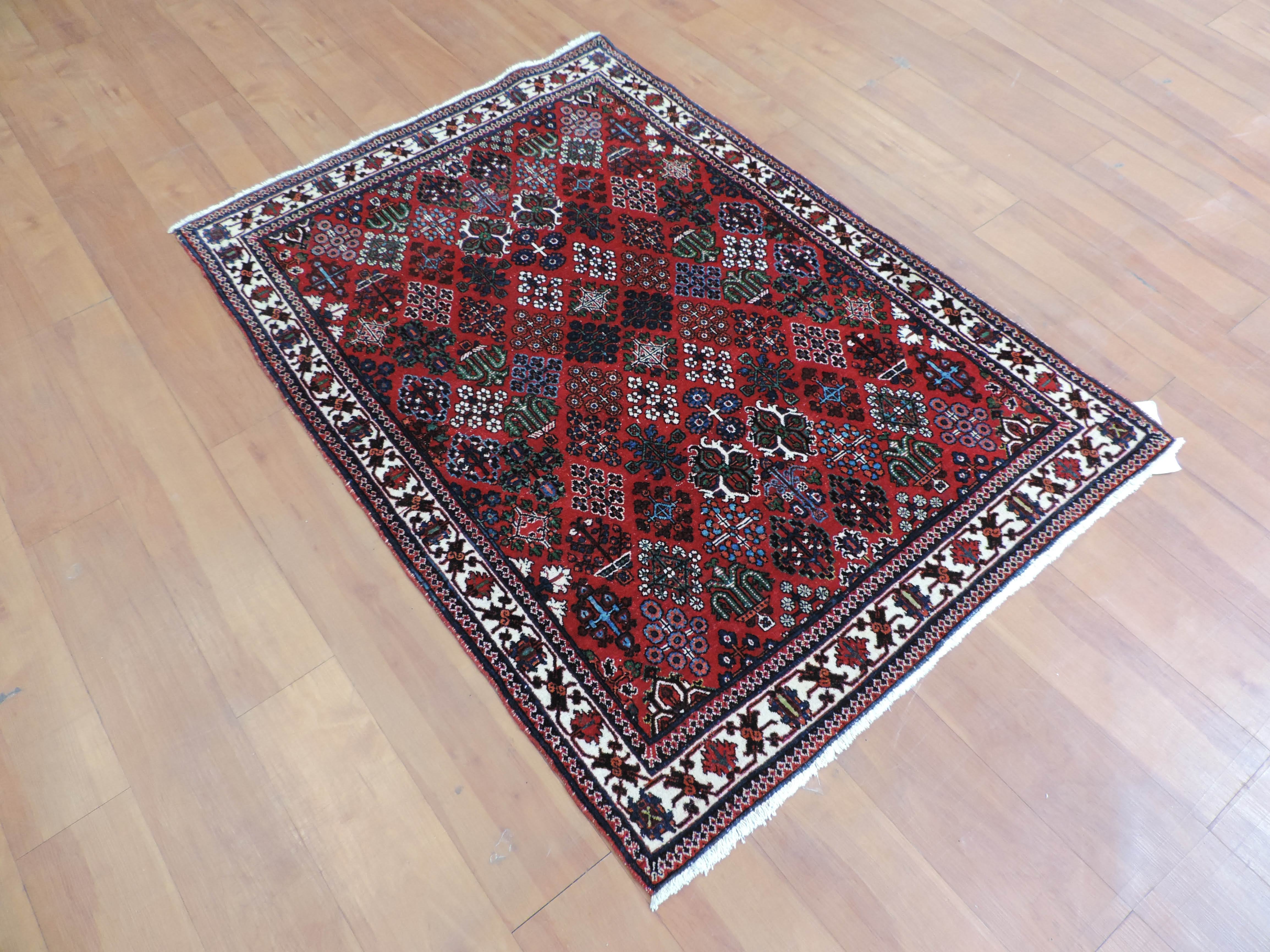 Exquisitely hand-knotted in Iran, this vibrant new Joshegan rug (KOKO-2018-4) showcases a captivating geometric design, tastefully saturated in a rich red hue. Crafted from durable wool with a cotton foundation, this 3.6 x 5.0 feet rectangular masterpiece is a luxurious addition to any space, offered at an unbeatable sale price. Experience the fusion of style, tradition, and quality with this one-of-a-kind oriental gem.