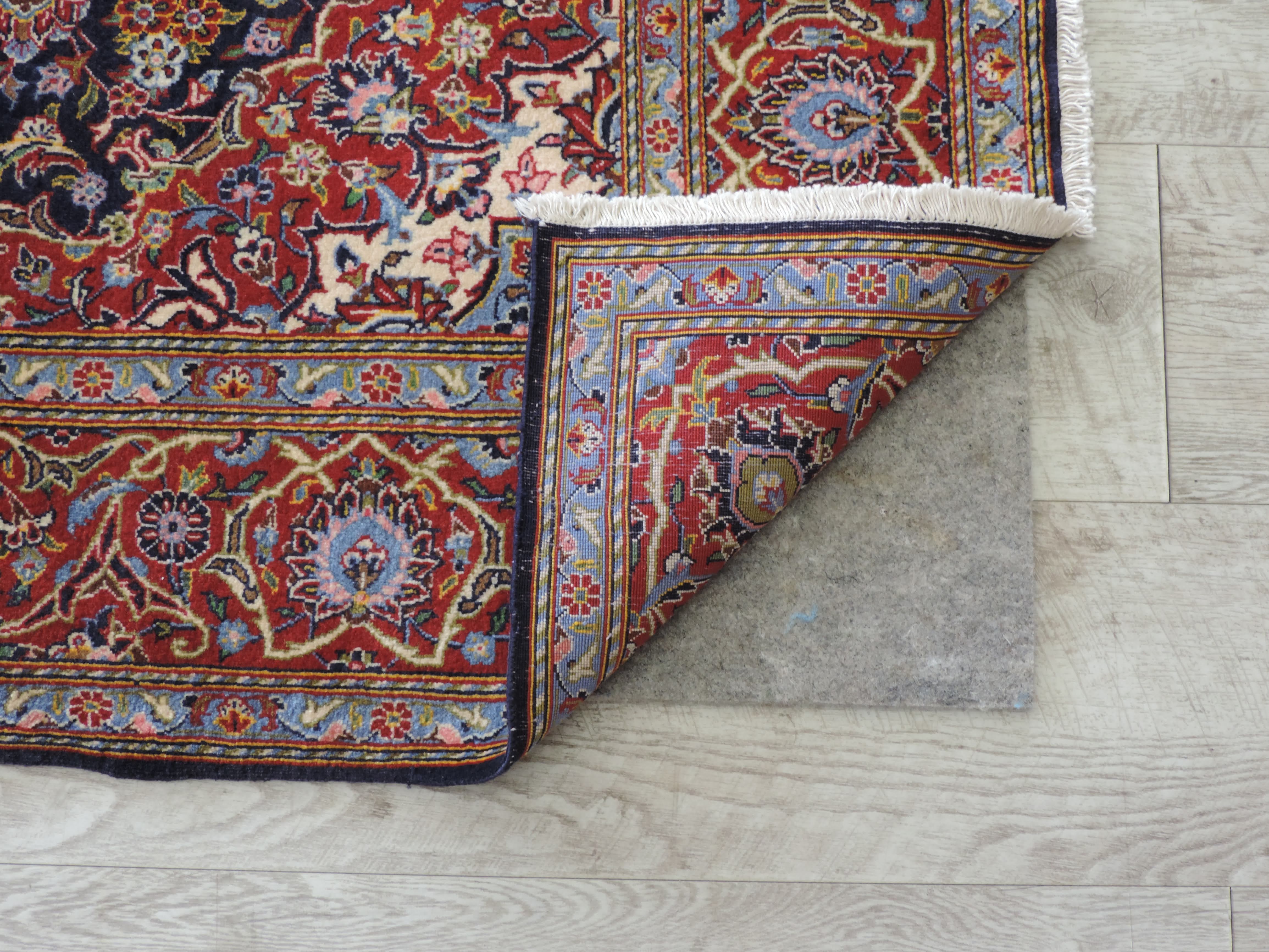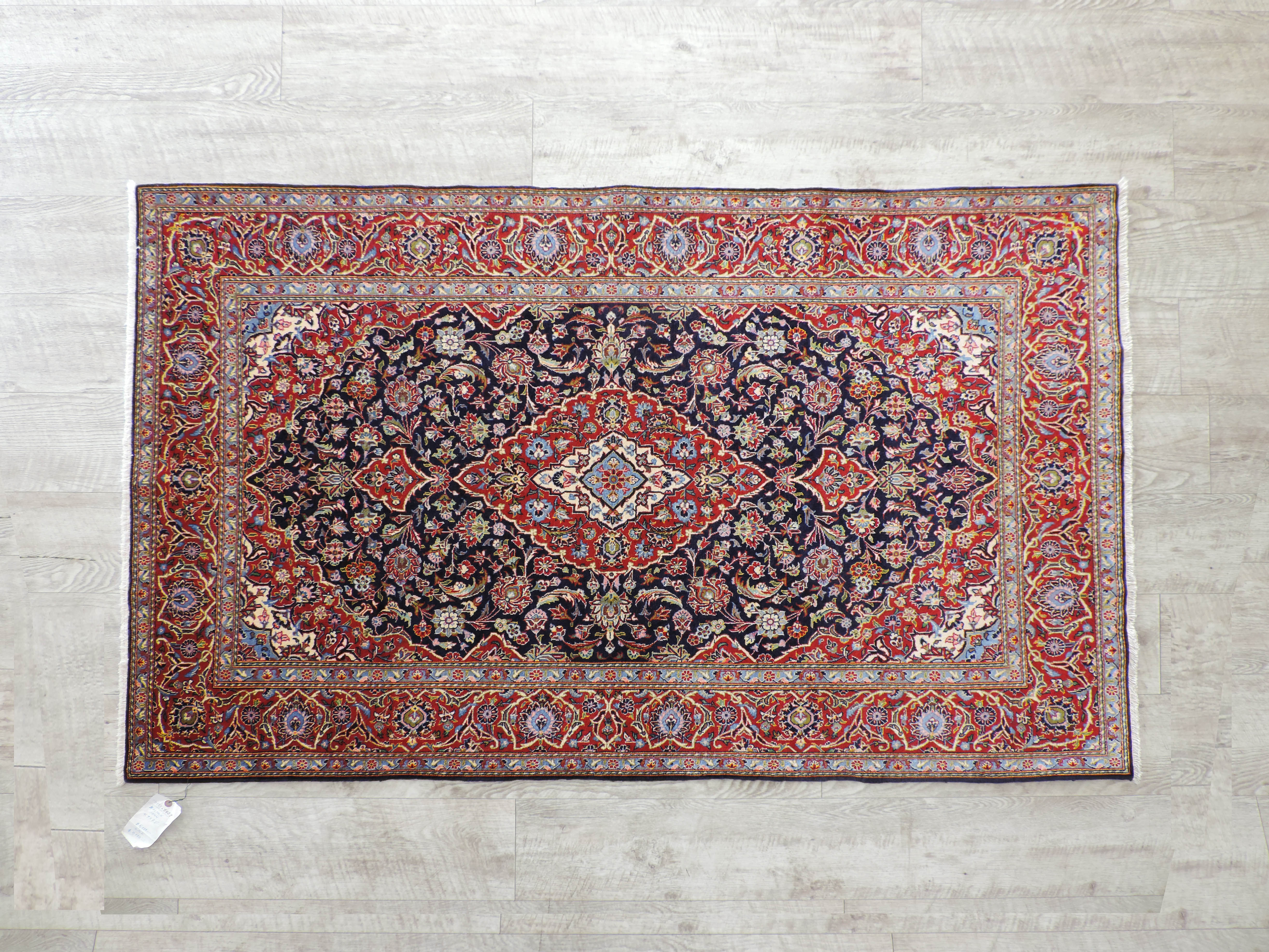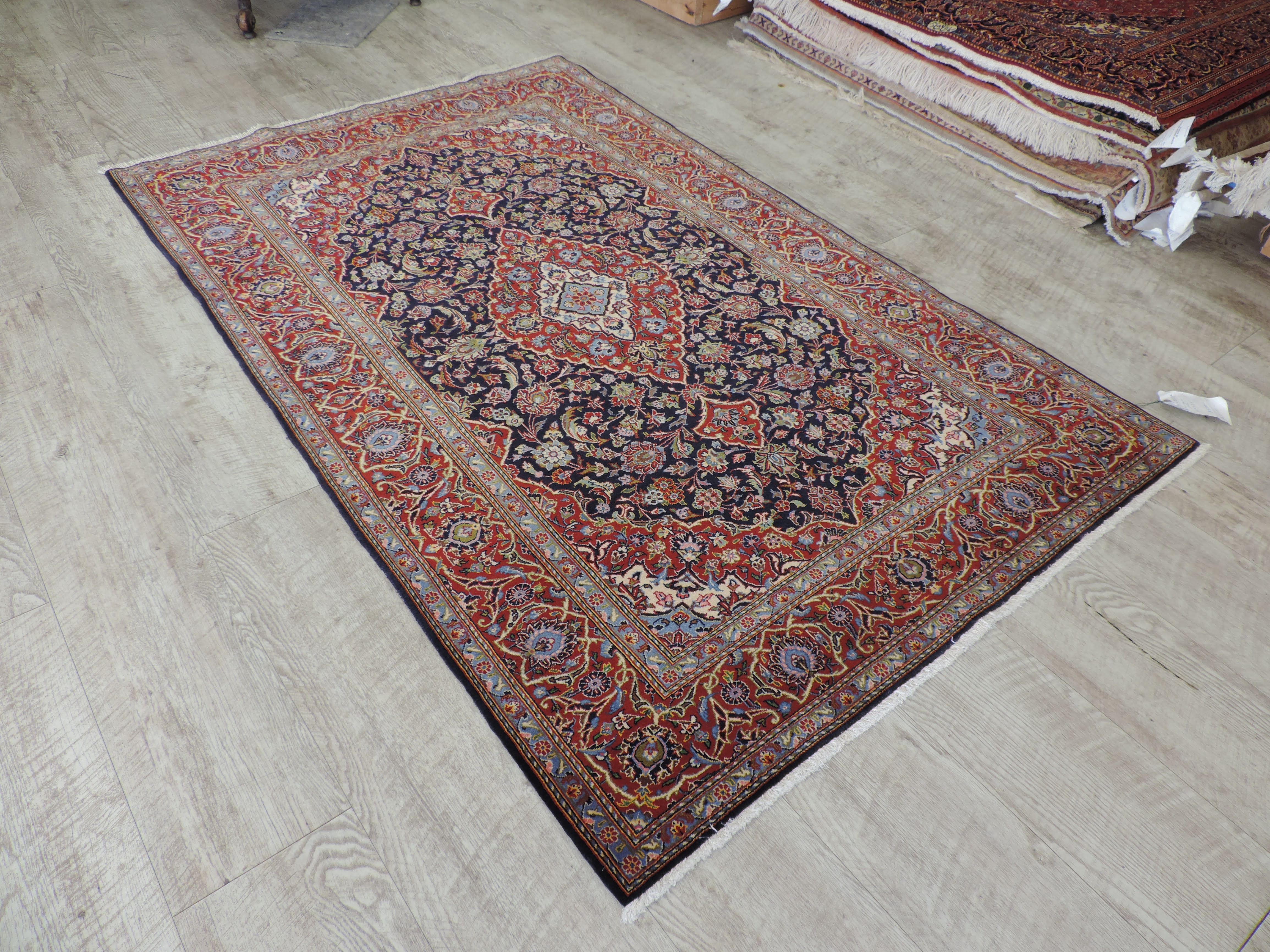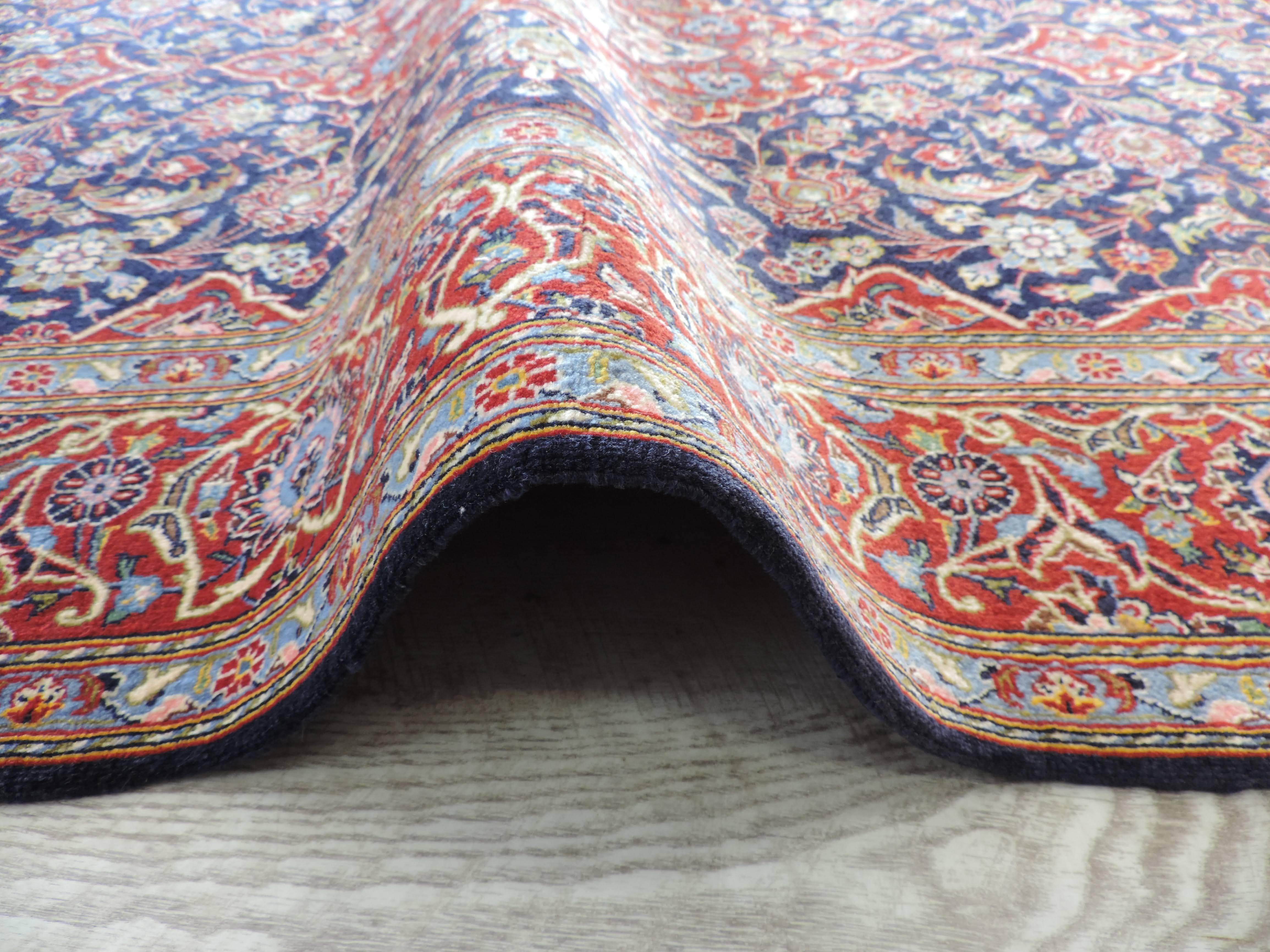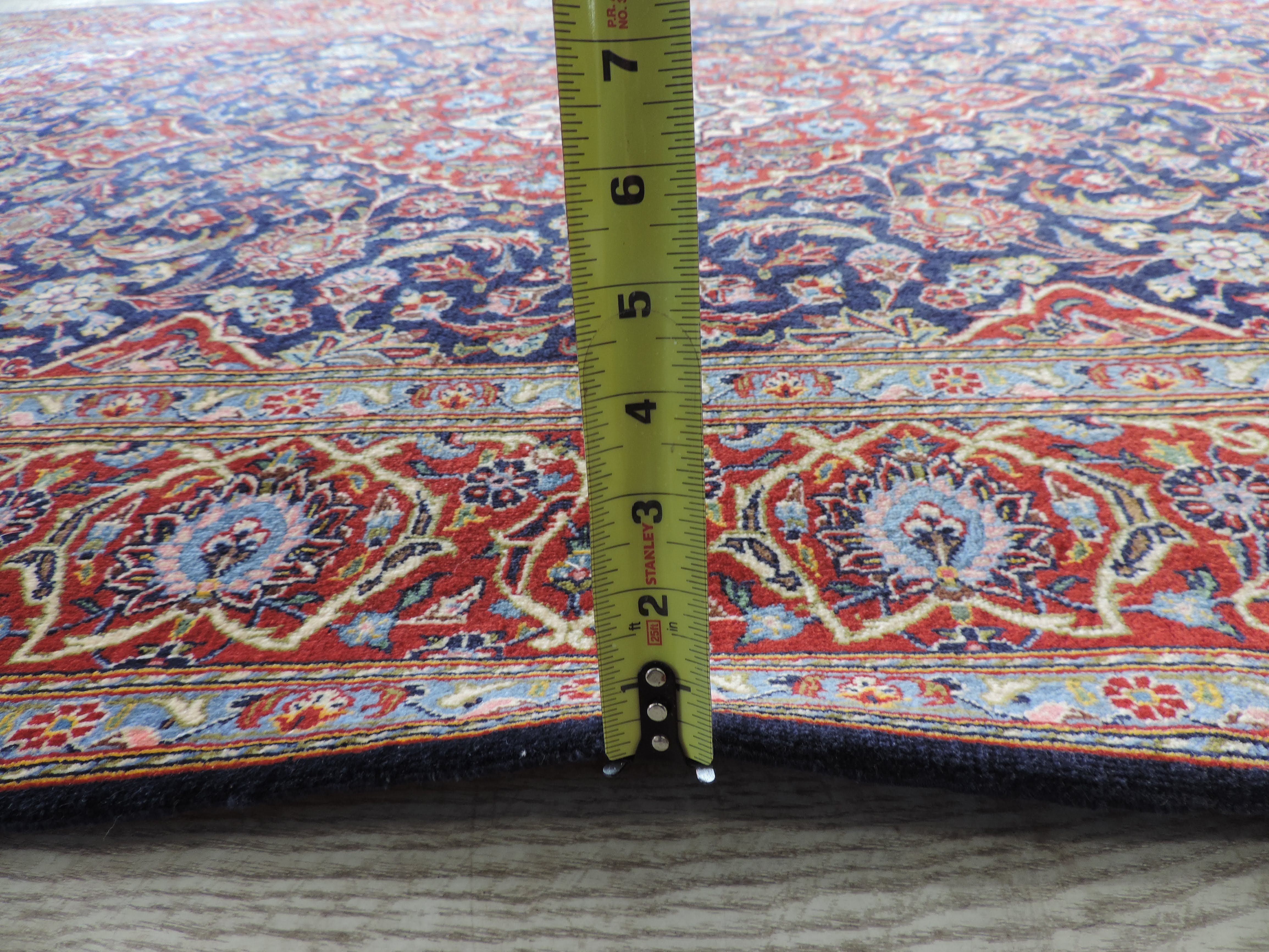 Immerse yourself in the exquisite craftsmanship of the KOKO-2027 Kashan rug. Hand-knotted in Iran, this brand-new piece boasts an intricate floral design on a rich navy wool canvas that's sure to make a stunning centerpiece in any space. Available at an enticing sale price, its timeless elegance paired with superior durability makes it an investment-worthy beauty awaiting your collection.