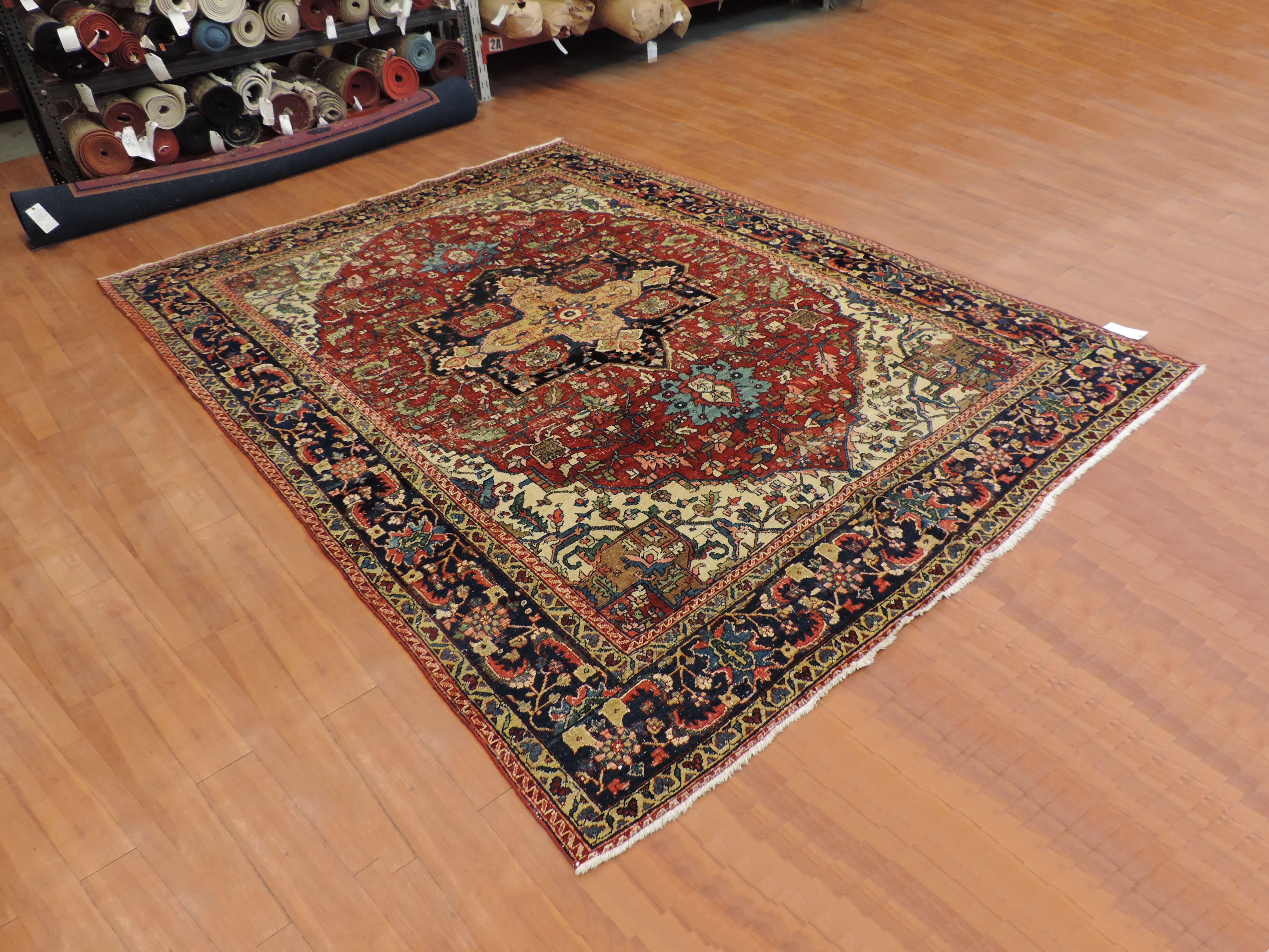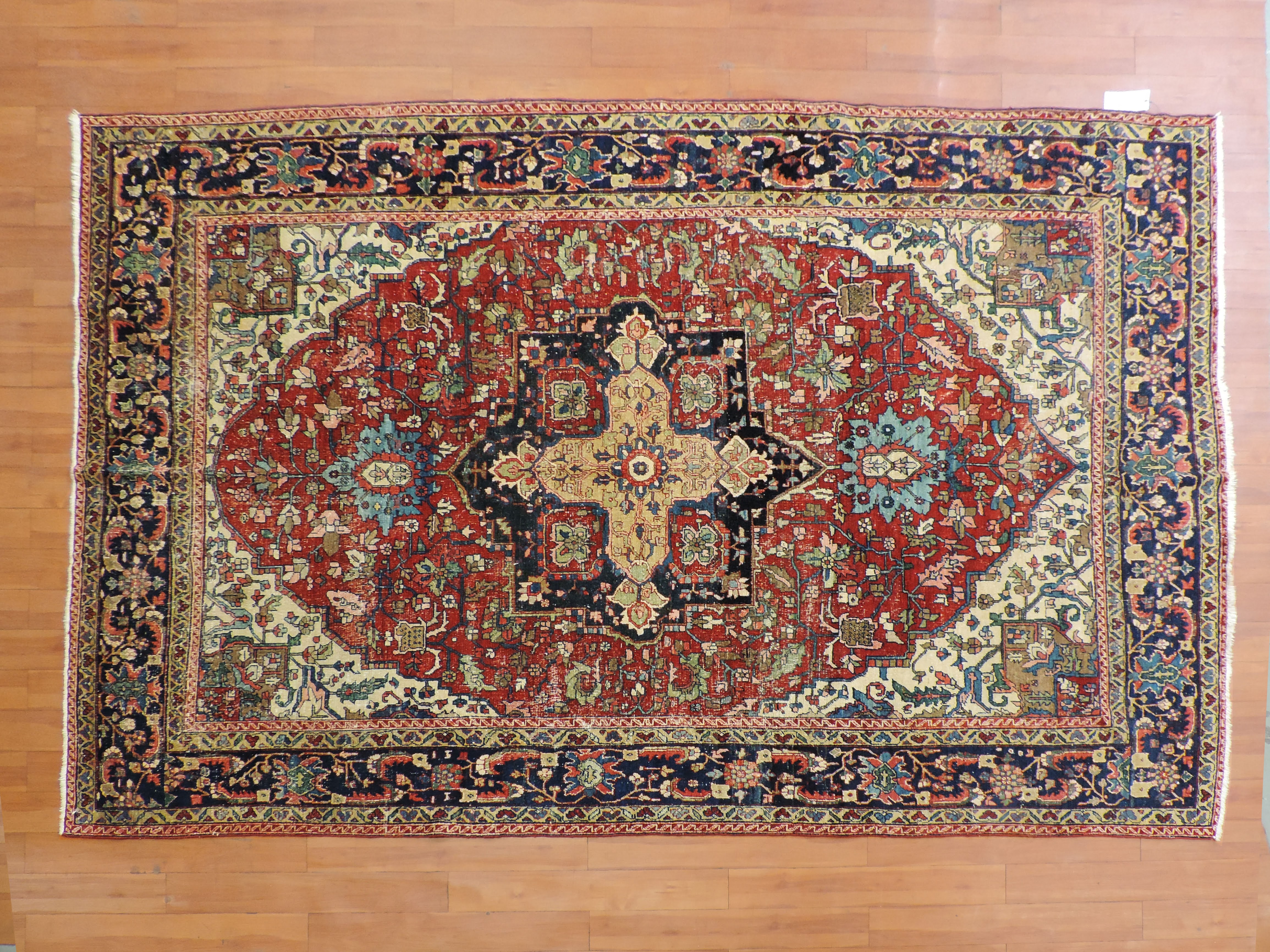 Add a touch of timeless elegance to your home with our Koko-2207 rug. This hand-knotted, antique Heriz rug from Iran features a mesmerizing red geometric design woven onto a sturdy wool and cotton foundation. Its generous dimensions (9.0 x 12.0) make it the perfect statement piece for any room, and at a sale price of $4250, it's a steal for such an exquisite artifact from 1920.