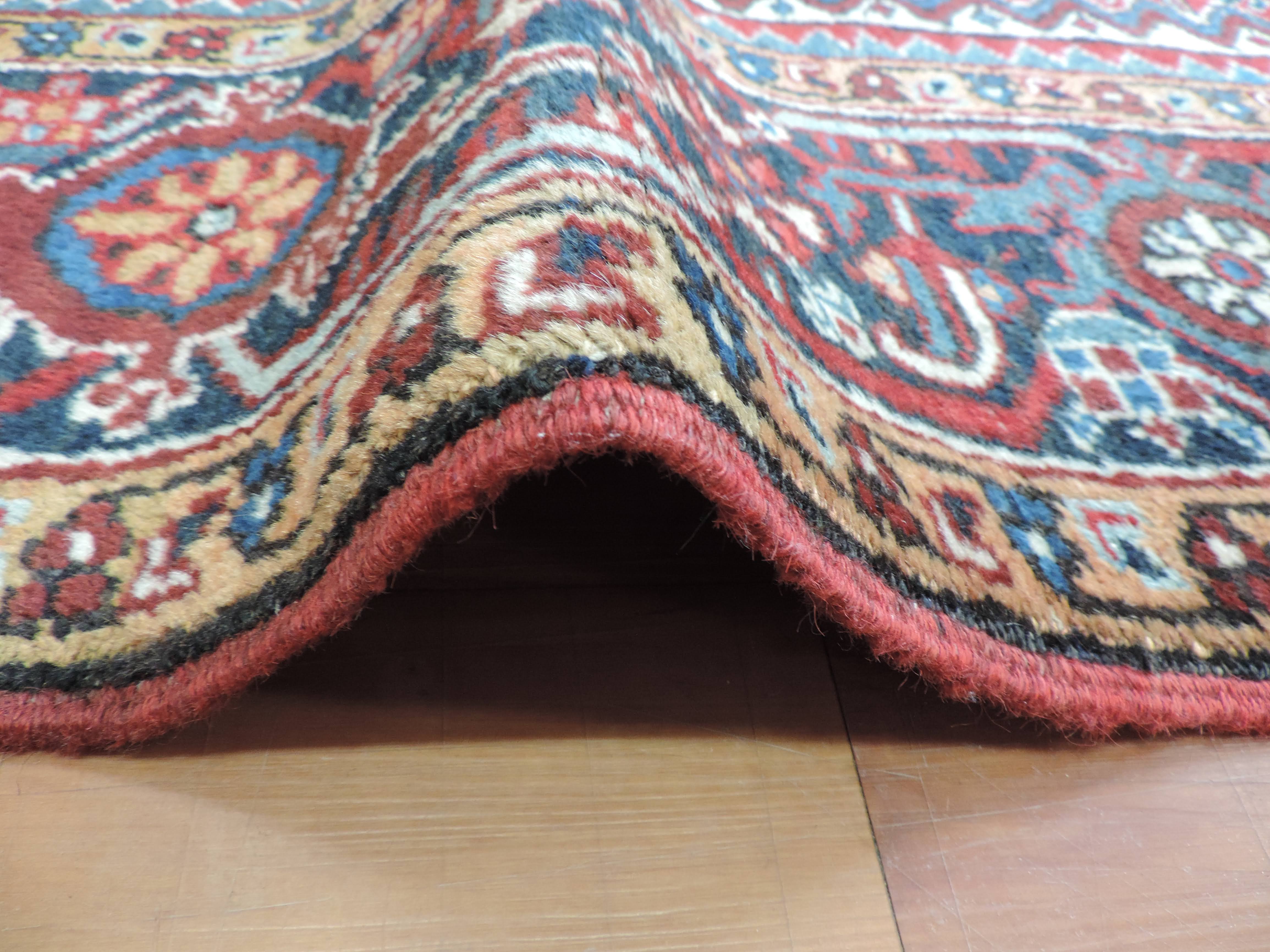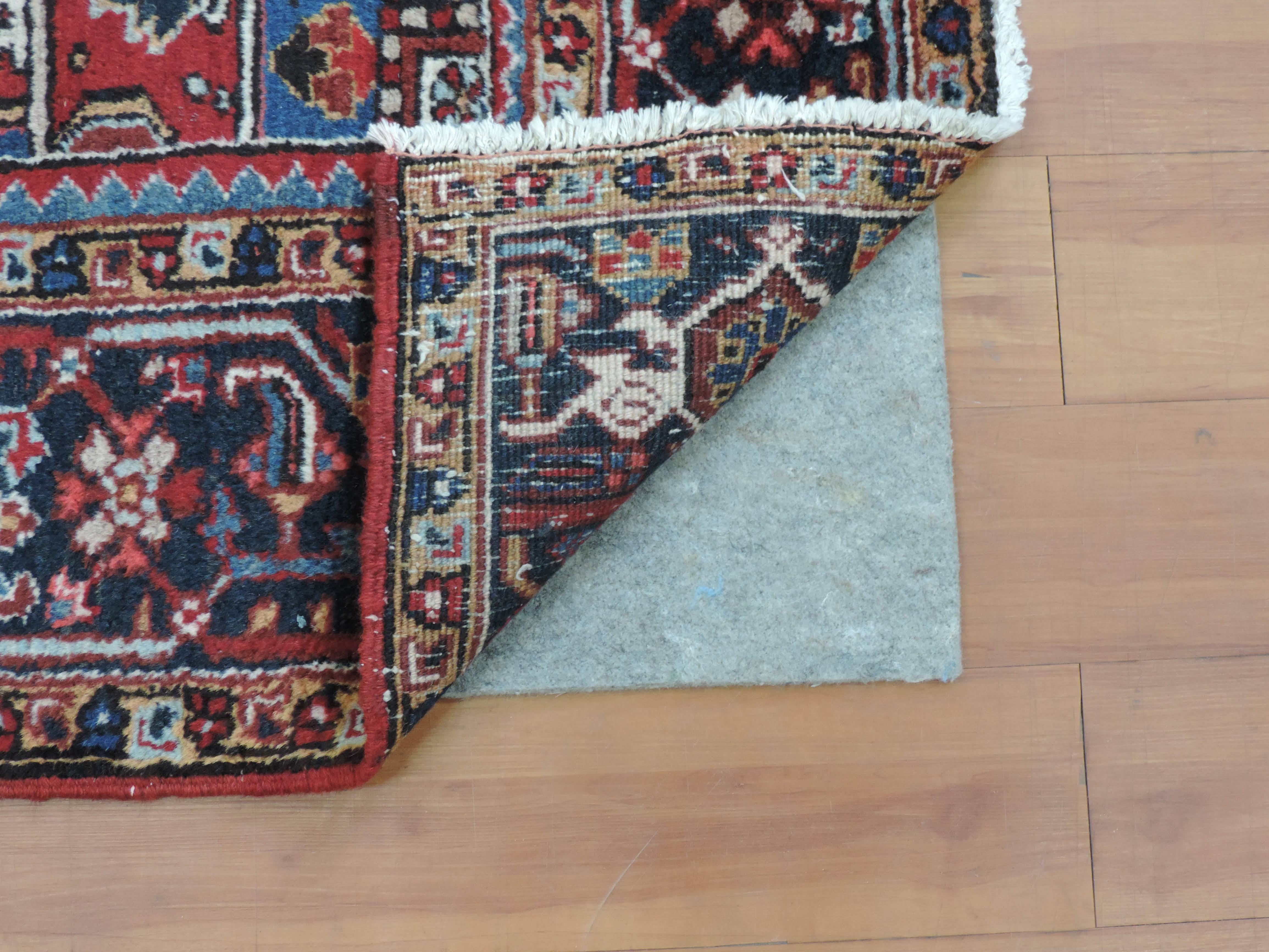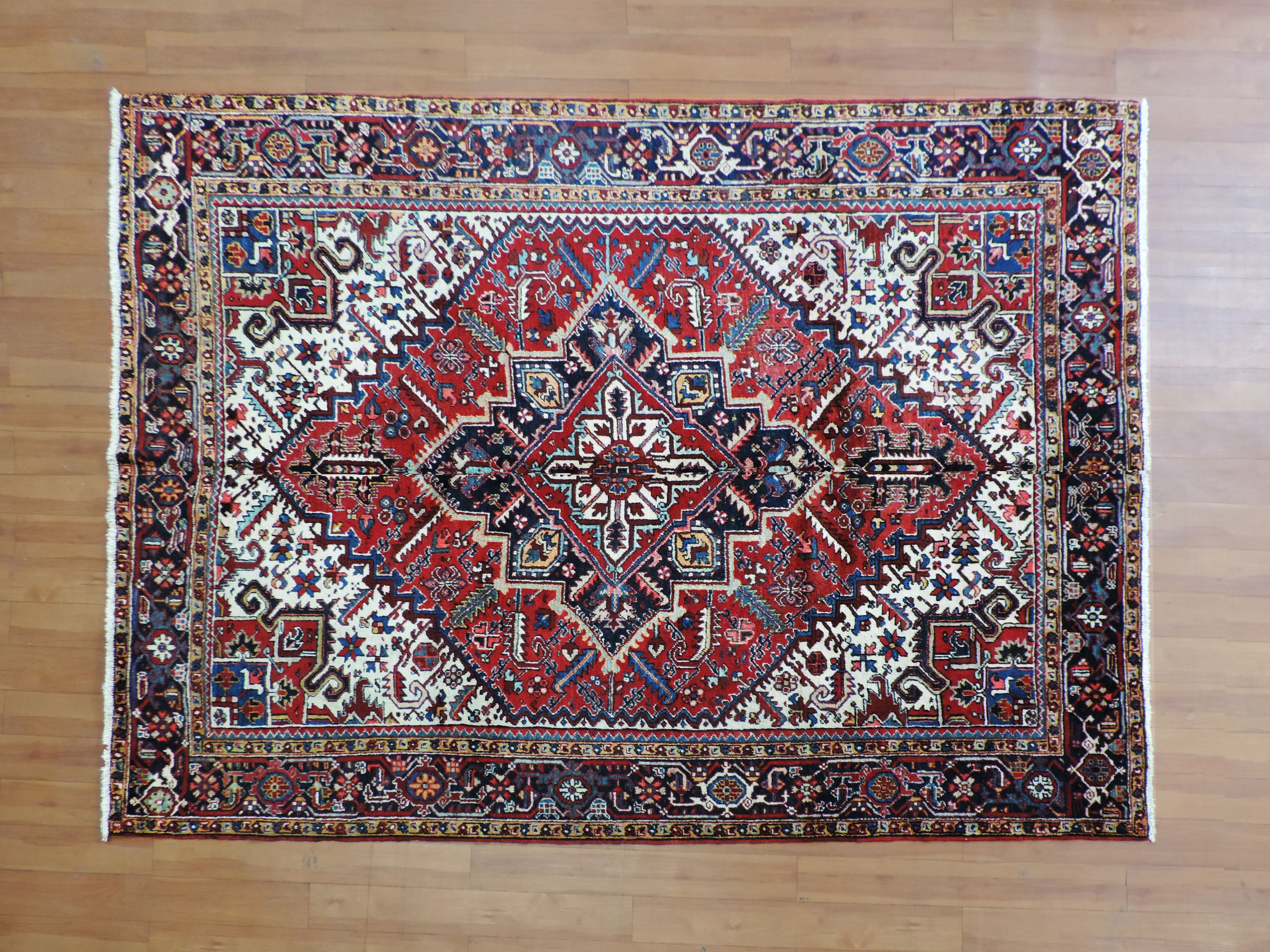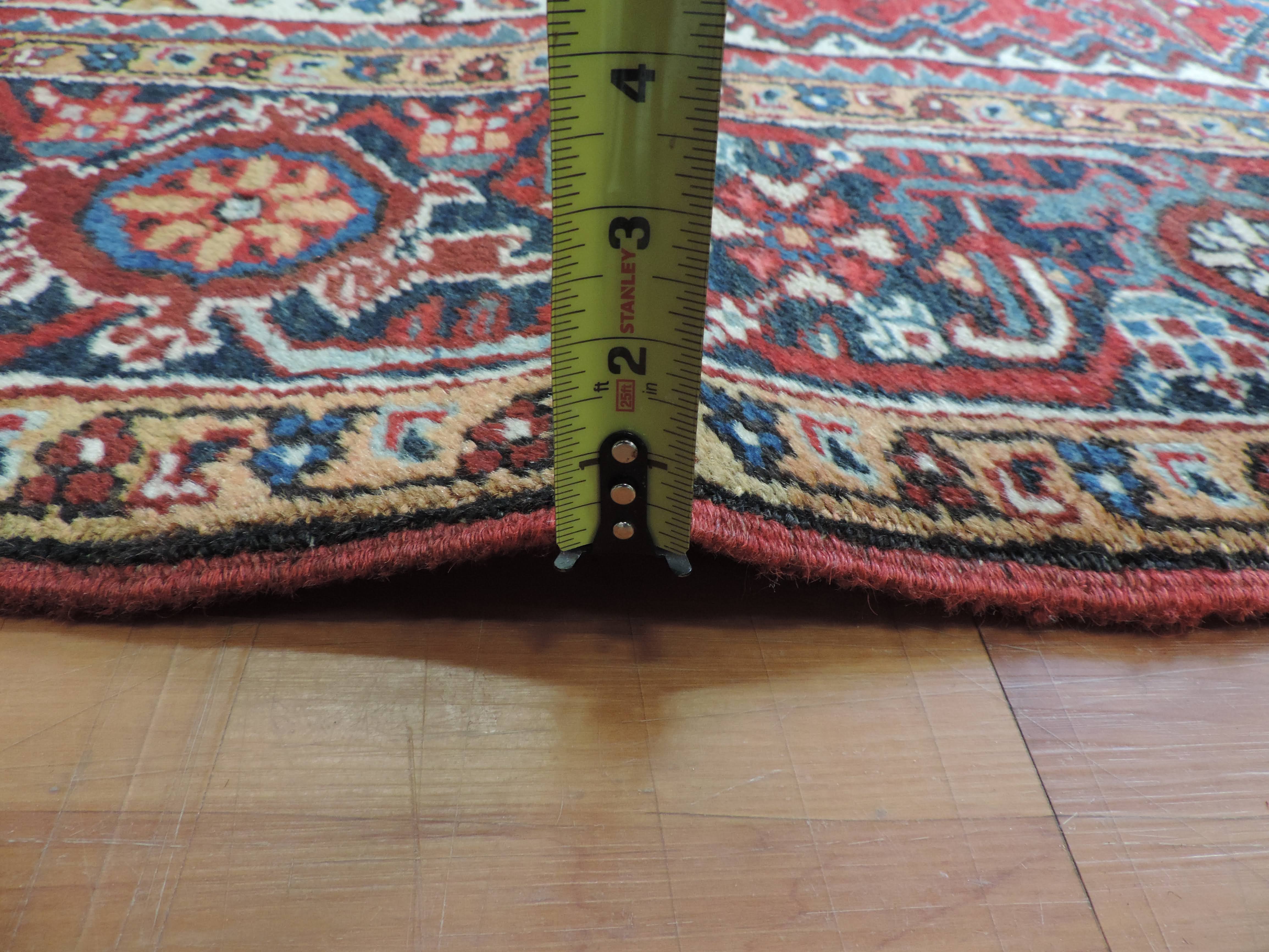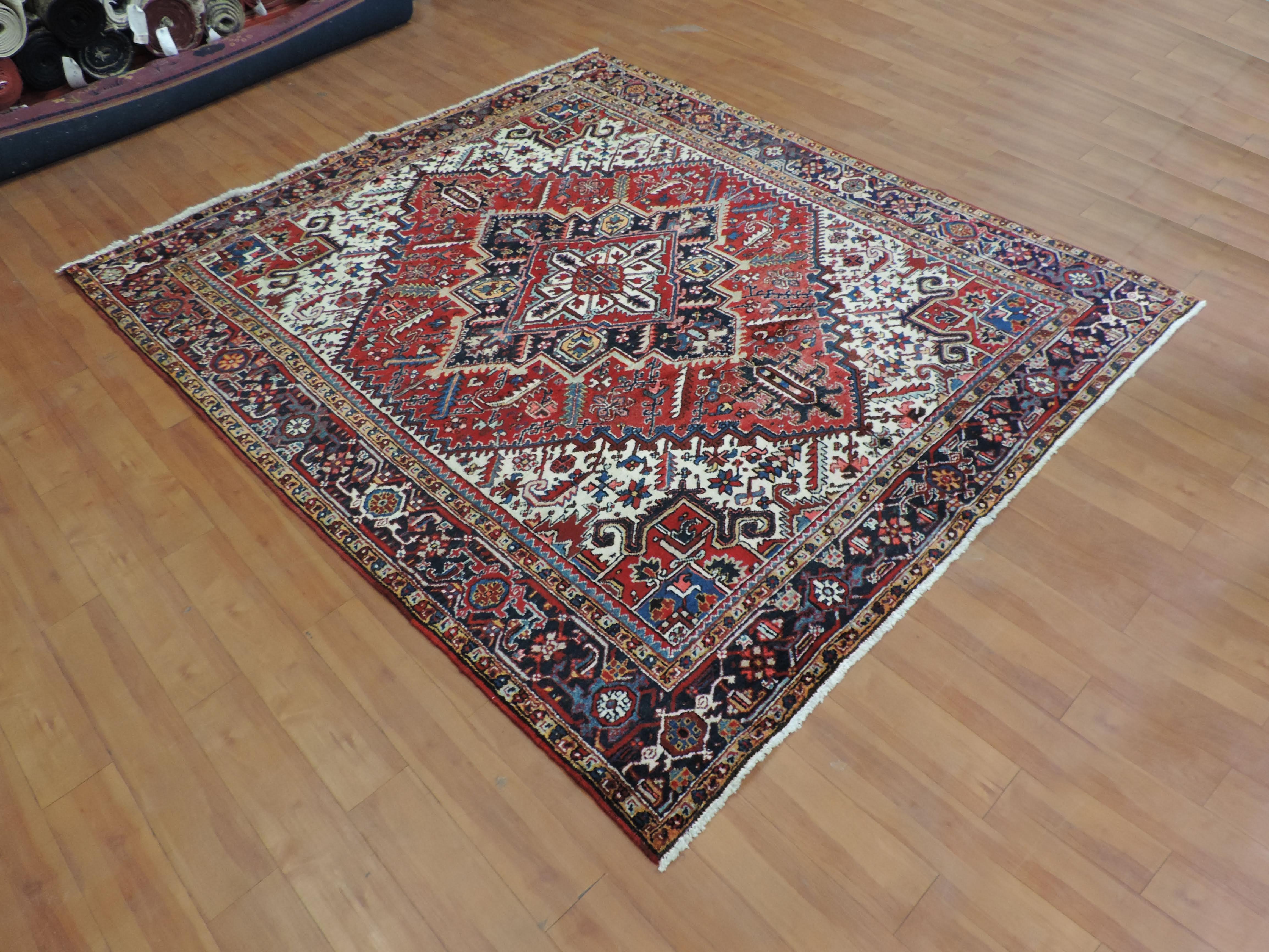 Experience the enduring allure of Iran with our Koko-2213 oriental rug. Hand-knotted from premium wool and featuring a bold geometric design set against a vibrant red backdrop, this vintage 1970's Heriz rug is an exquisite work of art that will add a touch of timeless elegance and sophistication to your space. Now on sale, seize the opportunity to own this rare piece and infuse your home with its unique charm.