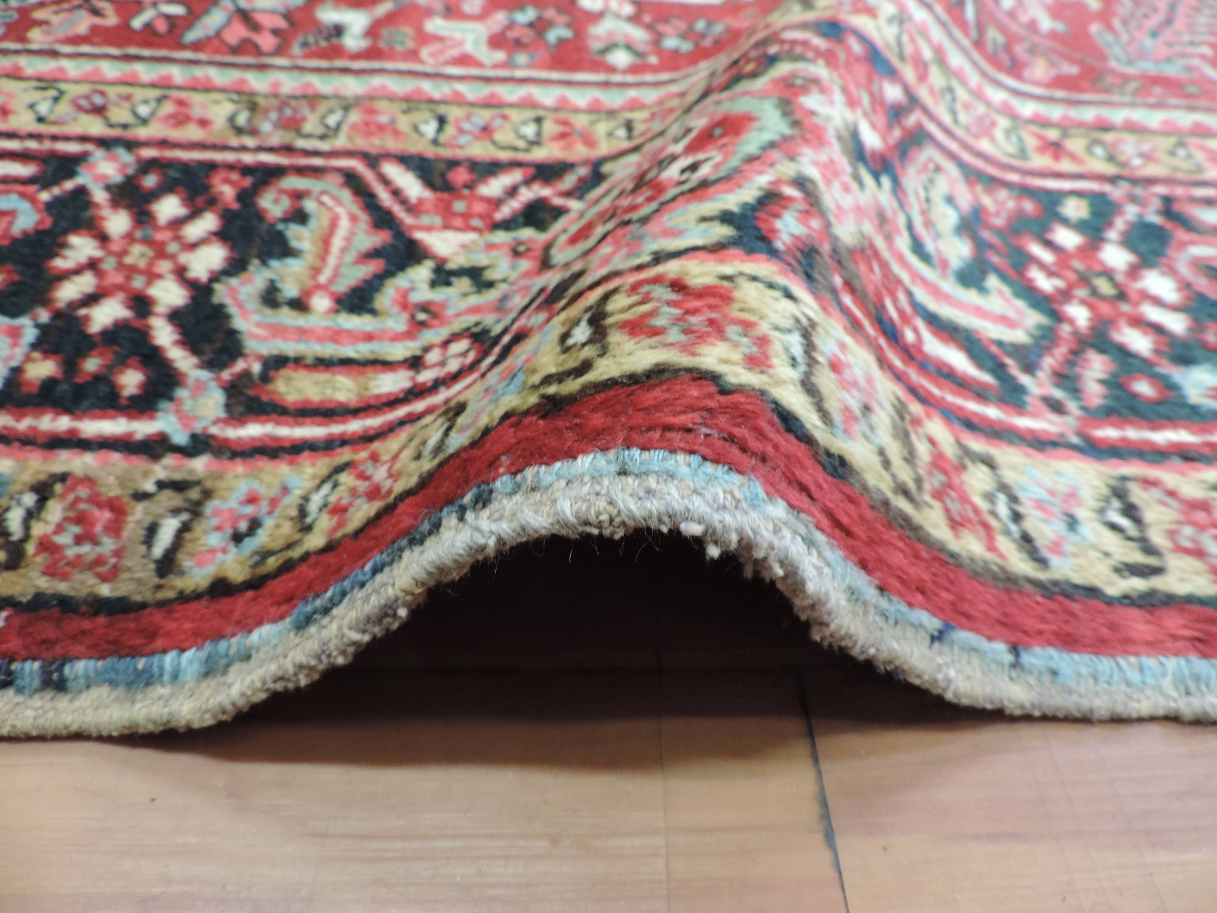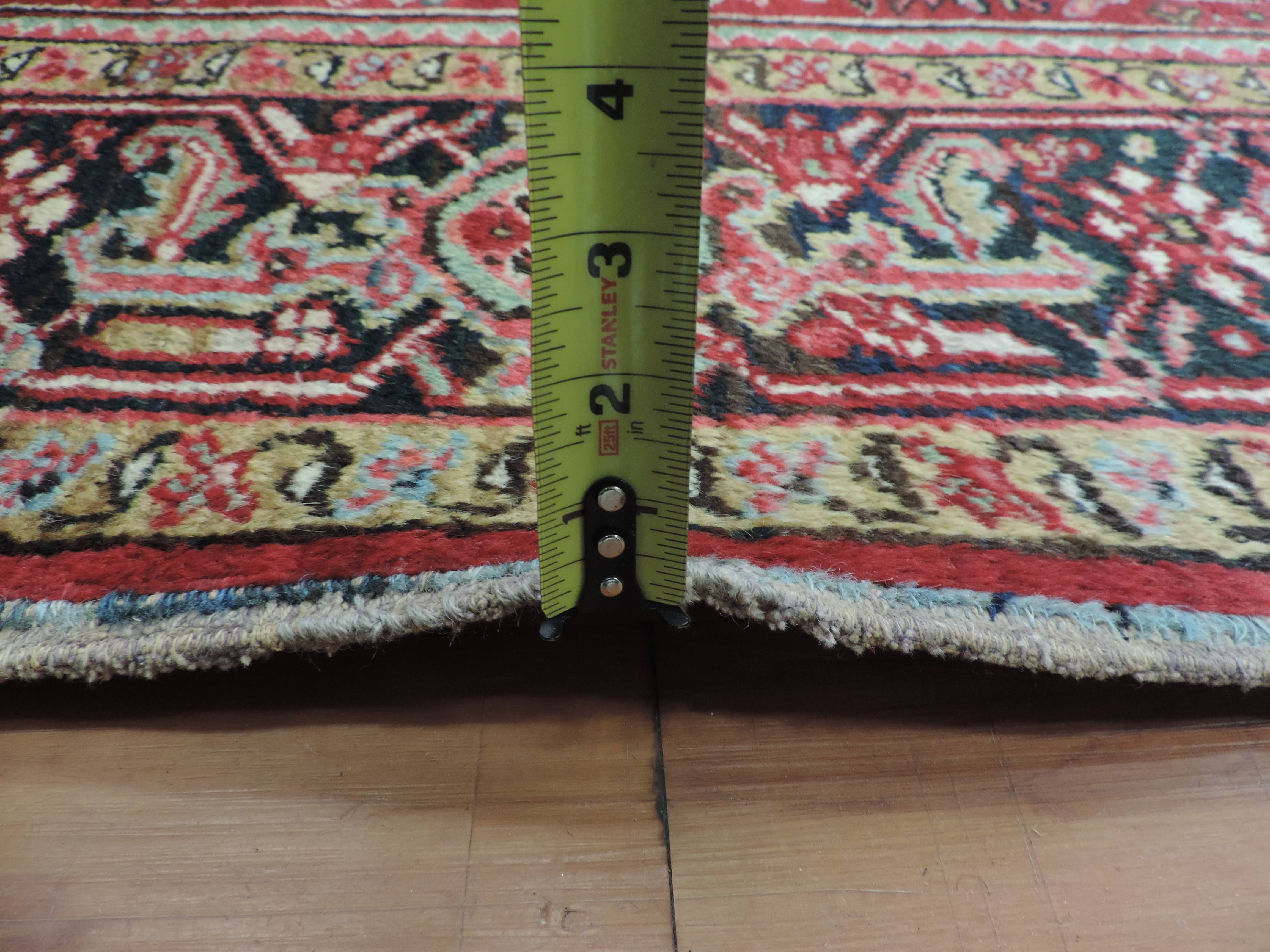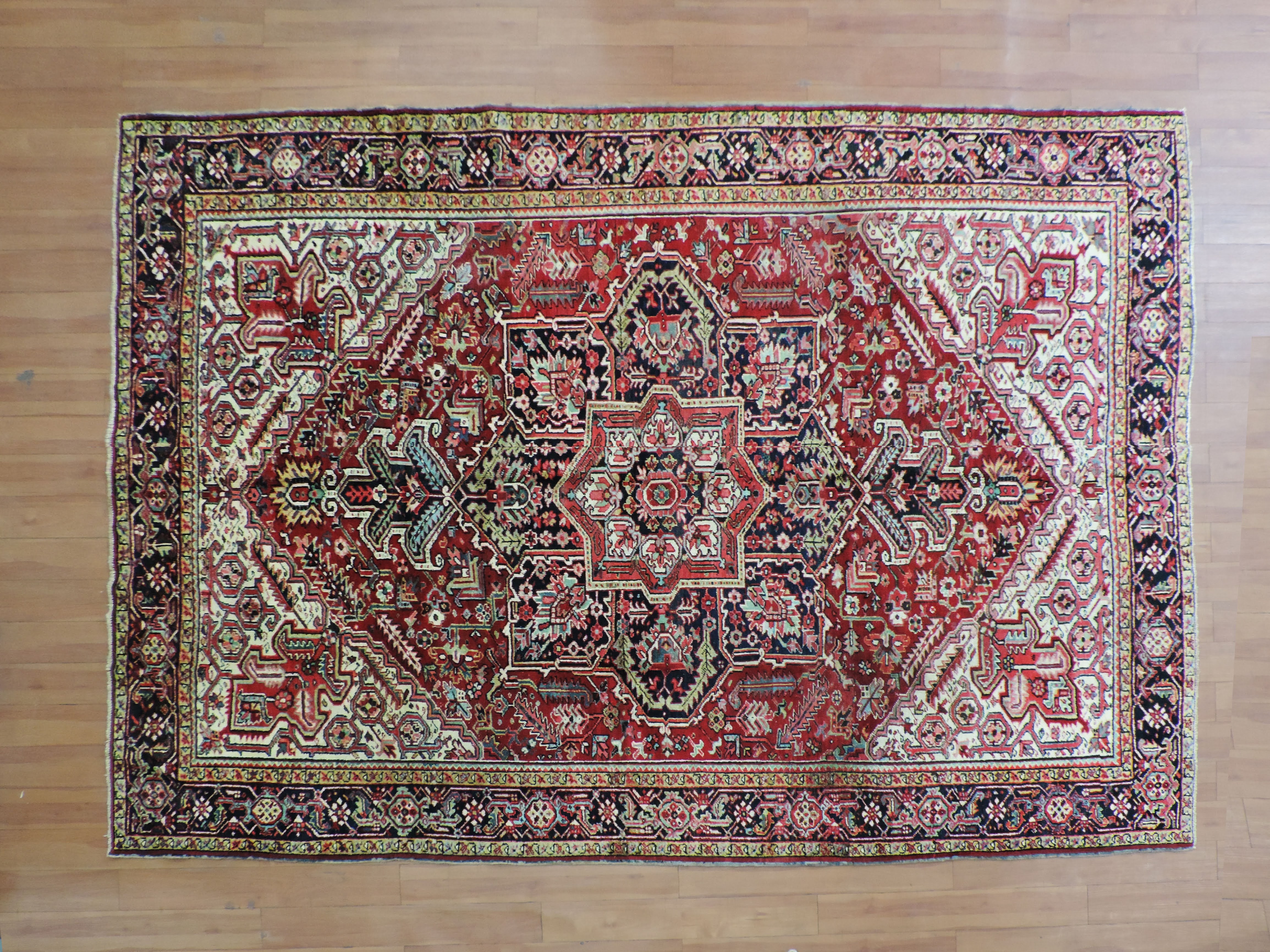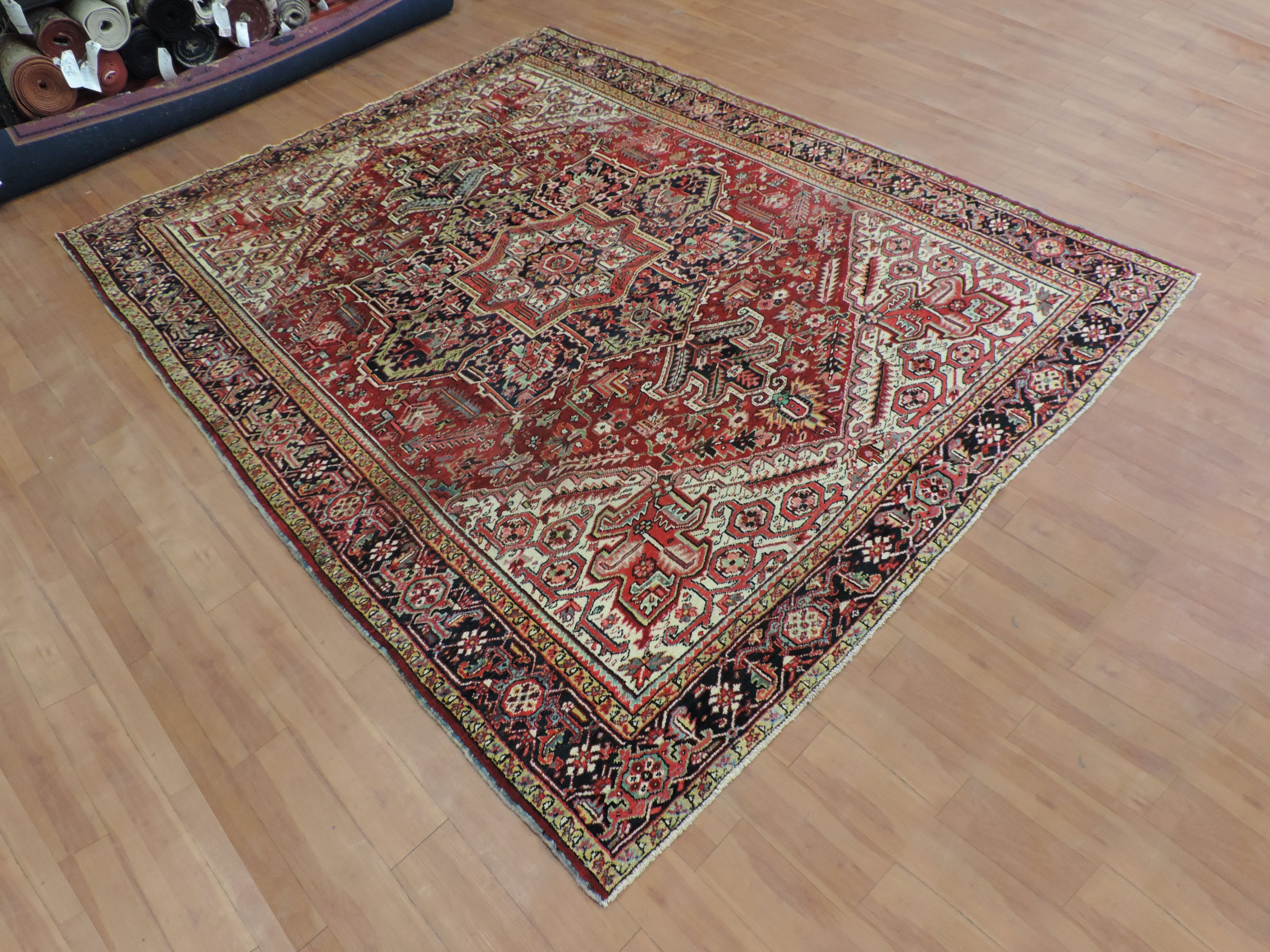 Experience a taste of Persian craftsmanship with our Koko-2217 rug, a unique antique find from 1920. Hand-knotted in Iran, this 9x12 feet wool rug features a captivating geometric design in a vibrant red color that promises to bring a touch of exotic charm to any room. Currently on sale, this one-of-a-kind Heriz rug is not just a purchase—it's an investment in timeless style and quality.
