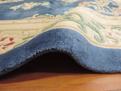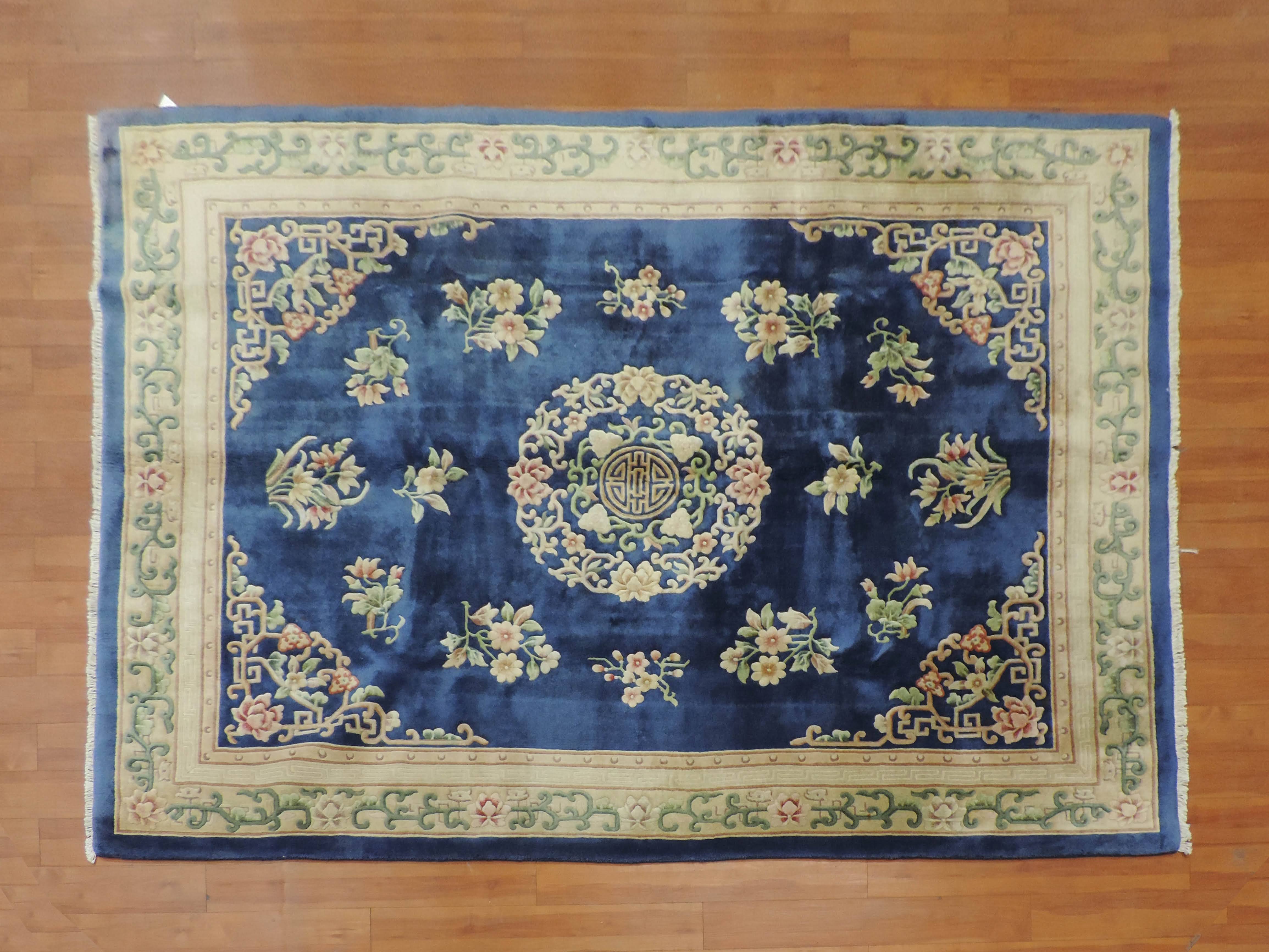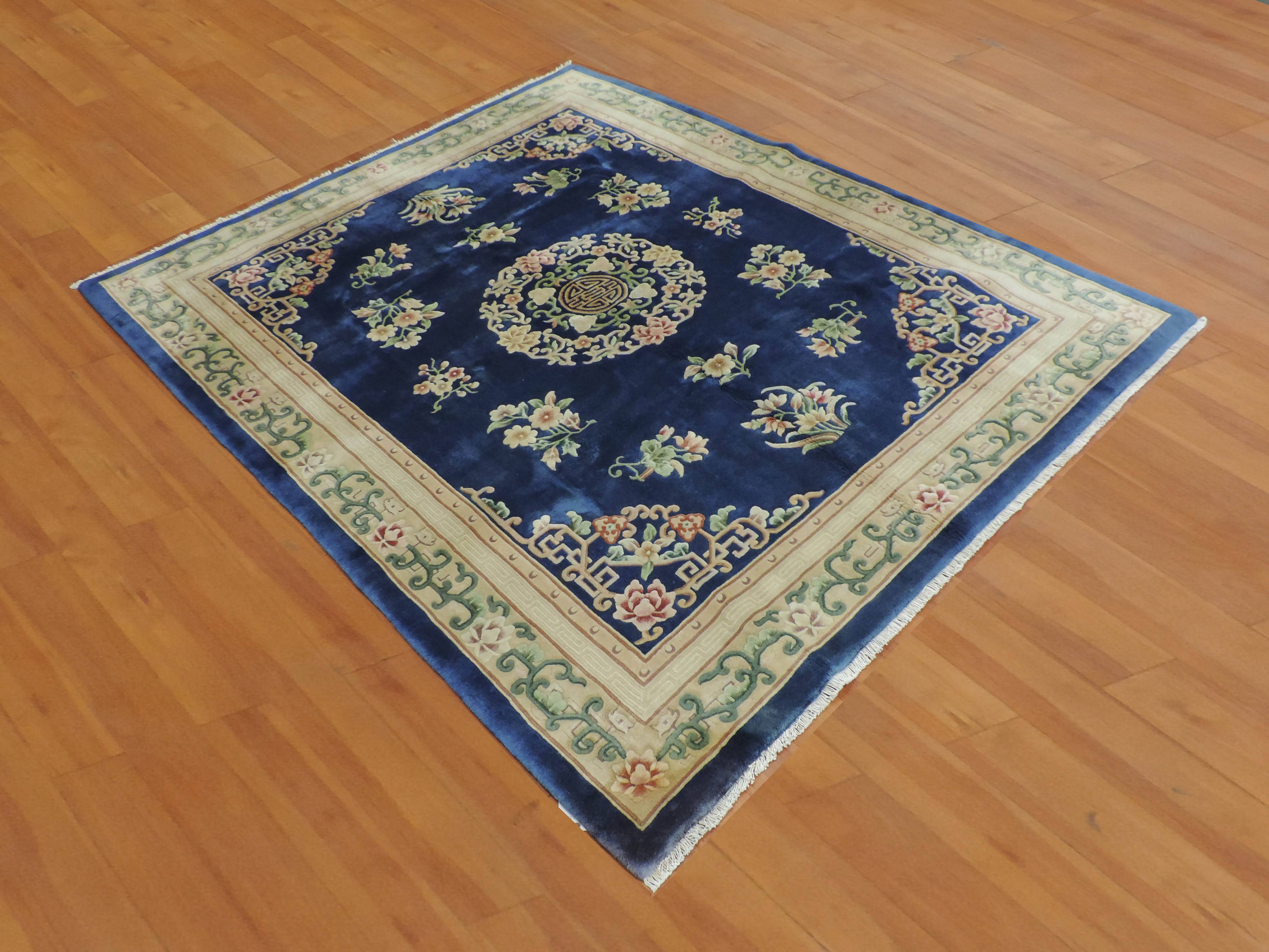 Introduce an aura of timeless elegance to your home with our hand-knotted Koko-2329 Oriental rug. Crafted from superior-quality wool with a cotton foundation, this vintage piece showcases an intricate floral design over a stunning navy canvas. Its unique style, originating from China circa 1980, promises to add a distinctive touch to any room - now at a discounted price for our exclusive online buyers.