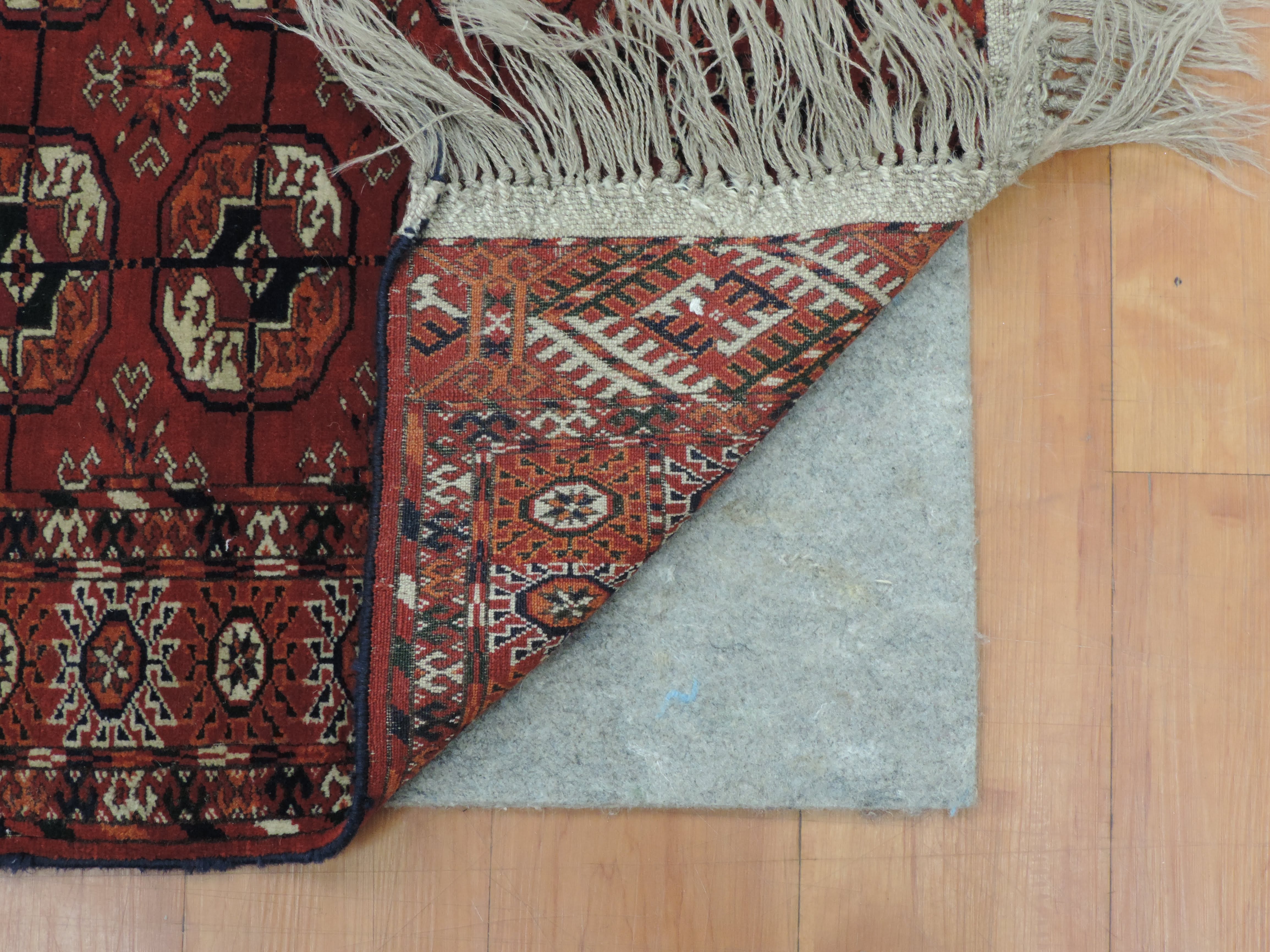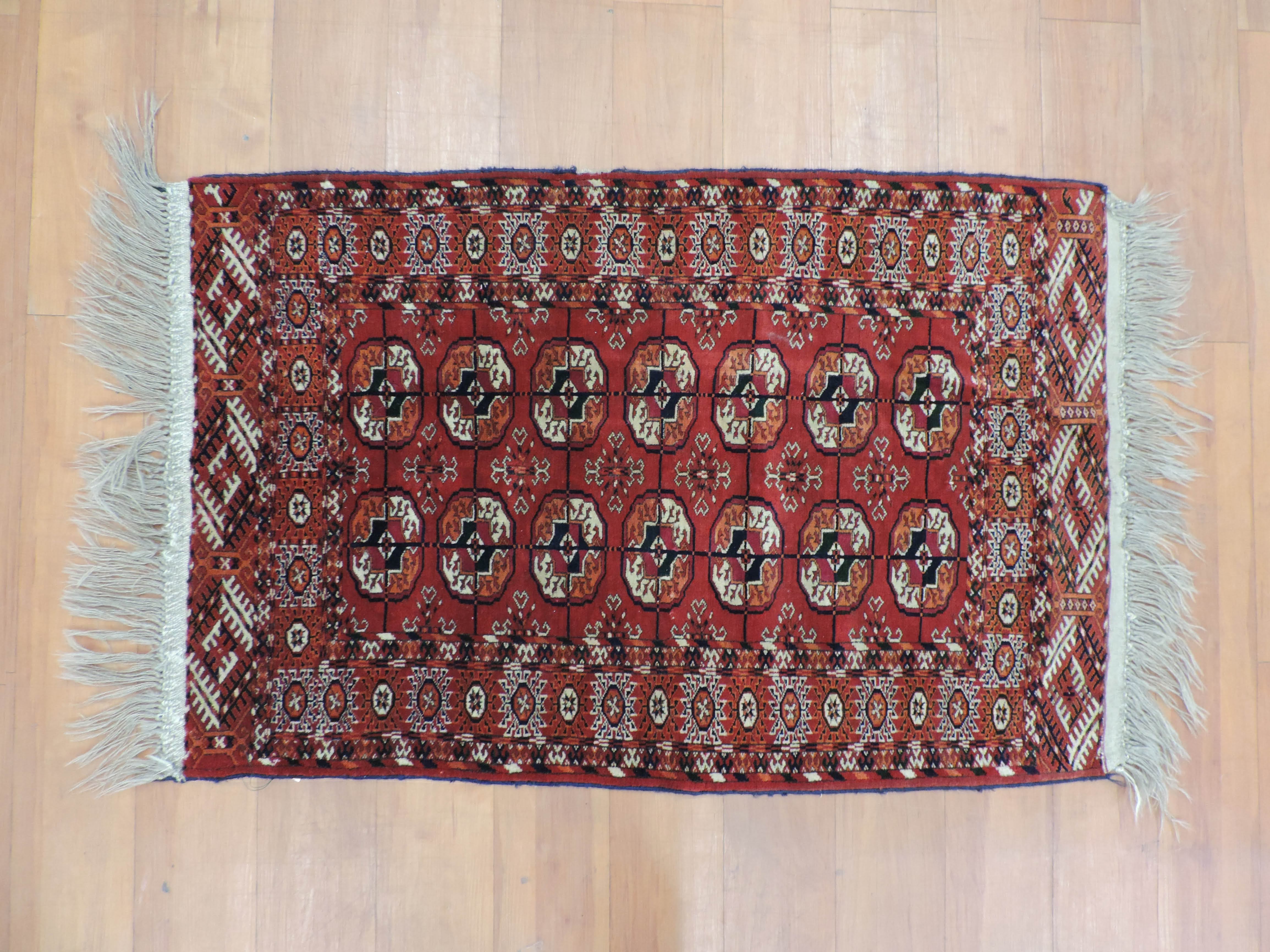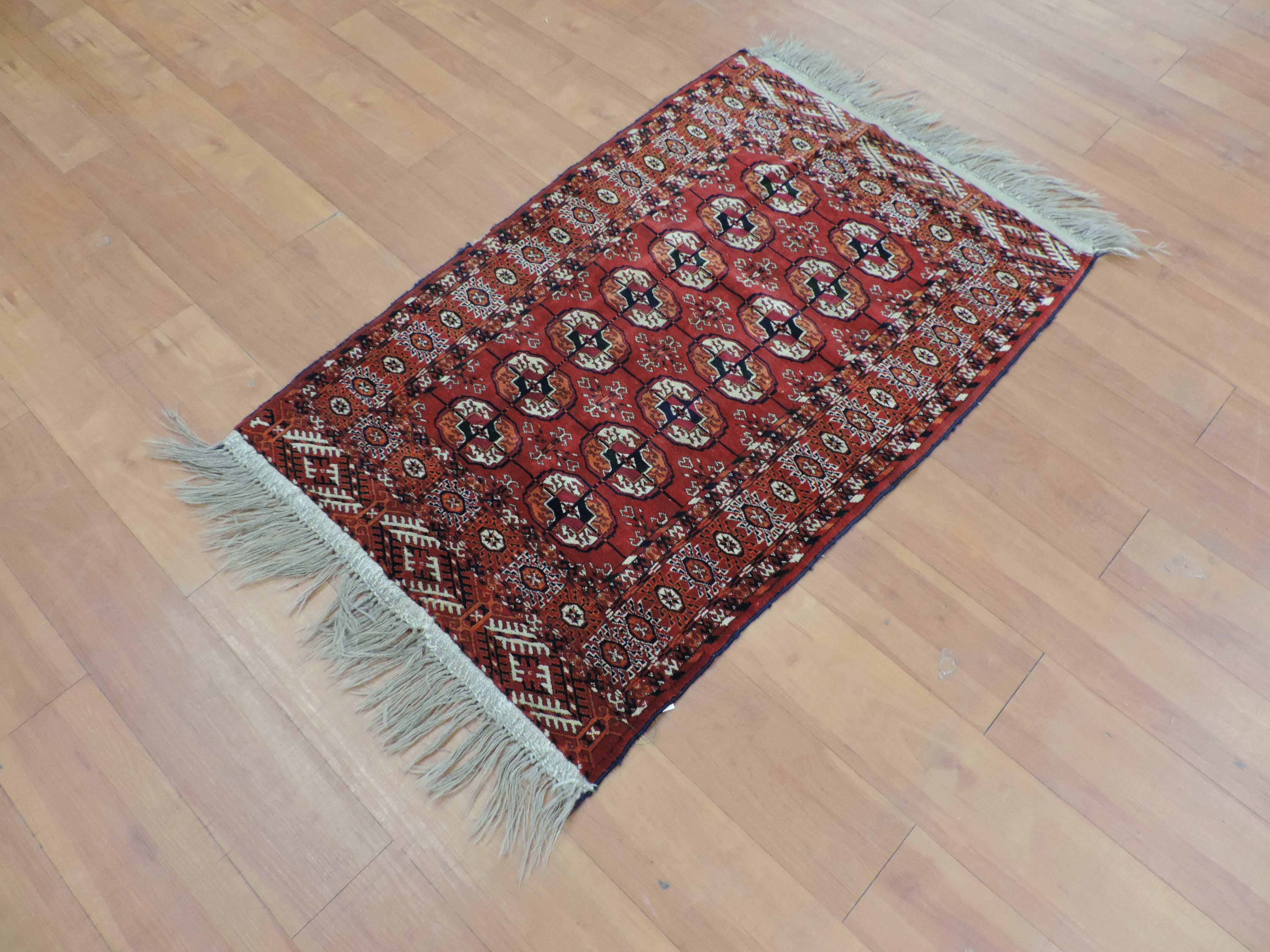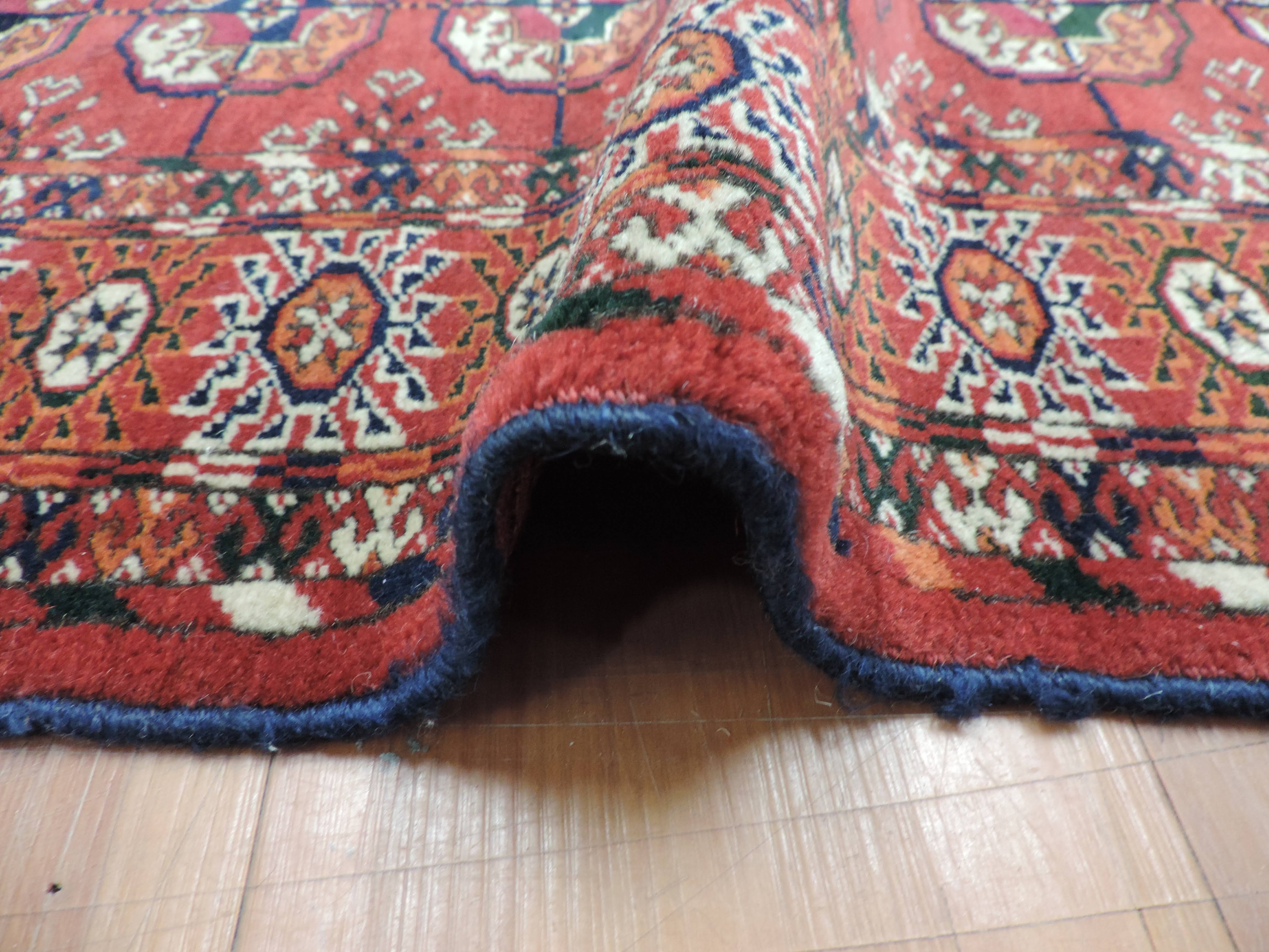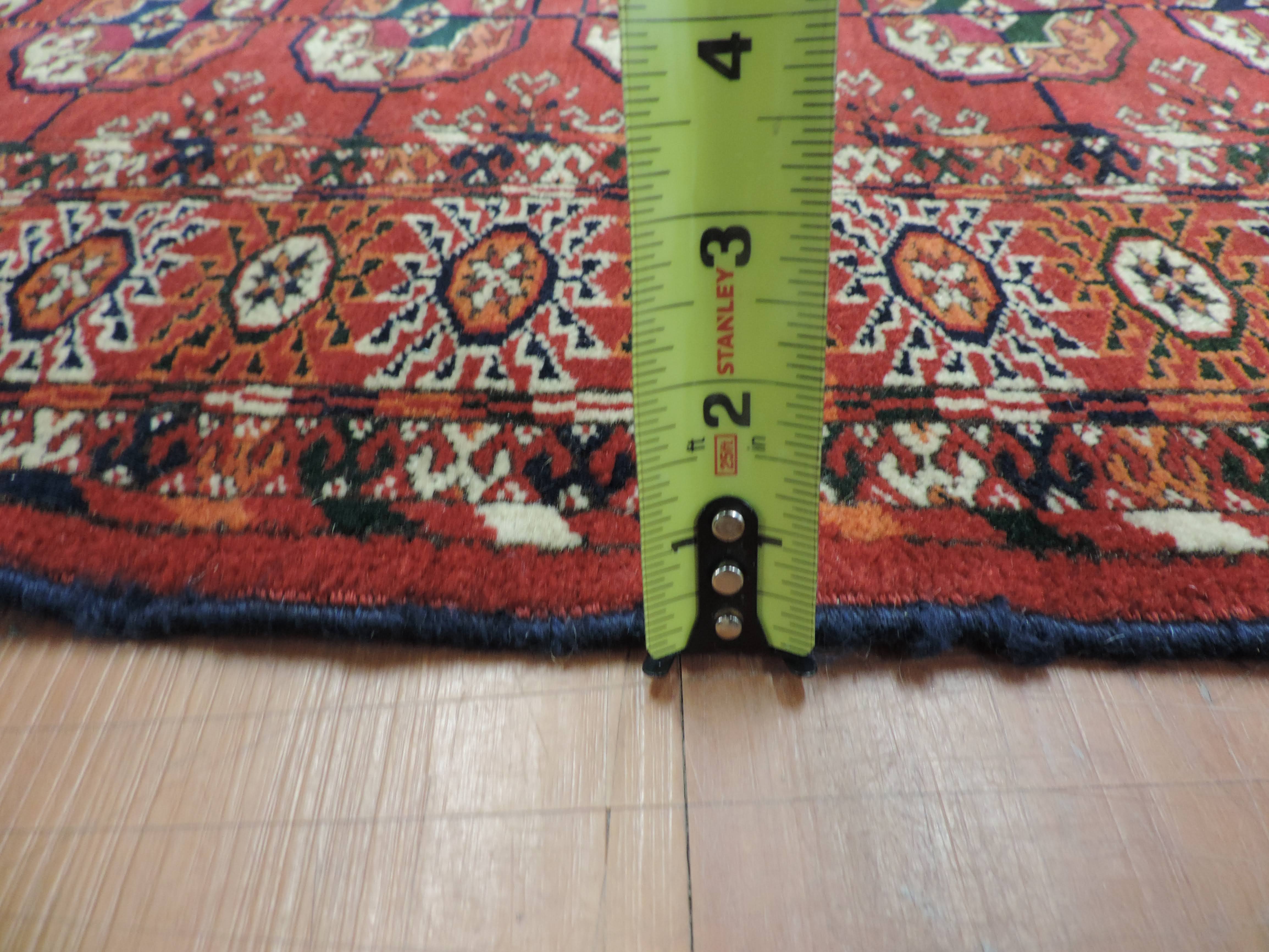 Step into the past with our stunning Turkaman rug: a beautiful fusion of rustic charm and exotic allure. This antique, hand-knotted wool rug, originating from Turkmenistan, boasts a vibrant rust hue and a captivating geometric design. On sale for $1100, this rectangular masterpiece will add a timeless elegance and a unique touch to your home.