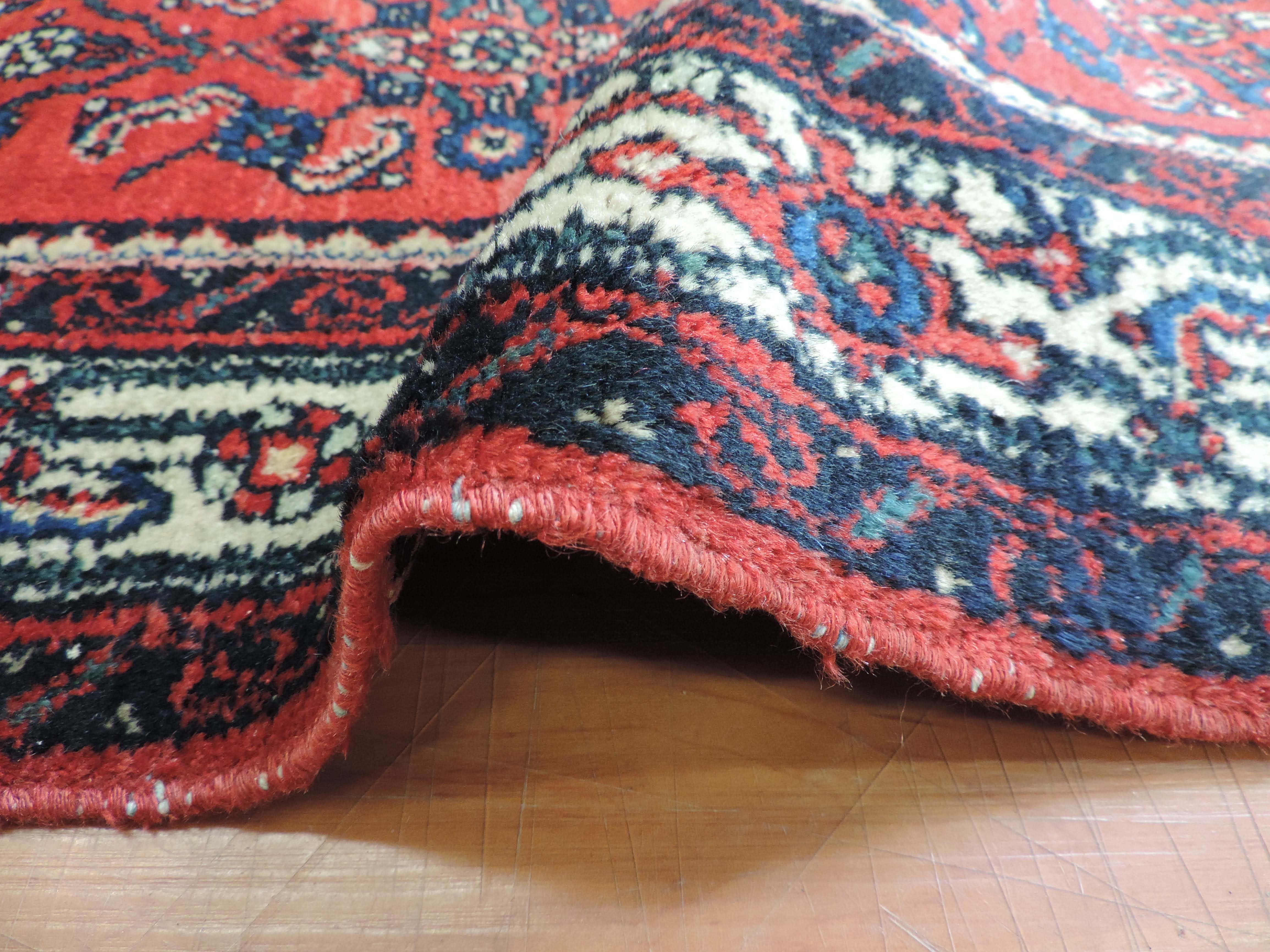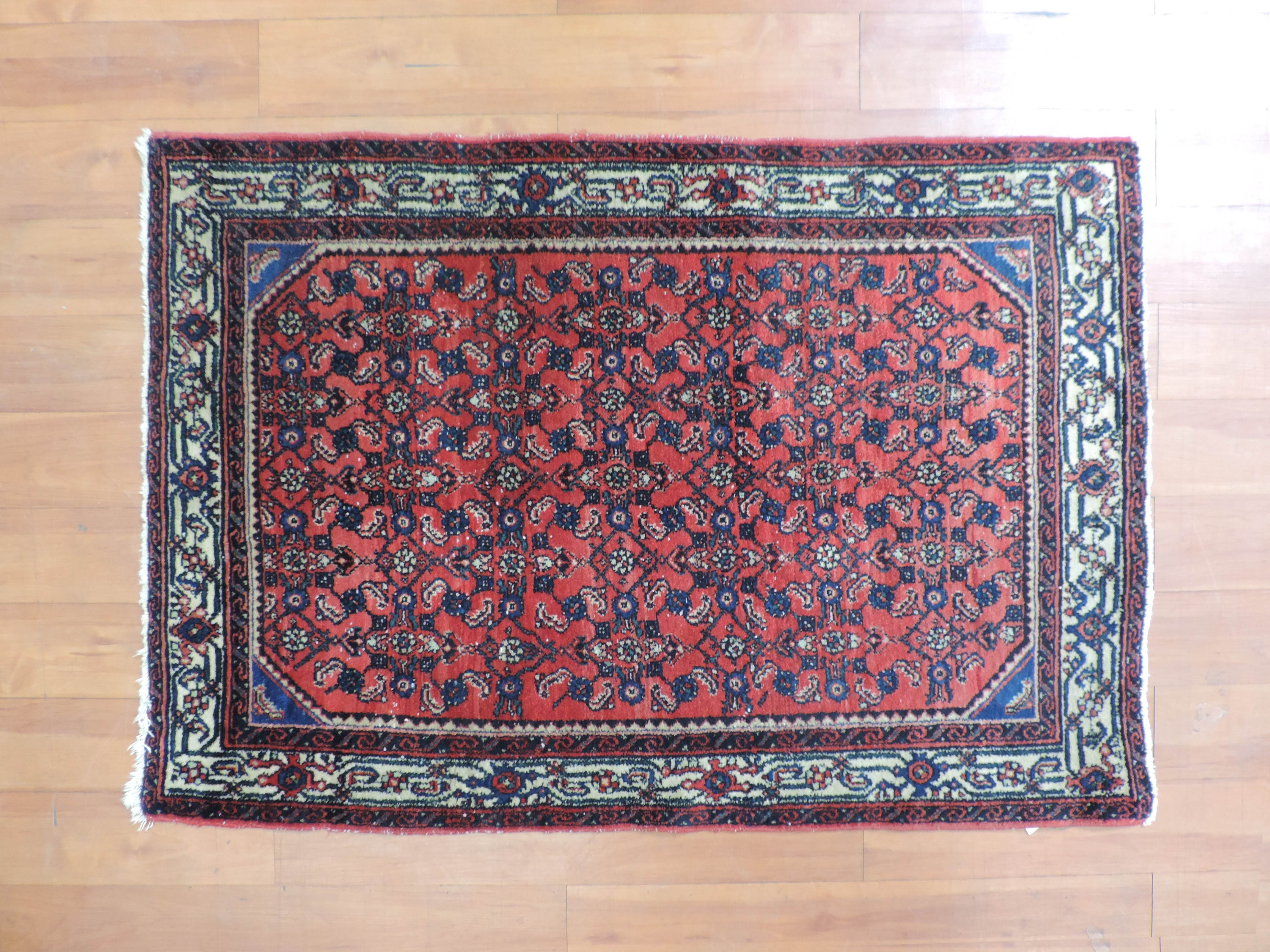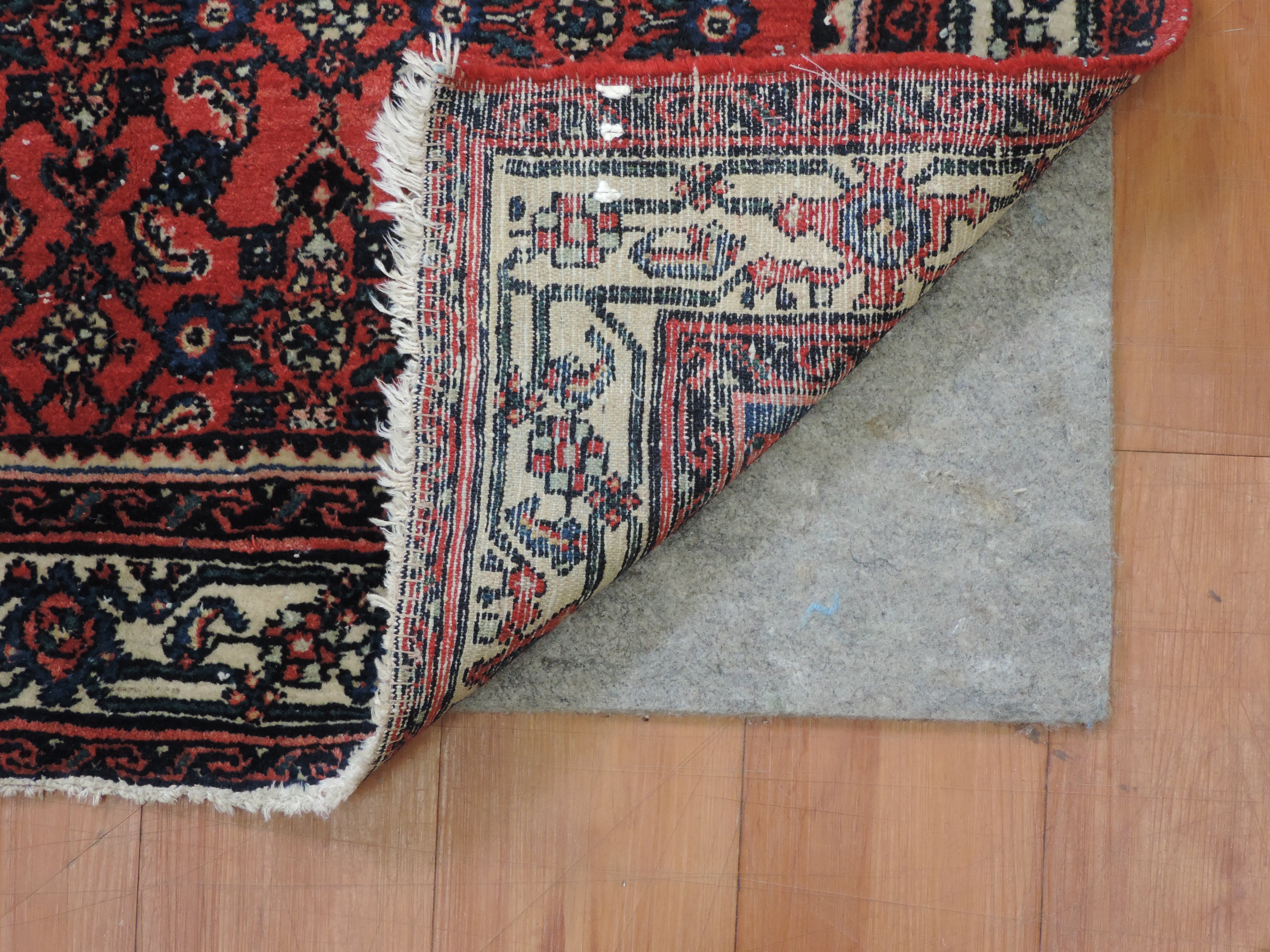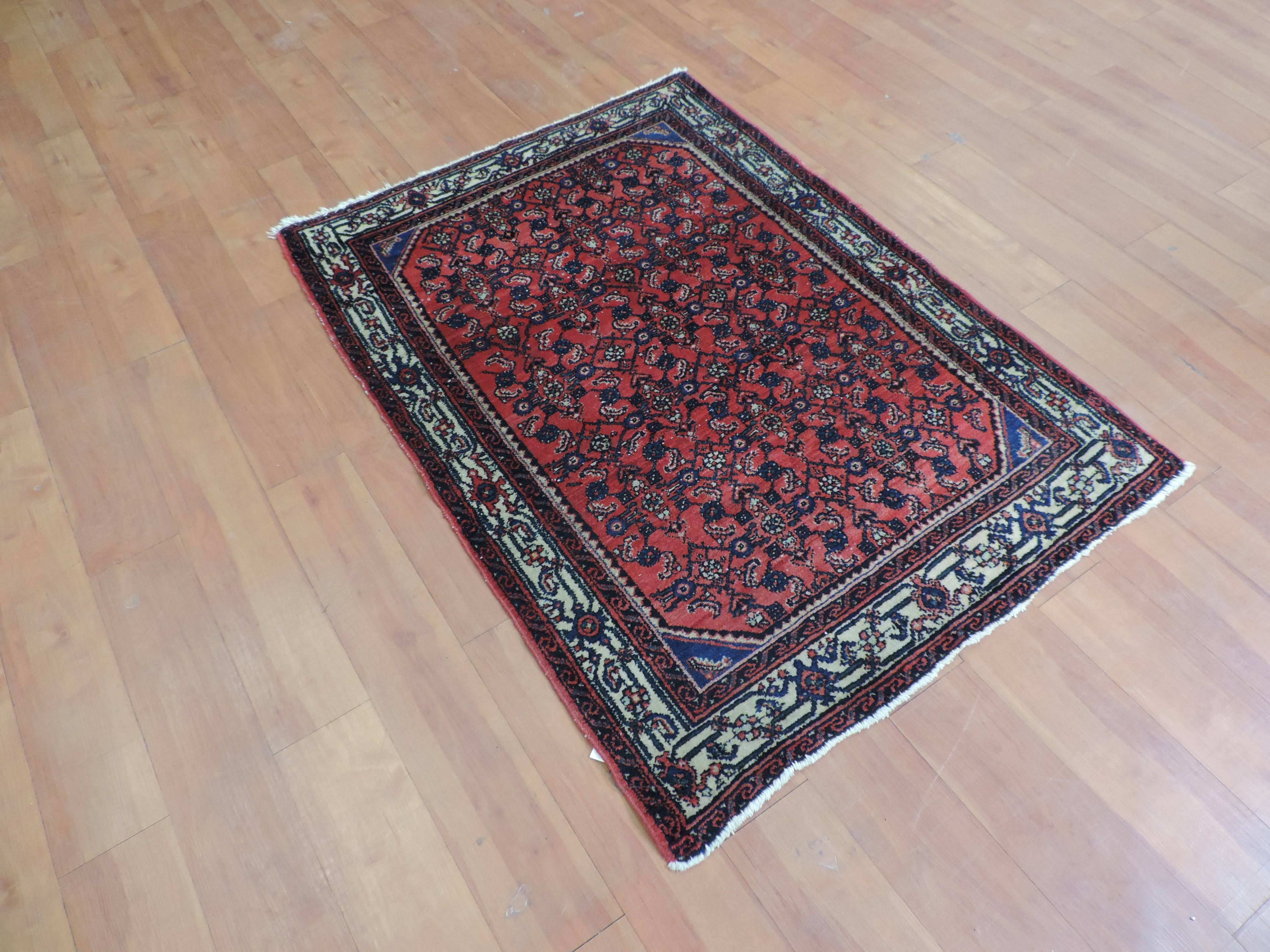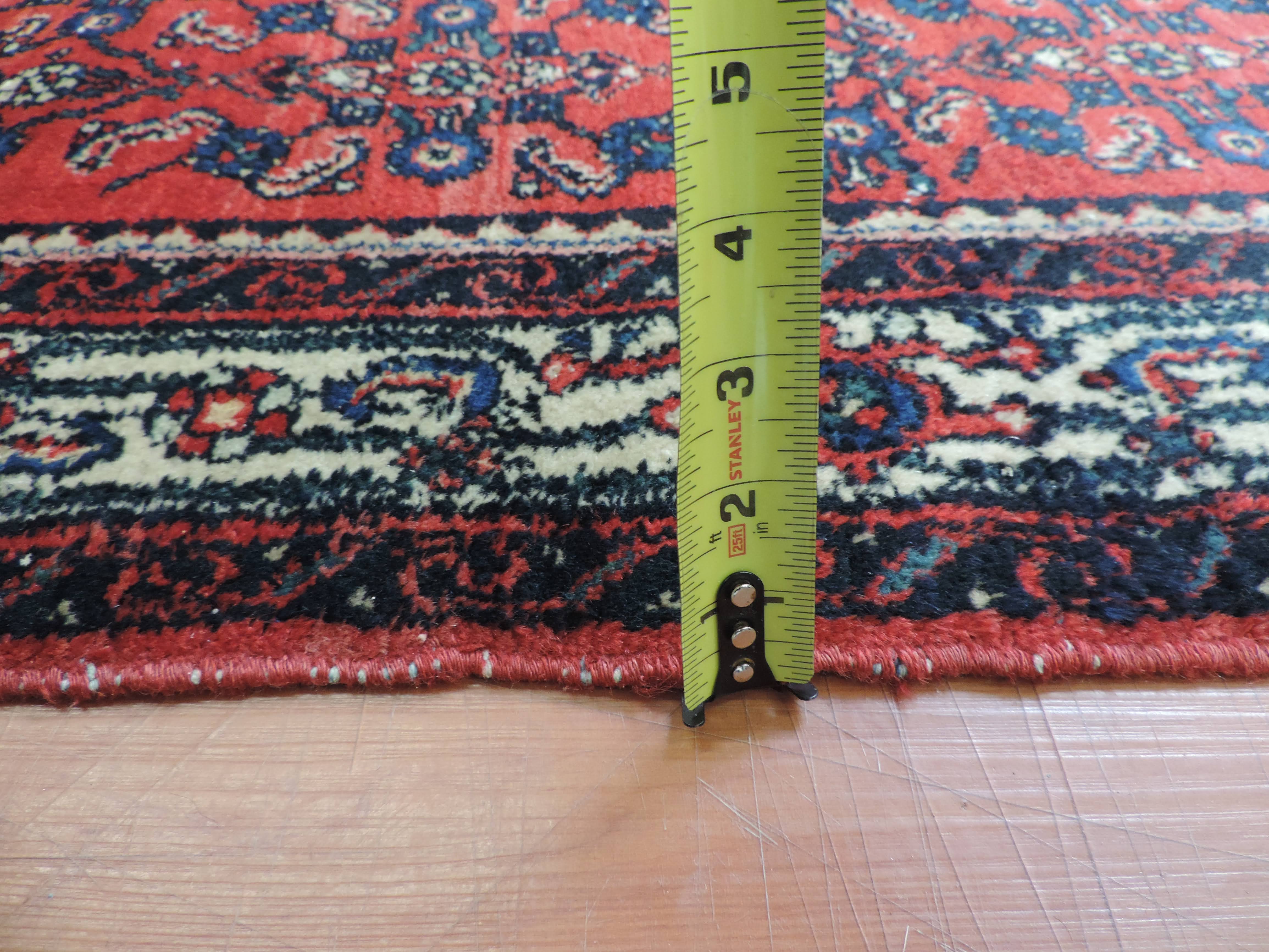 Immerse yourself in the bold, radiant beauty of this Hamadan rug, hand-knotted from the finest wool in the heart of Iran. This unique piece showcases a vibrant geometric design set against a stunning red backdrop, adding an exotic, elegant touch to any room. Available at an unbeatable sale price, add this timeless work of art to your home today.
