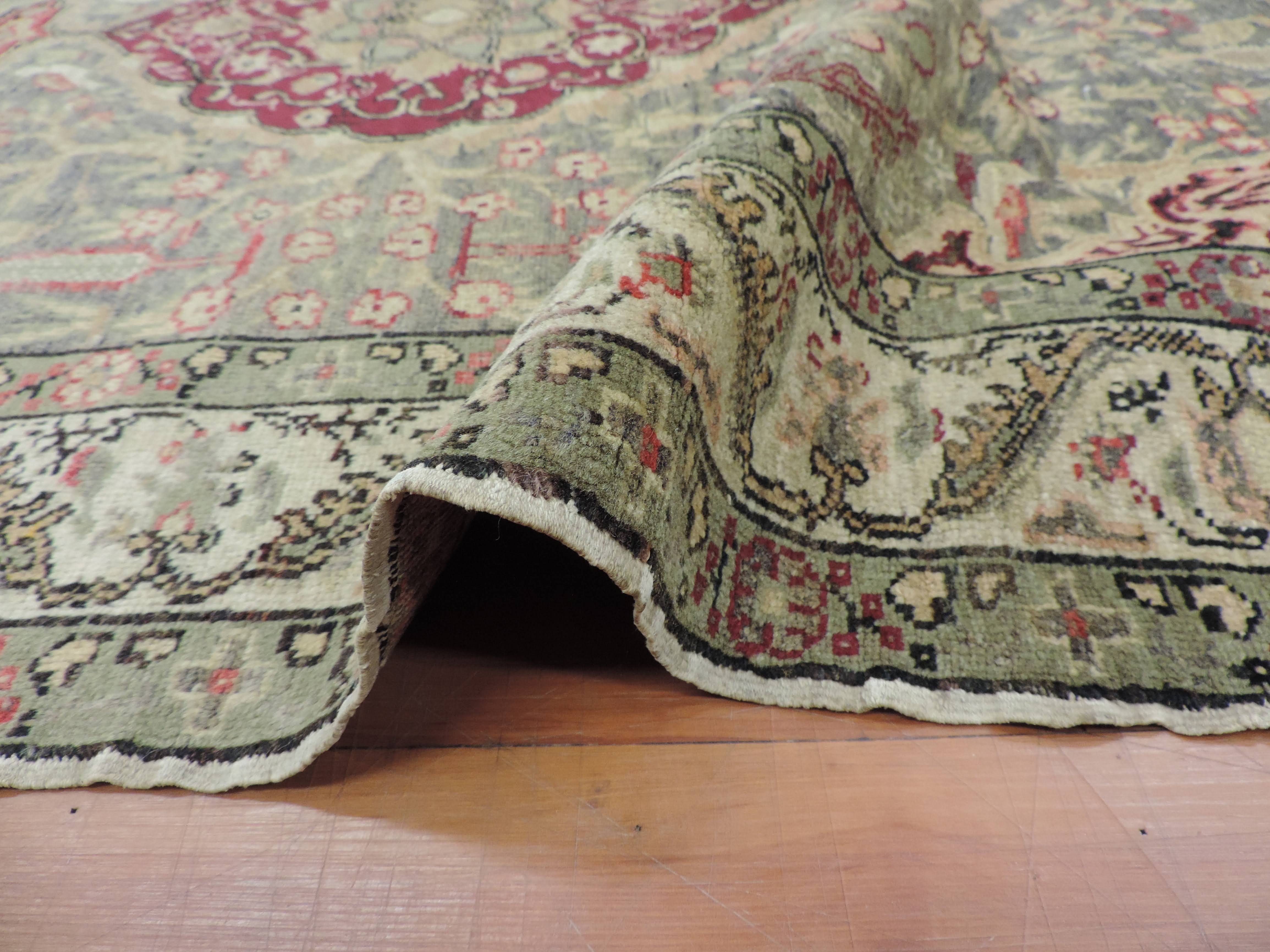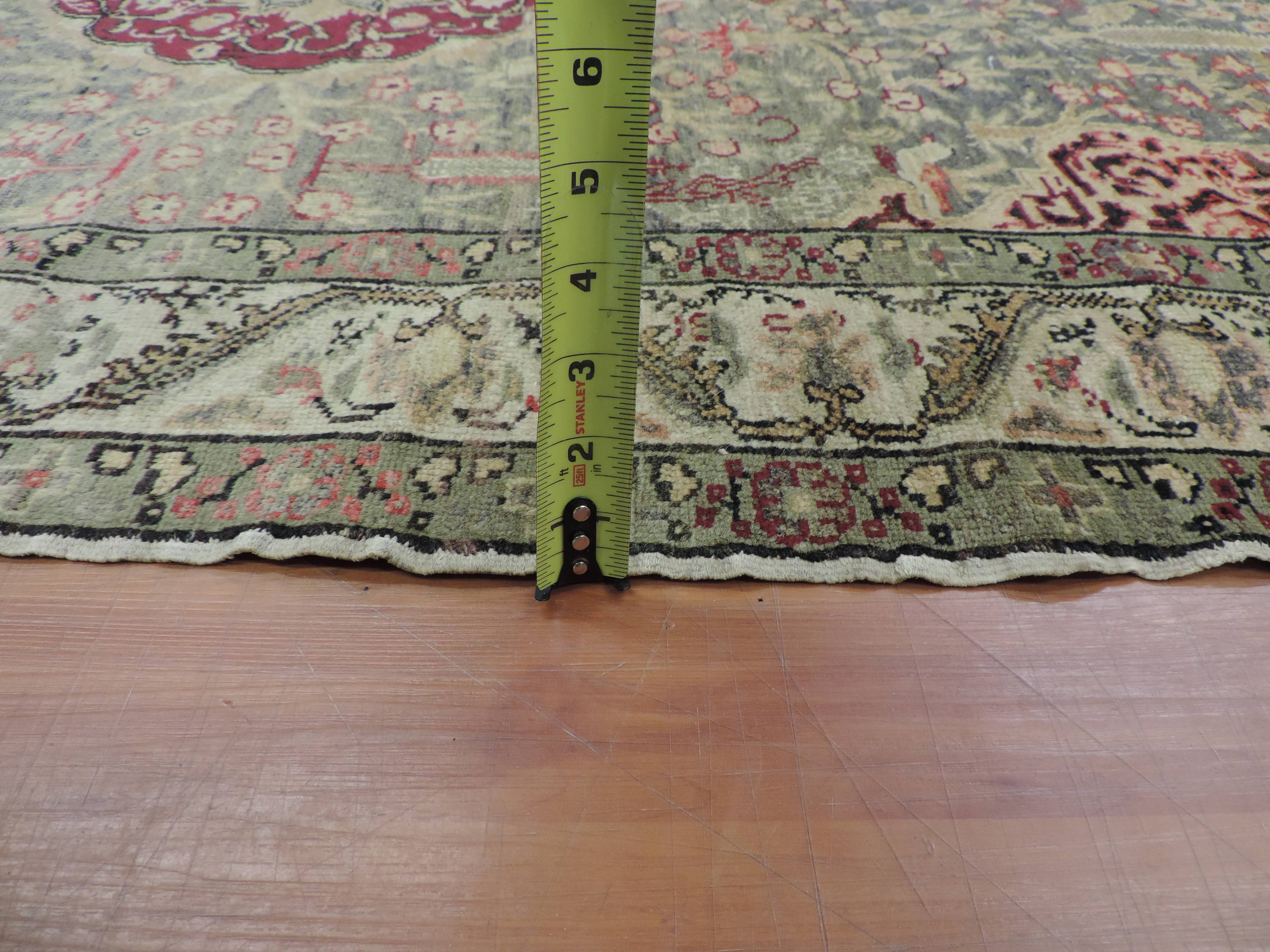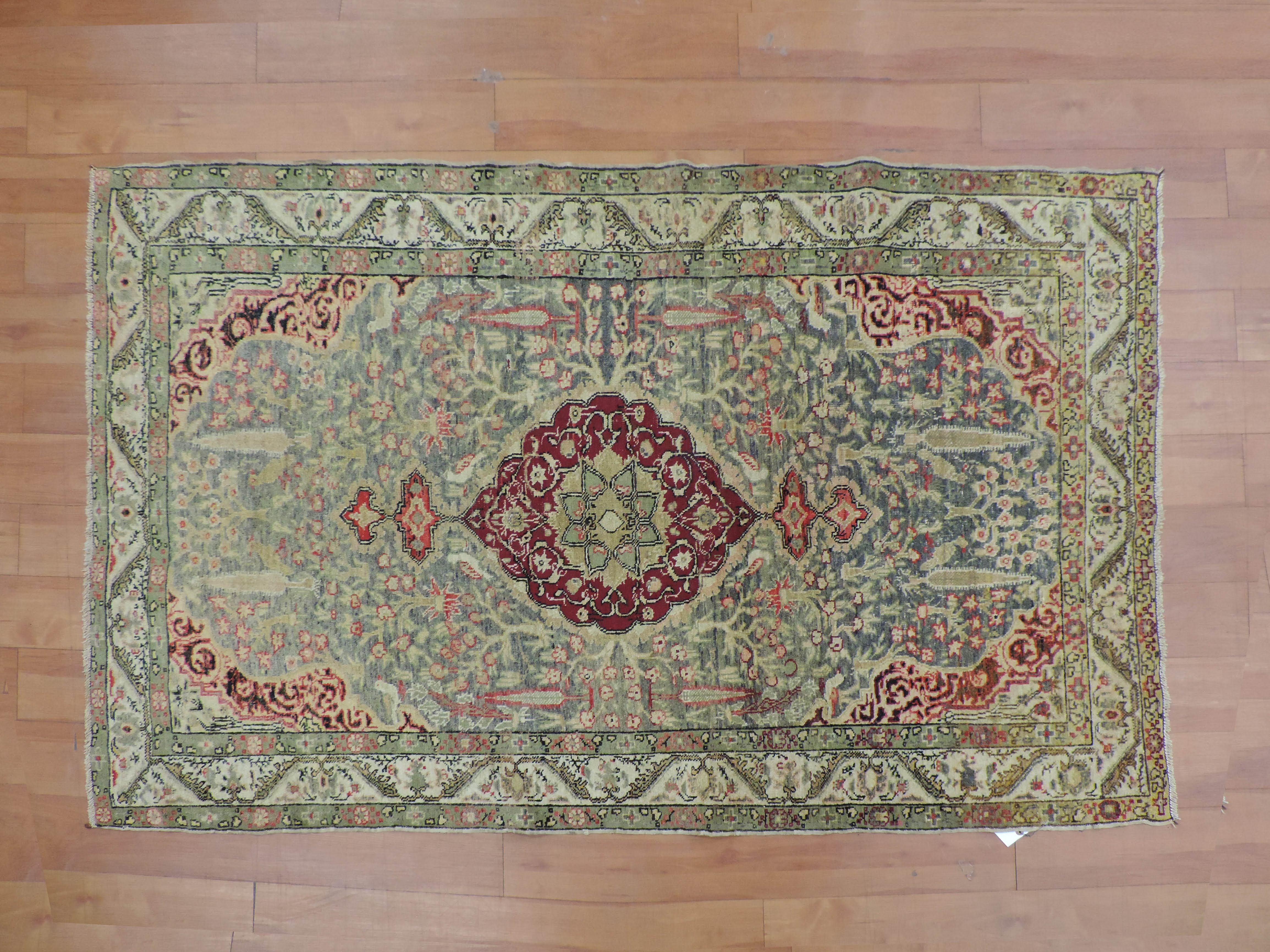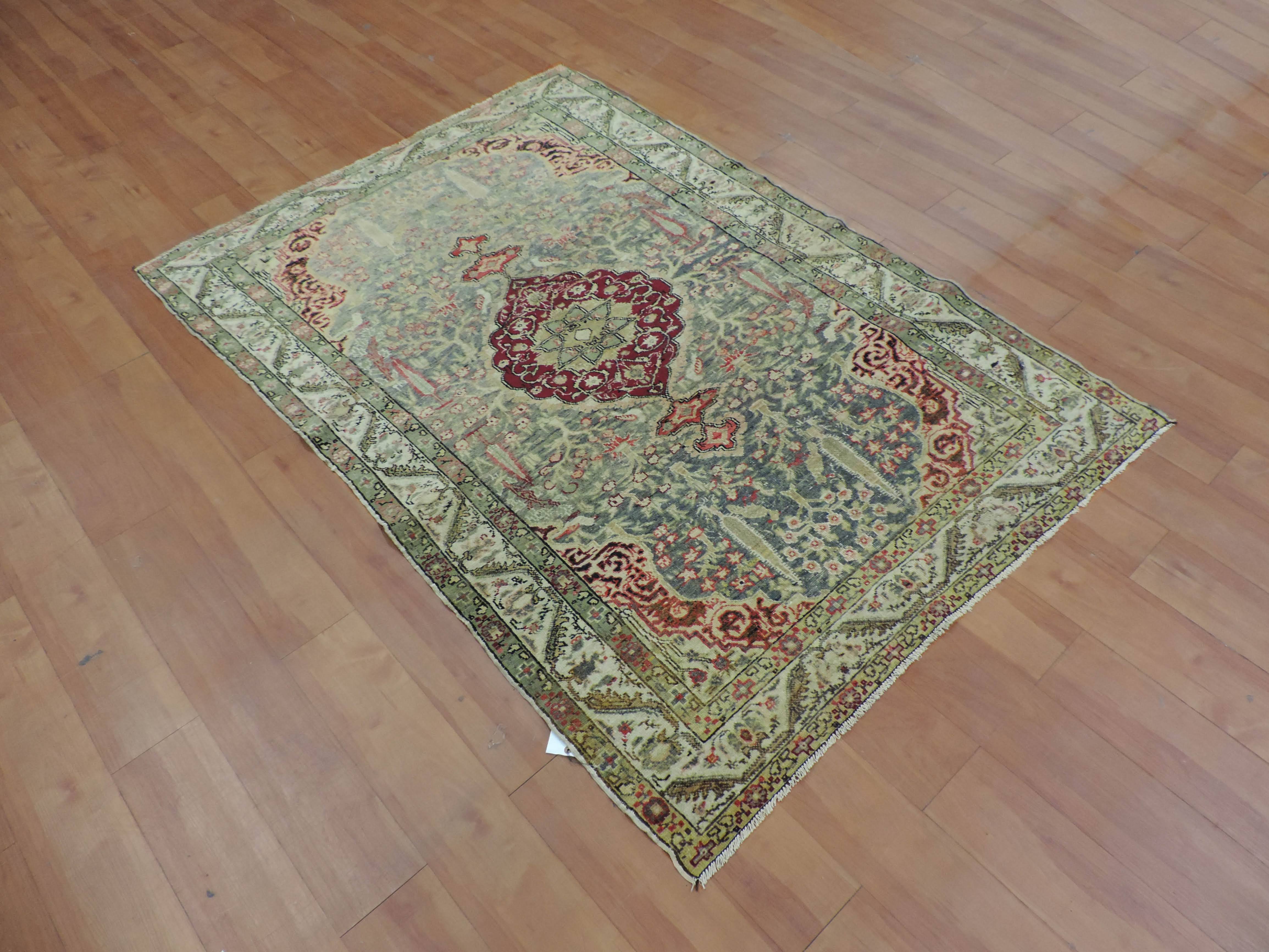Indulge in the timeless elegance of an antique Turkish rug intricately hand-knotted from luxurious wool. Its vibrant green color beautifully accentuates the exquisite floral design, casting an enchanting allure that will transform your space. With a sizeable width of 4.6 and length of 6.6, this rectangular oriental masterpiece is offered at an unmissable sale price, promising an opulent touch to your decor while also being a smart investment.