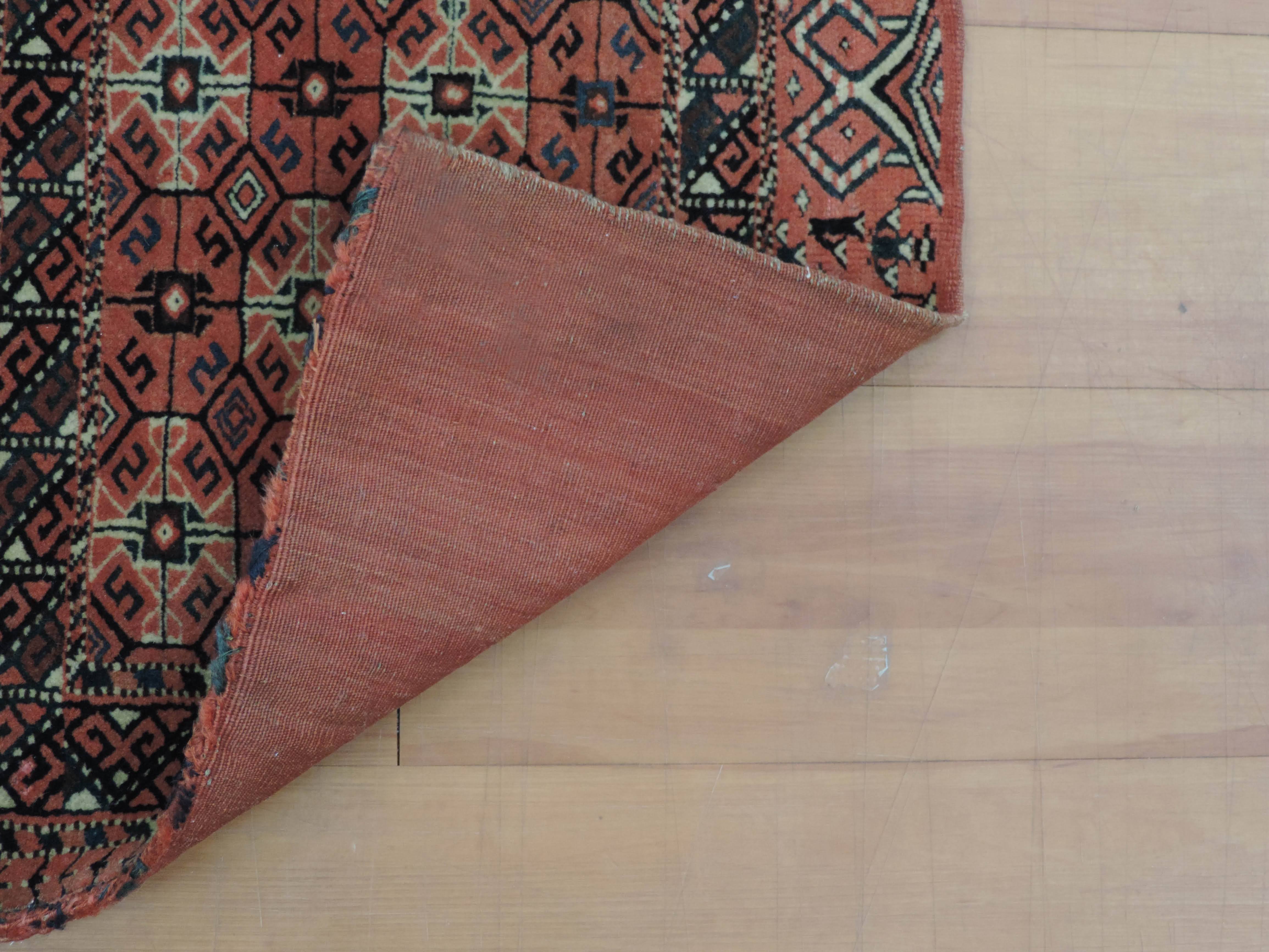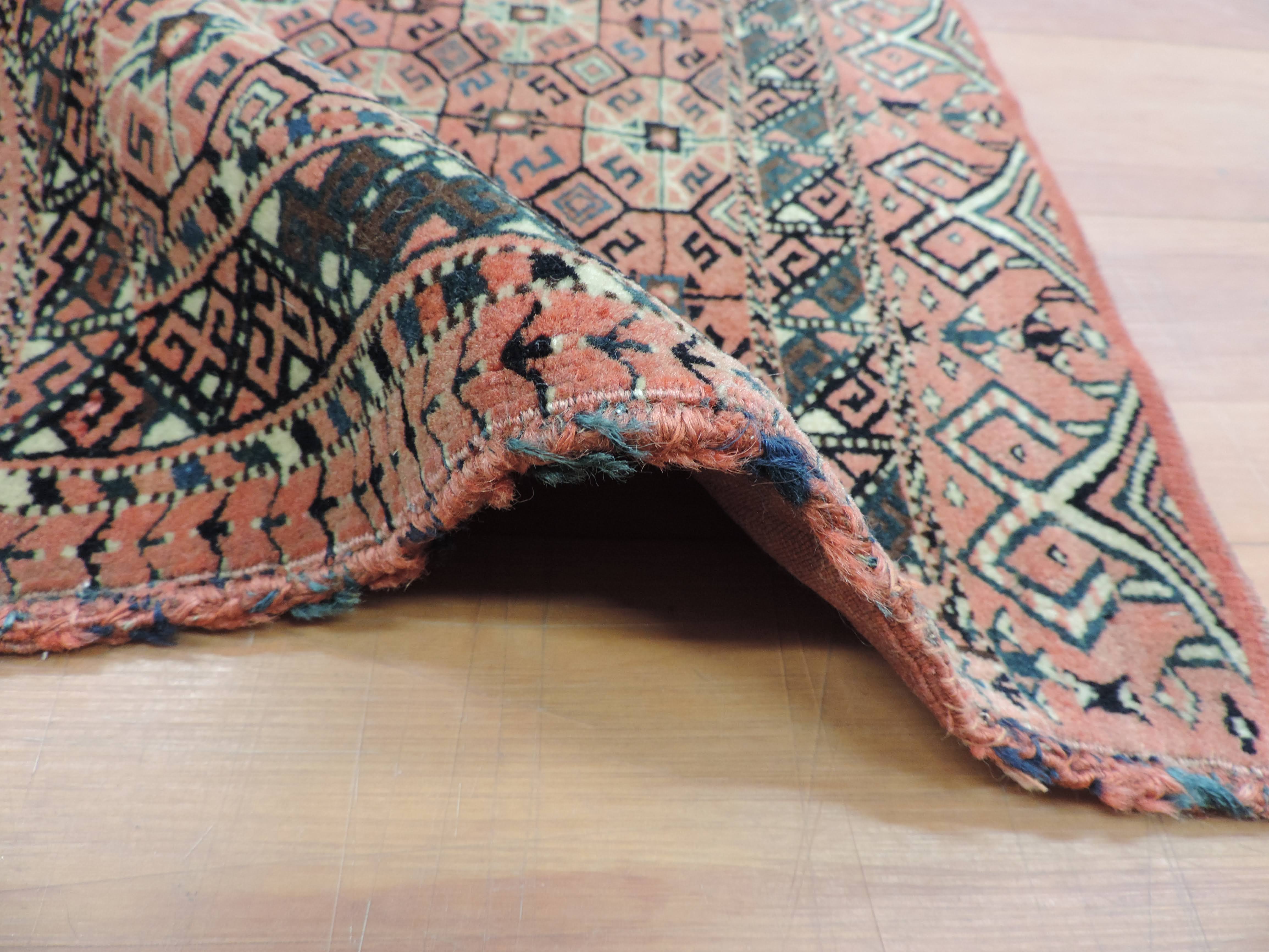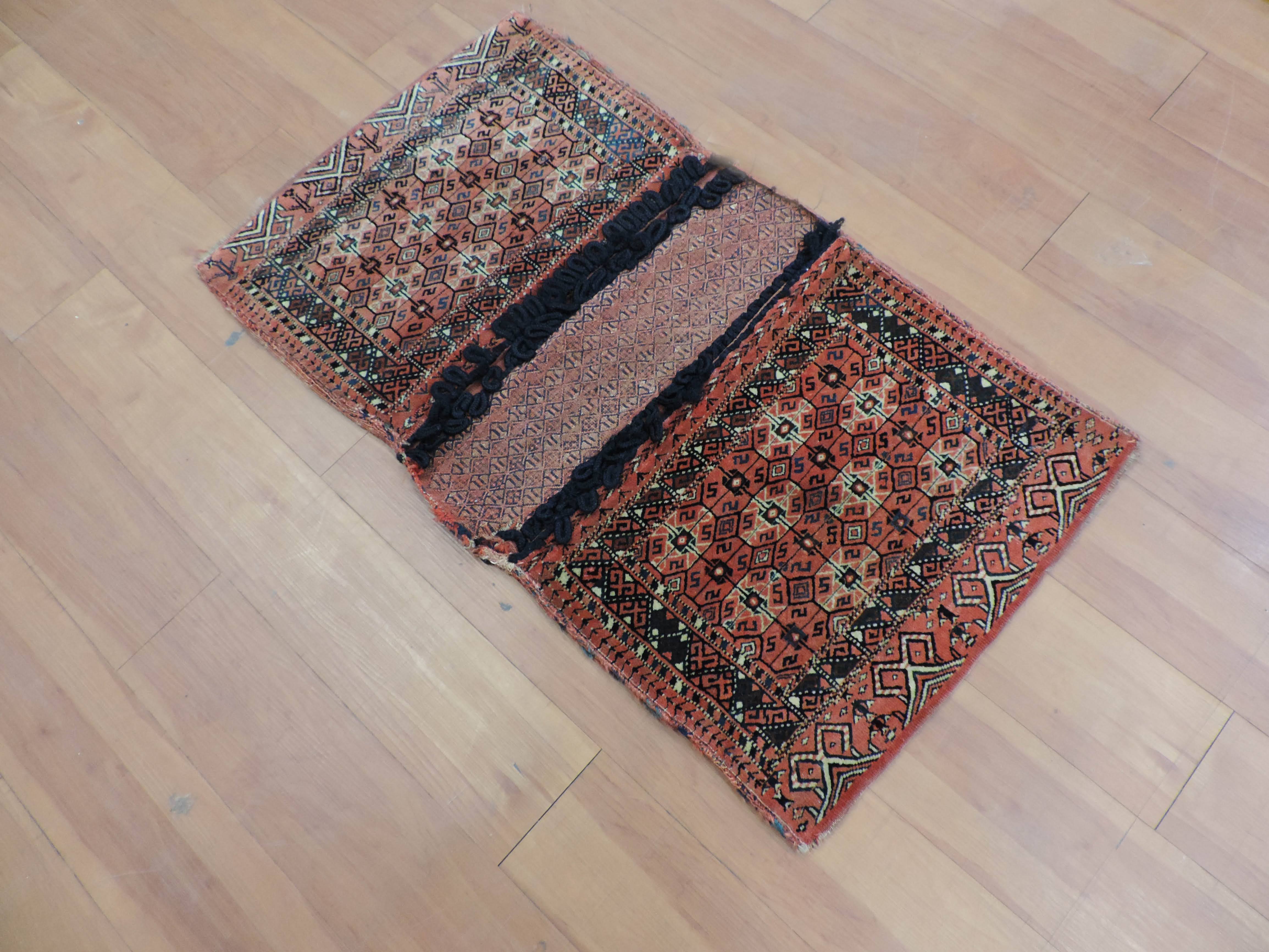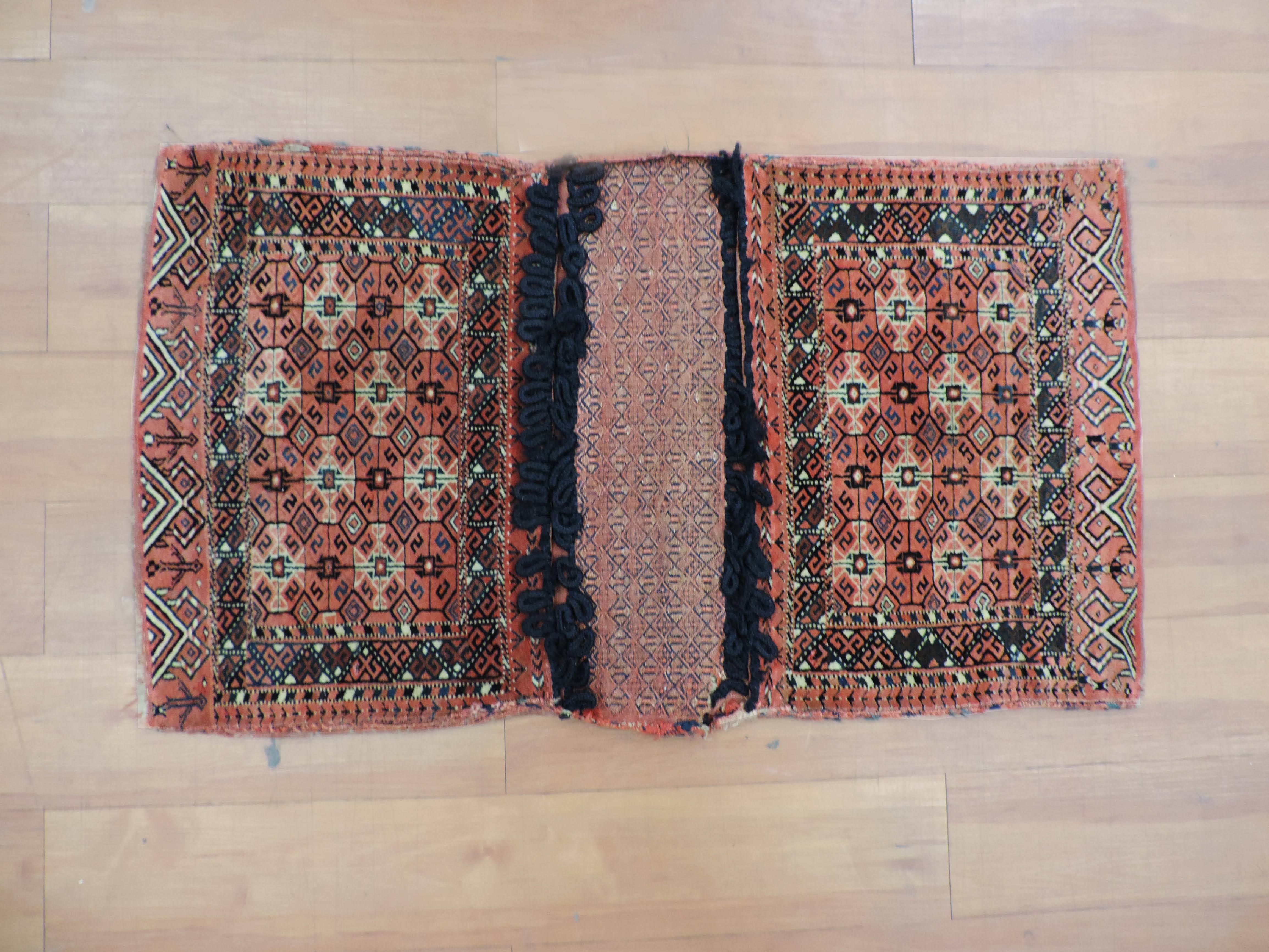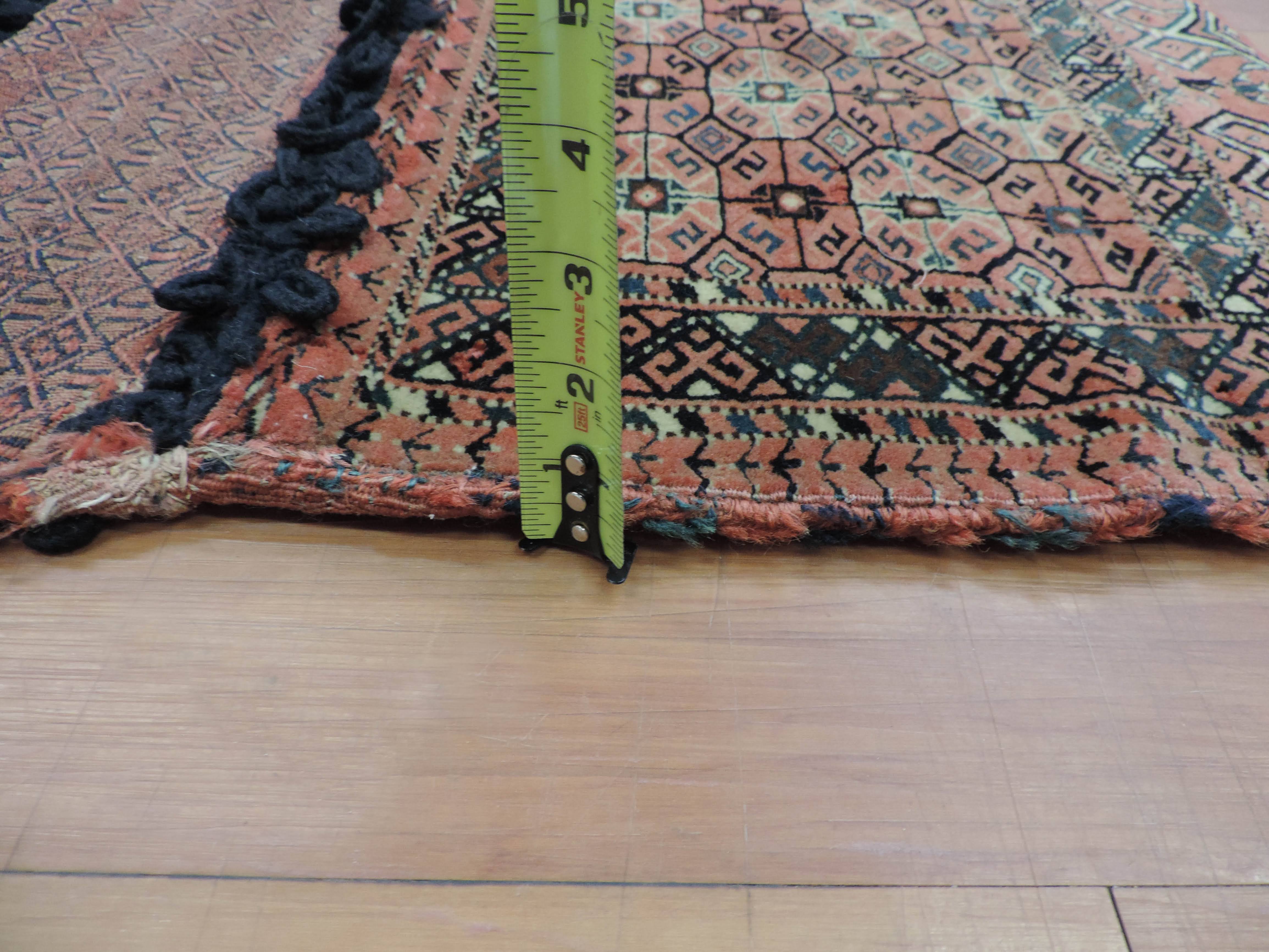 Now is the time to grab a piece of history with this antique saddlebag. This antique jewel, sourced directly from Turkmenistan, is hand-knotted with a beautiful geometric pattern on a warm rose-colored wool, and is bound by a sturdy cotton foundation. Priced at a steal, this one-of-a-kind saddlebag design rug brings a timeless elegance that effortlessly breathes life into any space.