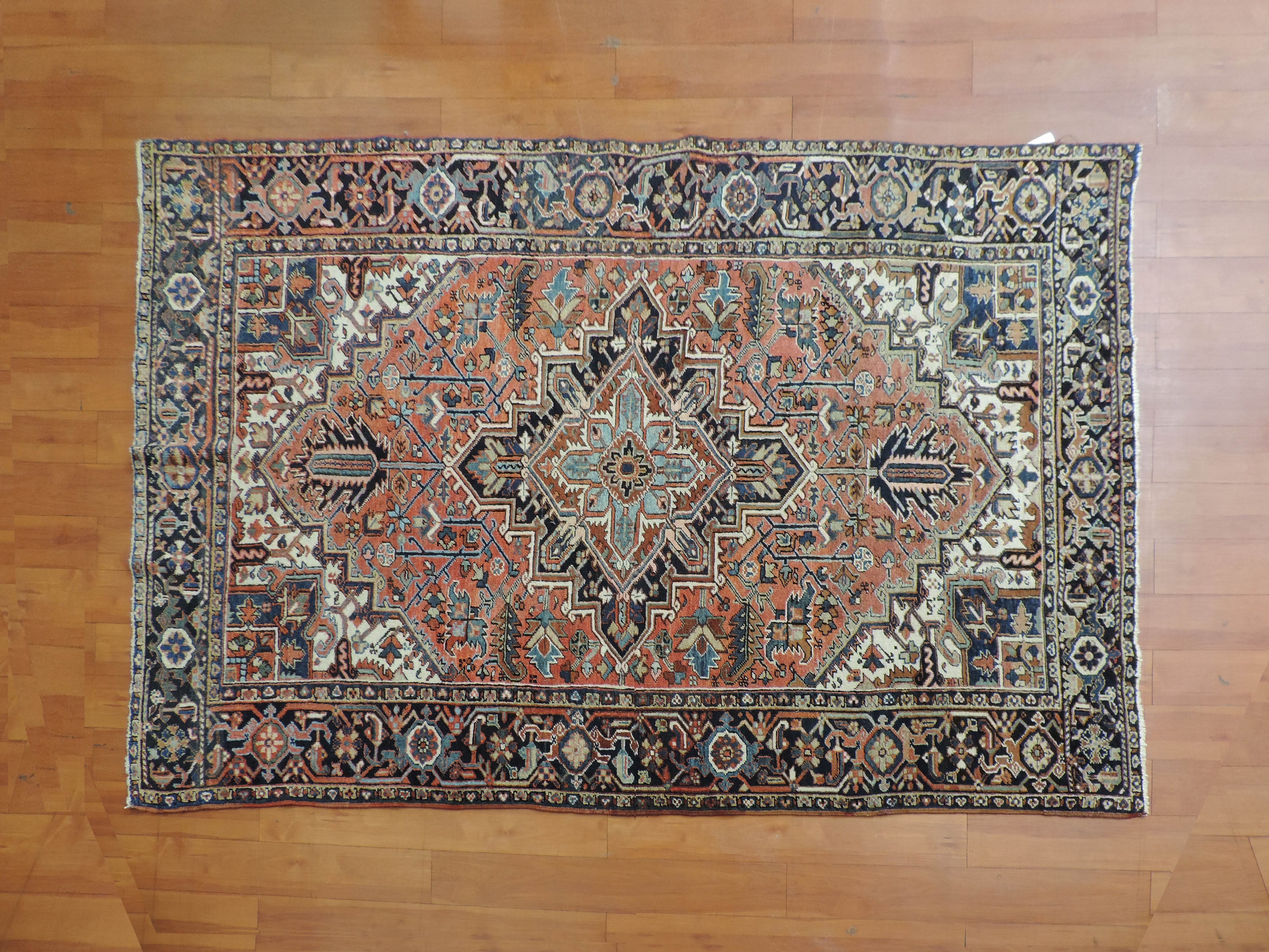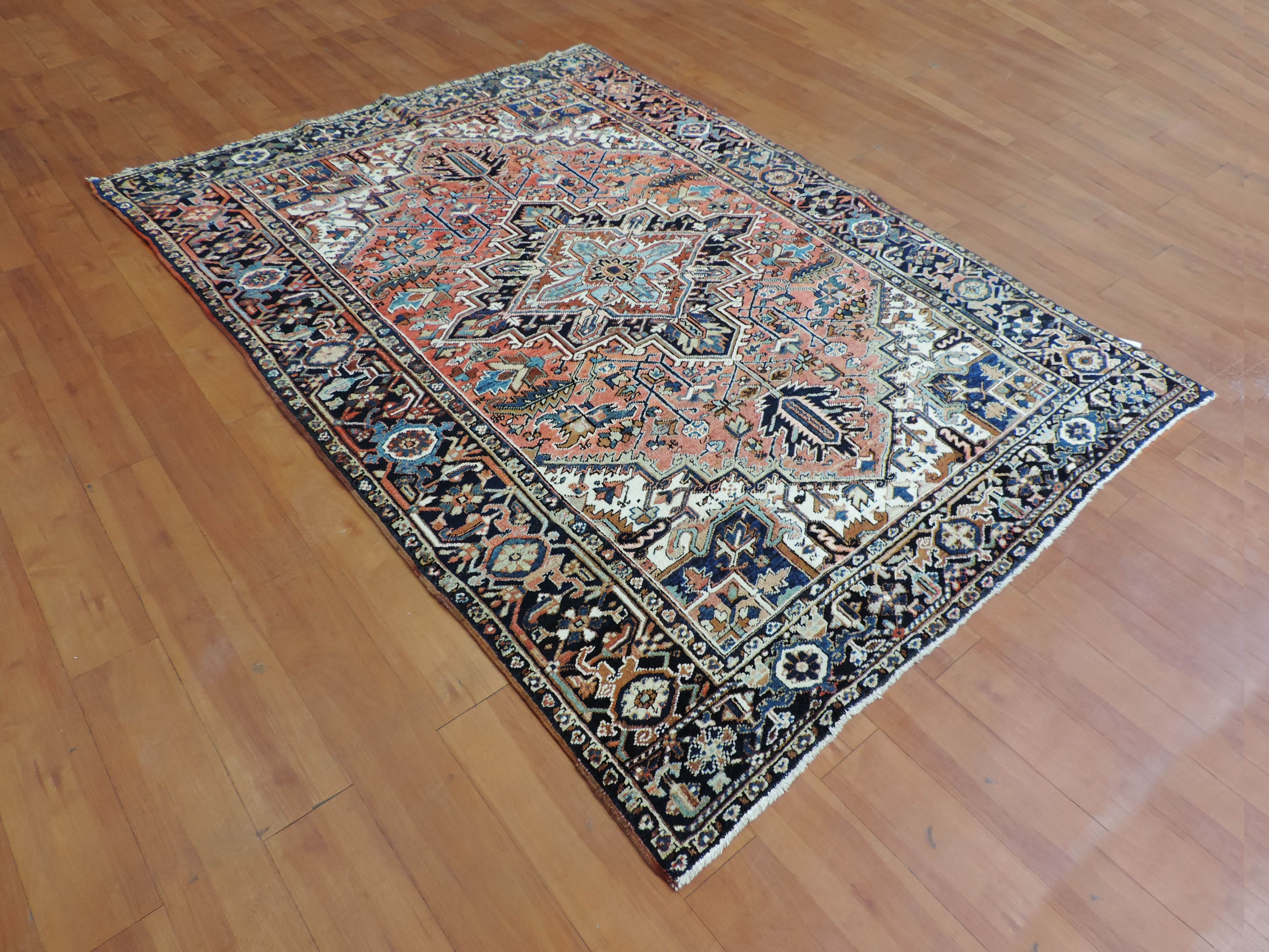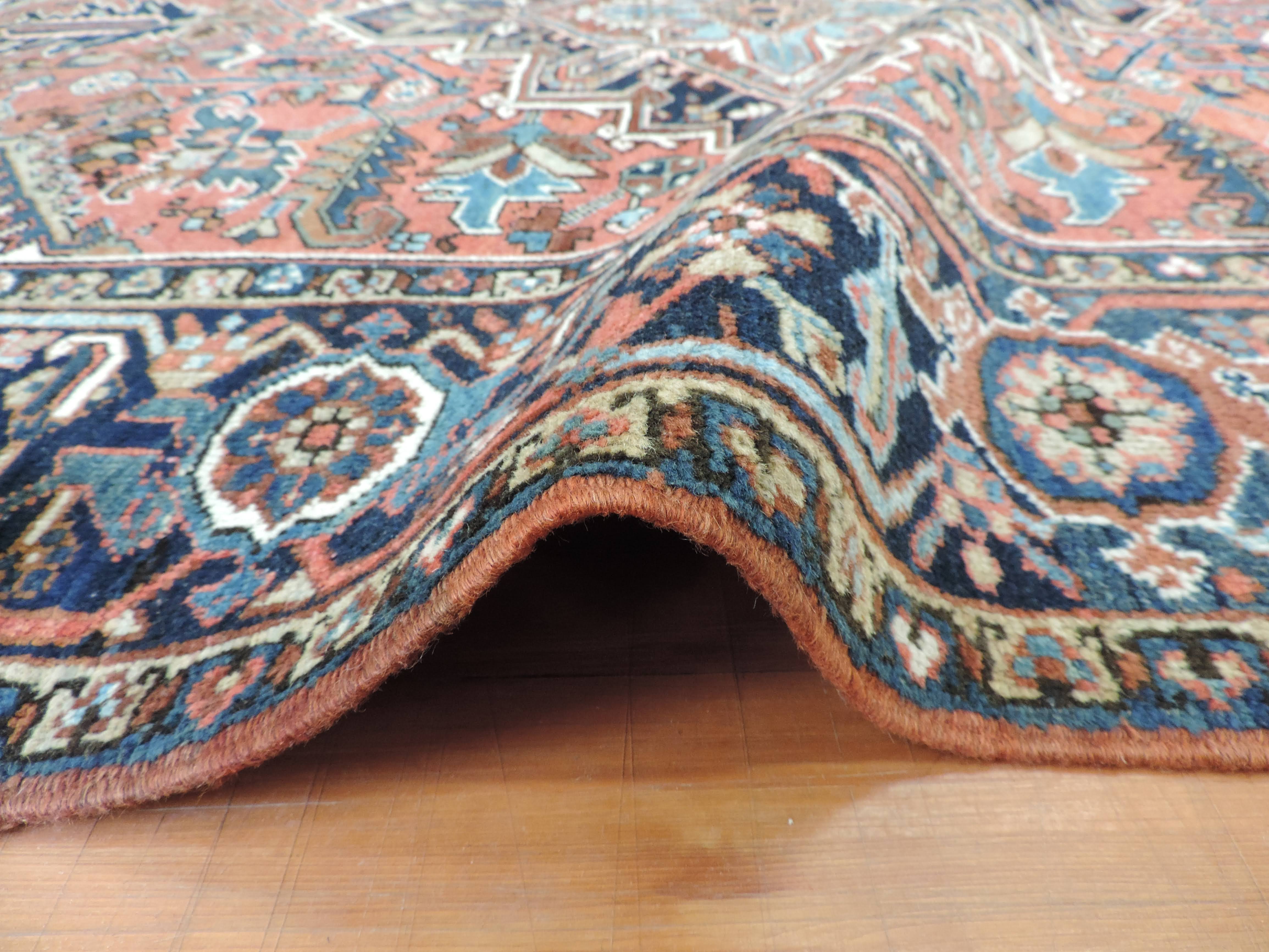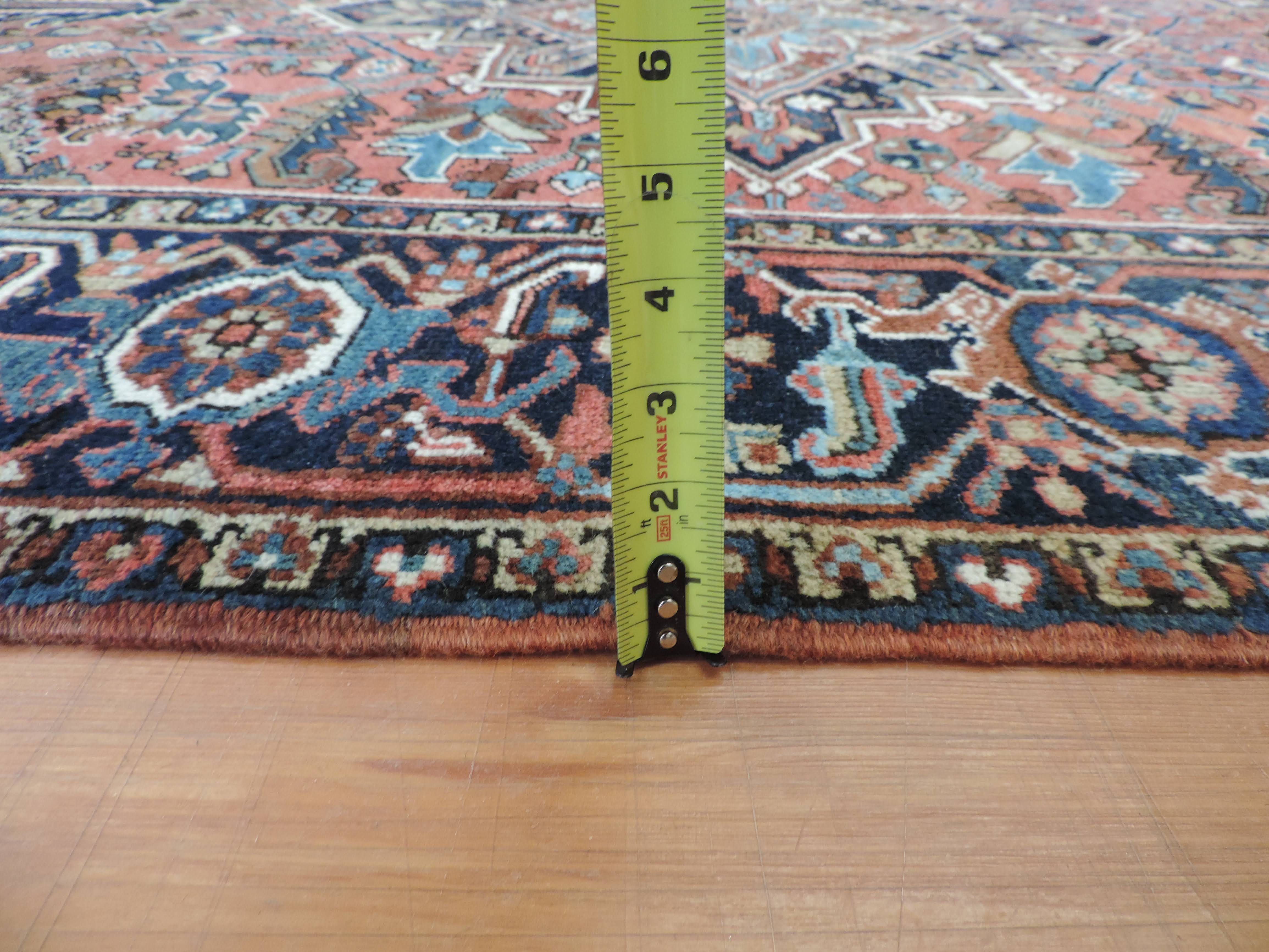 Dive into the rich heritage of Iran with our antique, hand-knotted Koko-2422 rug. This exquisite piece showcases a stunning geometric pattern, presented in a beautiful rust color, that brings both warmth and intrigue to any room. Crafted from durable wool with a cotton foundation, this 1940s Heriz rug, now available at a remarkable sale price, offers an authentic touch of oriental charm to your home decor.