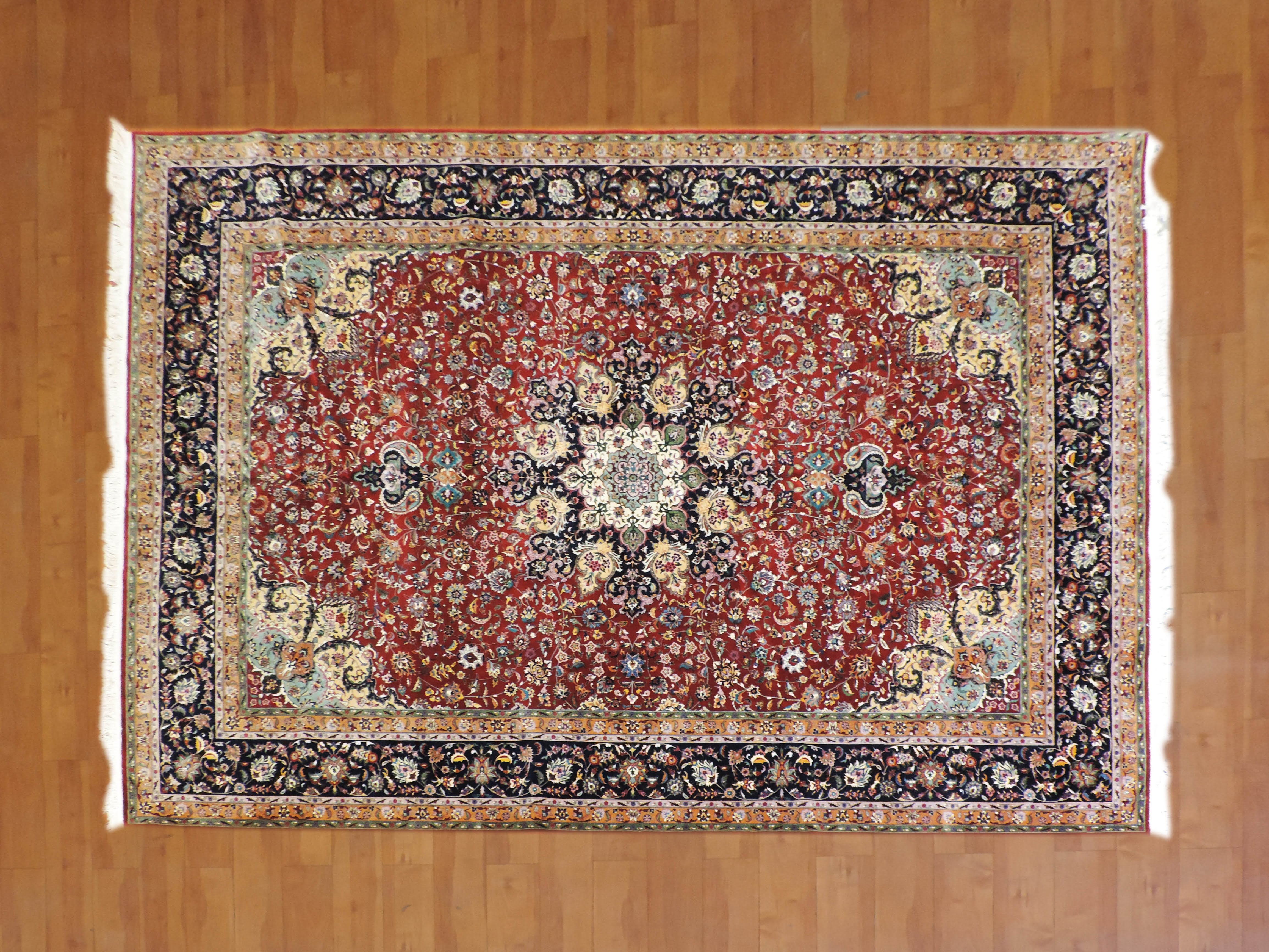 Invite opulence into your space with the Koko-2452, a vintage Tabriz rug hand-knotted from fine wool. This rectangular masterpiece from Iran boasts a vibrant red floral design that exudes a timeless appeal. With an exclusive sale price of $7,200, this 1980s gem is a rare find that perfectly blends artistry, heritage, and comfort.