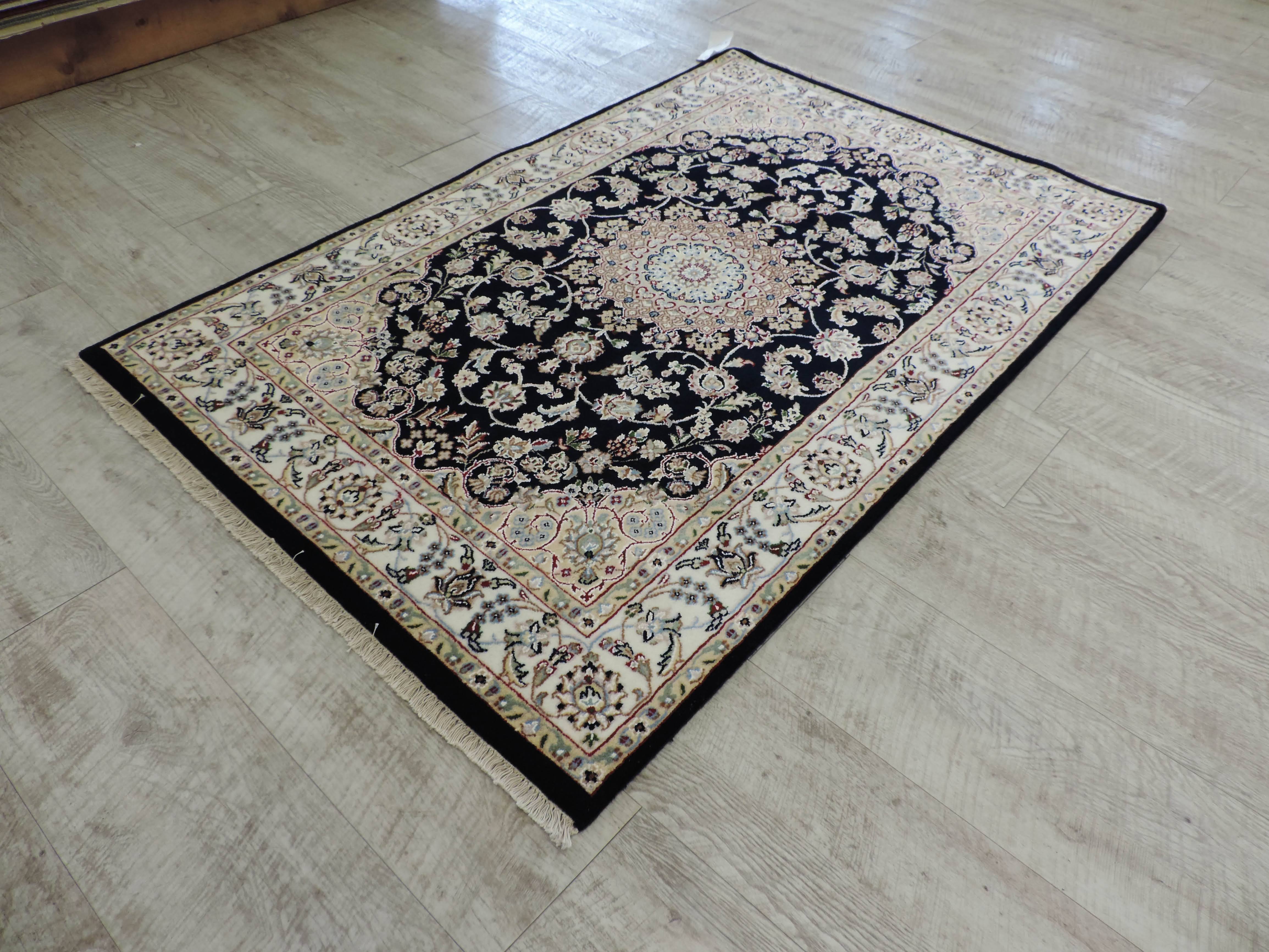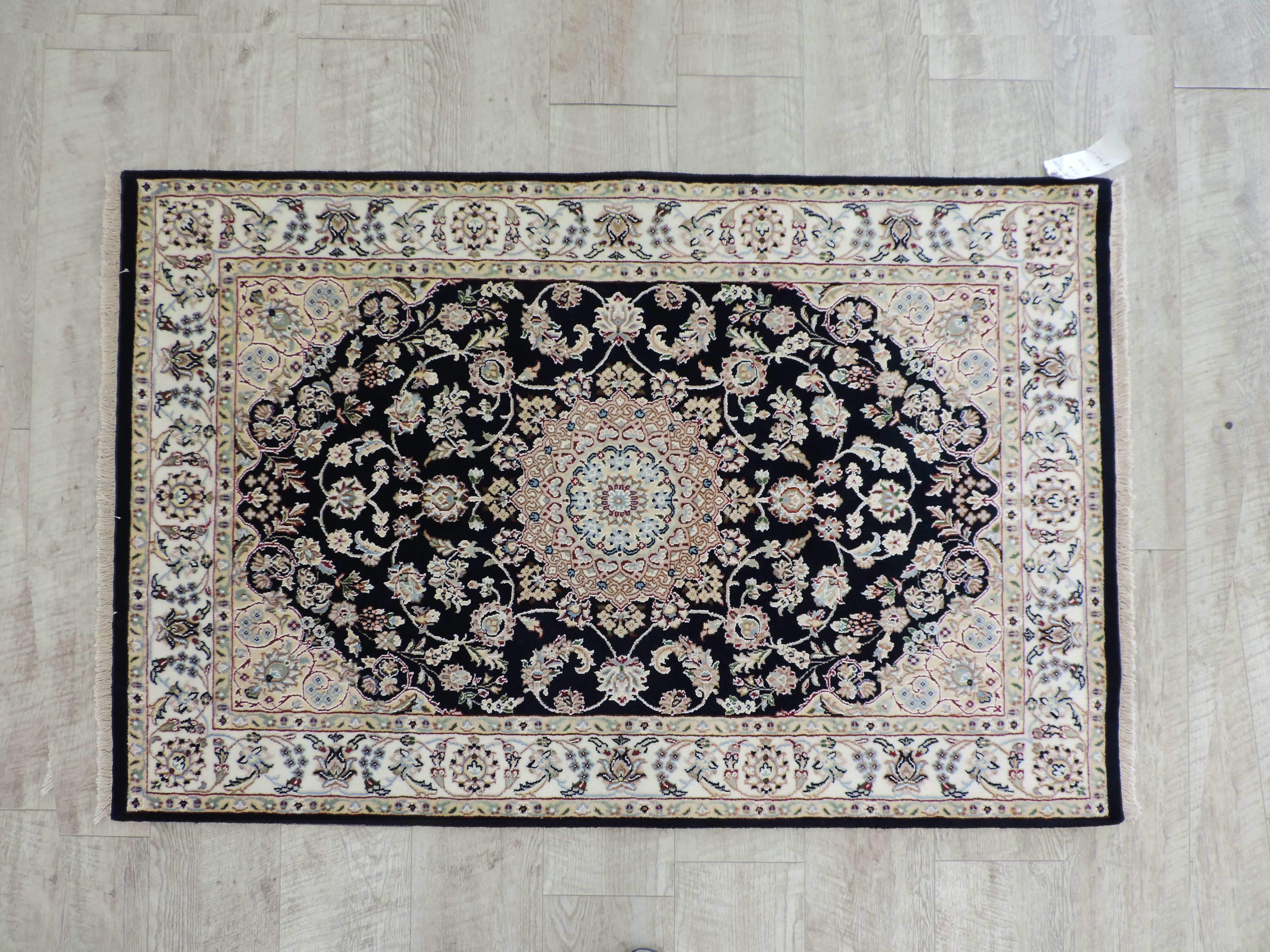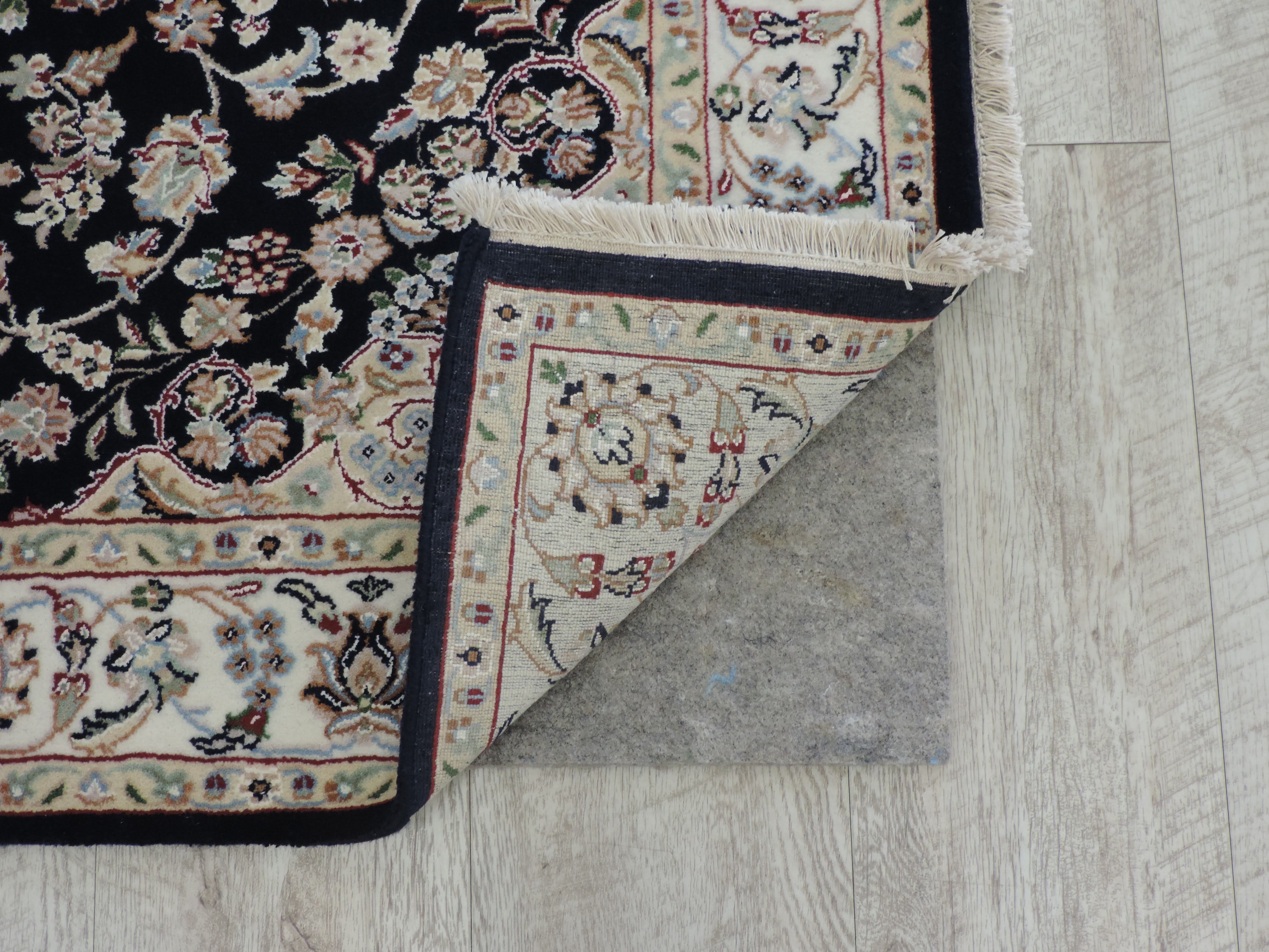 Indulge in the classic elegance of our KOKO-32255 oriental rug. This hand-knotted masterpiece is crafted from pure wool with a floral design that's both timeless and striking, bringing a luxurious touch to any room. With its bold black primary color set on a cotton foundation, this Indian-origin rug is a steal at just $850, offering an opulent aesthetic that feels just as wonderful underfoot.