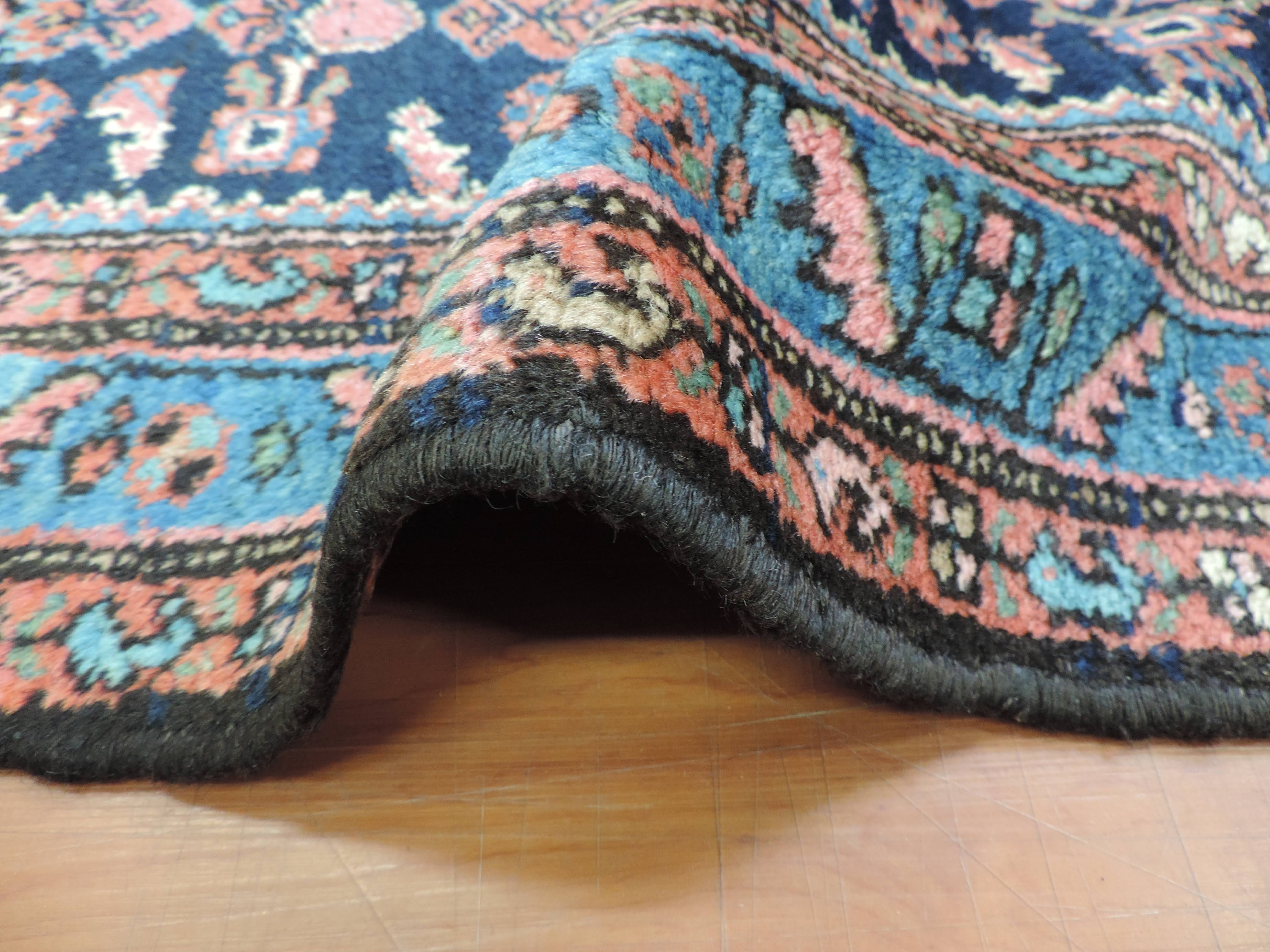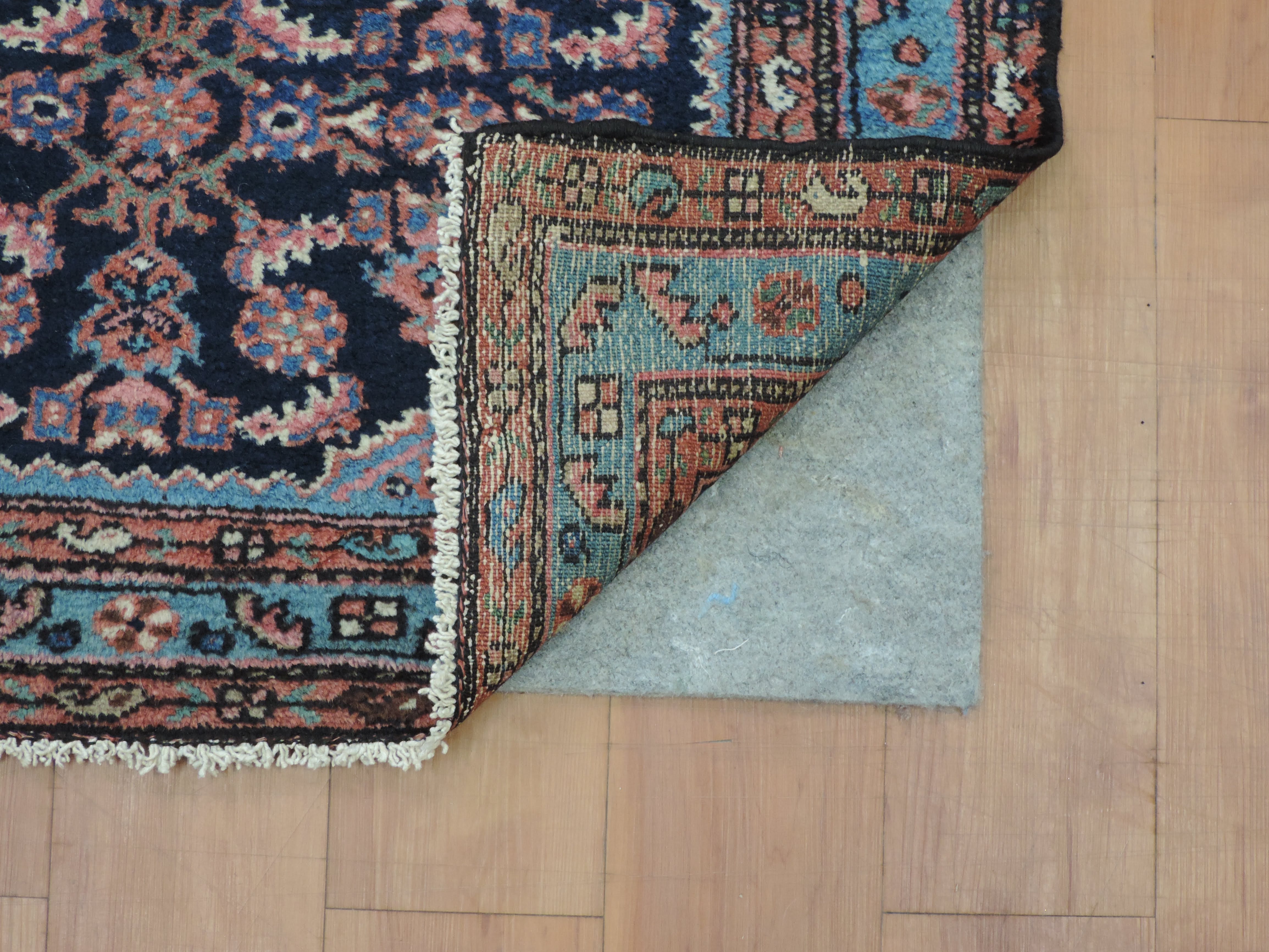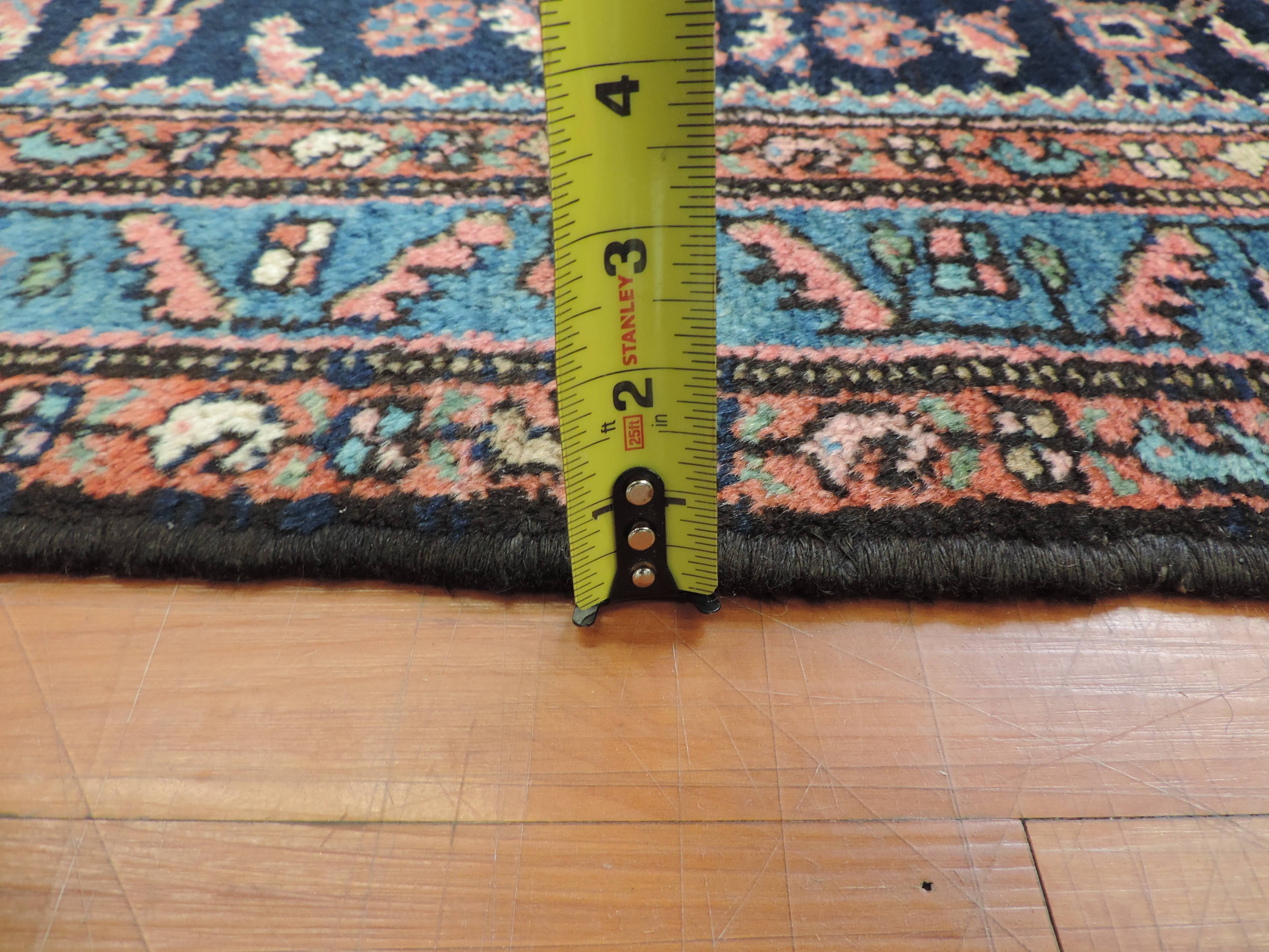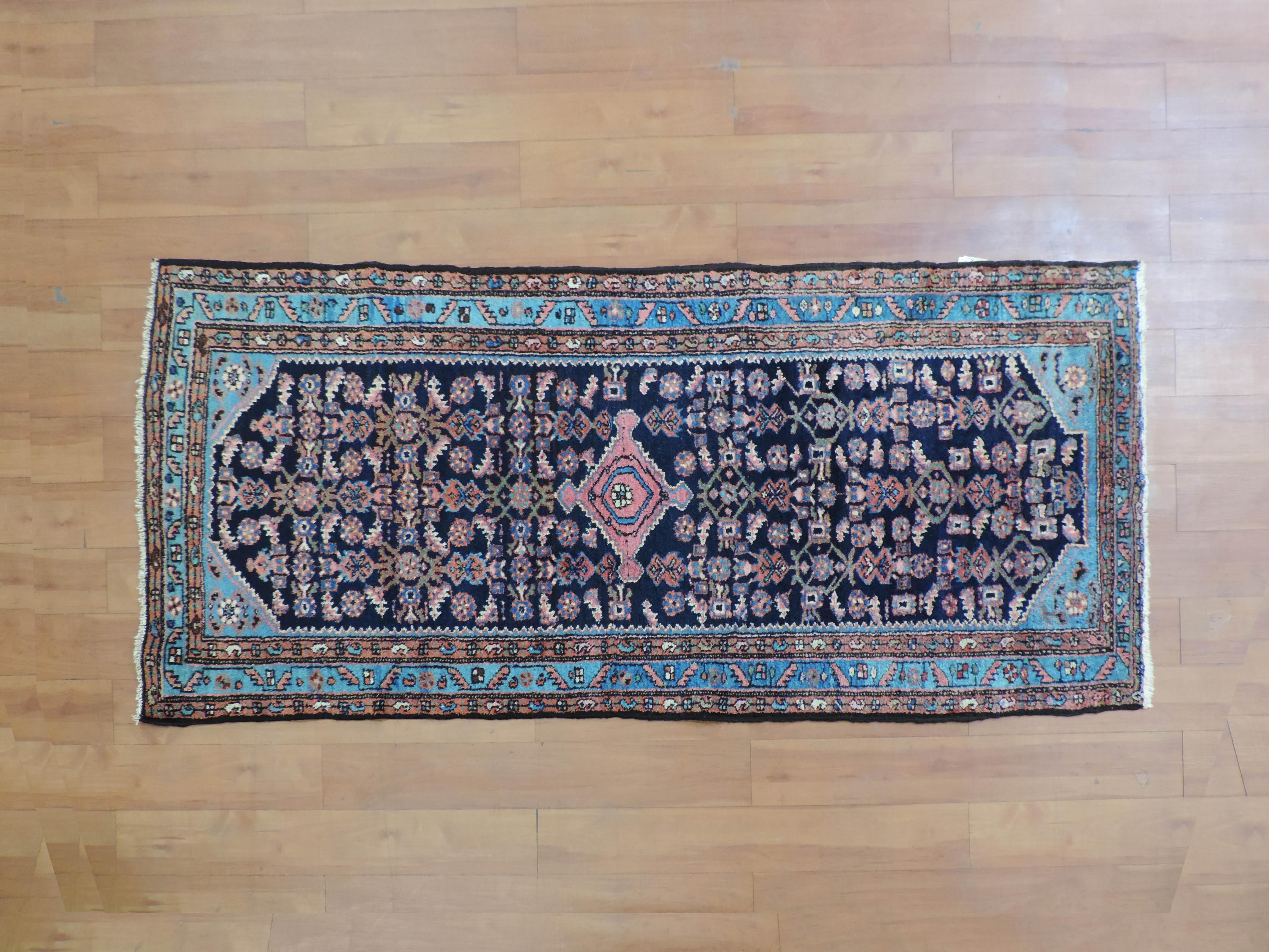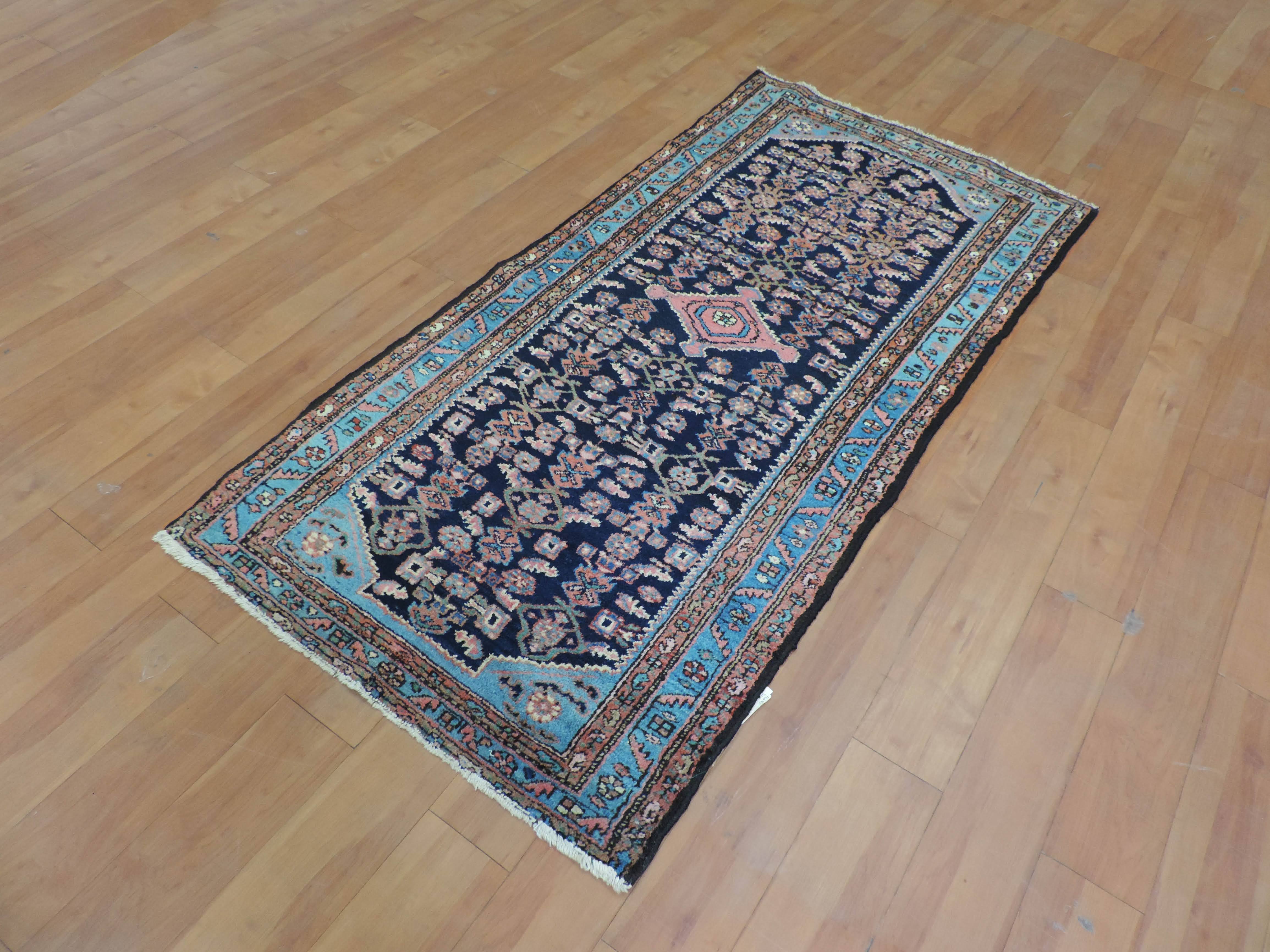Experience the charm of our antique, hand-knotted Koko-334 rug, a luxurious piece of Iran's rich textile history. Its compelling geometric design and navy primary color are beautifully accentuated in the quality wool weave, offering an inviting centerpiece for any room. Now available at a discounted price, this unique, rectangular Hamadan rug is a timeless investment that exudes both style and cultural richness.