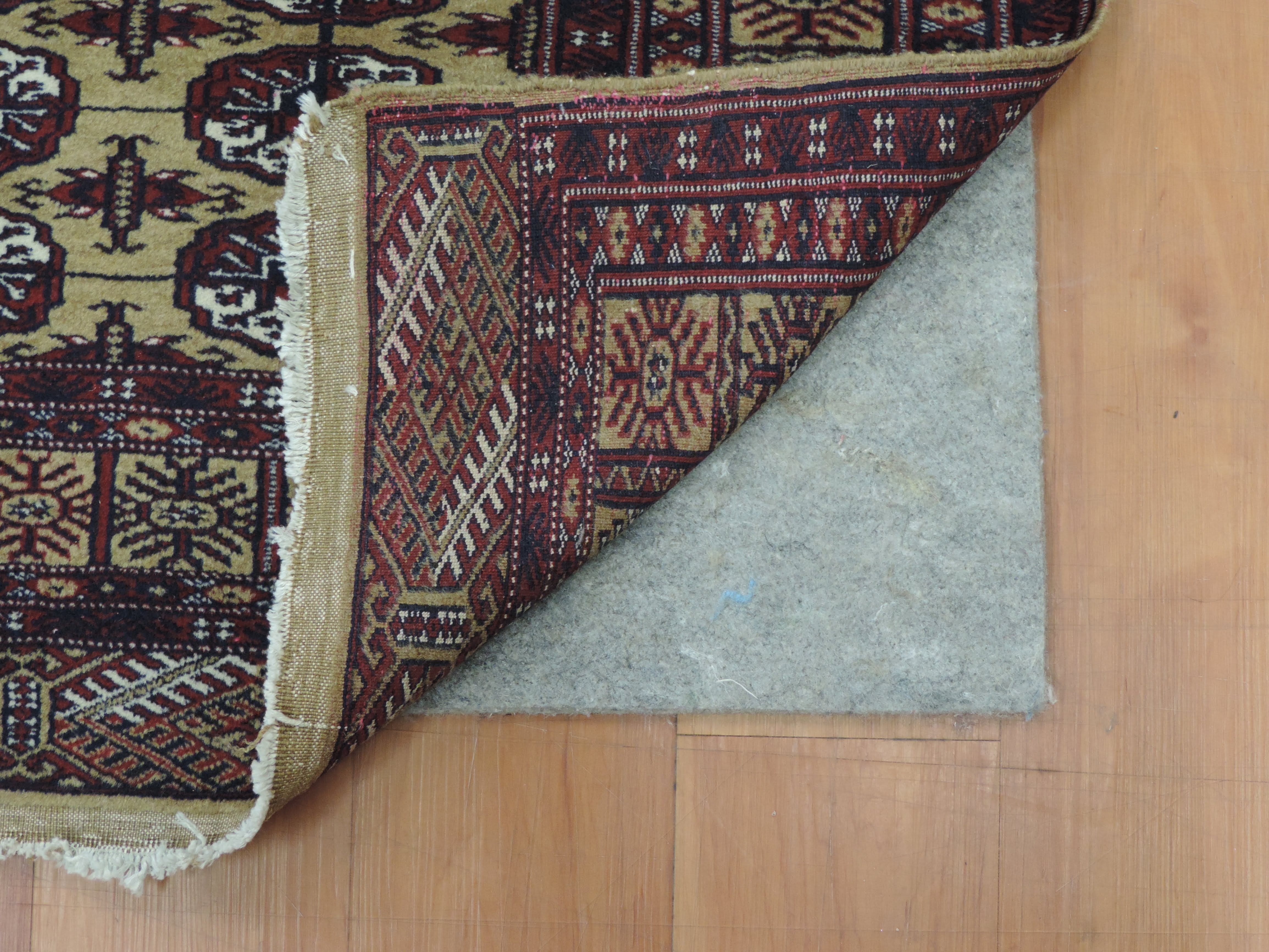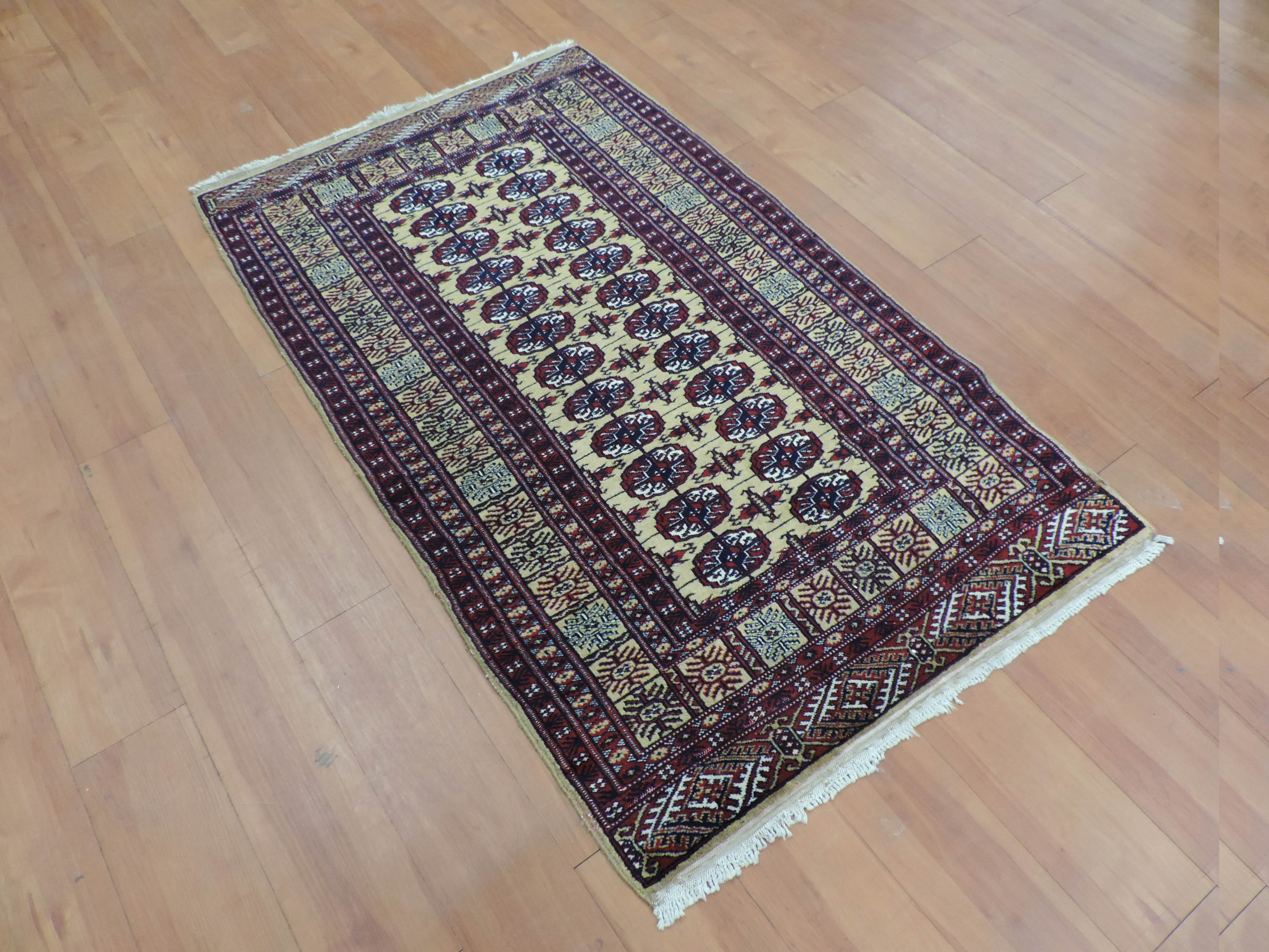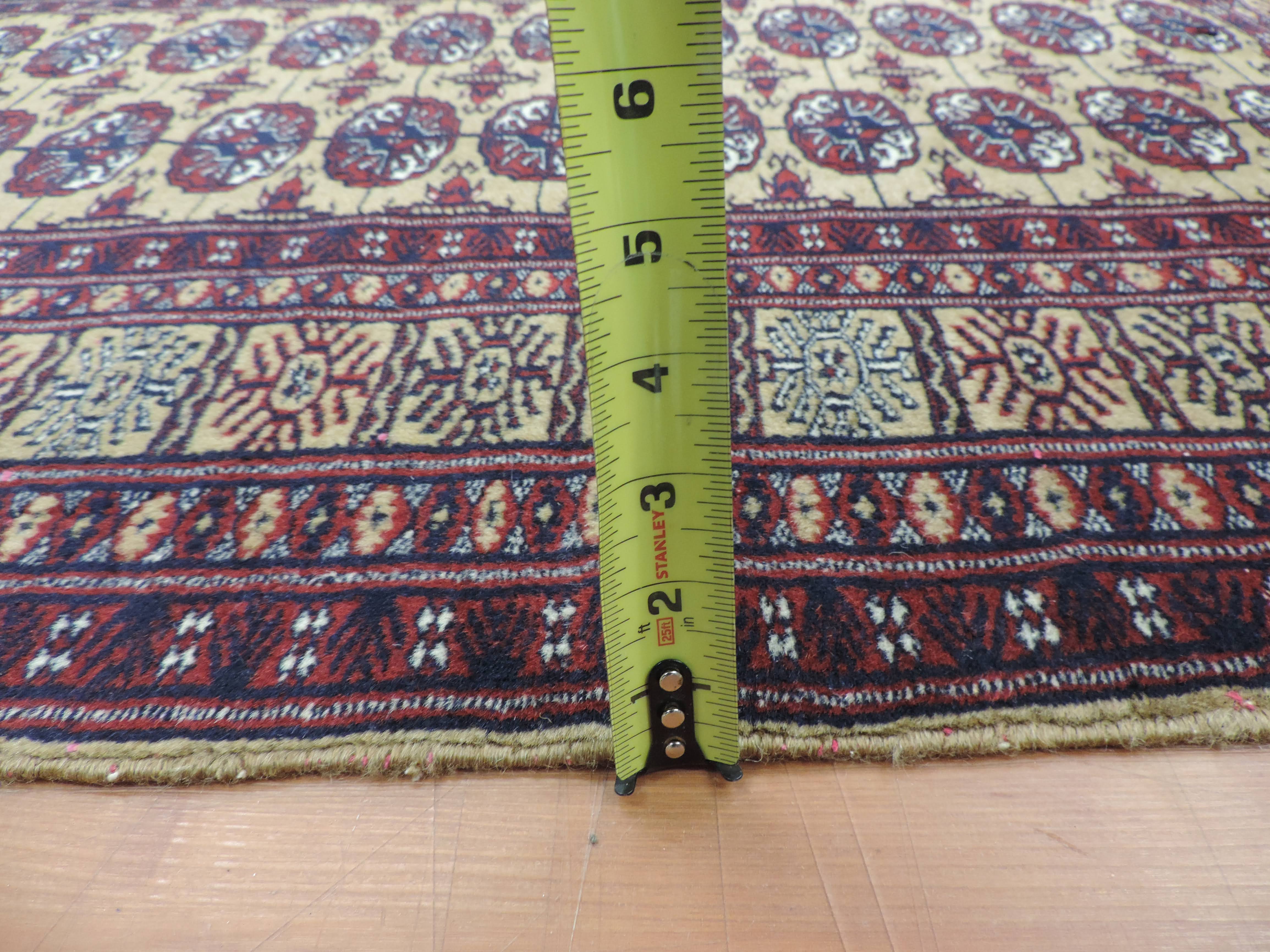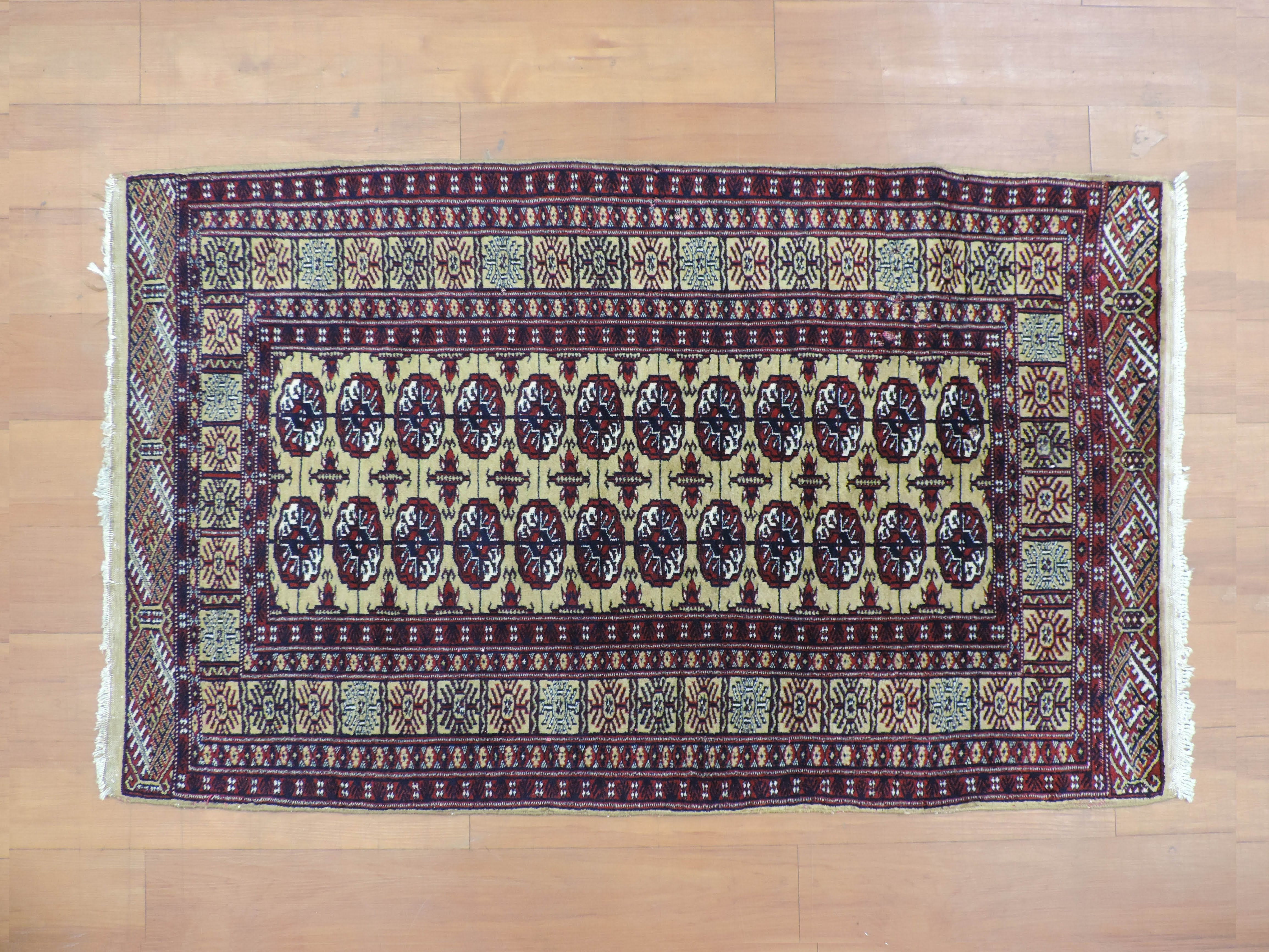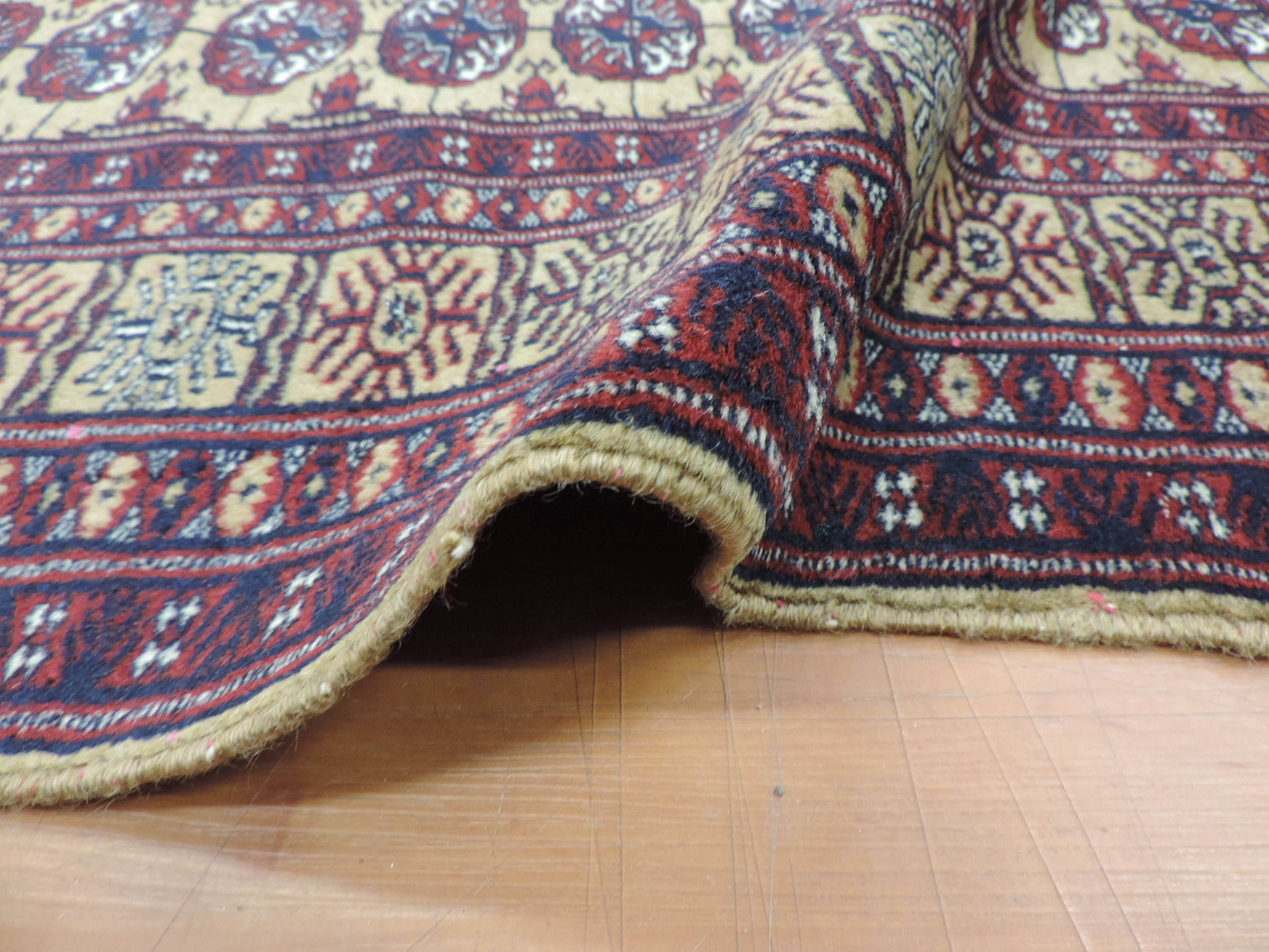 Dive into the luxurious aura of our vintage Bokhara rug, koko-474, originating from Pakistan. This unique hand-knotted piece, woven with the finest wool on a sturdy cotton foundation, showcases a mesmerizing geometric design sparkling in a rich golden hue. Available for a fantastic price, this rectangular beauty from the 1960s offers an irresistible blend of tradition, quality, and elegance.