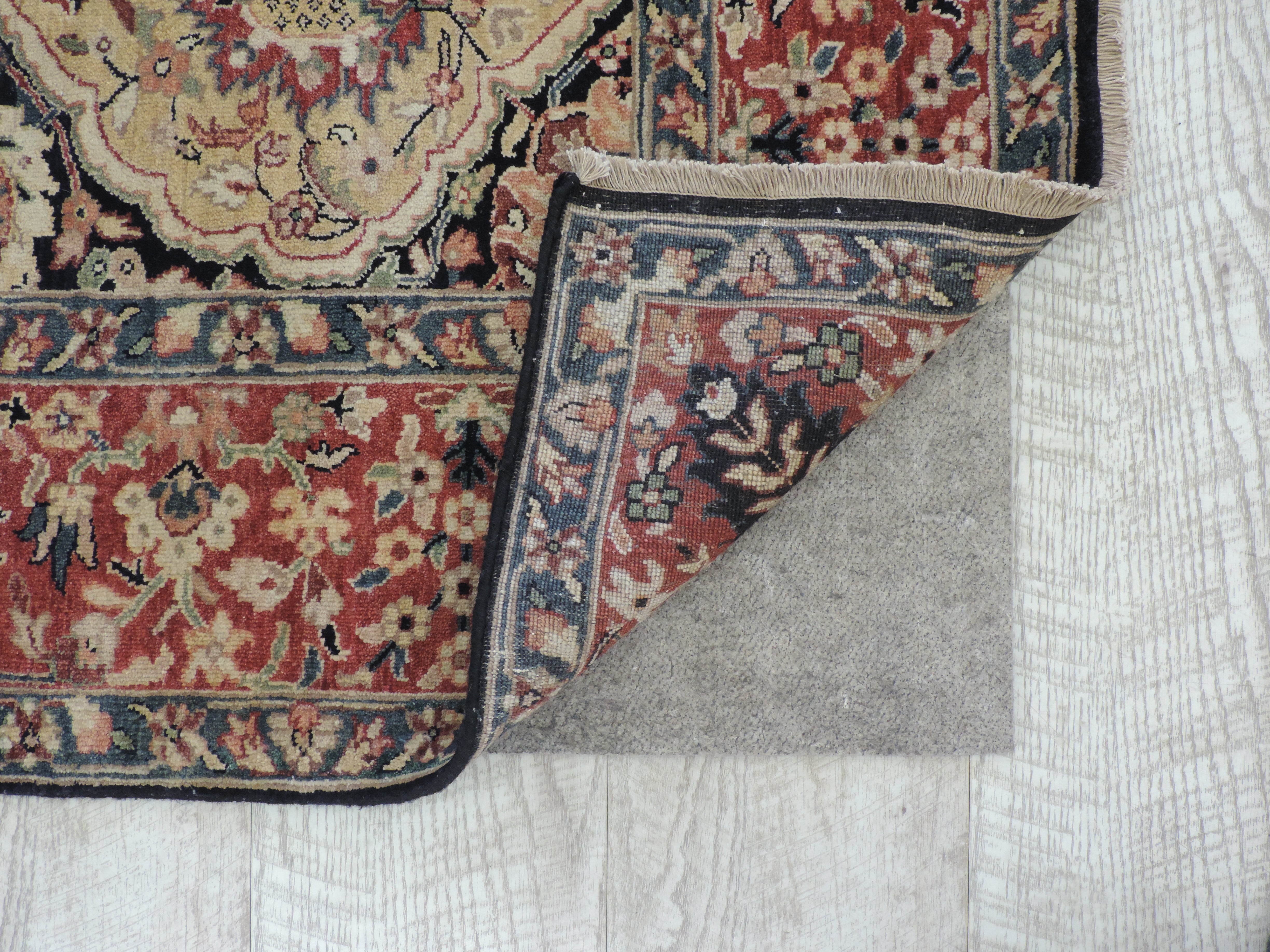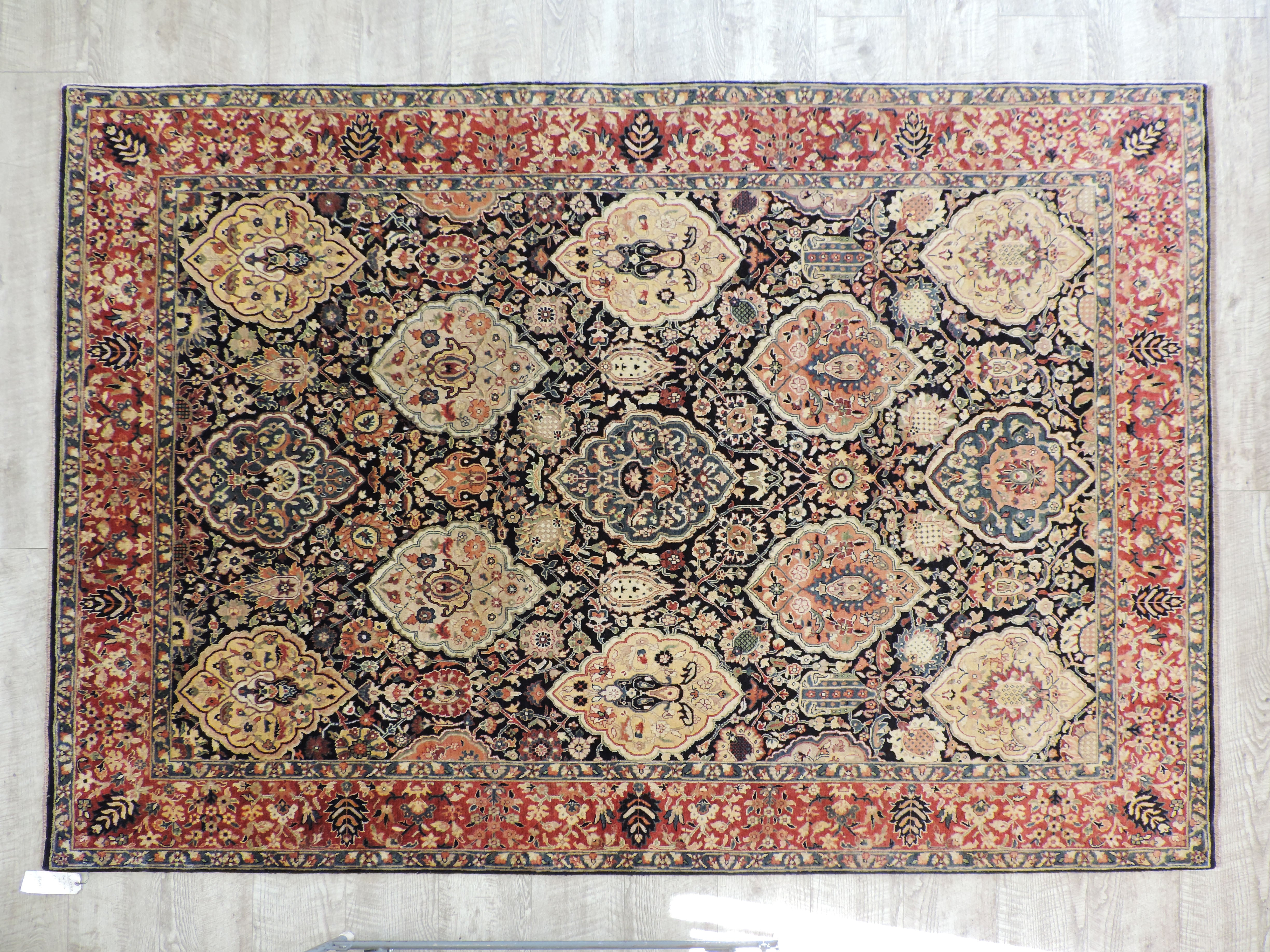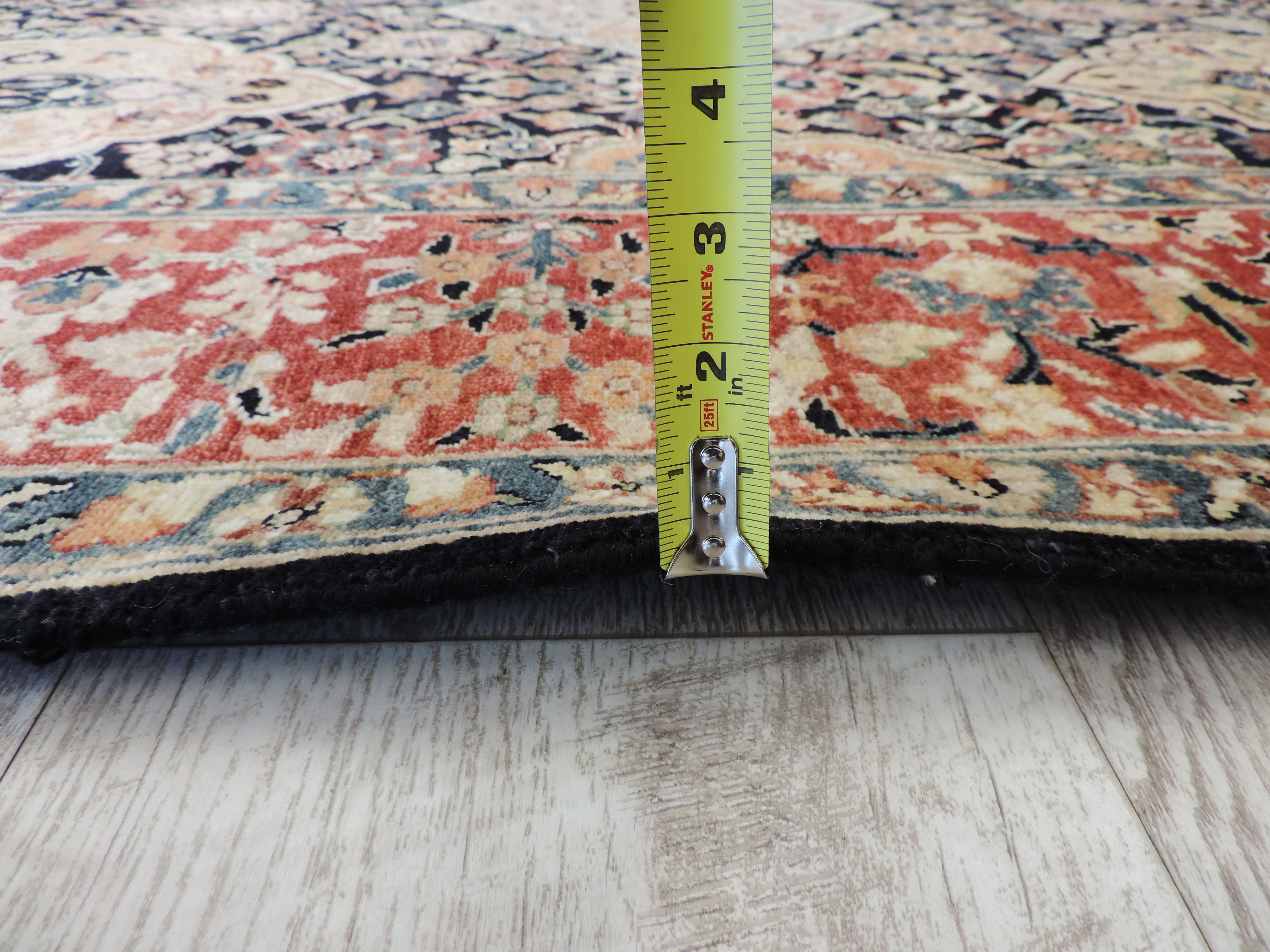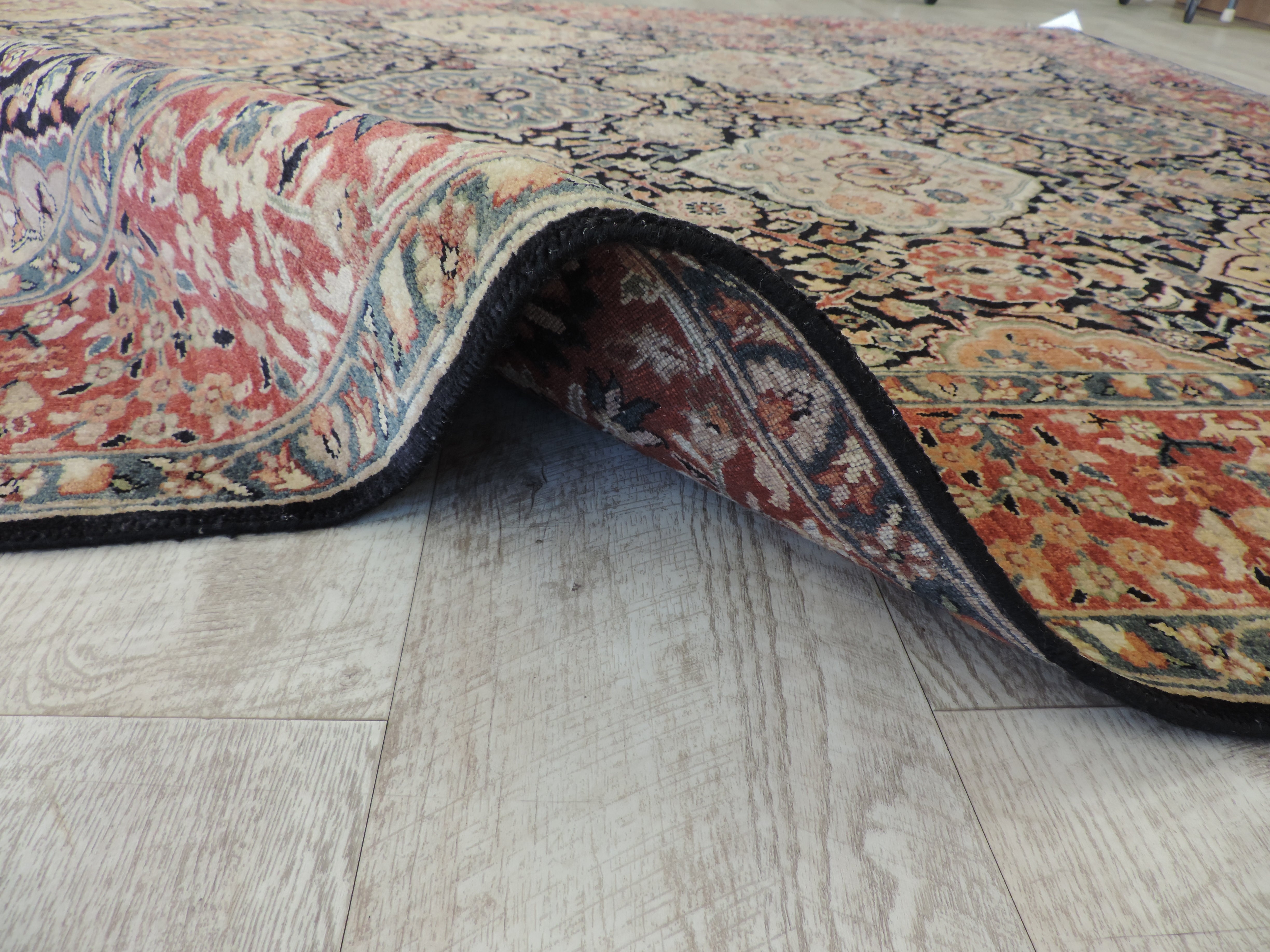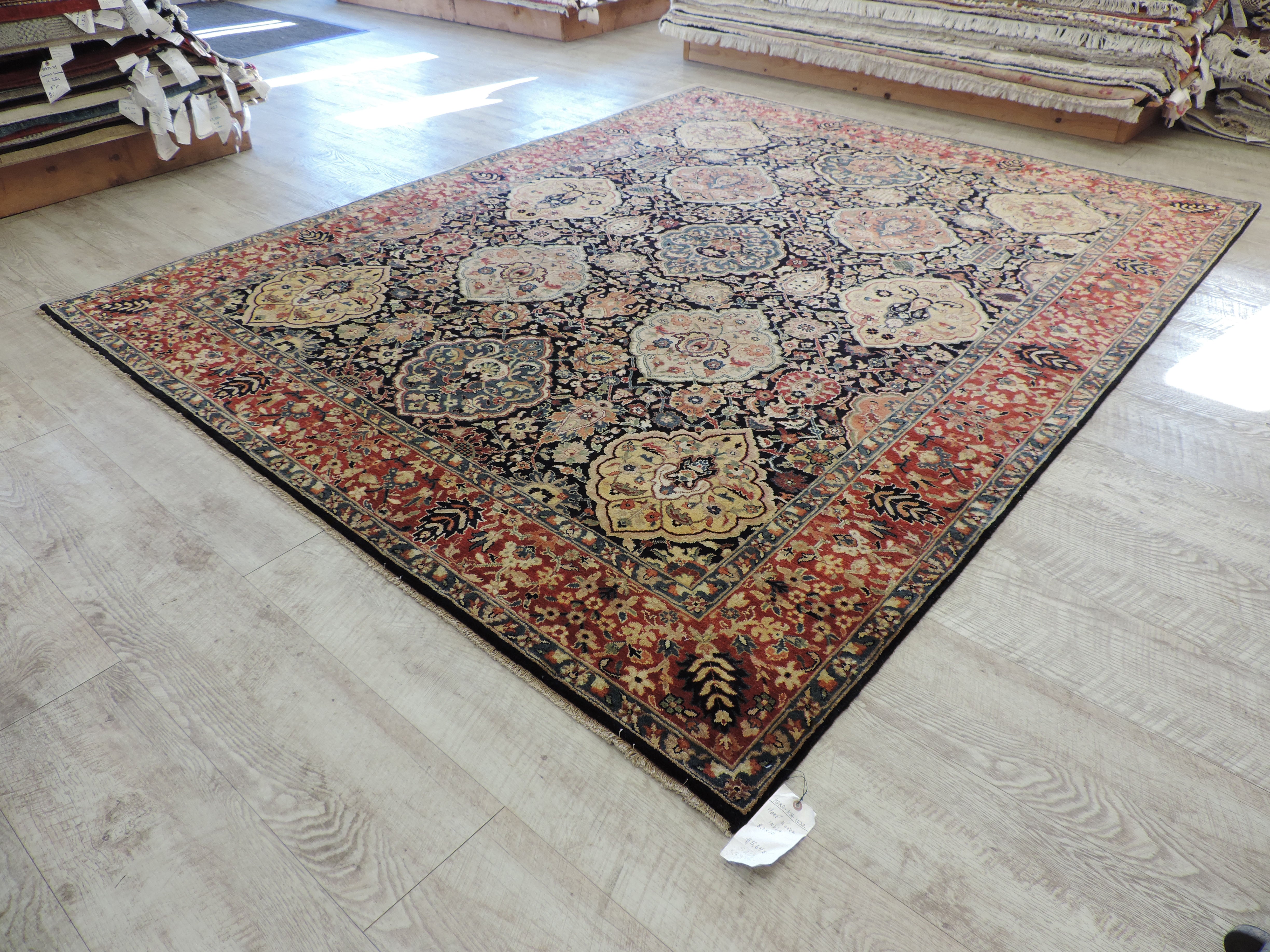Indulge in the richness of Indian artisan craftsmanship with our KOKO-KH-1032 oriental rug. Hand-knotted from pure wool on a sturdy cotton foundation, this 8.1 by 10.0 ft rectangular beauty features an intricate floral design in a striking black primary color. This brand new rug adds an element of timeless elegance to any room, all at the unbeatable sale price of $3650.