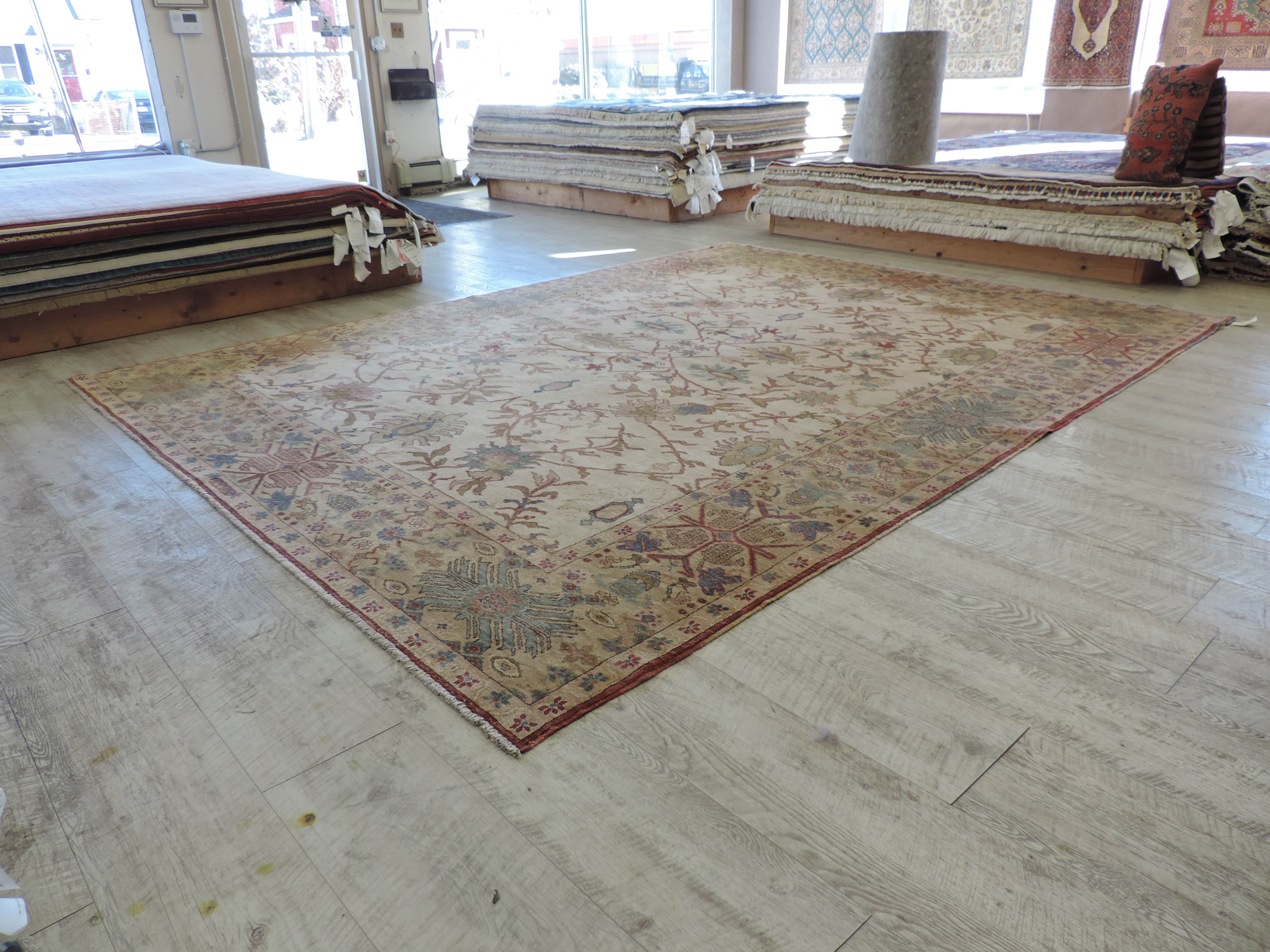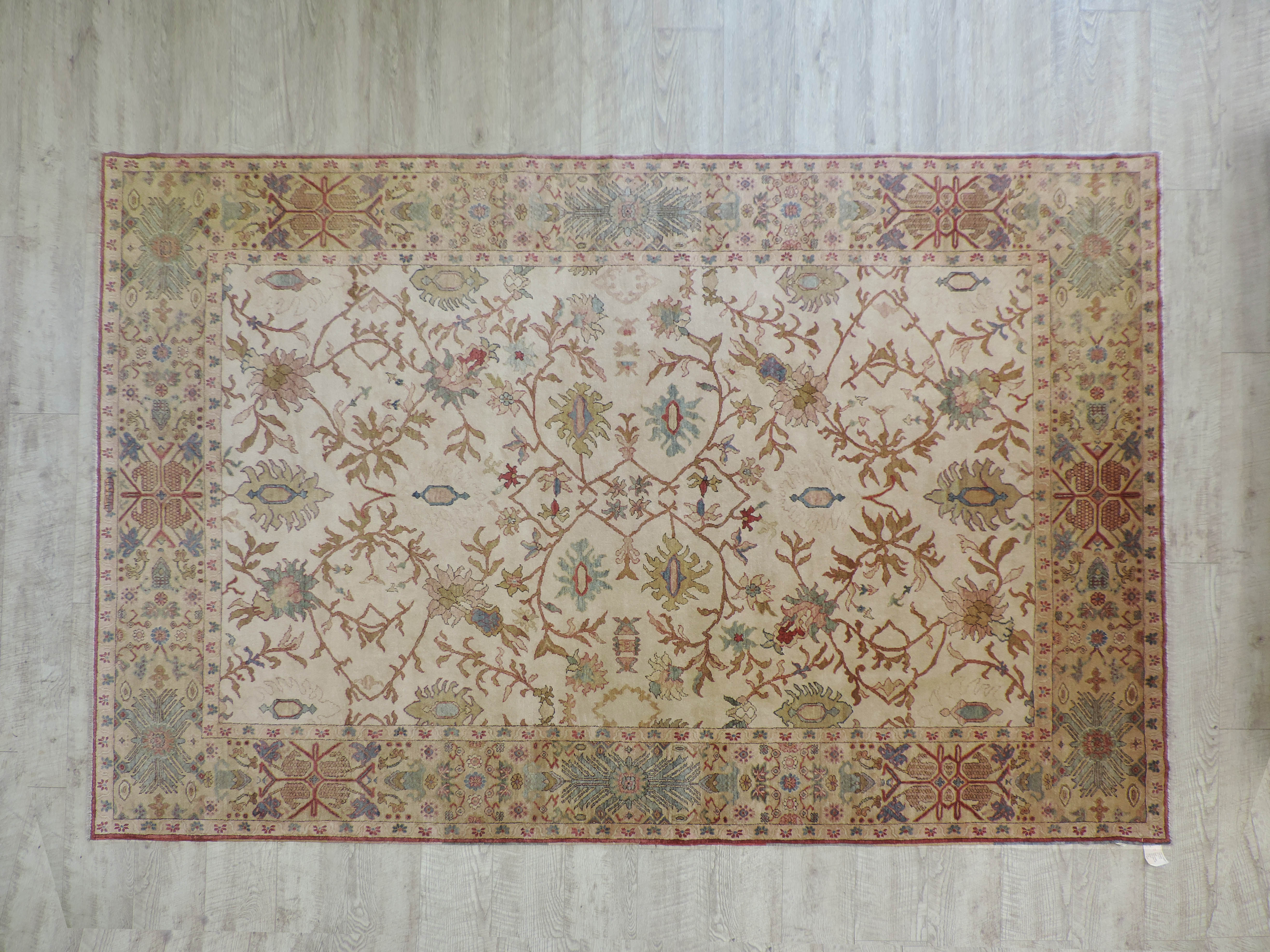 Indulge in the beauty of this hand-knotted Sultanabad rug, crafted in Egypt with the finest wool. It showcases a stunning floral design in a calming beige palette that promises to add a touch of elegance to any living space. Its rectangular shape and generous size of 9.1 by 11.10 feet offer a grandeur presence while the special sale price presents an irresistible deal. Wrap your home in the luxurious warmth of this new, exquisite oriental rug.