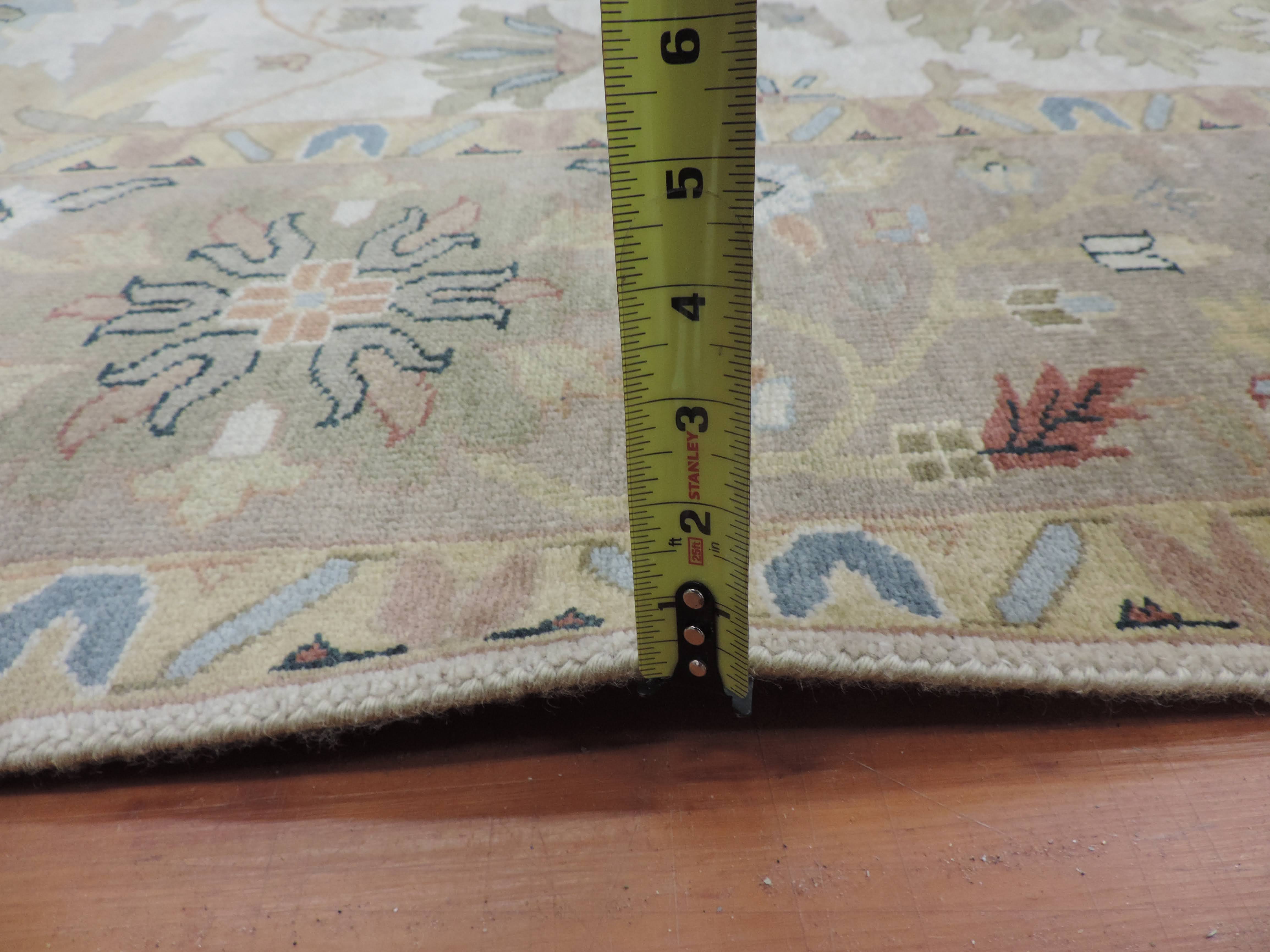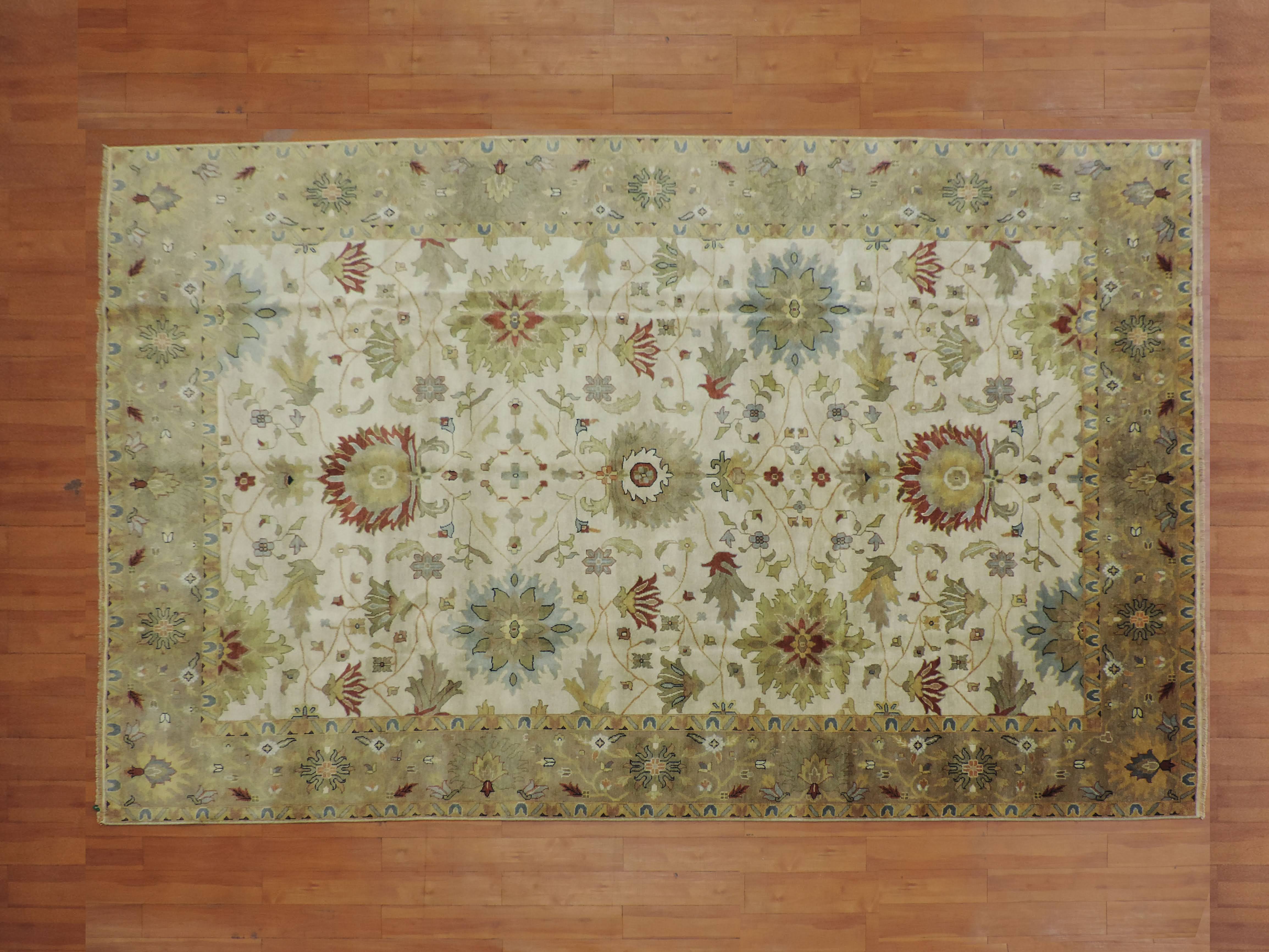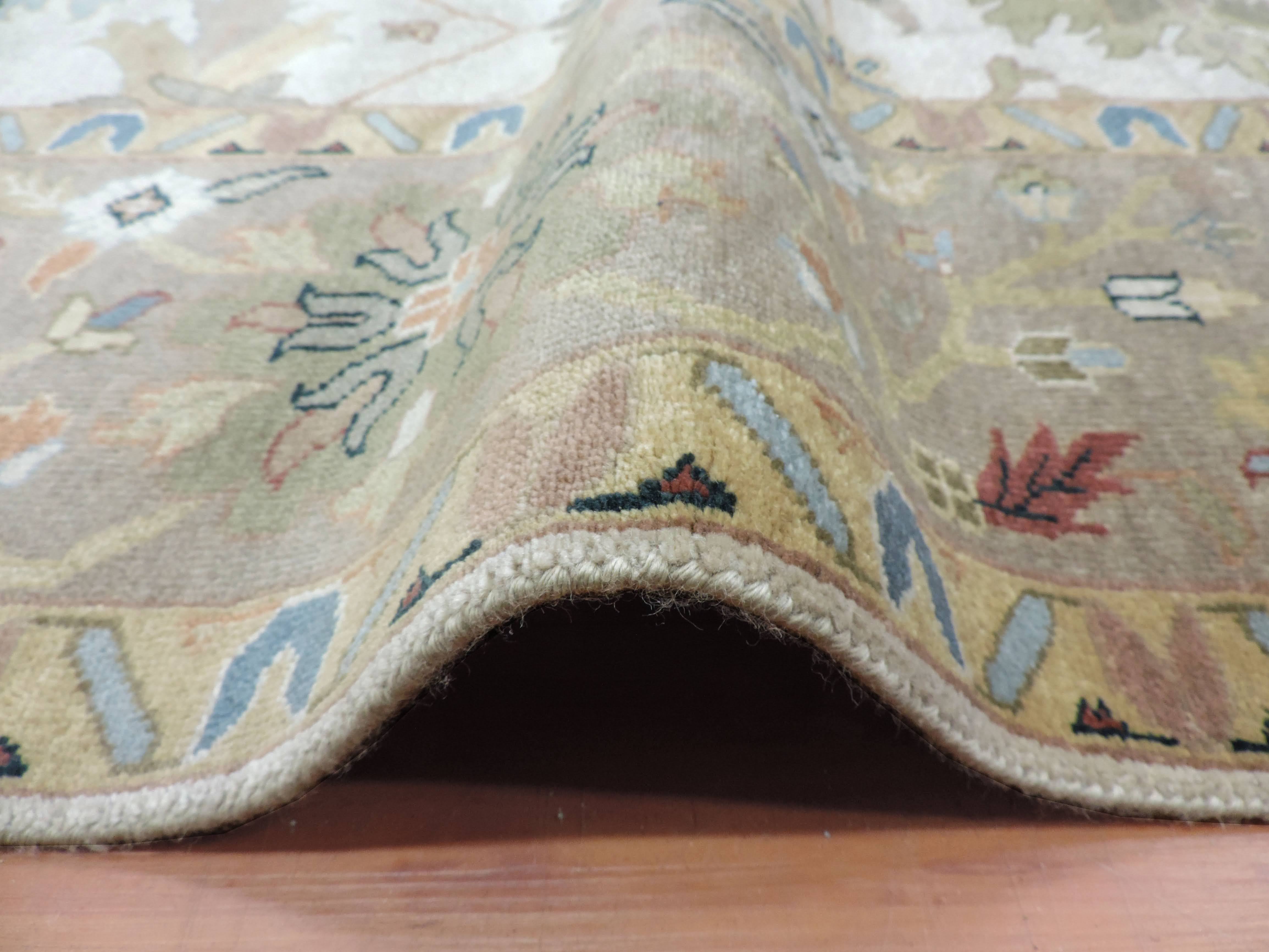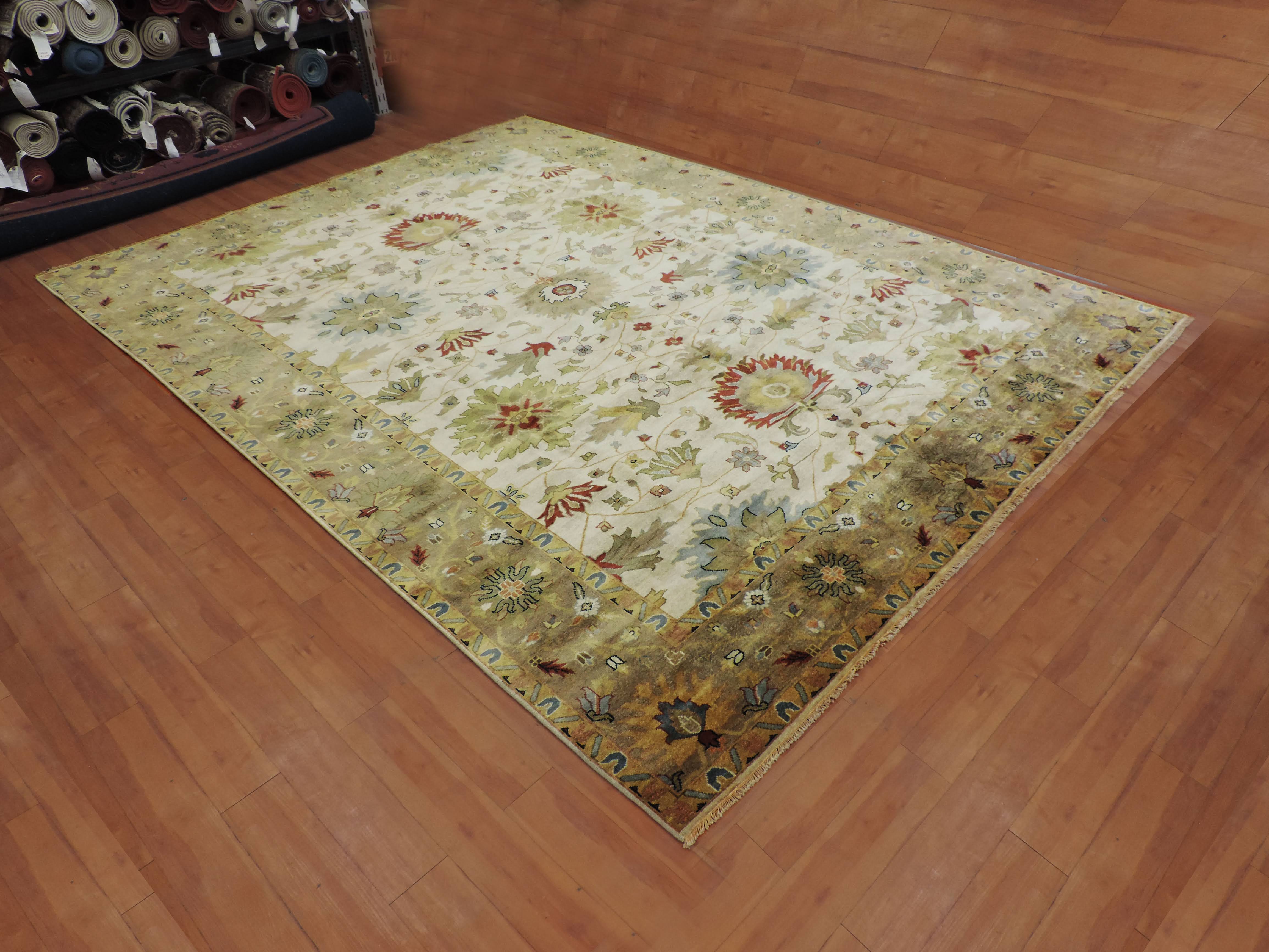 Indulge your living space with the lavish touch of this S-146 Oushak rug. Hand-knotted in India, this masterpiece beautifully combines a crisp ivory background with a mesmerizing floral design. Fashioned from pure wool on a cotton foundation, this rug's luxurious texture and exceptional durability make it a remarkable addition to any room at a sale price too inviting to resist.