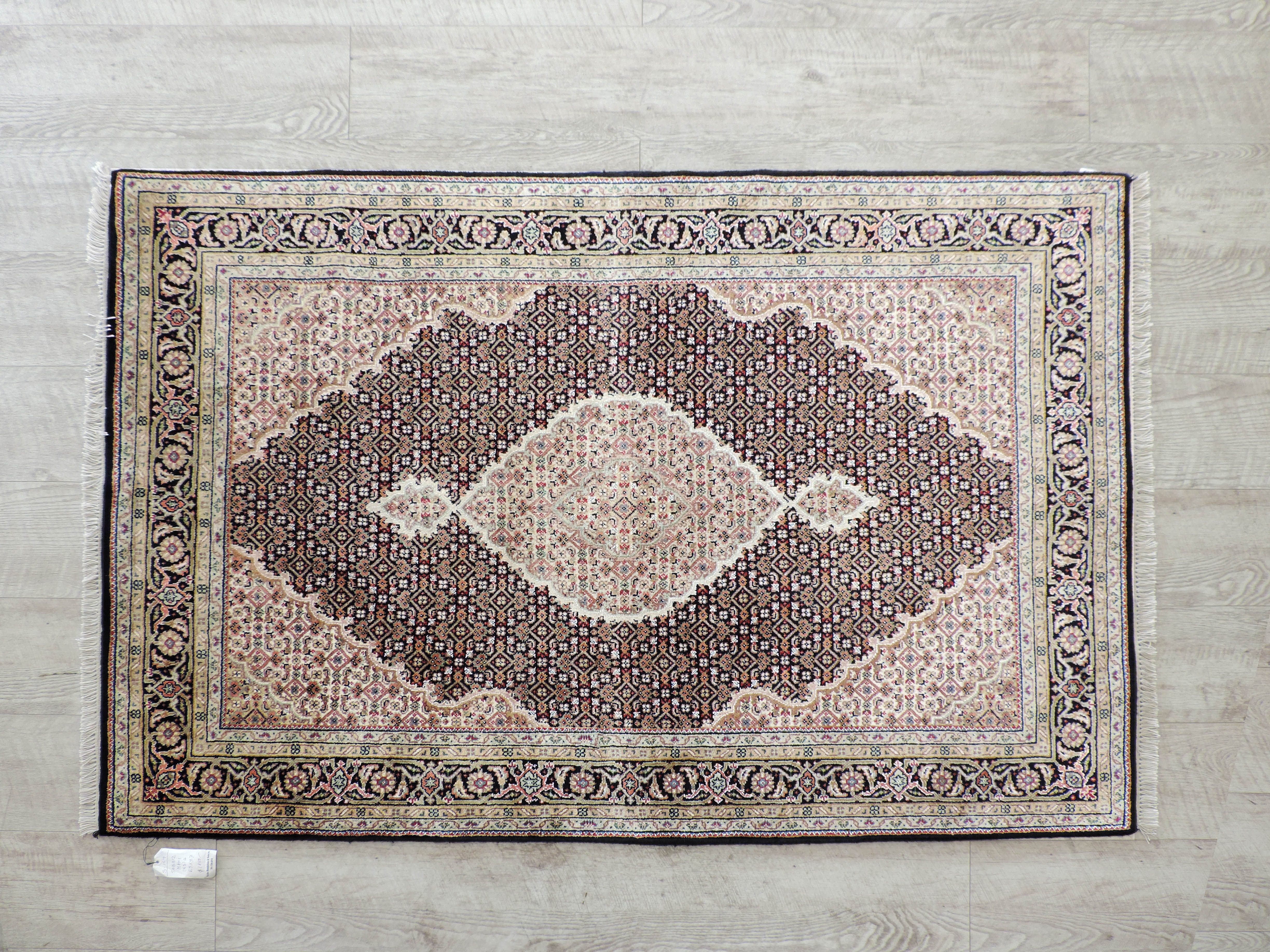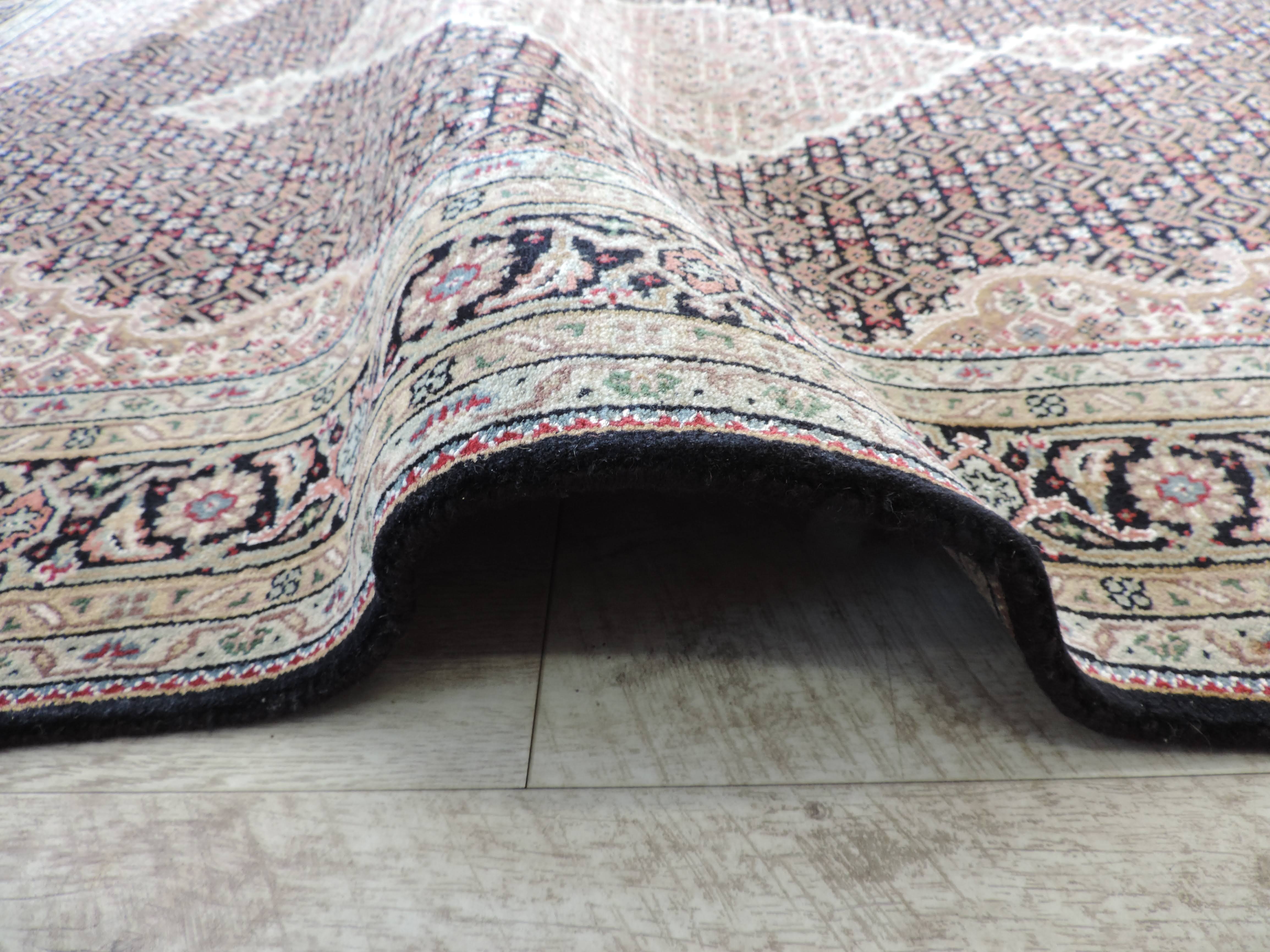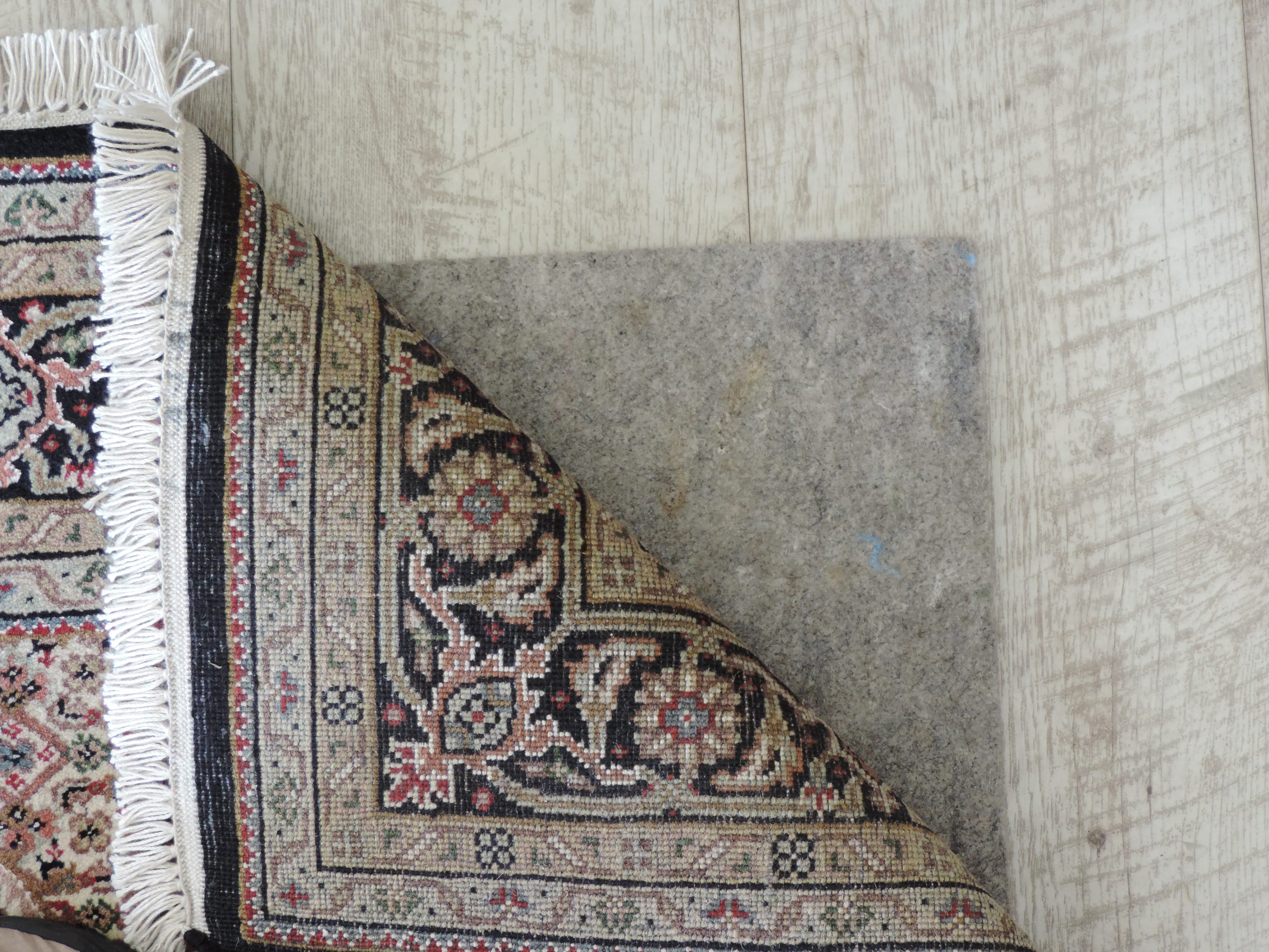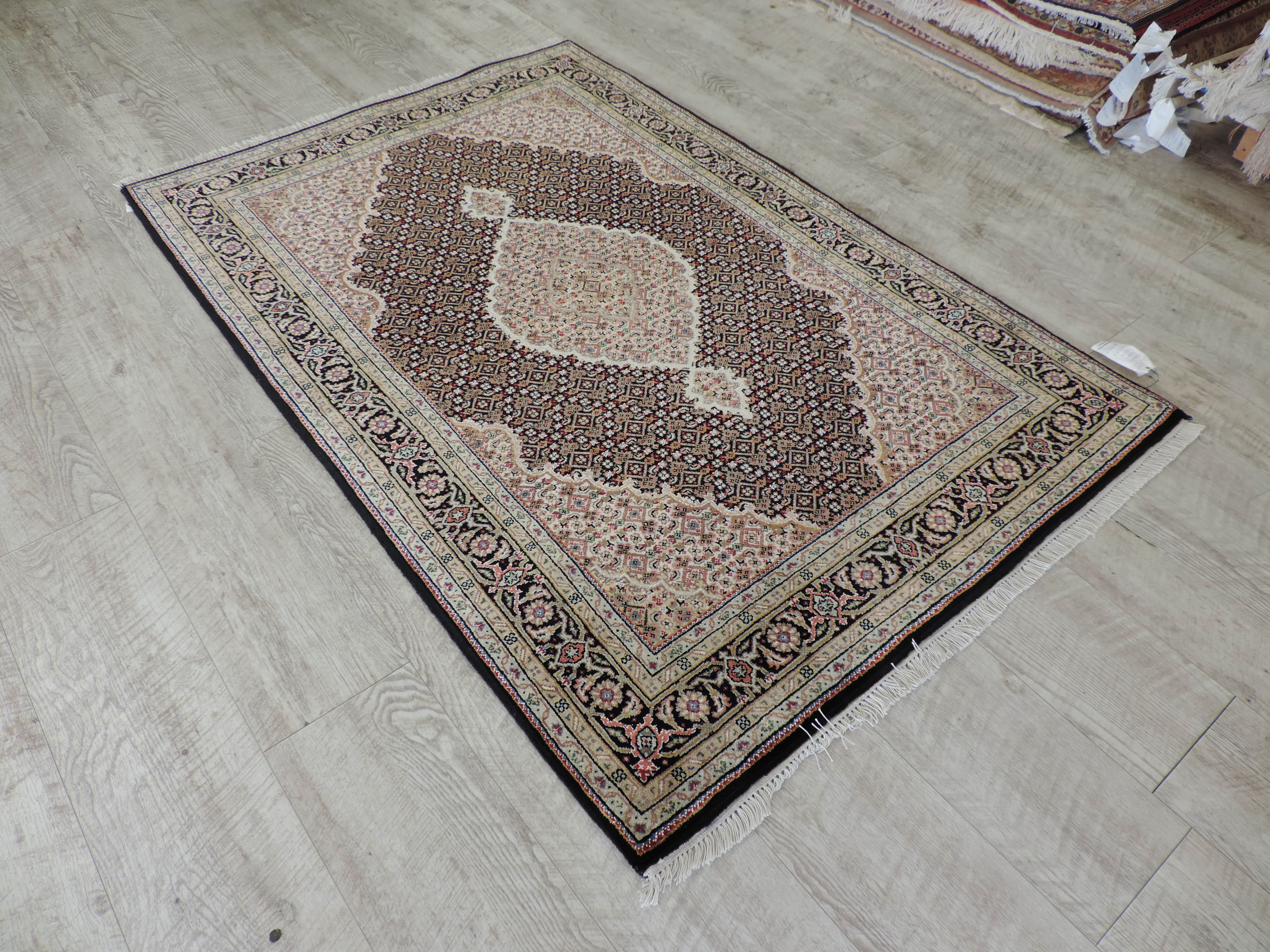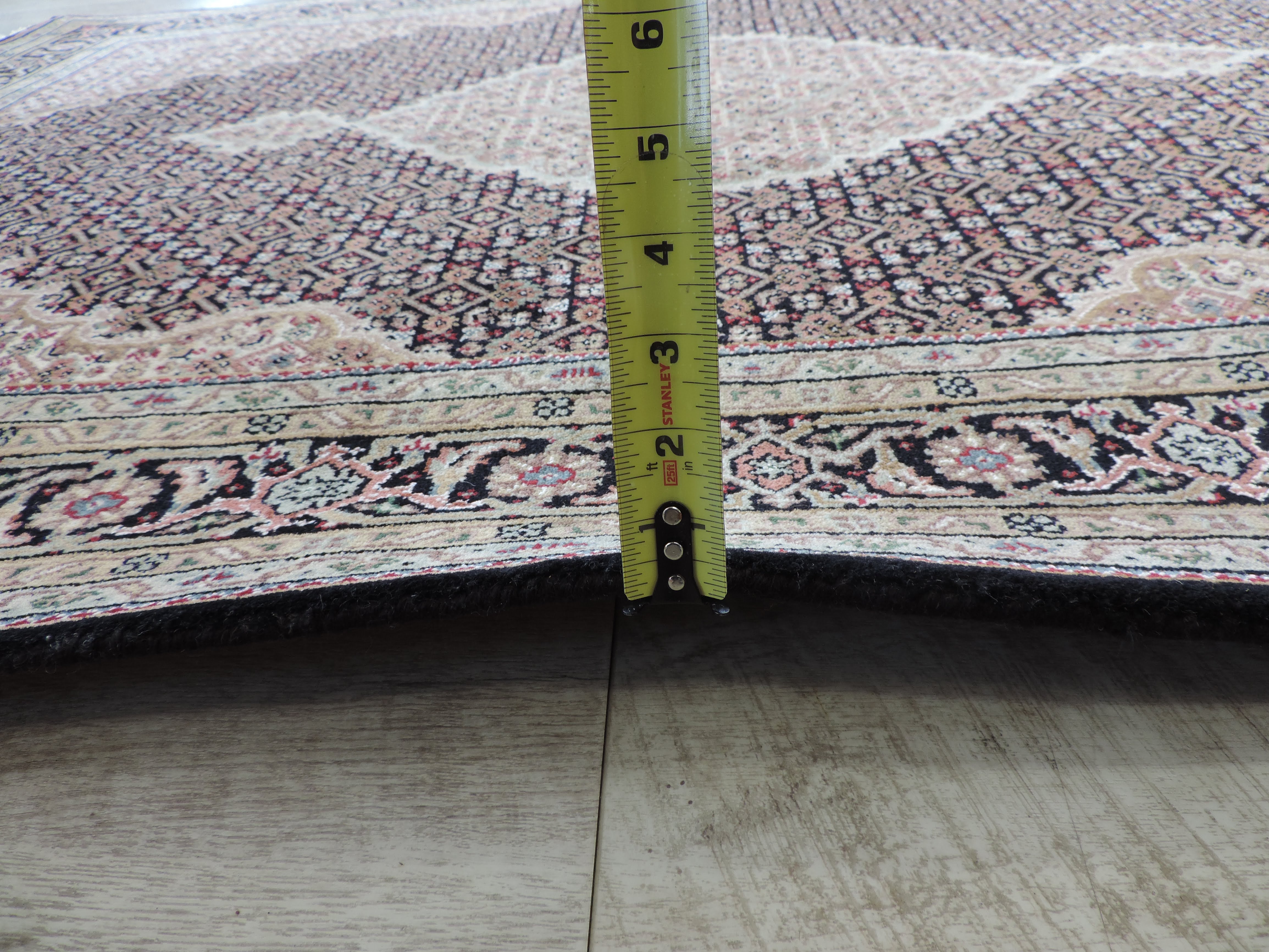 Indulge in the exquisite craftsmanship of our Tabriz Mahi wool rug (S-154), hand-knotted in India with a stunning floral design. This rectangular piece, measuring 4.7ft in width and 6.9ft in length, boasts a bold black as the primary color that effortlessly enhances any decor. Now offered at a impressive sale price of $1200, this brand-new, one-in-stock gem, with its cotton foundation, promises a luxurious underfoot experience that you won't want to miss out on.
