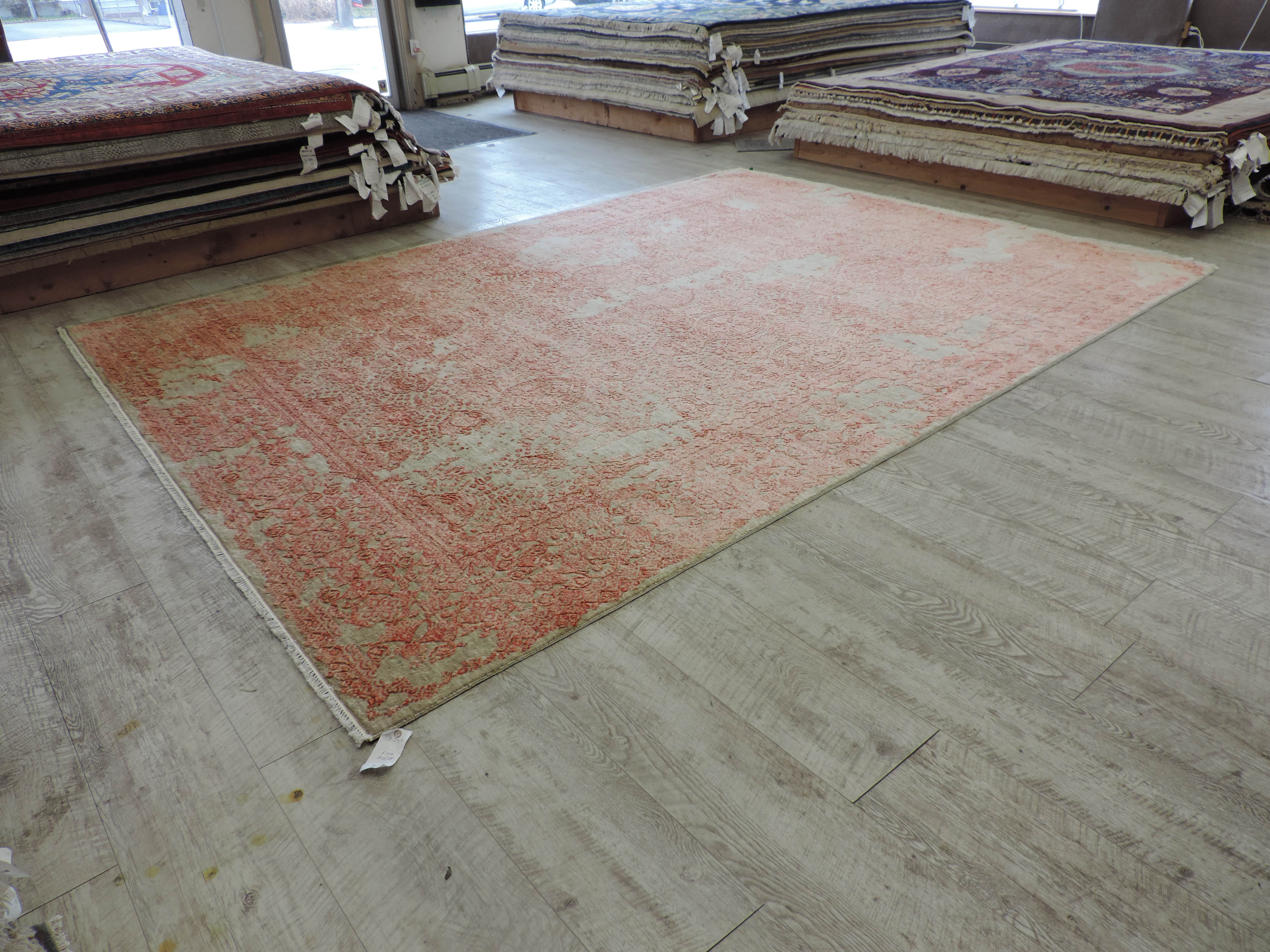 Upgrade your living space with our brand new, hand-knotted wool rug (S-253) featuring a modern geometric design. Radiating a warm, rust color that adds a rich and cozy touch to any room, this rectangular piece measures 9.0 feet wide and 12.2 feet long, perfect for anchoring your furniture. For a limited time, take advantage of our sale and transform your home with this beautiful, one-of-a-kind rug at half its original price!