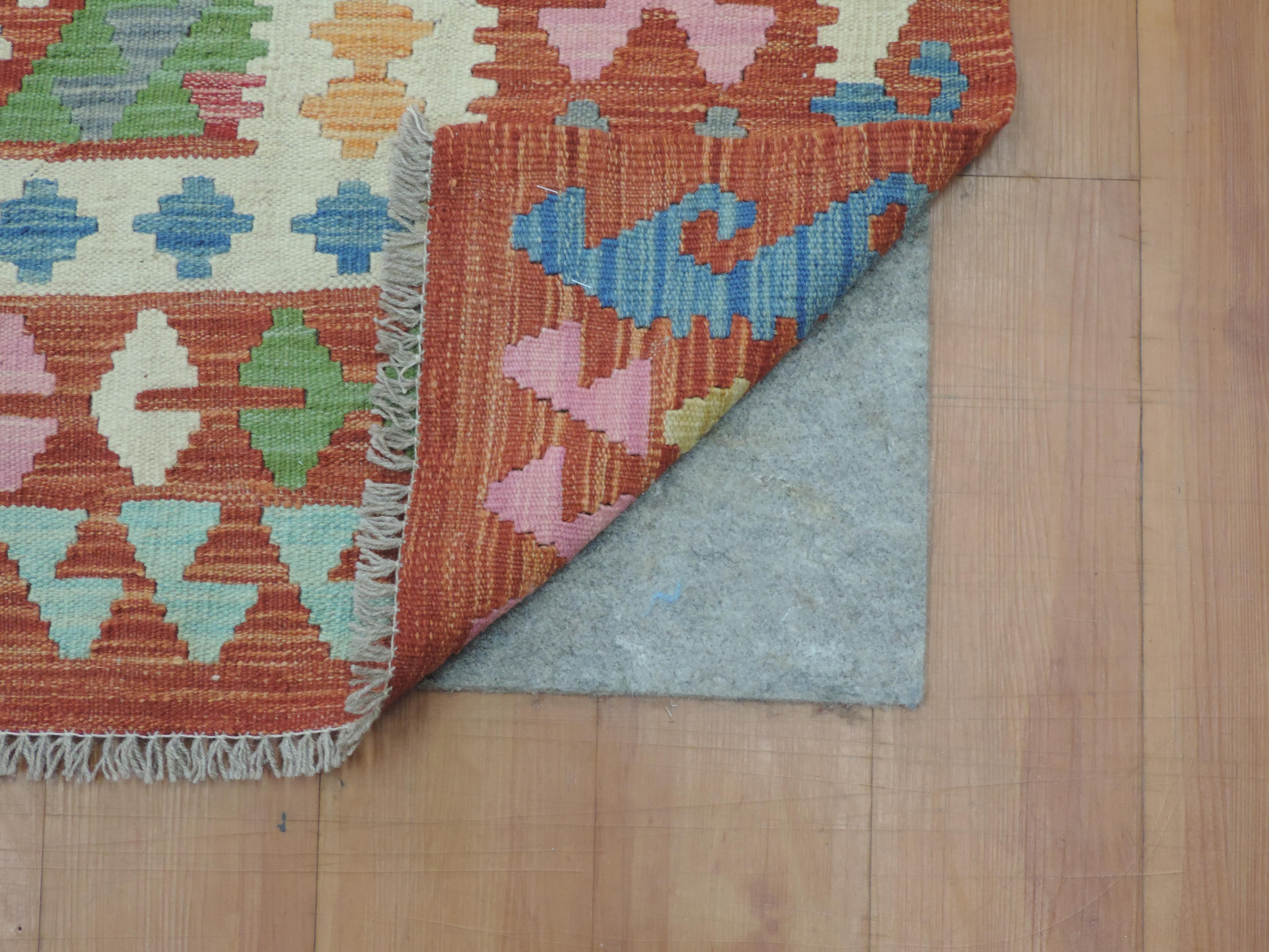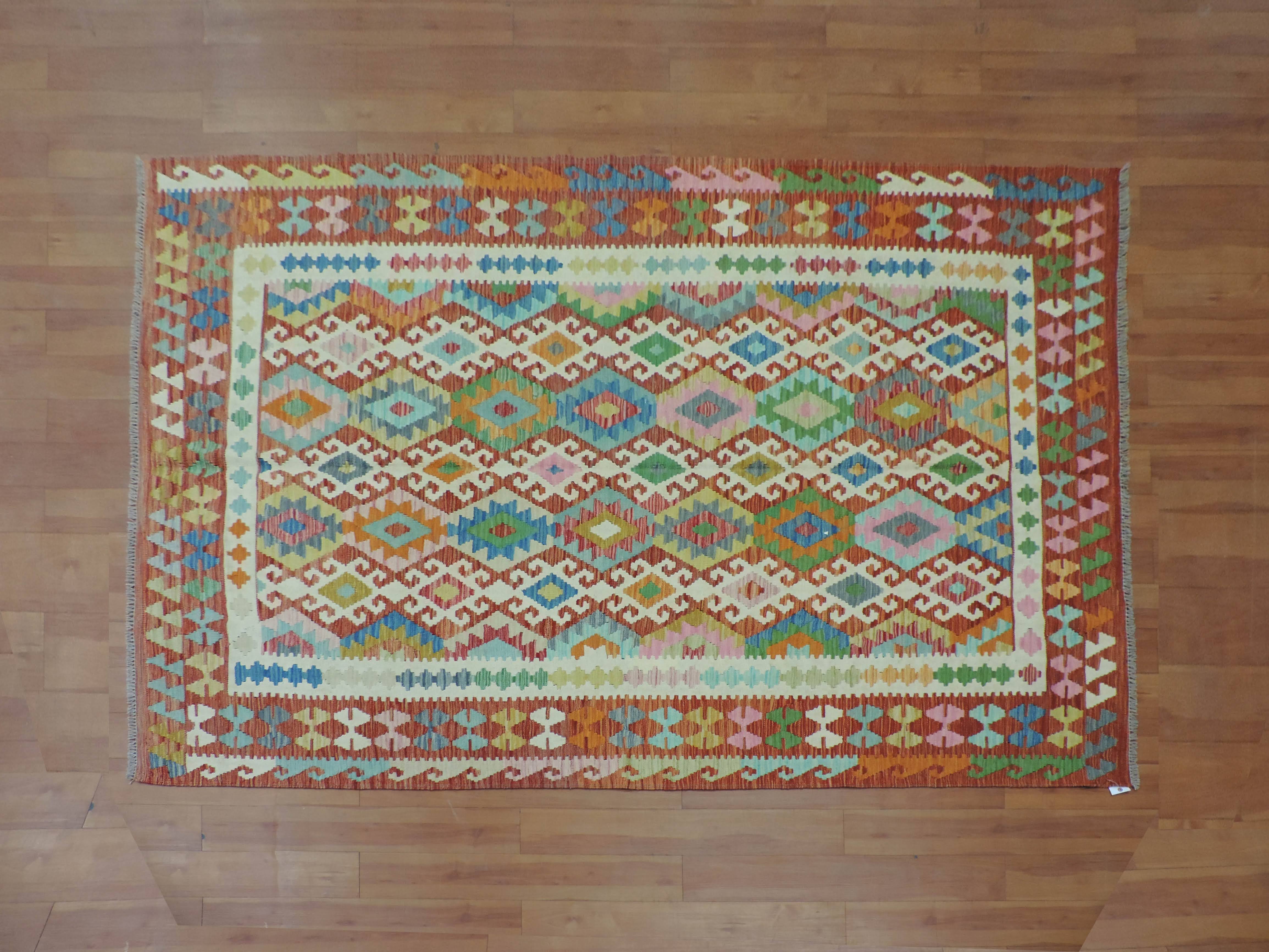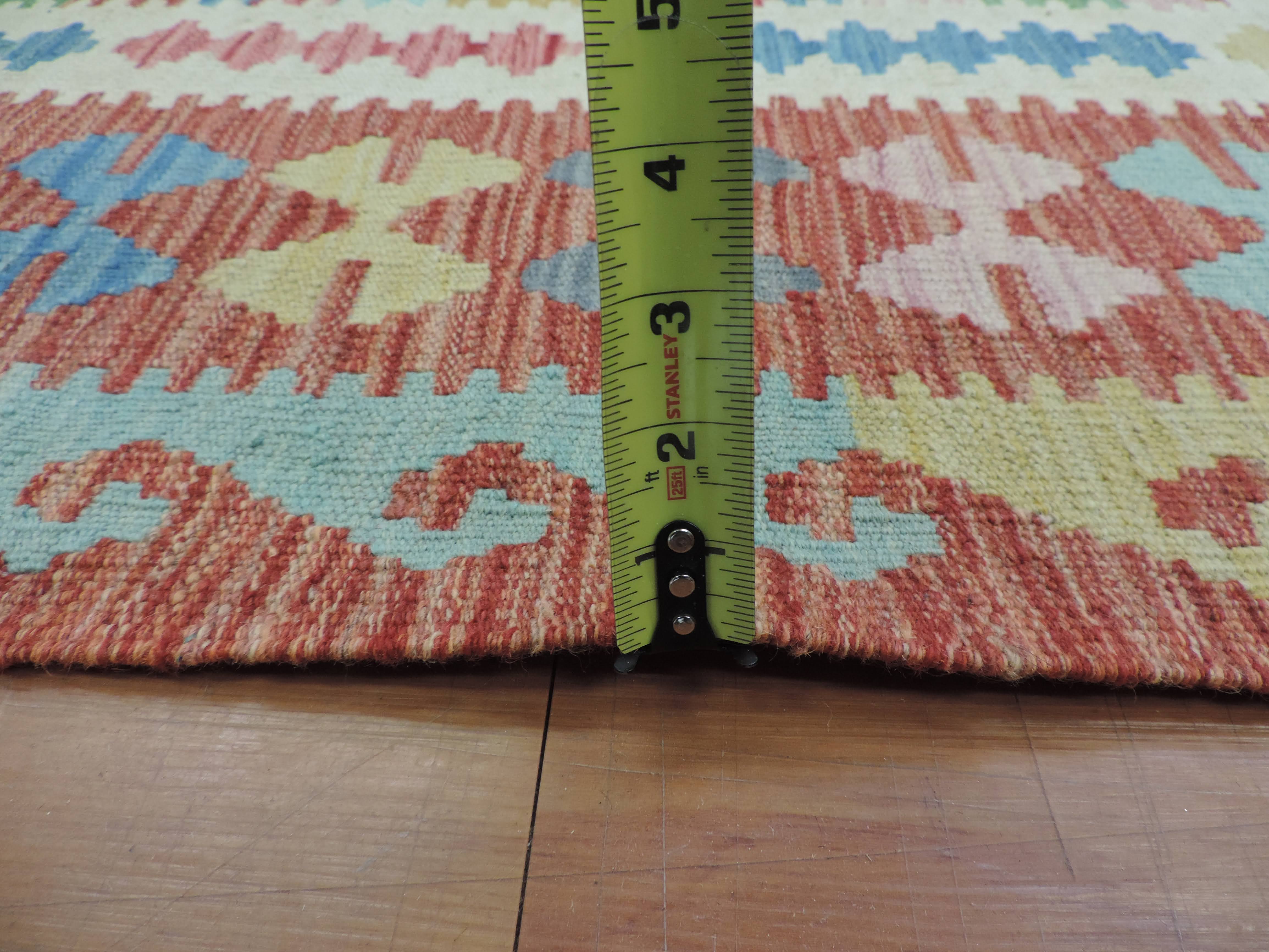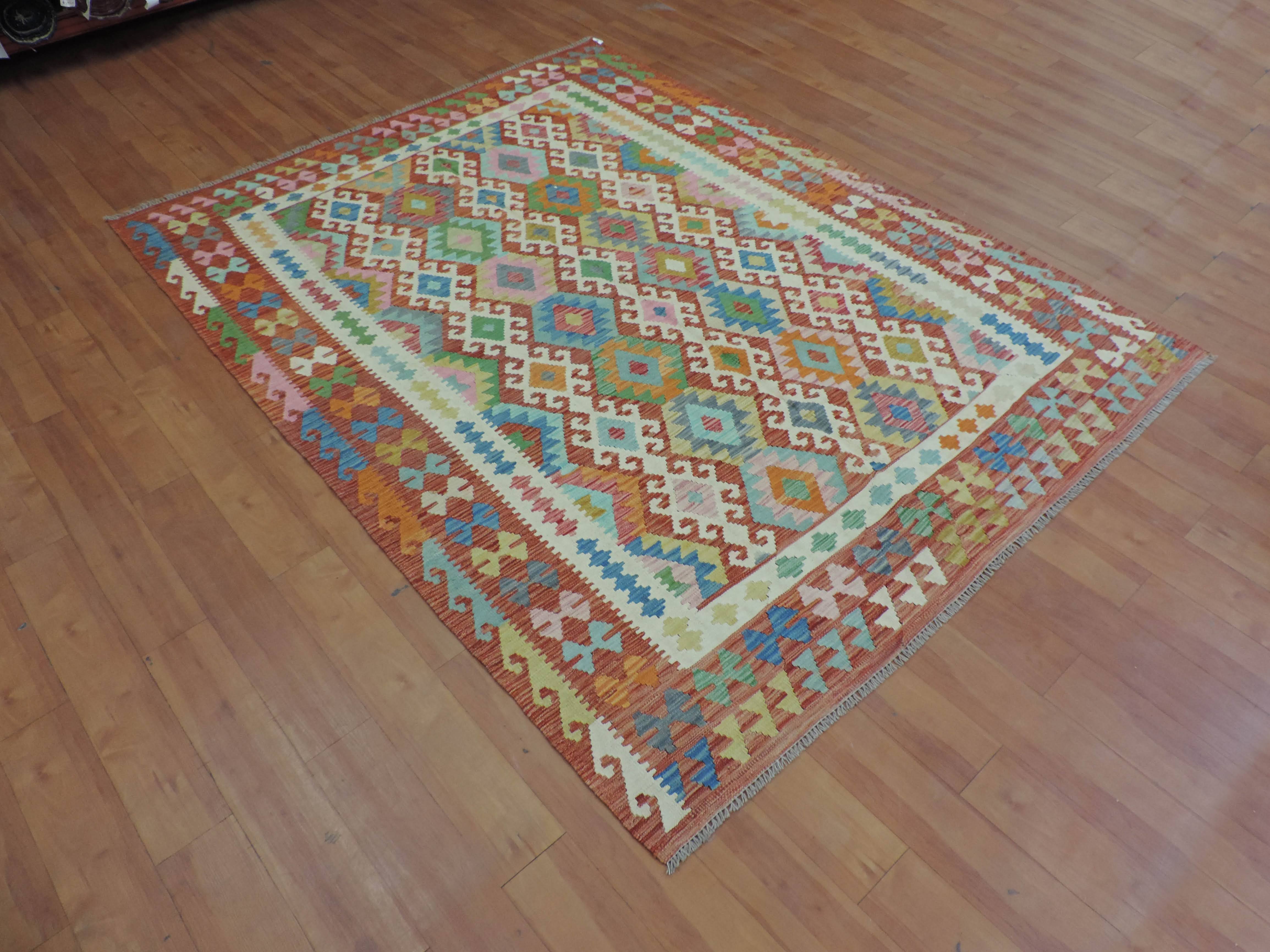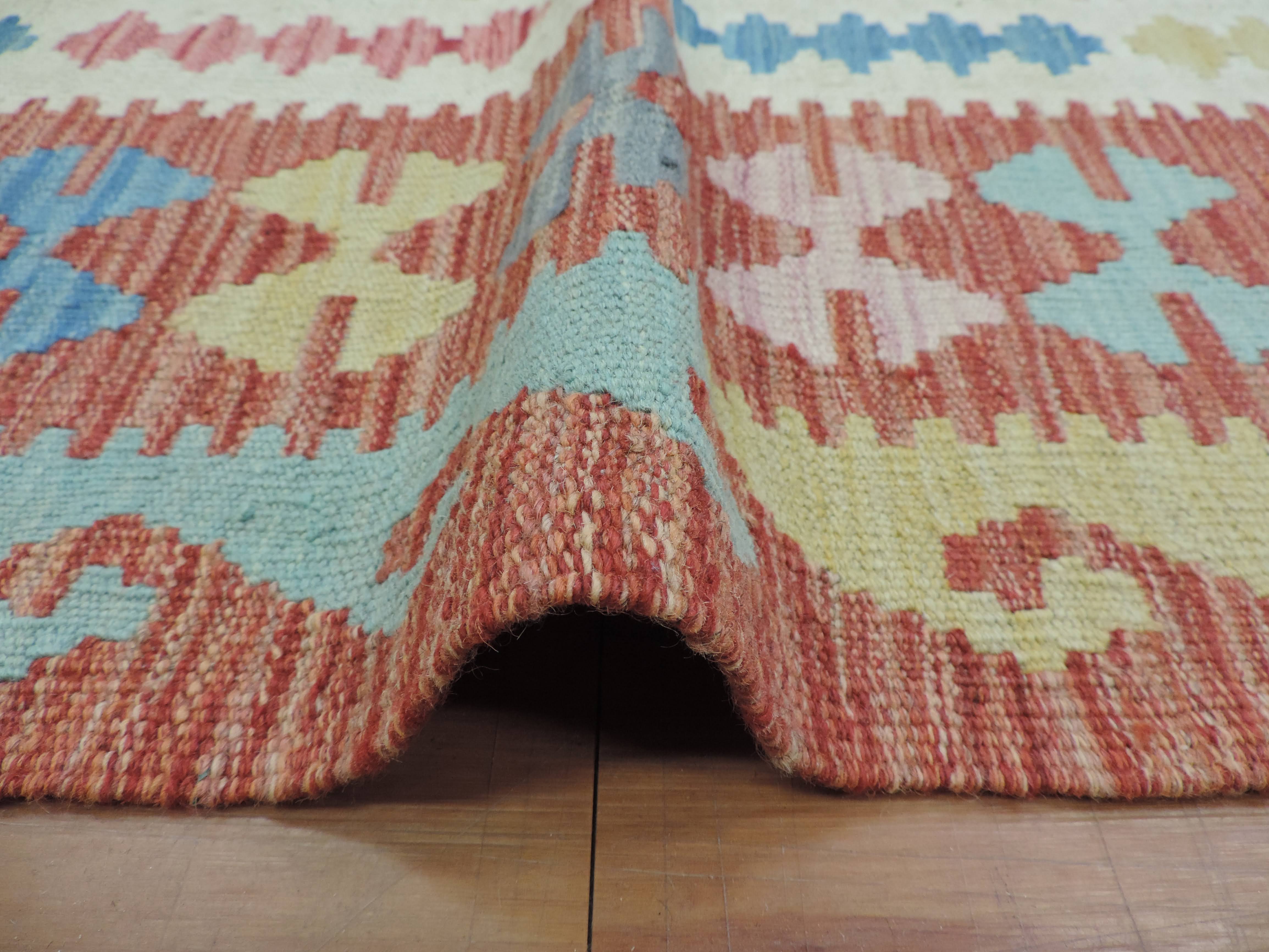 Uncover the hidden beauty of your living space with this exquisite Kilim rug! Hand-knotted from the finest wool in Afghanistan, rug S-432 is a feast for the eyes with its intricate geometric design and elegant ivory color. While its vintage charm adds a rich layer of history, this brand-new rug is ready to create fresh memories in its new home. Now priced at just $1200, indulge in the luxury of this remarkable oriental masterpiece that perfectly combines sophistication and durability.