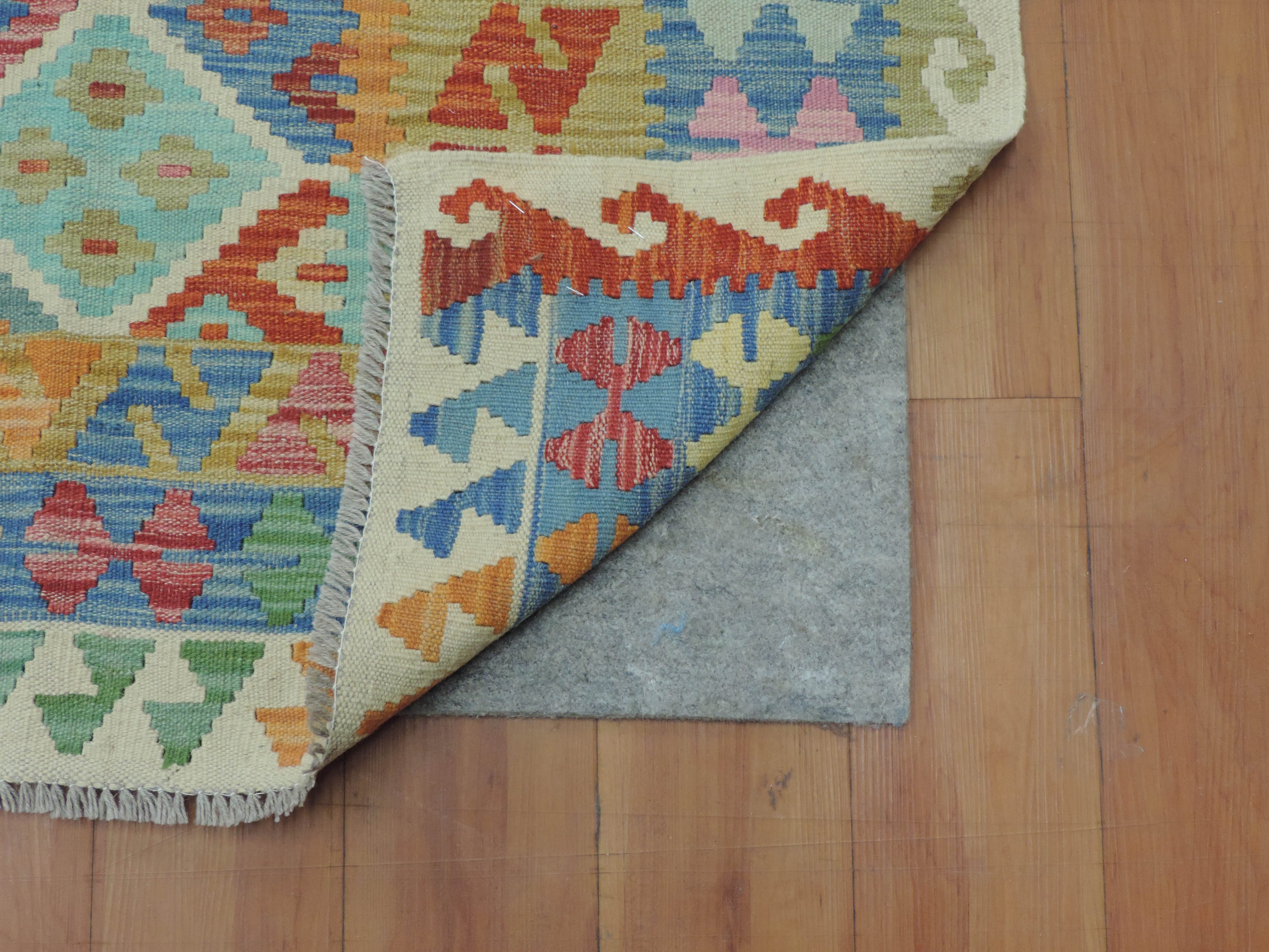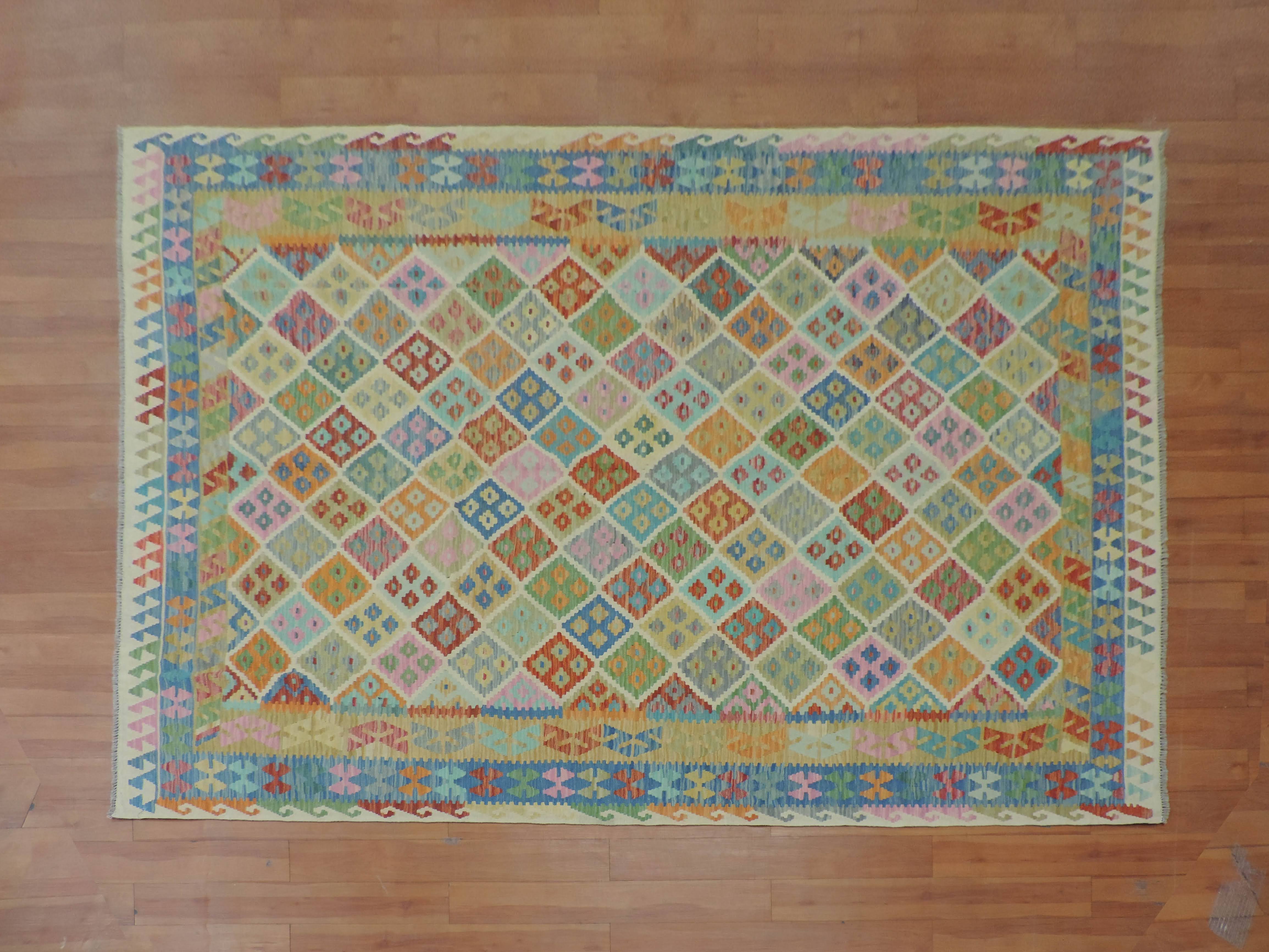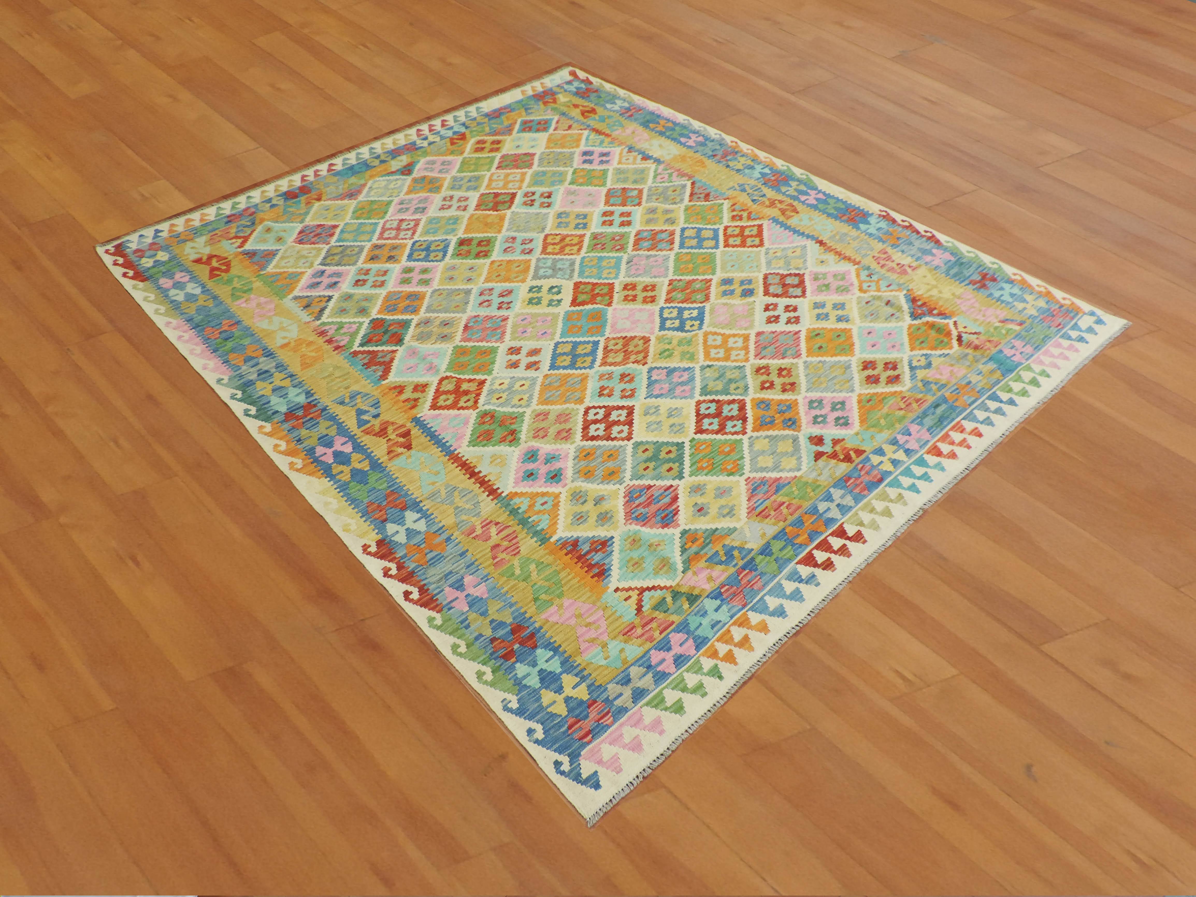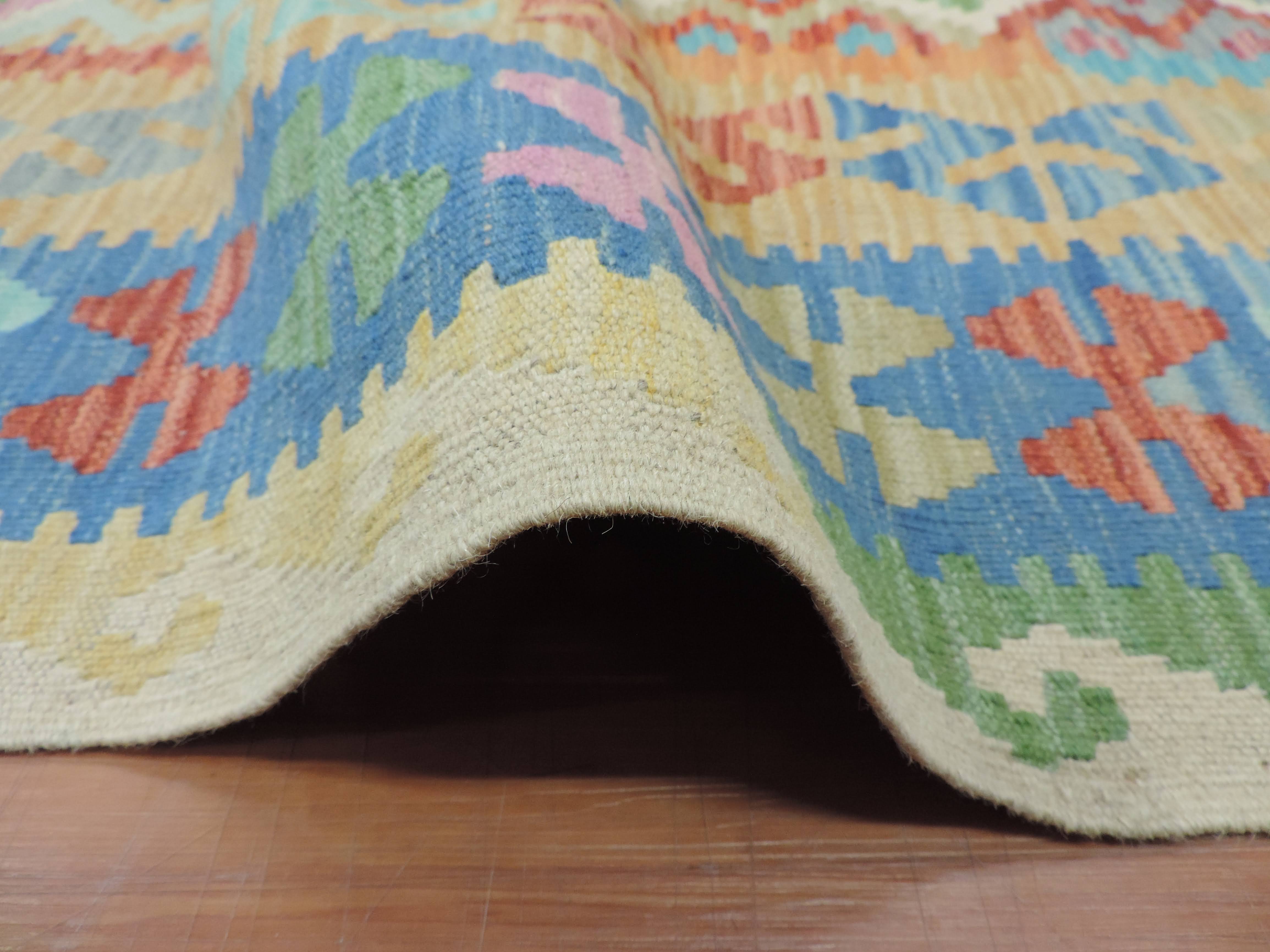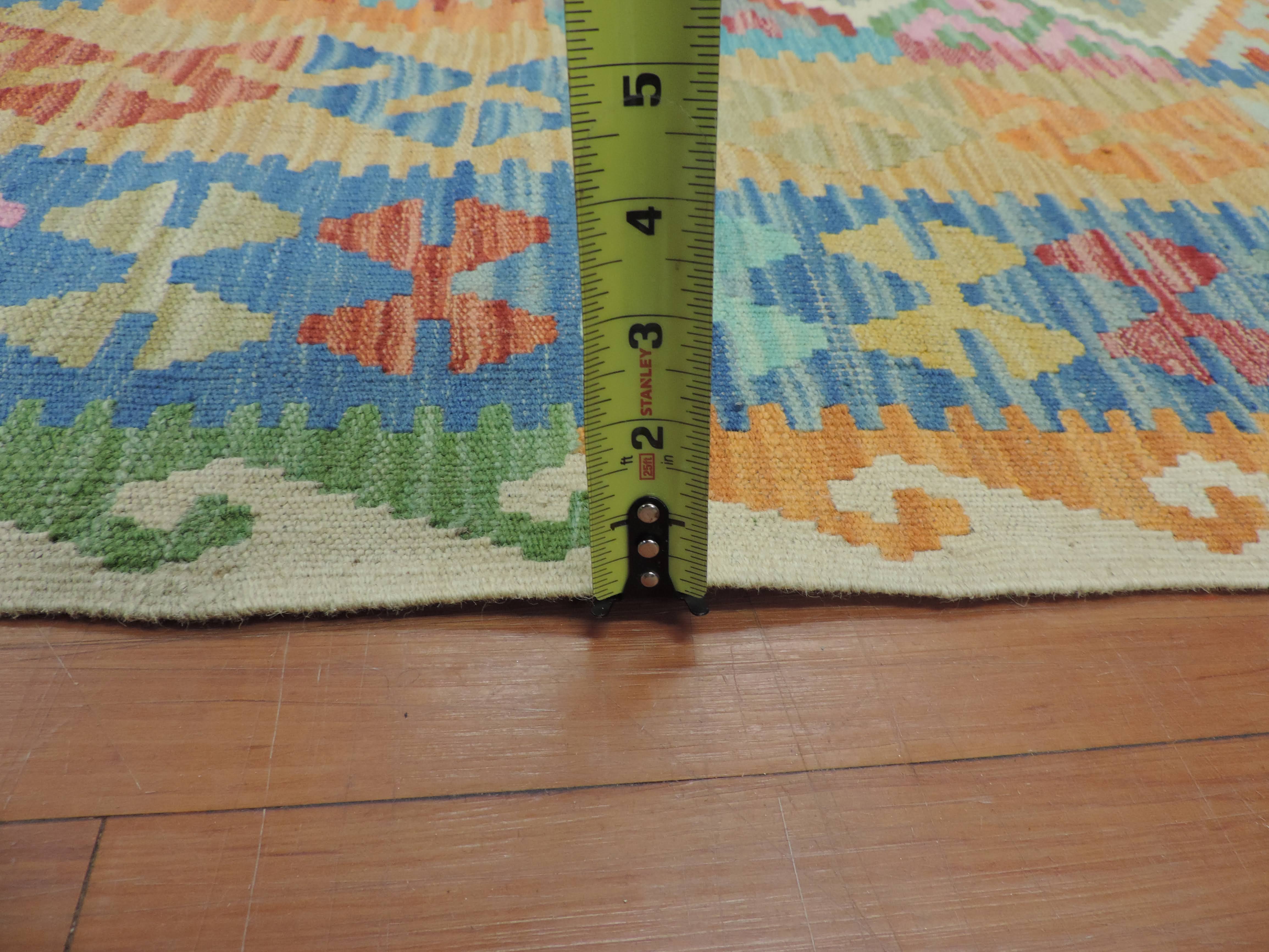 Introducing the S-435 Kilim Rug, a stunning piece of craftsmanship from Afghanistan. This newly hand-knotted, ivory rug showcases a bold geometric design, perfectly suited to add a touch of elegance and sophistication to any space. With its premium wool foundation and an irresistible sale price, this oriental treasure promises enduring quality and unmatched value for your investment.